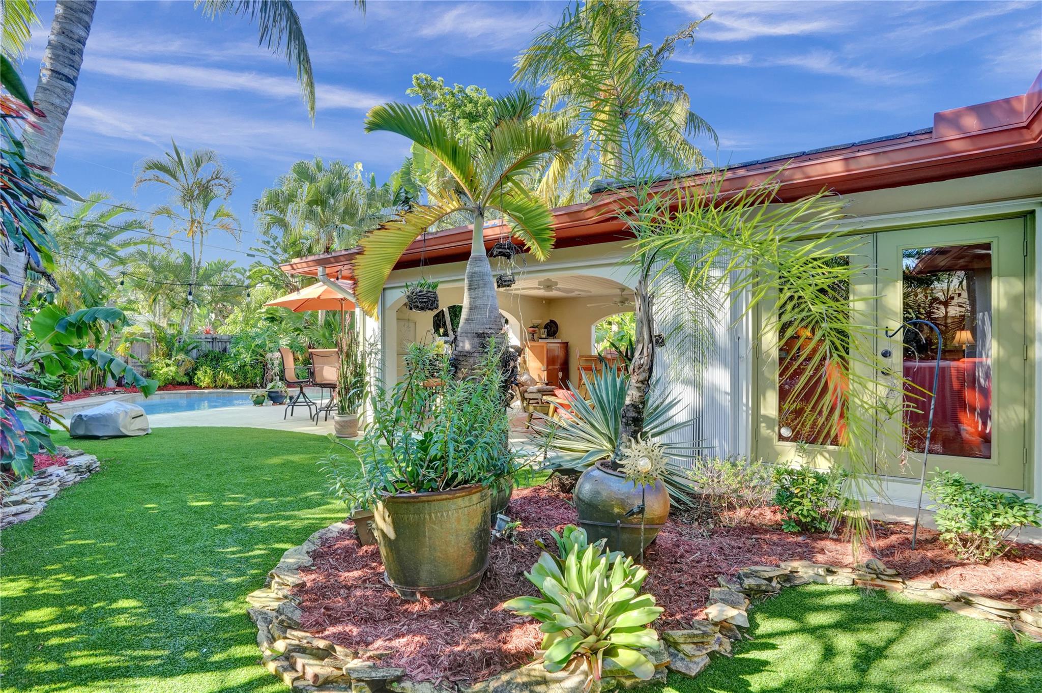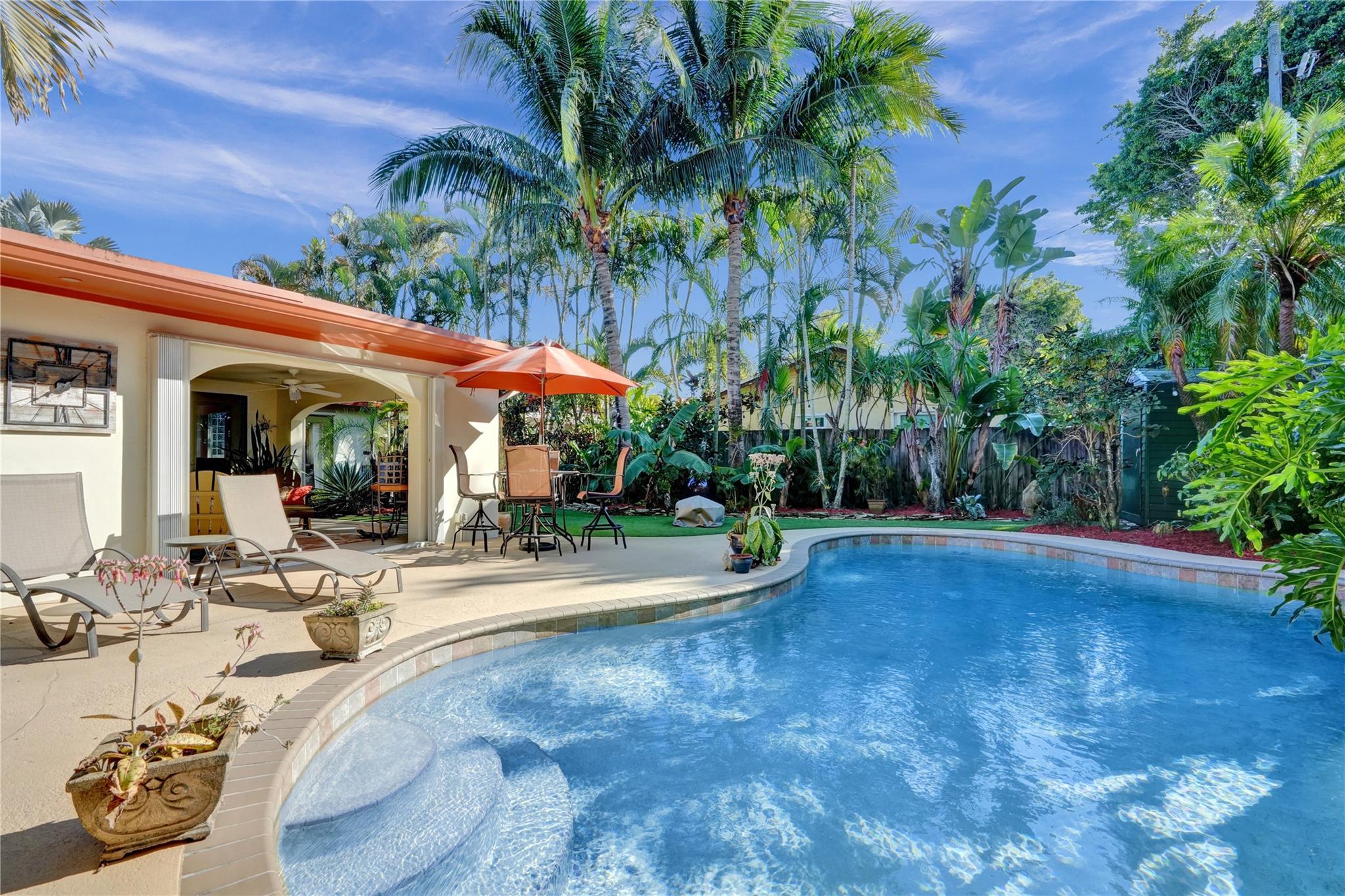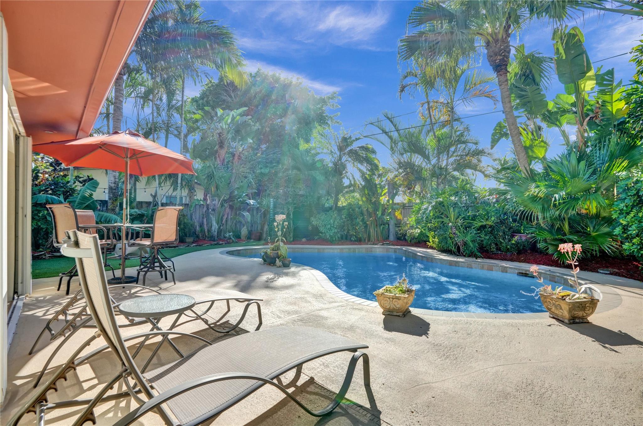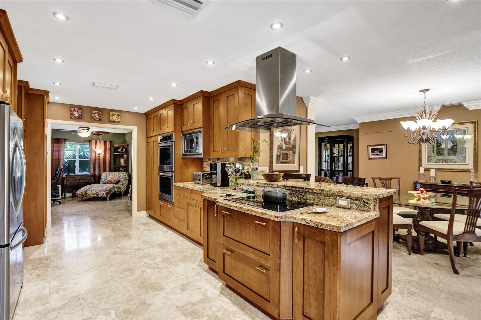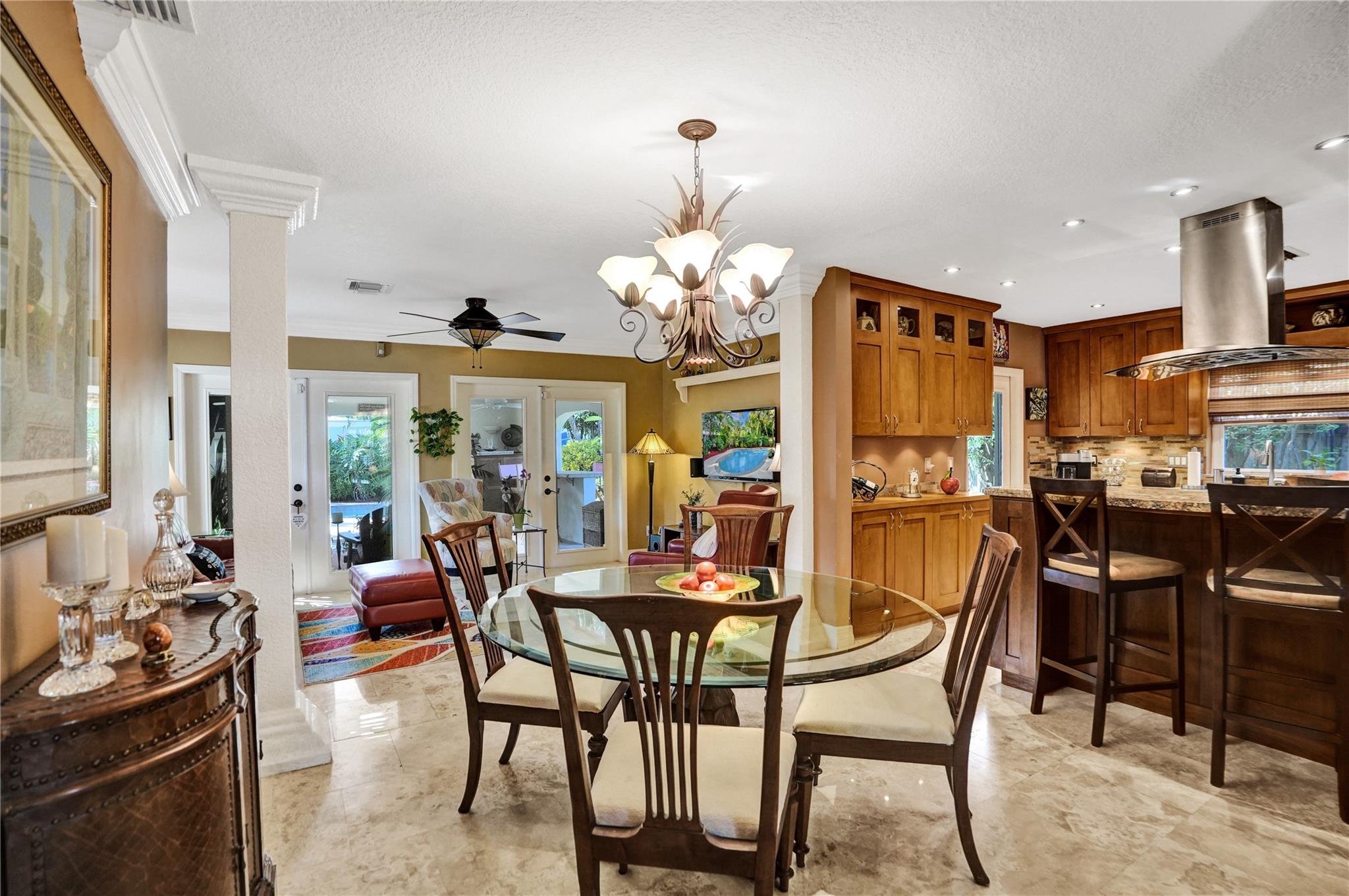 Nestled in sought-after Poinsettia Heights neighborhood, this beautifully updated home offers a perfect blend of modern elegance and comfort. Desirable open-concept floor plan immediately captures your attention as it effortlessly flows into a lovely view of the pool and lush garden, creating a seamless indoor-outdoor living experience. The expansive kitchen is a chefs dream, featuring a professional-grade exhaust hood, abundant granite countertops, ample cabinetry, and double oven. Polished Travertine and cool terrazzo floors add a touch of sophistication. Spacious formal living room & separate family room opens up to an incredible covered porch that overlooks the resort-style pool area—offering complete privacy. Newer flat tile roof & A/C (2016), provides peace of mind for years to come.