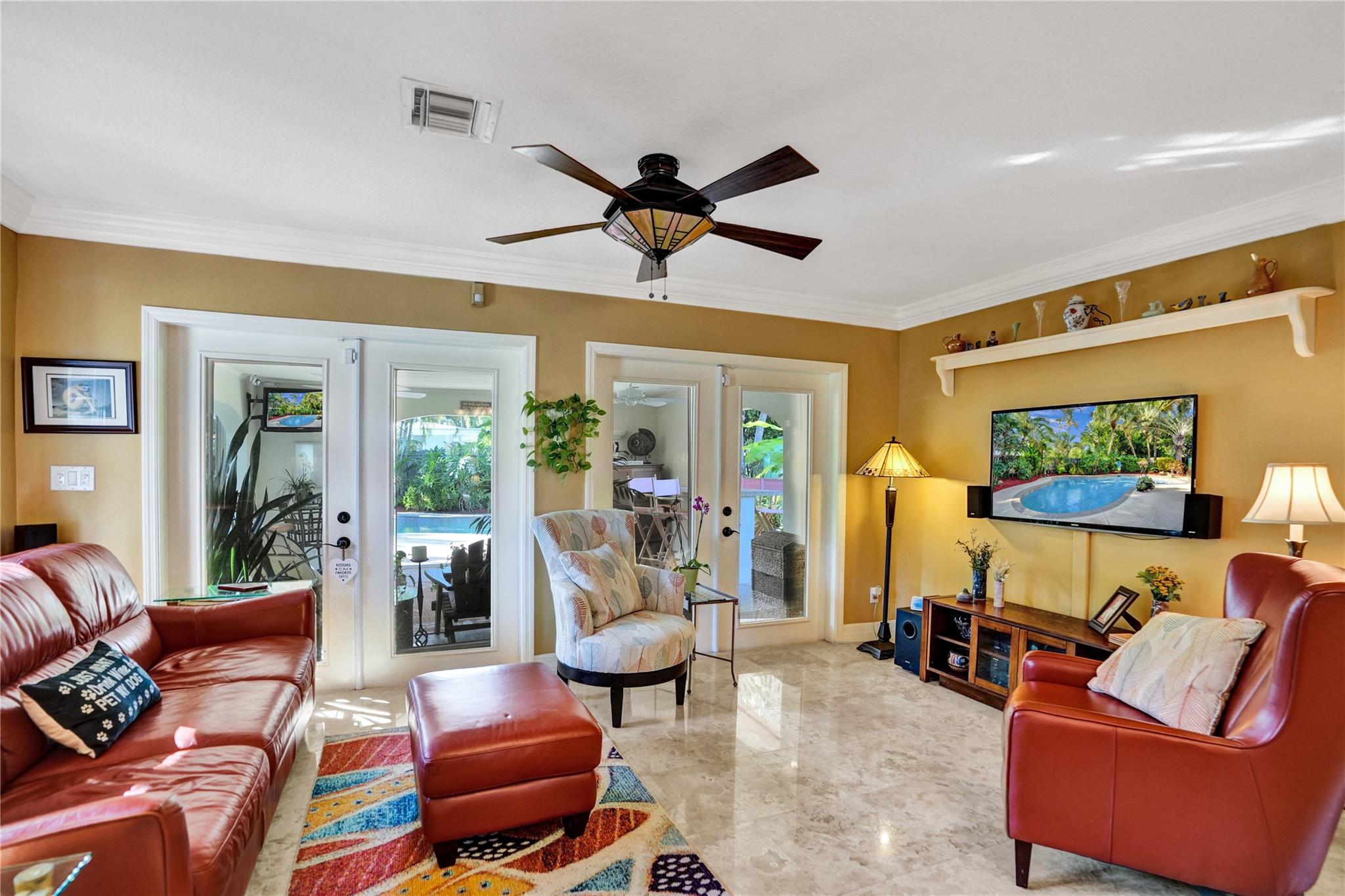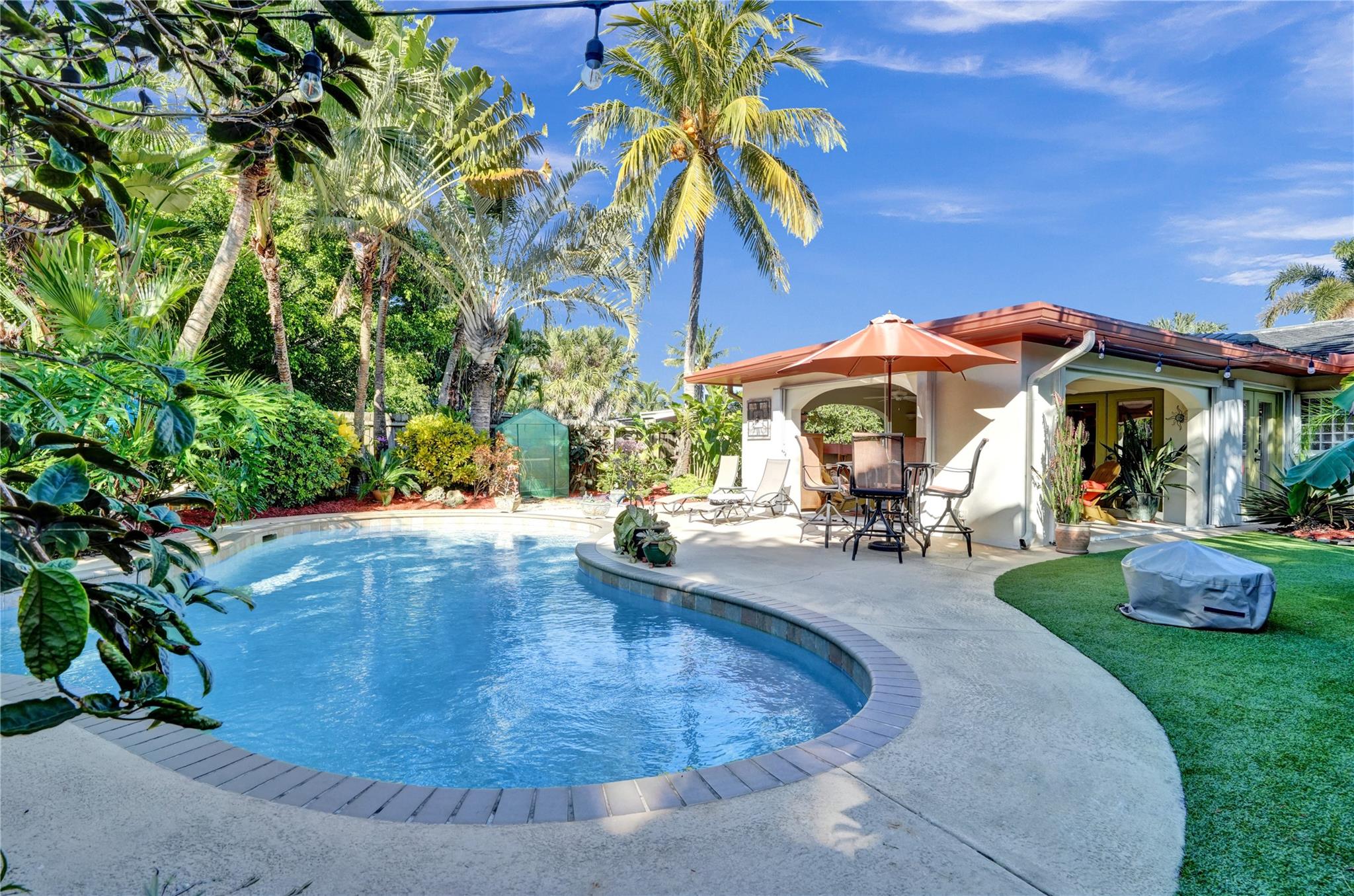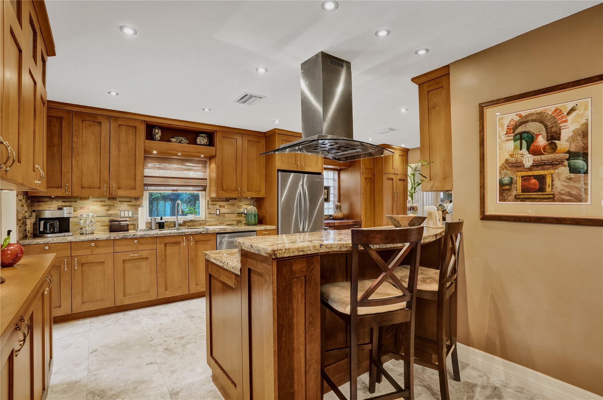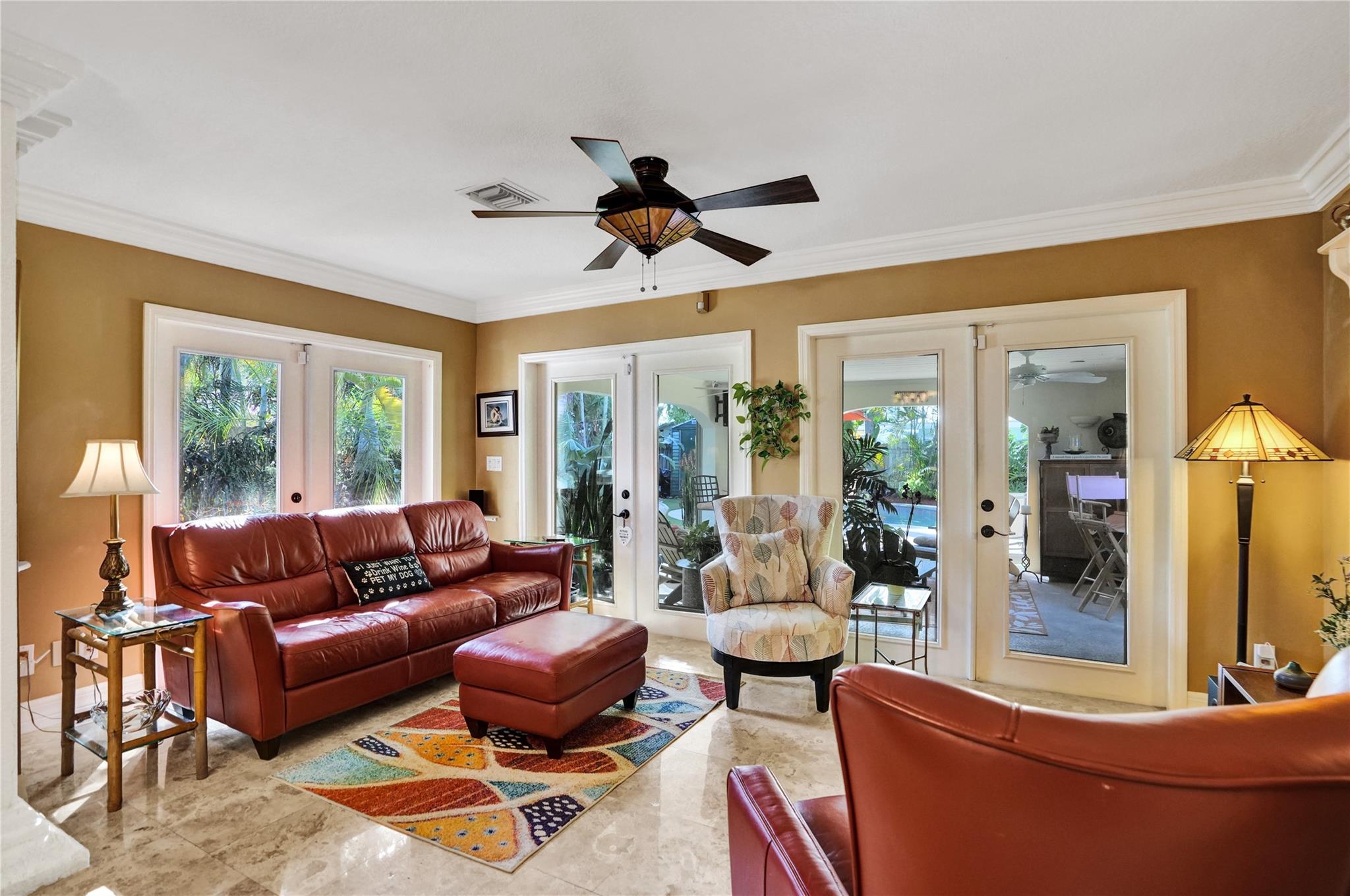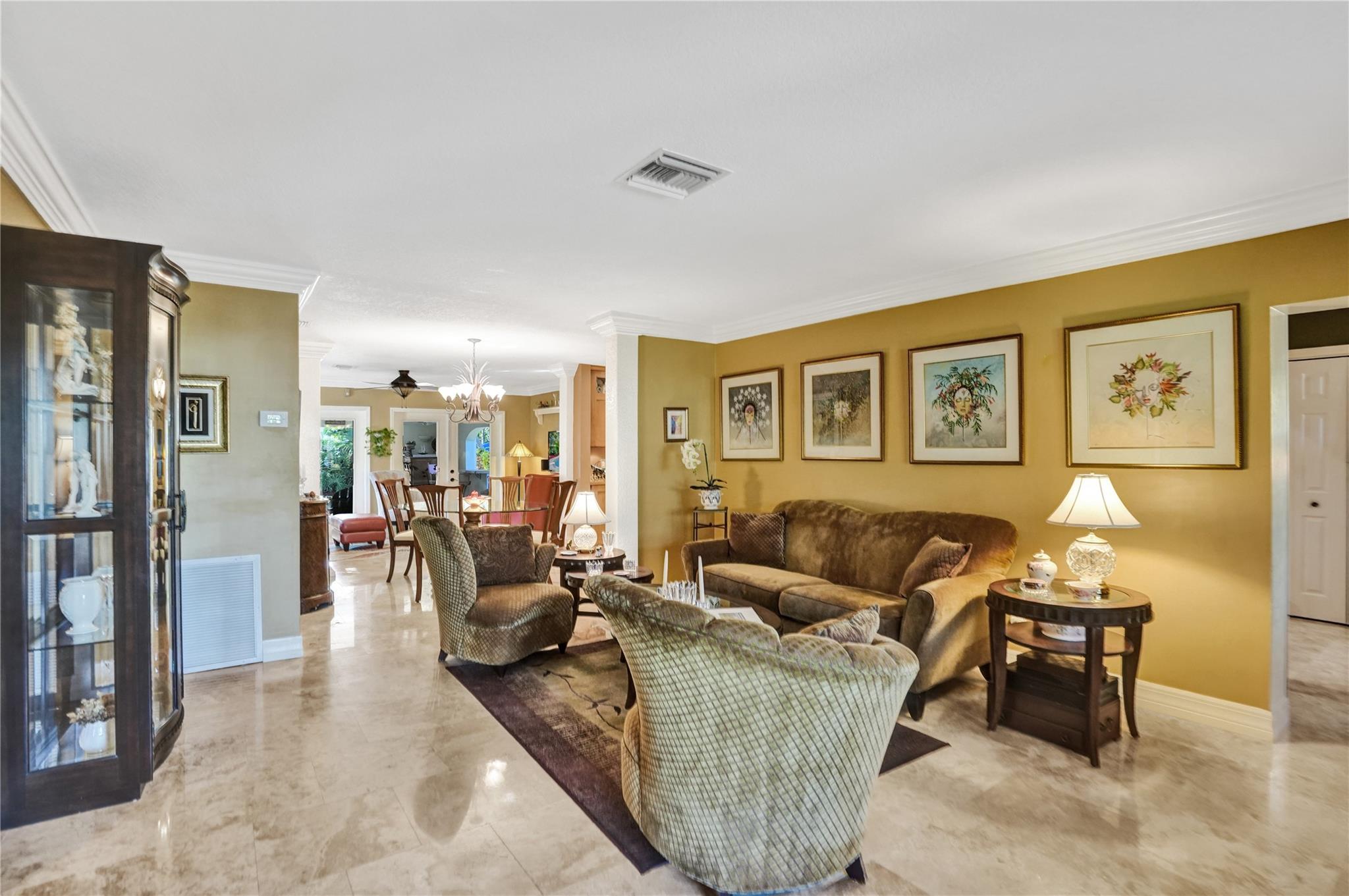 Nestled in sought-after Poinsettia Heights neighborhood, this beautifully updated home offers a perfect blend of modern elegance and comfort. Desirable open-concept floor plan immediately captures your attention as it effortlessly flows into a lovely view of the pool and lush garden, creating a seamless indoor-outdoor living experience. The expansive kitchen is a chefs dream, featuring a professional-grade exhaust hood, abundant granite countertops, ample cabinetry, and double oven. Polished Travertine and cool terrazzo floors add a touch of sophistication. Spacious formal living room & separate family room opens up to an incredible covered porch that overlooks the resort-style pool area—offering complete privacy. Newer flat tile roof & A/C (2016), provides peace of mind for years to come.