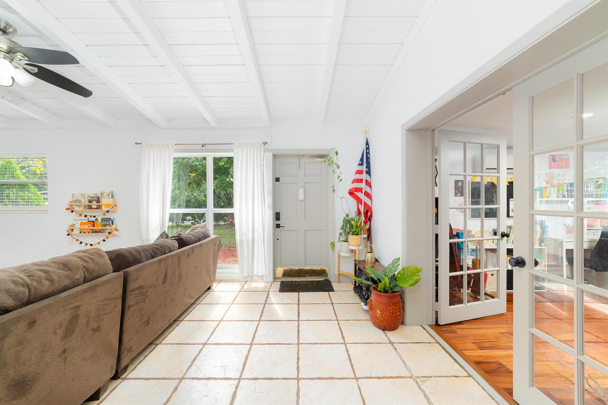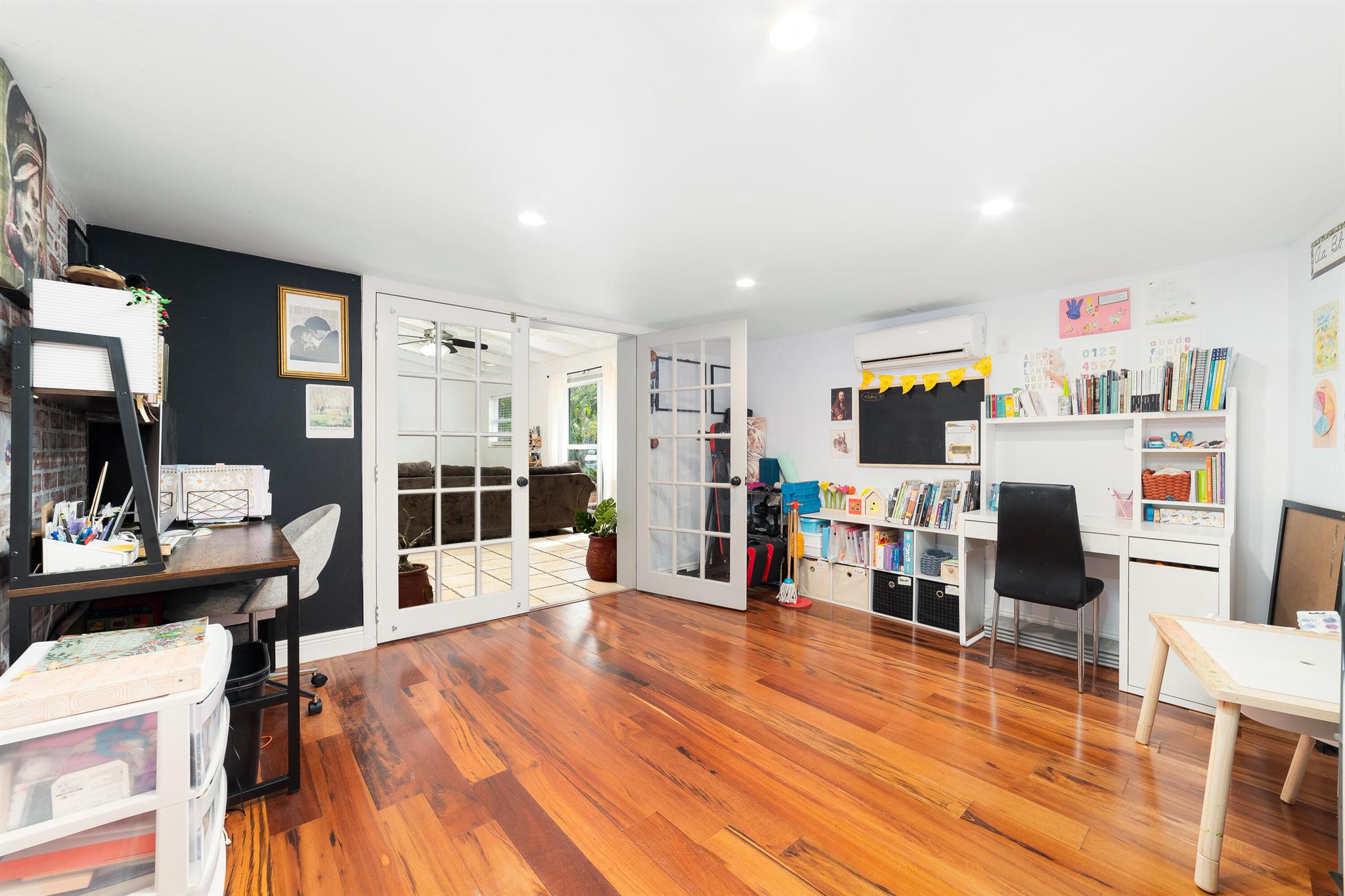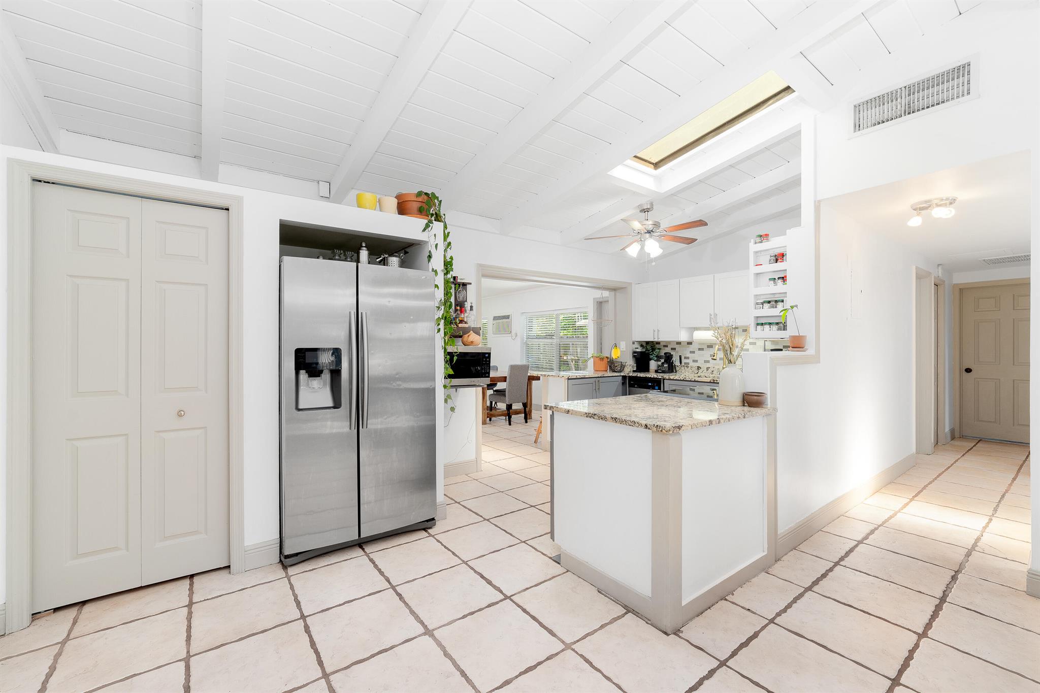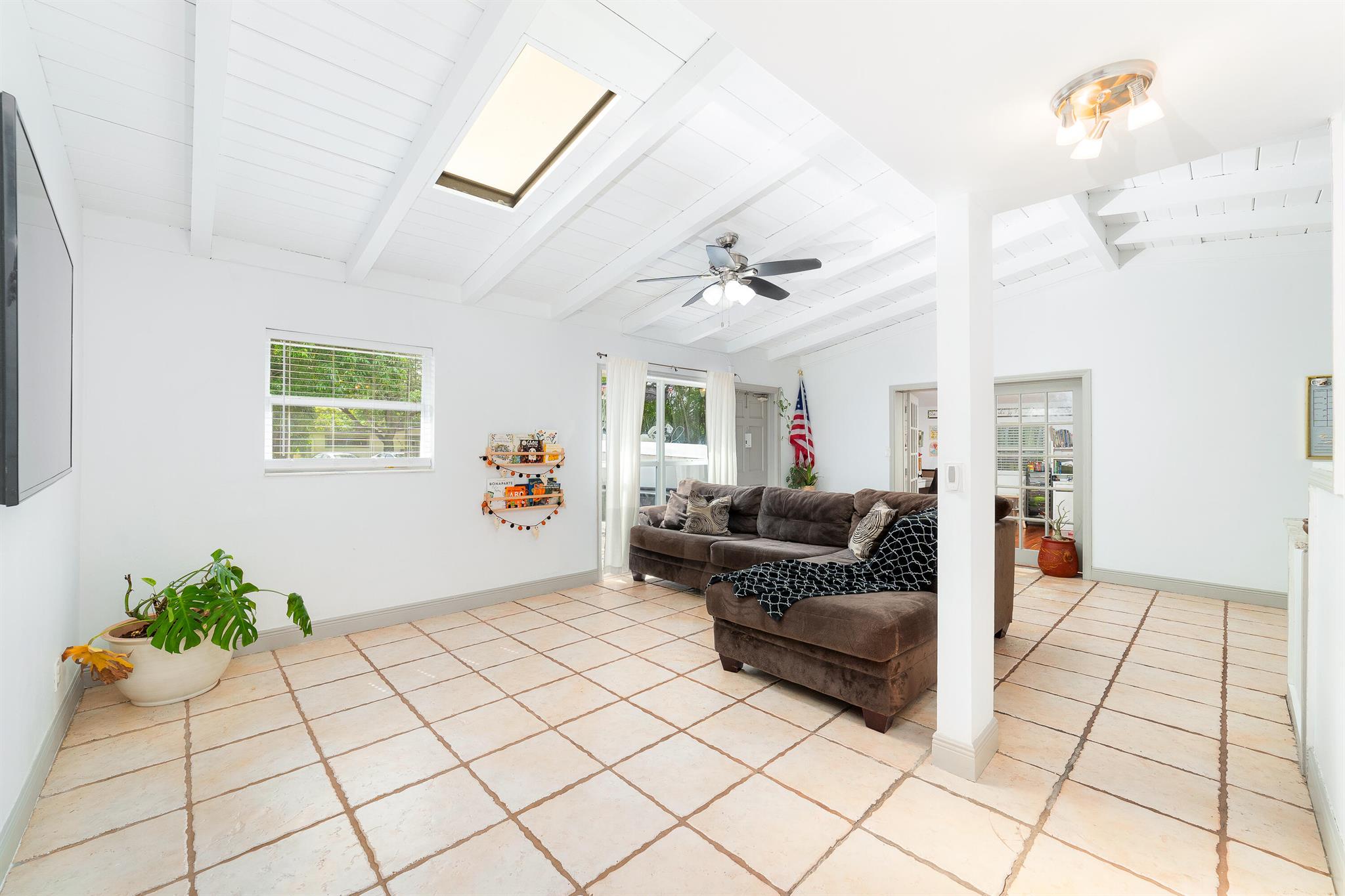 Welcome to your dream home in the desirable RIVERLAND area! This stunning 4-bedroom PLUS a den, 4-bathroom single-family residence boastsimpressive vaulted ceilings adorned with exposed wood beams, creating an inviting atmosphere. The beautiful kitchen features a large pantry and naturallight pours in through stylish skylight domes. Retreat to the spacious primary bedroom, complete with a walk-in closet and elegant wood floors. The propertyshowcases tile, wood, and terrazzo flooring throughout for easy maintenance. A versatile bonus room and one bedroom with a separate entrance offerendless possibilities. Enjoy outdoor living in the spacious fenced yard, plus the convenience of two large driveways. Don't miss this opportunity!