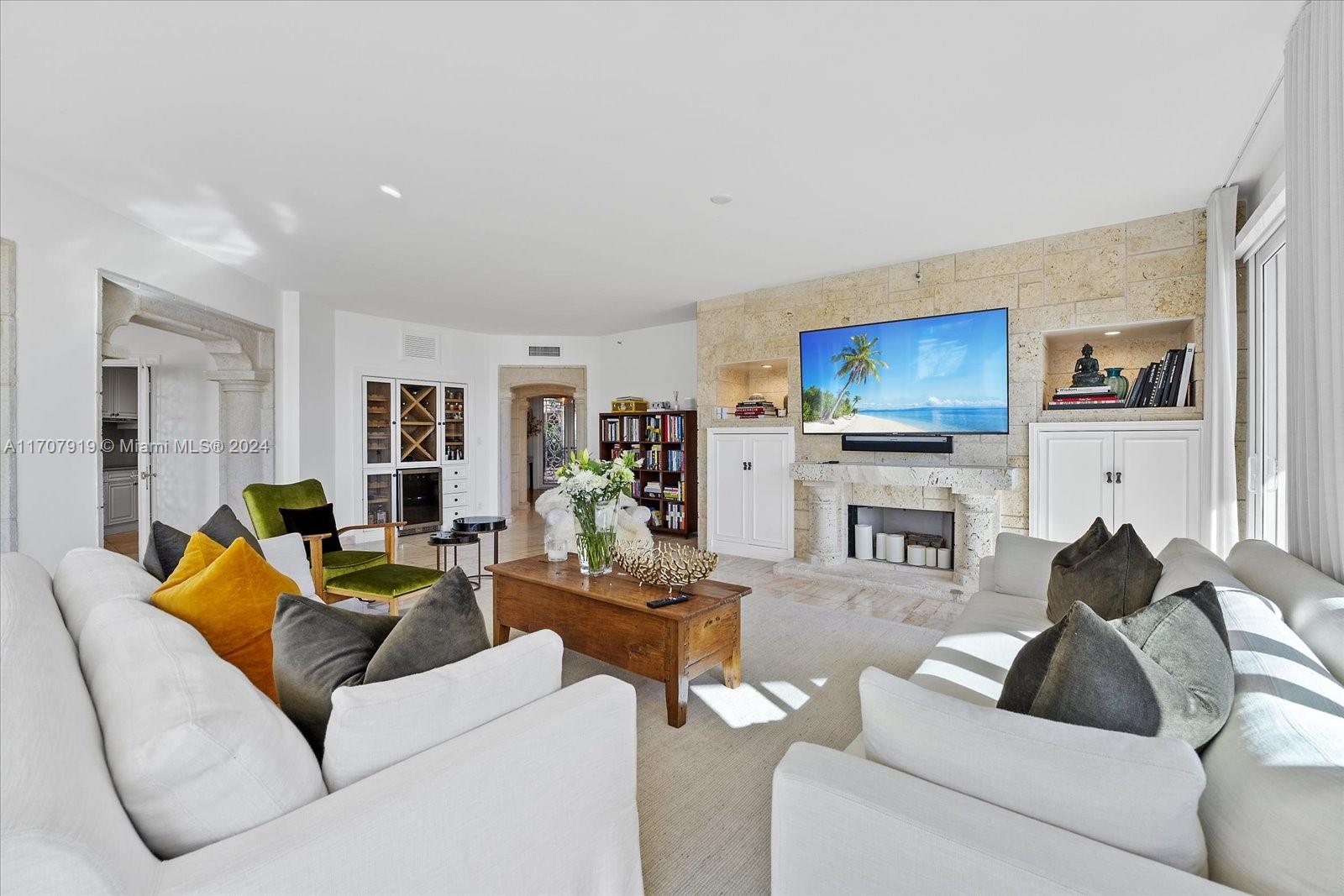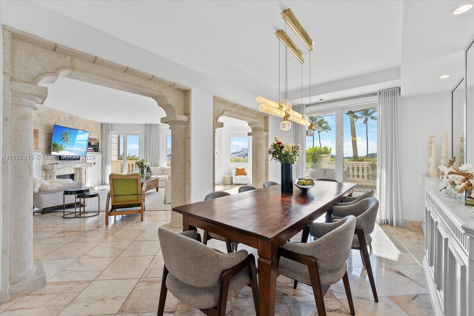 Experience the epitome of Fisher Island living from this stunning bayfront lanai with breathtaking sunset views over the Miami skyline! Arrive directly at your private patio by golf cart and step into this expansive ground-floor residence featuring 4 bedrooms and 4.5 baths. With 3,025 square feet of living space, the layout is perfect for both relaxation and entertaining. The chef's kitchen, finished in white and dove grey lacquer, is equipped with top-of-the-line Miele appliances and a cozy breakfast nook. Just a short distance from world-class amenities, including the Fisher Island Beach Club, Spa & Fitness Center, Pura Vida, Tennis, Padel & Pickleball Club, Vanderbilt Mansion Clubhouse, seven restaurants, the P.B. Dye Jr. Golf Course, two marinas, Island Gourmet Market, and more!