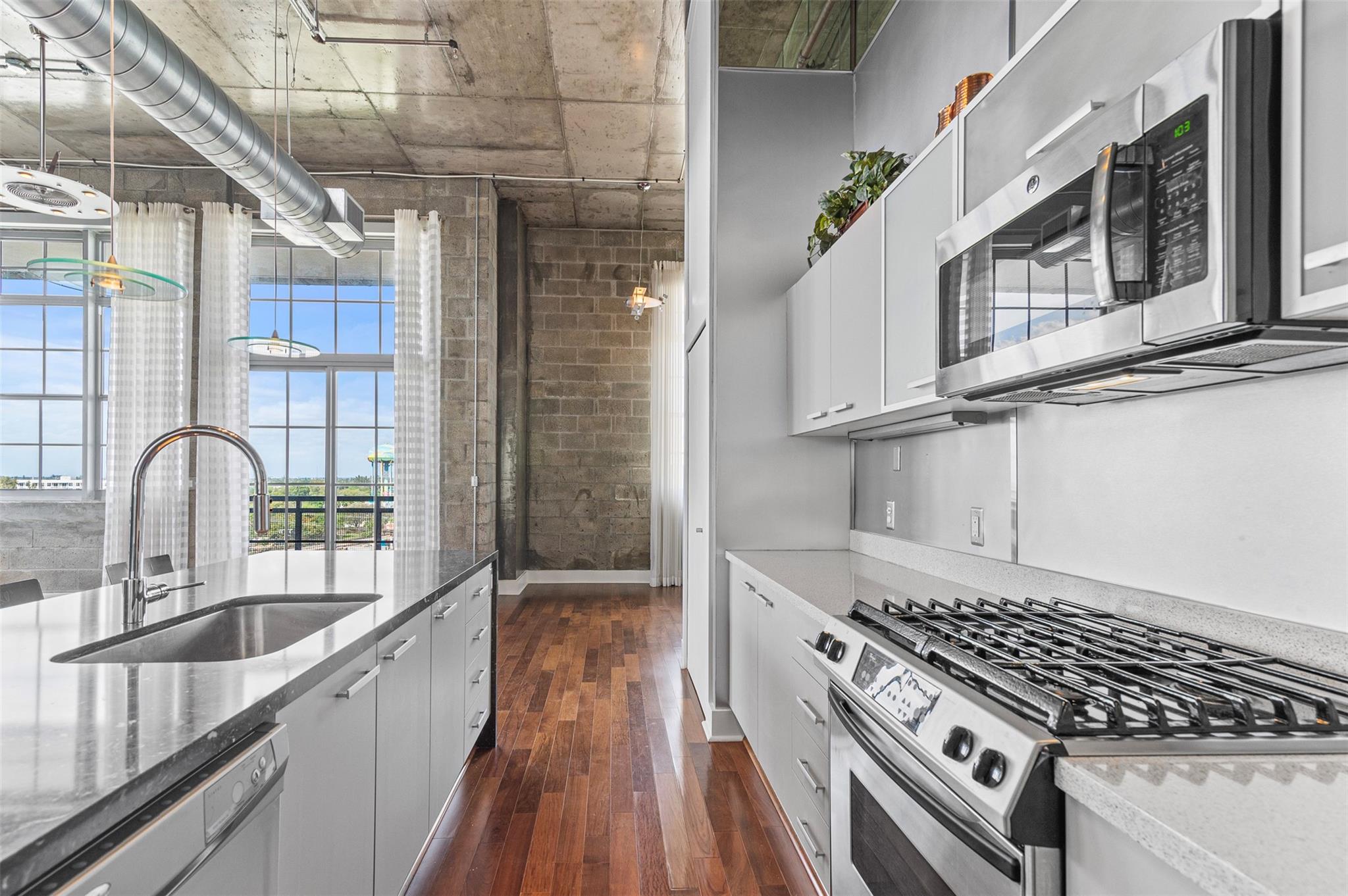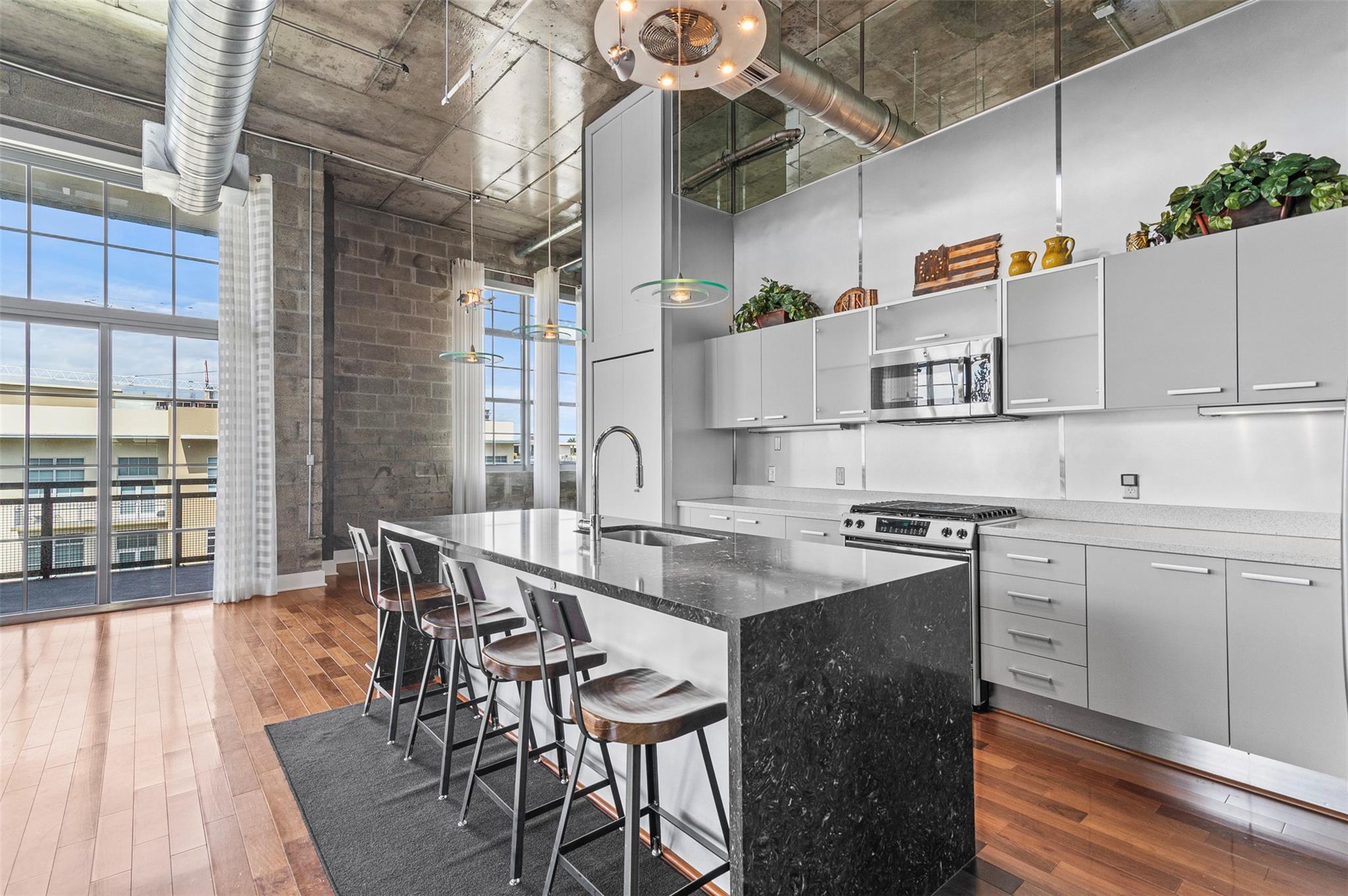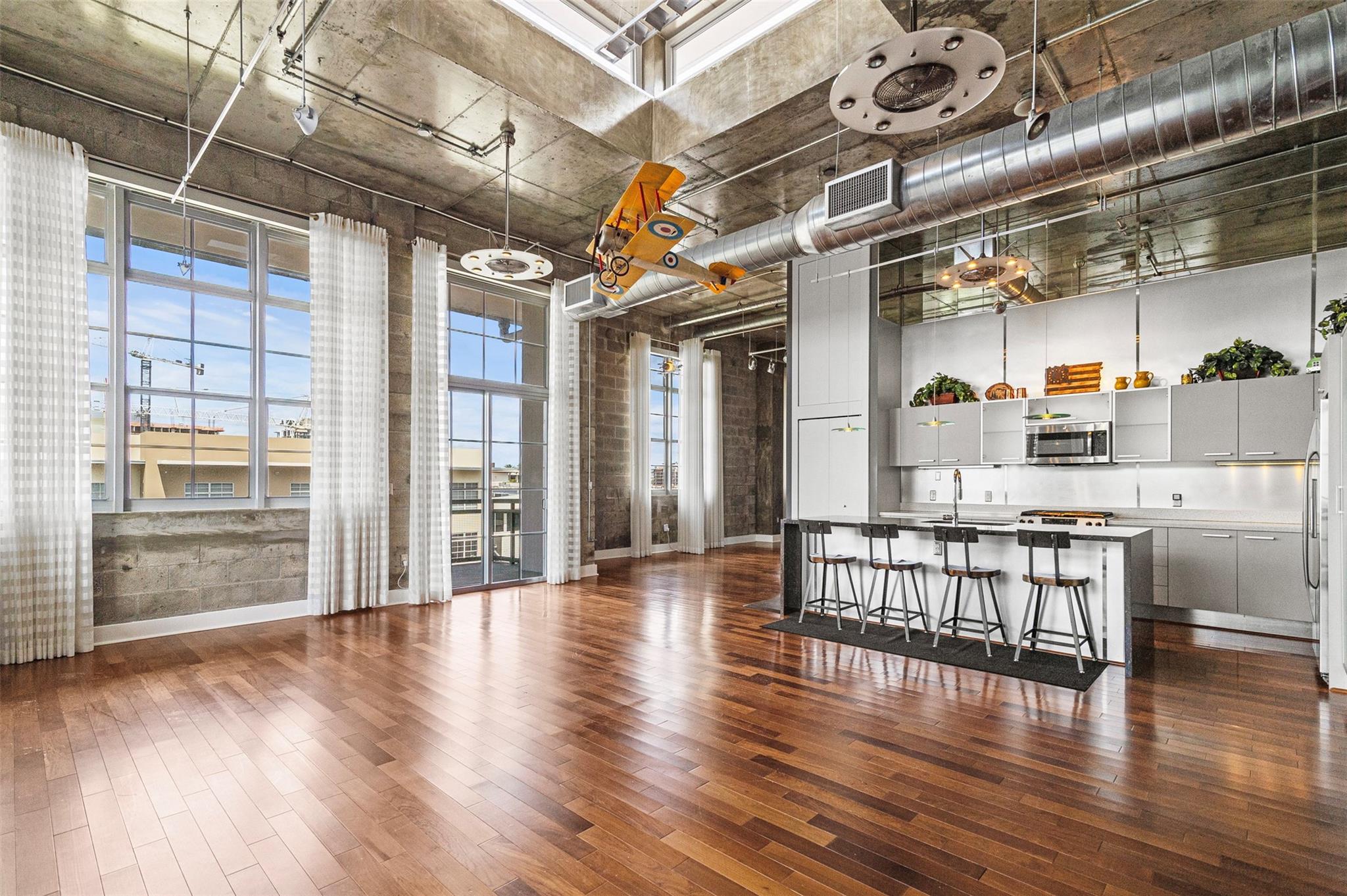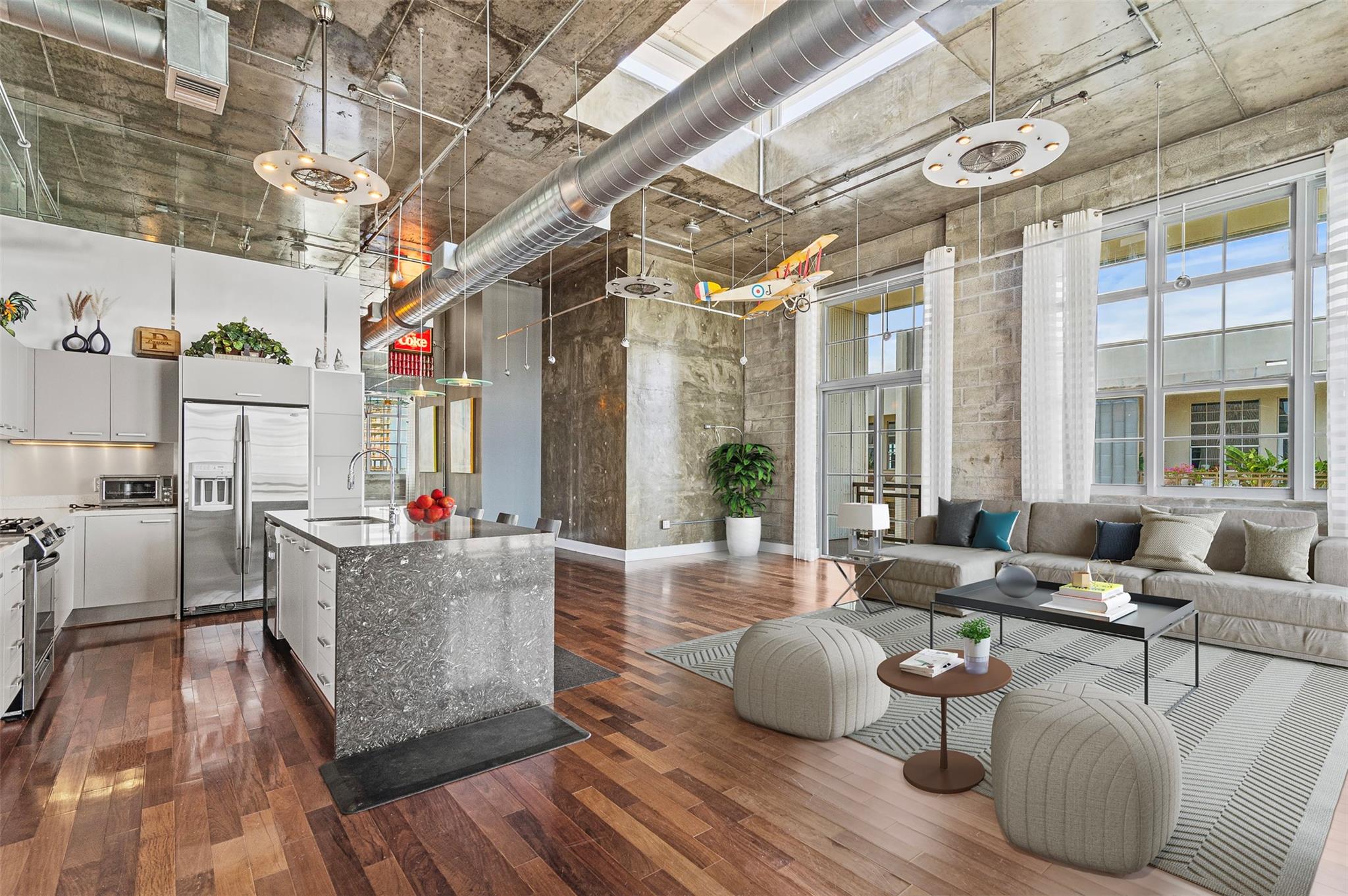Welcome to your dream PENTHOUSE loft in the vibrant Flagler Village neighborhood of Ft Lauderdale! This meticulously designed, one-of-a-kind residence offers a perfect blend of industrial charm & modern sophistication. Featuring soaring ceilings, exposed ductwork, polished concrete accents, open-concept kitchen and expansive windows. The richly-toned hardwood floors add warmth and contrast to the contemporary design, seamlessly connecting kitchen to the spacious living area. Relax in the sunlit living area, wall of windows, and private wrap around balcony to enjoy your morning coffee and beautiful sunsets. Flagler Village is a walkable, artsy community known for its trendy restaurants, galleries, breweries, and boutiques. Minutes from downtown Ft Lauderdale, Las Olas, and pristine beaches.