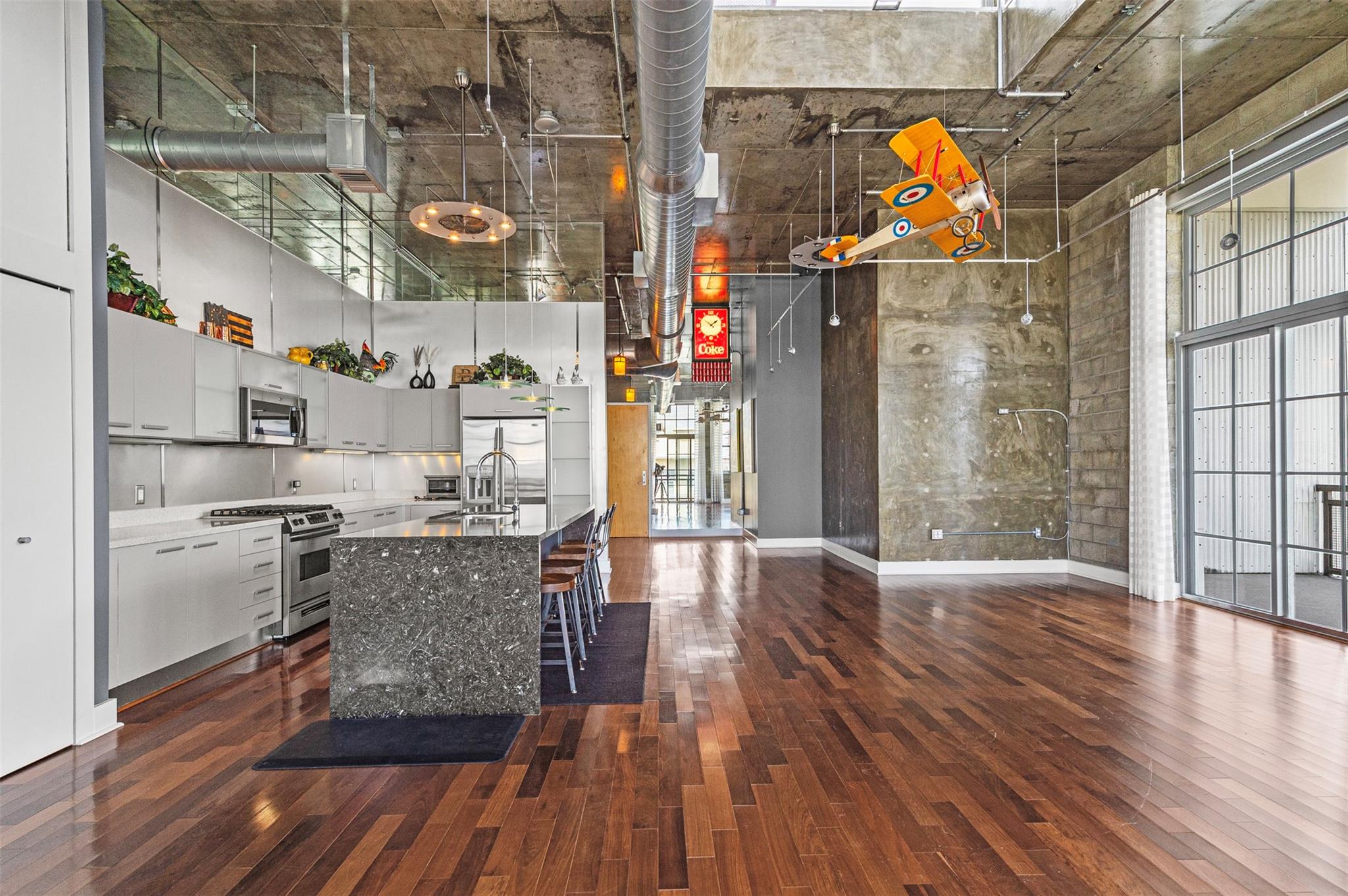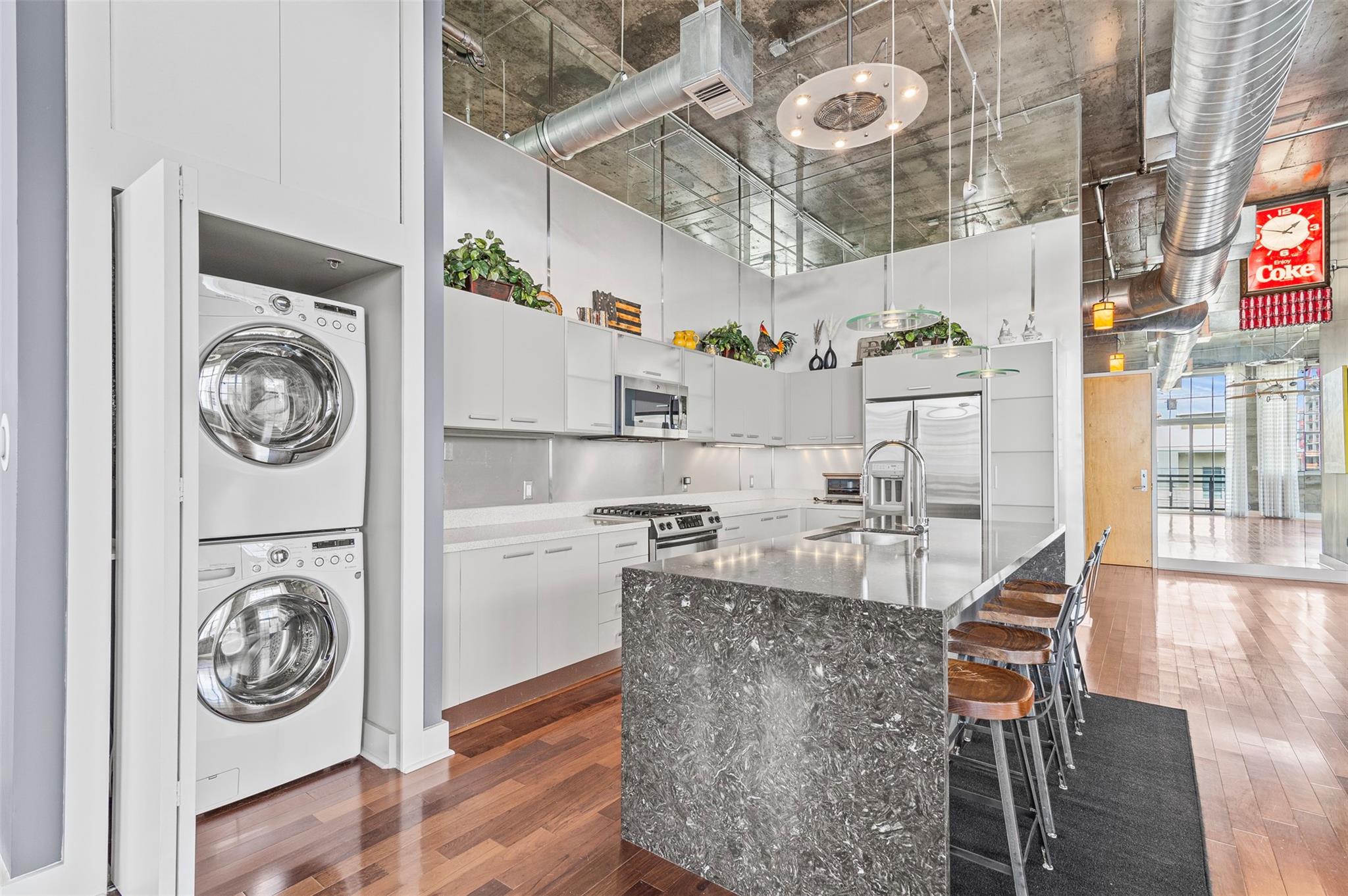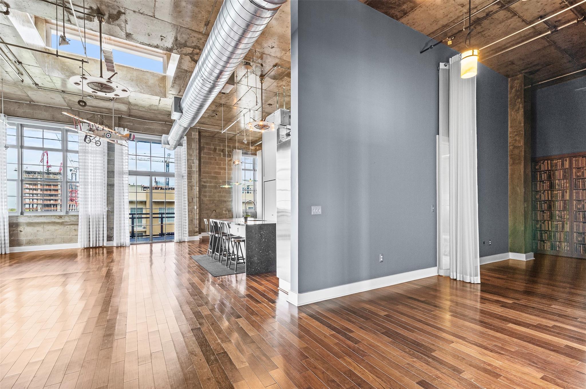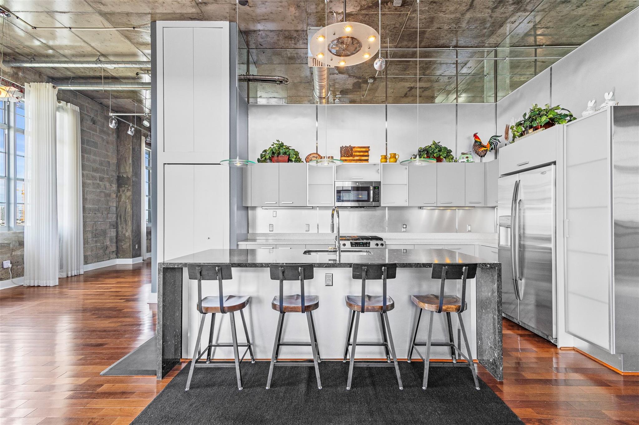 Welcome to your dream PENTHOUSE loft in the vibrant Flagler Village neighborhood of Ft Lauderdale! This meticulously designed, one-of-a-kind residence offers a perfect blend of industrial charm & modern sophistication. Featuring soaring ceilings, exposed ductwork, polished concrete accents, open-concept kitchen and expansive windows. The richly-toned hardwood floors add warmth and contrast to the contemporary design, seamlessly connecting kitchen to the spacious living area. Relax in the sunlit living area, wall of windows, and private wrap around balcony to enjoy your morning coffee and beautiful sunsets. Flagler Village is a walkable, artsy community known for its trendy restaurants, galleries, breweries, and boutiques. Minutes from downtown Ft Lauderdale, Las Olas, and pristine beaches.