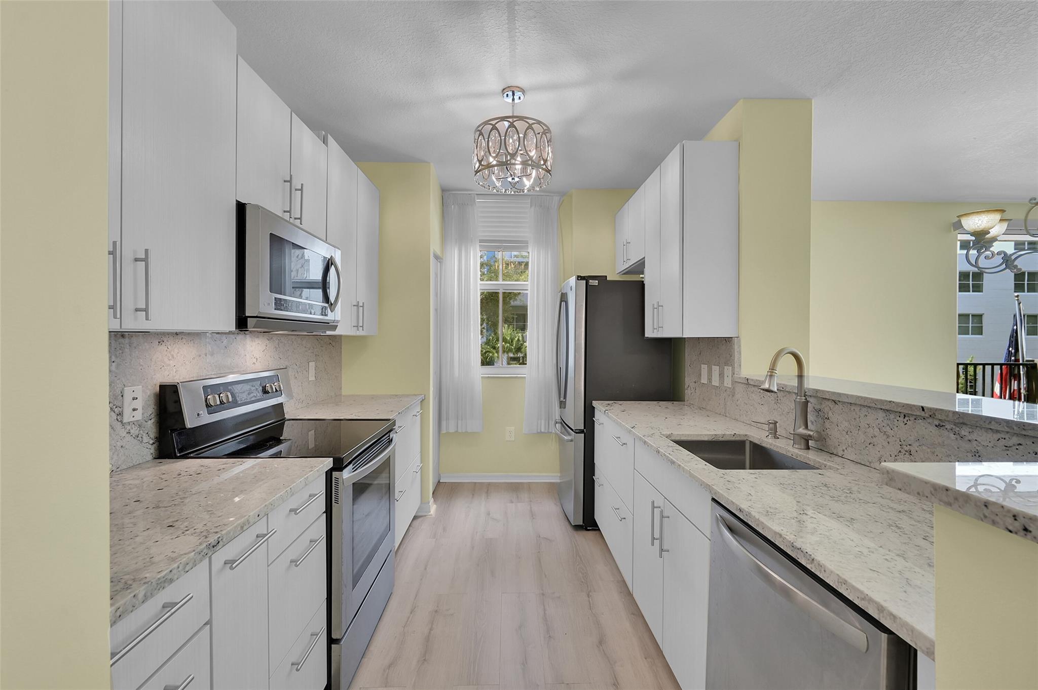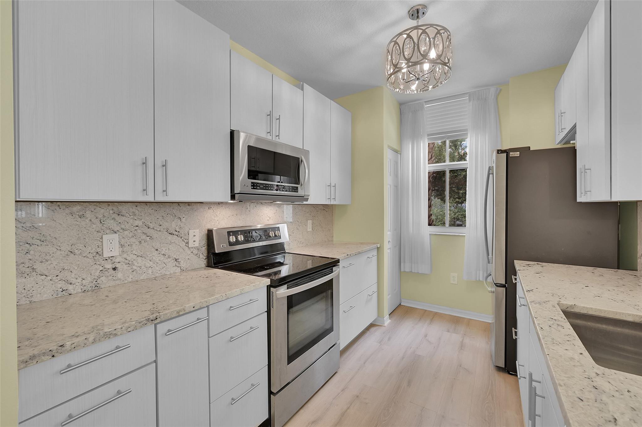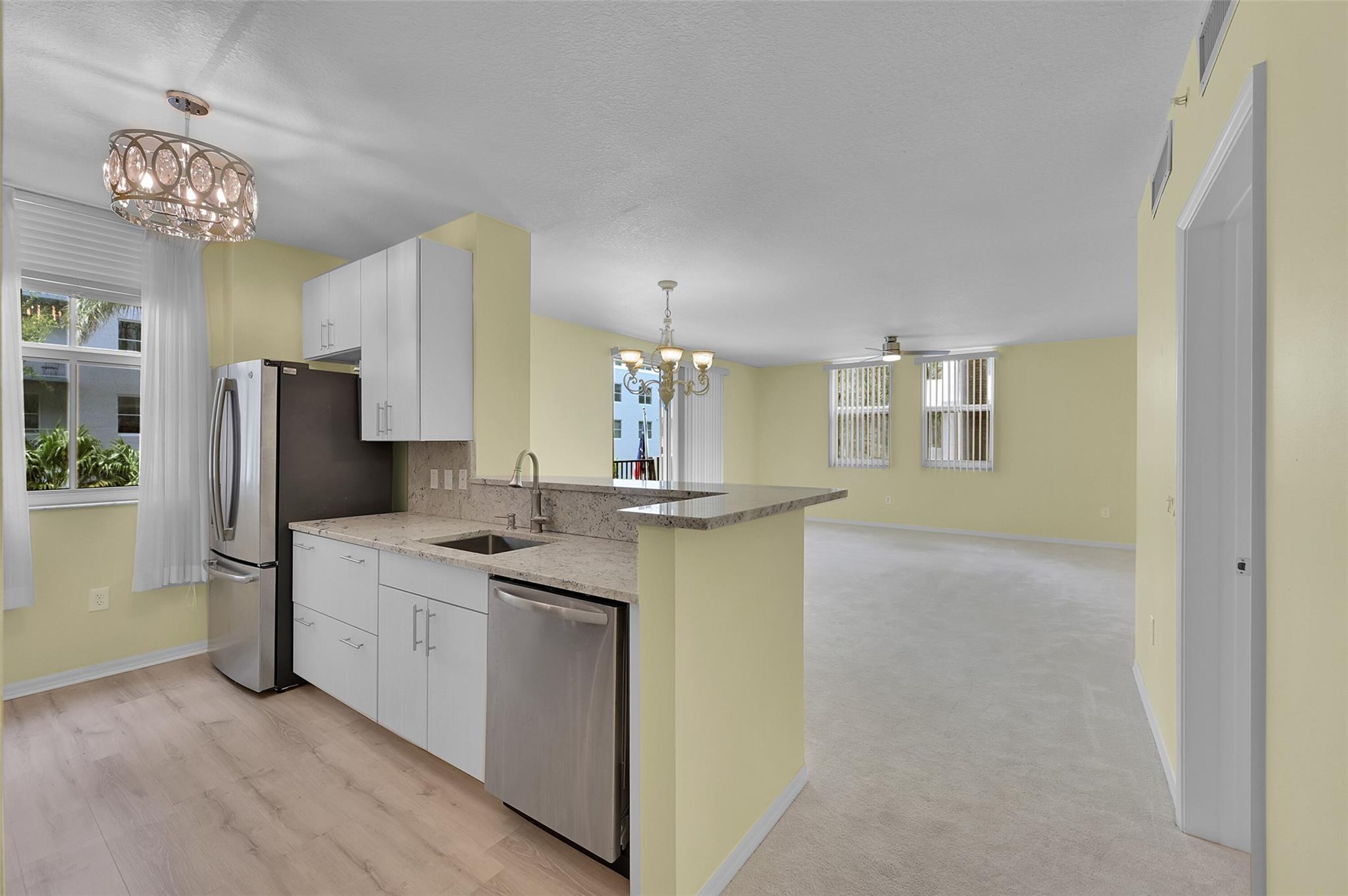 Discover this beautifully updated corner unit in the coveted Lauderdale One condo. The open-concept kitchen boasts new cabinets, SS appliances, granite counters. Spacious living and dining area opens to a private balcony. The split bedroom plan features a large primary suite with an En-suite bath & dual closets. Both bathrooms have been refreshed. High ceilings throughout add to the airy feel. Entrance foyer includes a full-sized washer and dryer. Secure parking with a gated garage spot, ample guest parking & an electric car charging station. Enjoy amenities like a pool, conference center, gym, and on-site manager. This ideally located condo offers modern comfort & convenience. With its thoughtful updates and desirable features, perfect blend of style and functionality in a prime location.