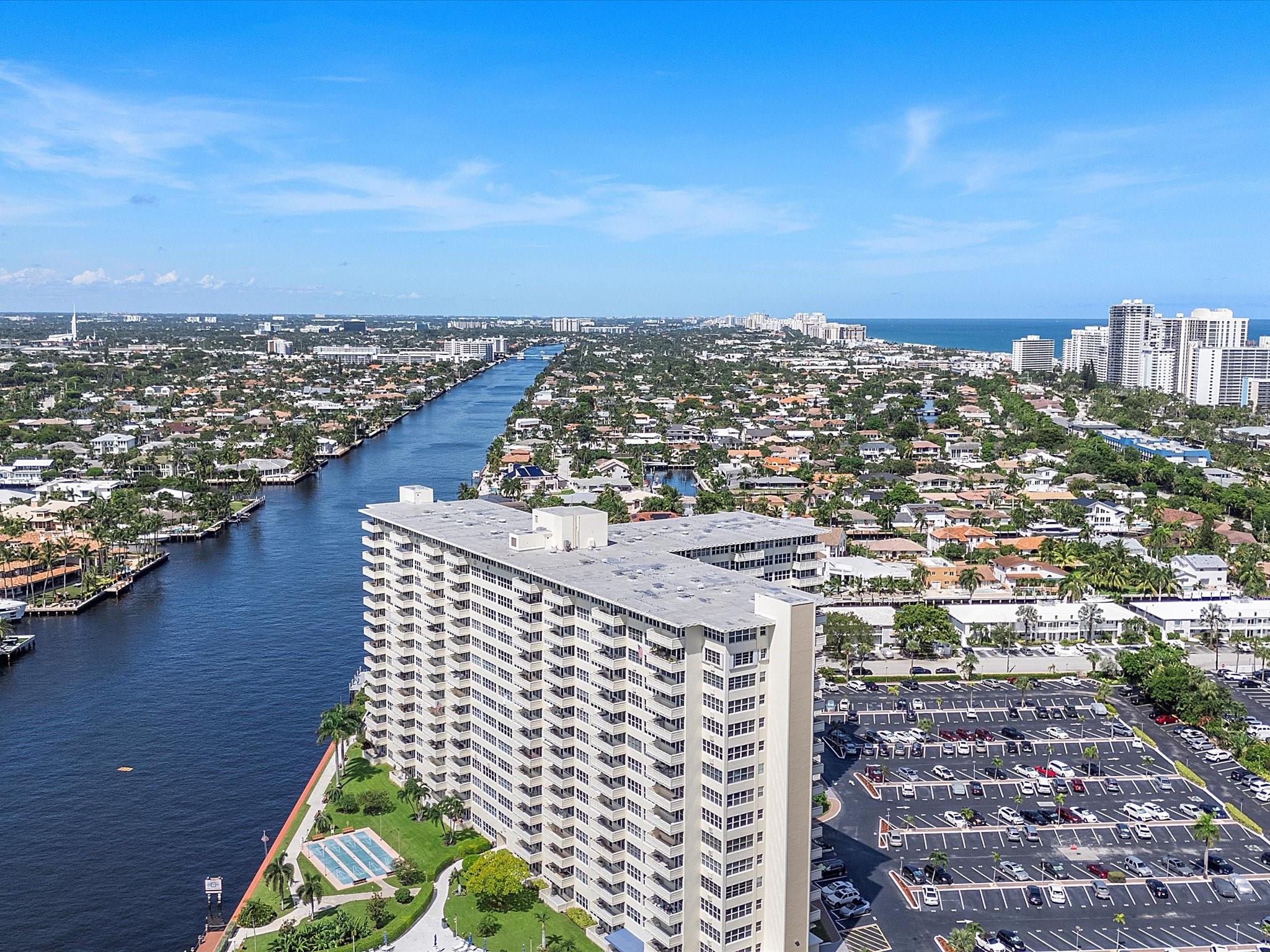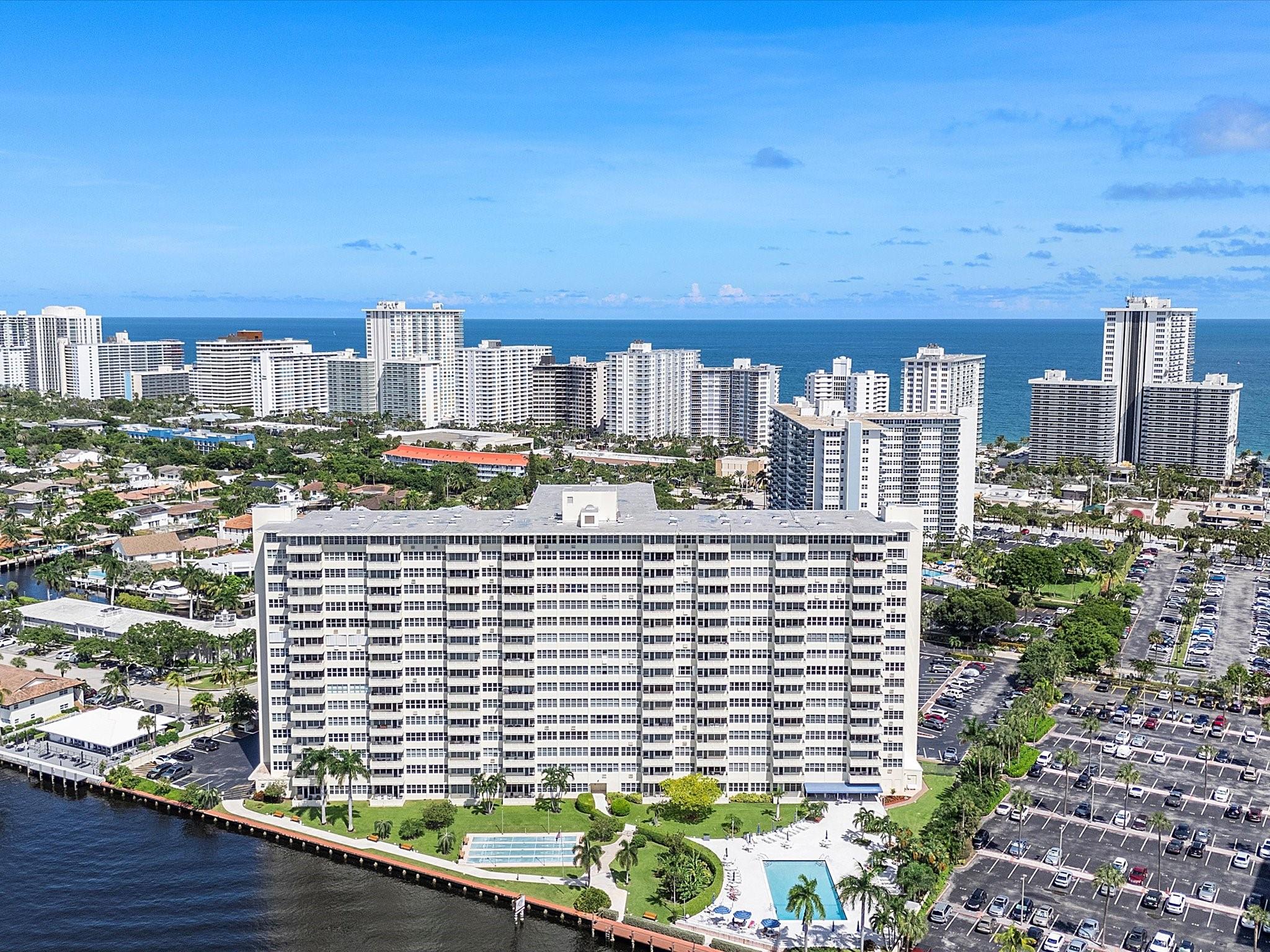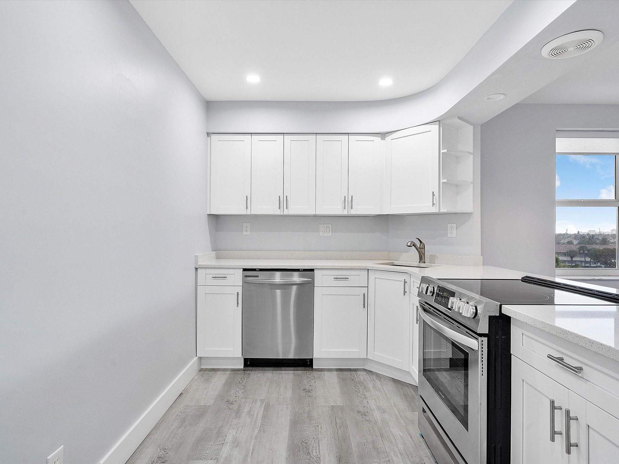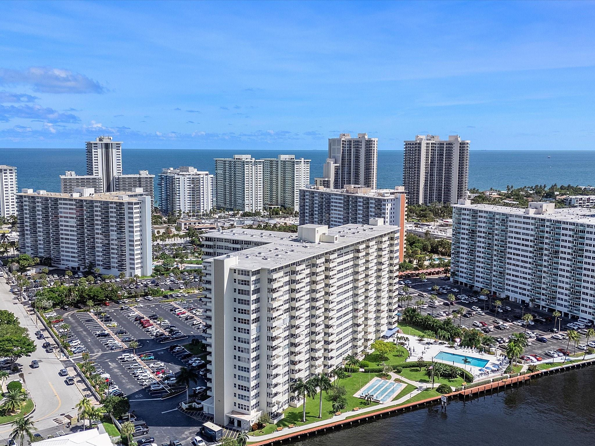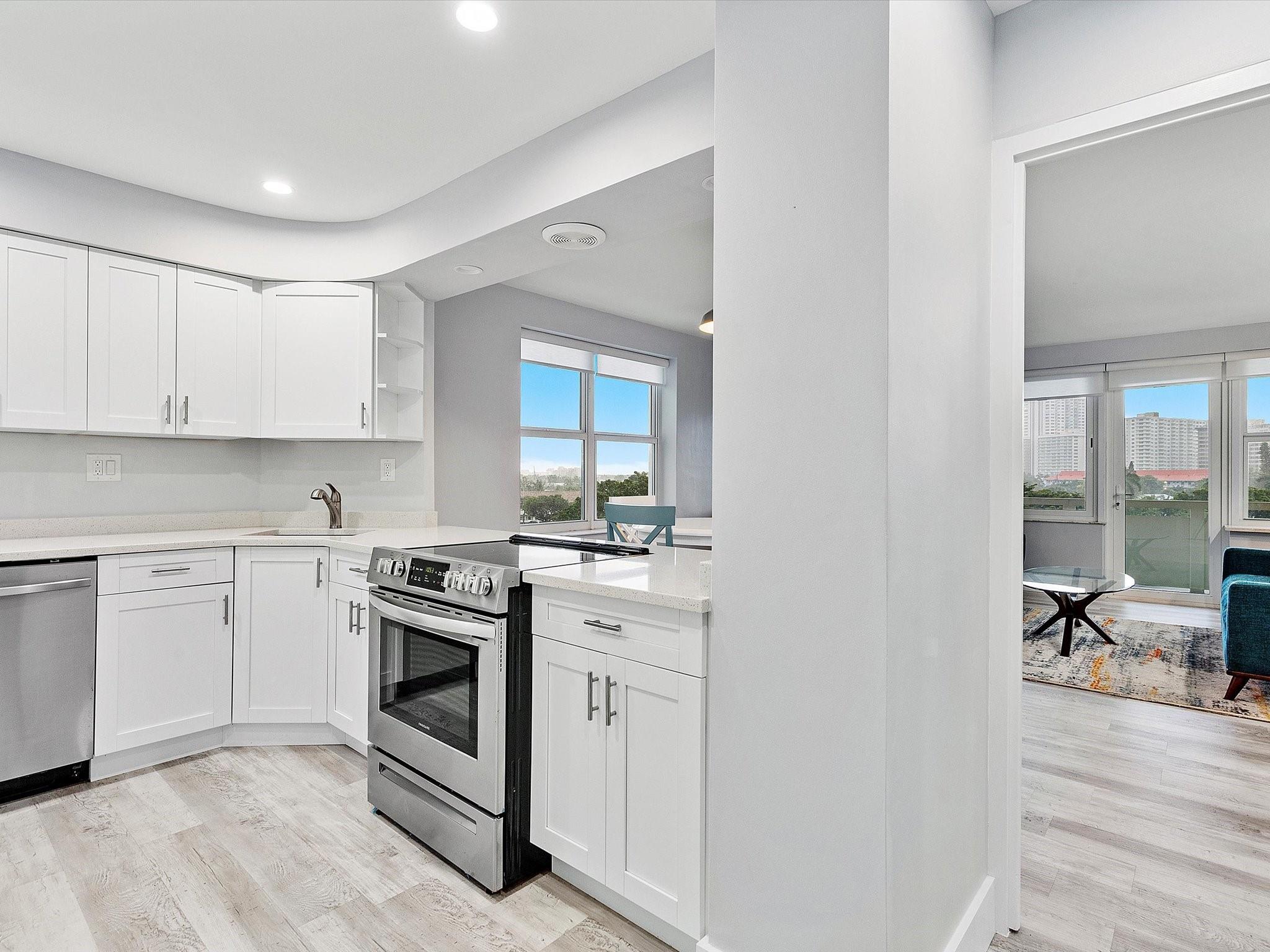 Introducing this spacious, modern 2-bed, 2-bath corner unit Co-Op in the sought-after Coral Ridge Towers North. This 1,120 sq. ft. gem boasts breathtaking water views and an open balcony overlooking the Intracoastal Waterway. Enjoy the convenience of impact windows, central AC, and stylish vinyl flooring throughout. The open kitchen features elegant Quartz countertops and classic white shaker cabinetry, perfect for culinary adventures. Both bedrooms offer custom closets for ample storage. Located just moments from the beach and vibrant Galt Ocean Dr, this residence is surrounded by shopping, dining, and entertainment options. Community amenities include a heated pool, library, community room, BBQ area, fitness center, and 24-hour security, ensuring a lifestyle of comfort and convenience.