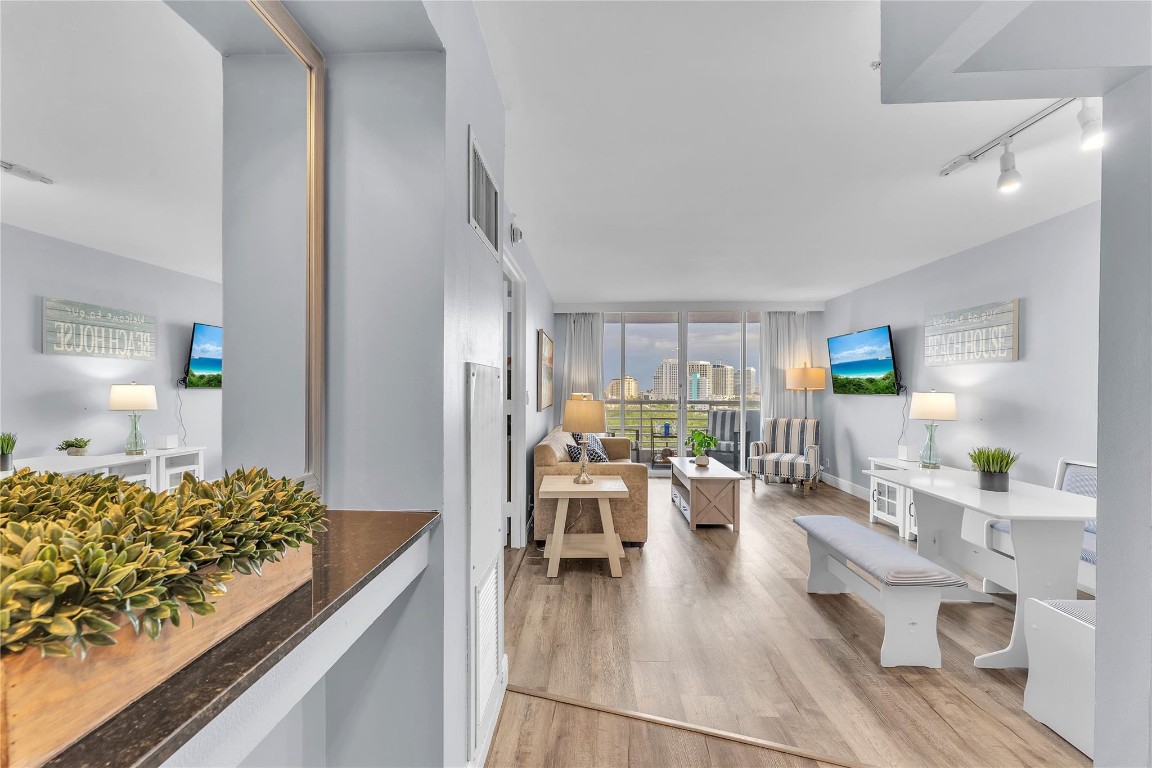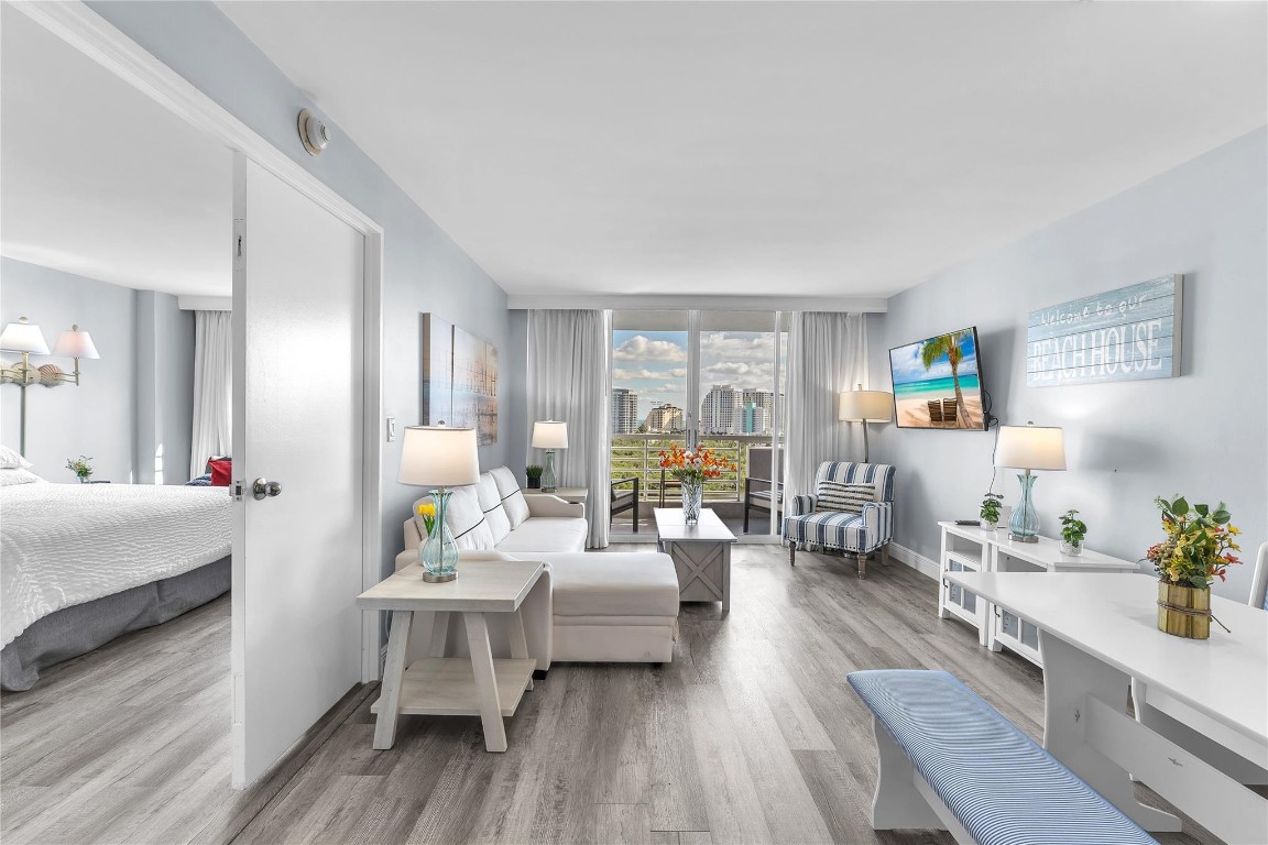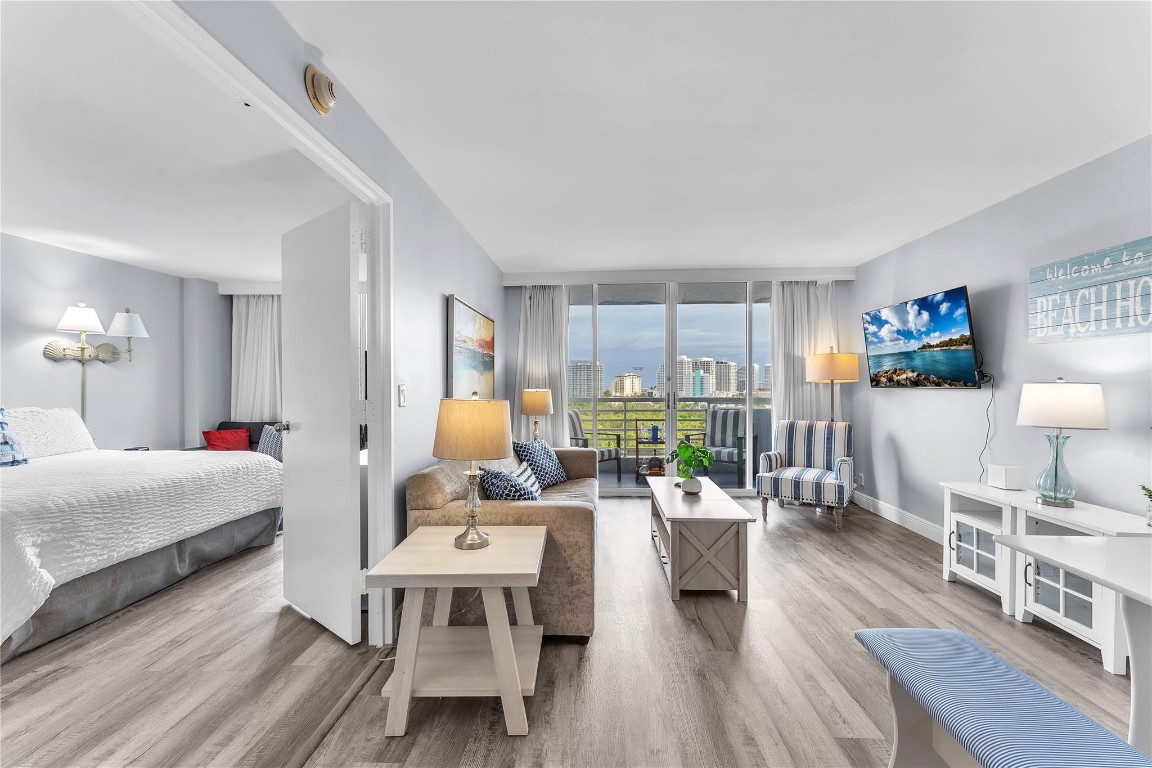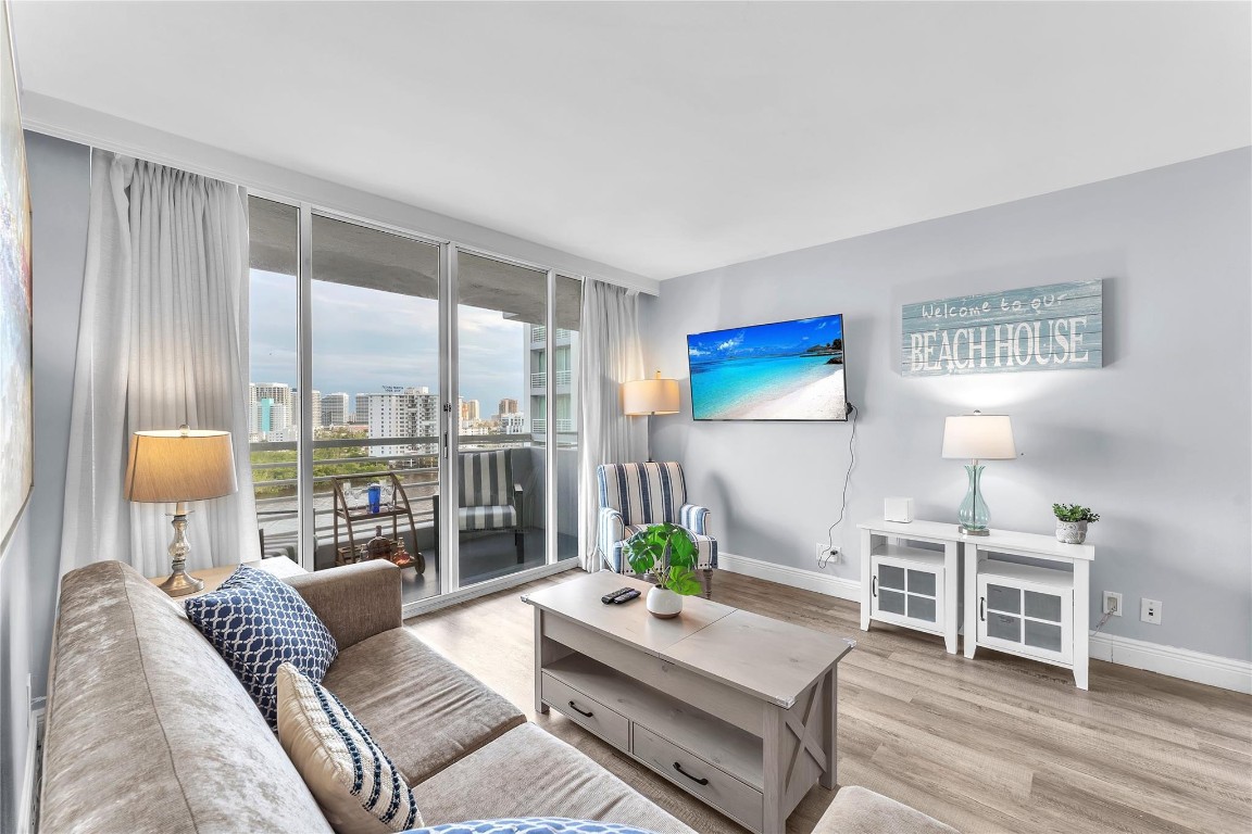 STUNNING INTRACOSTAL and OCEAN VIEWS from private balcony.3 minute walk to the ocean! Fully furnished 1 King bed/1bath, 2 Queen sofa pull outs. Completely rehabbed in the past few months Beautifully furnished light and airy color interior in resort location featuring heated swimming pool, restaurants, supermarket all within a block. Fully equipped kitchen, Access to many AMMENITIES; Pool, Cafe, Tiki Bar, Restaurant, Gym, Business center, etc. Jet ski RENTAL on site. Skip traffic & go to Las Olas via WATER TAXI, is Great location for short term rental which is its current use. Conveniently located in Gallery one!