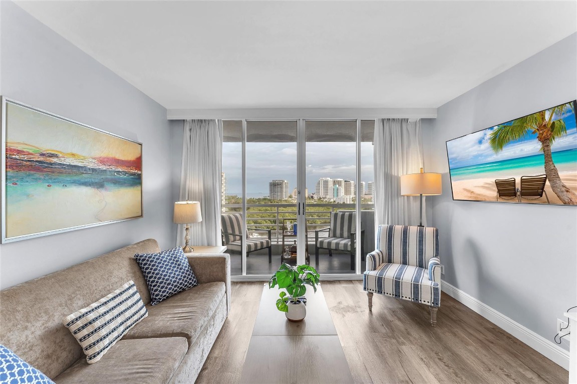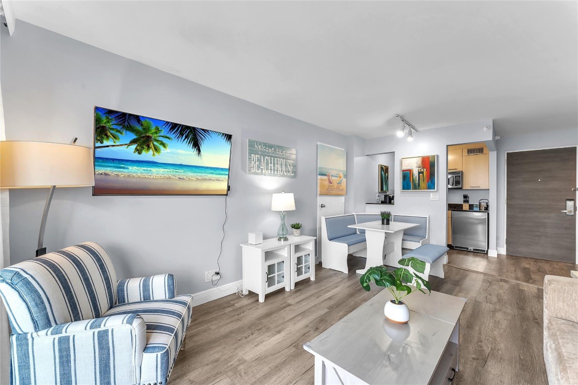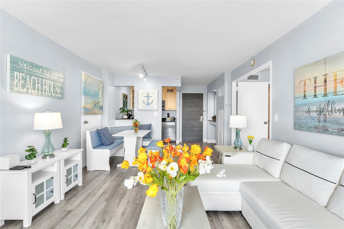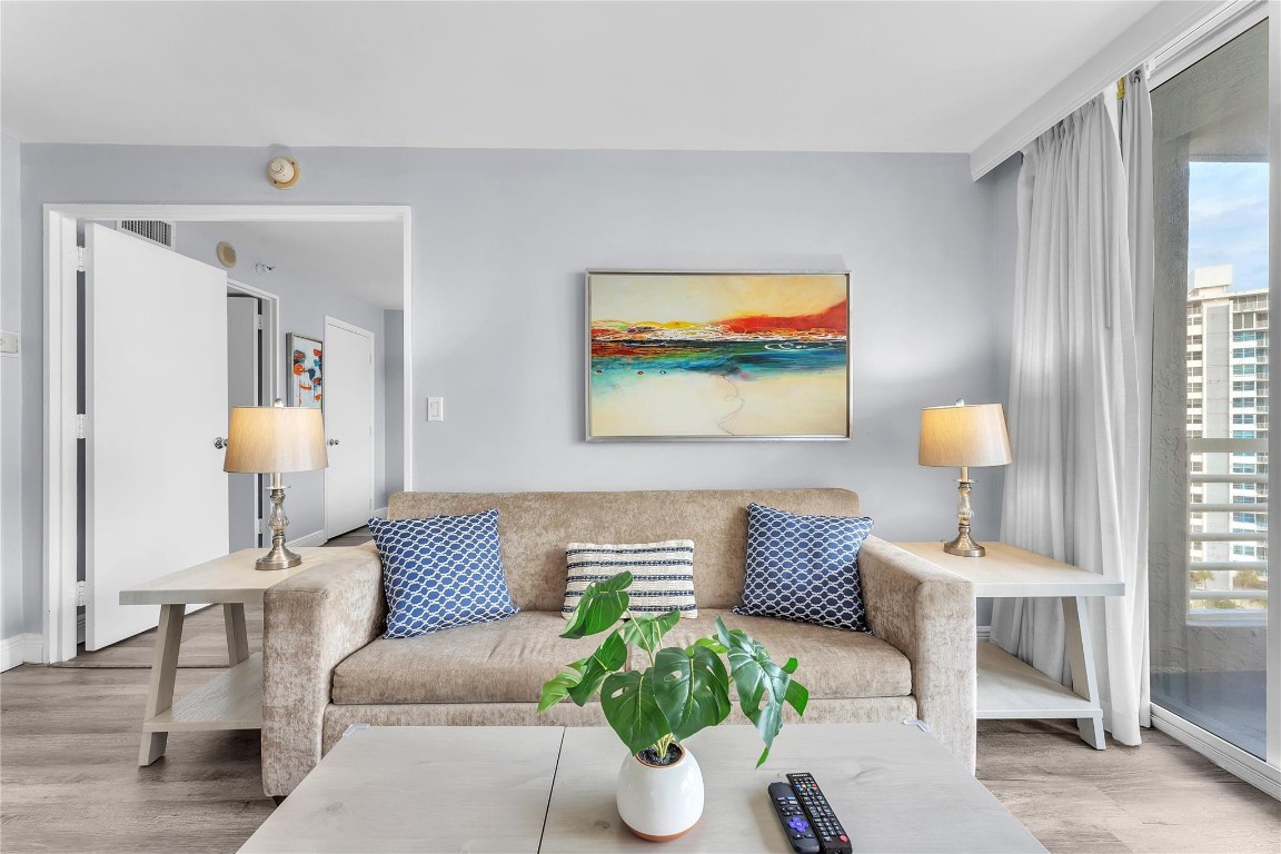 STUNNING INTRACOSTAL and OCEAN VIEWS from private balcony.3 minute walk to the ocean! Fully furnished 1 King bed/1bath, 2 Queen sofa pull outs. Completely rehabbed in the past few months Beautifully furnished light and airy color interior in resort location featuring heated swimming pool, restaurants, supermarket all within a block. Fully equipped kitchen, Access to many AMMENITIES; Pool, Cafe, Tiki Bar, Restaurant, Gym, Business center, etc. Jet ski RENTAL on site. Skip traffic & go to Las Olas via WATER TAXI, is Great location for short term rental which is its current use. Conveniently located in Gallery one!