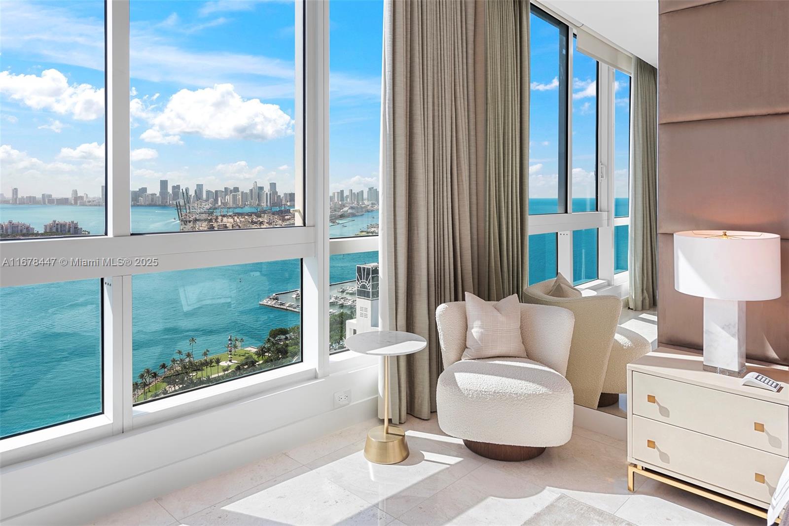 Newly renovated and turnkey furnished by Minotti, coupled with jaw-dropping panoramas make this the most desirable 2-bedroom at Continuum. Enter through a grand private lobby and witness amazing susnets over the Miami skyline, Fisher island. The principal suite with warm textures and earthy tones boasts a siting lounge, oversized walk-in and beautiful marble bath. European kitchen features new Miele appliances, quartz stone tops. Louvered millwork adonres the formal living, equiped with Sonos system. Residents will induldge in a lifestyle of wellness within a private, 13 acre oasis, including a tri-level fitness club, medspa, salon, pilattes/spining/yoga, 3 pools, cold-plundges, 3 Har-tru tennis courts, beach club, Patio and Catch retaurants on site. Walk to the best culinary scene in SoFi