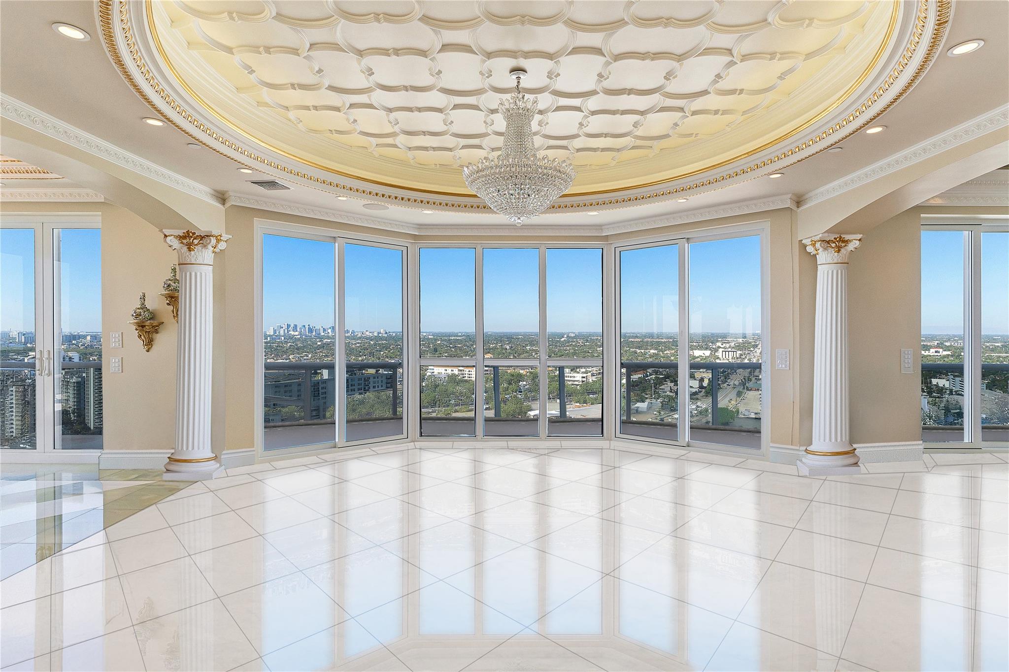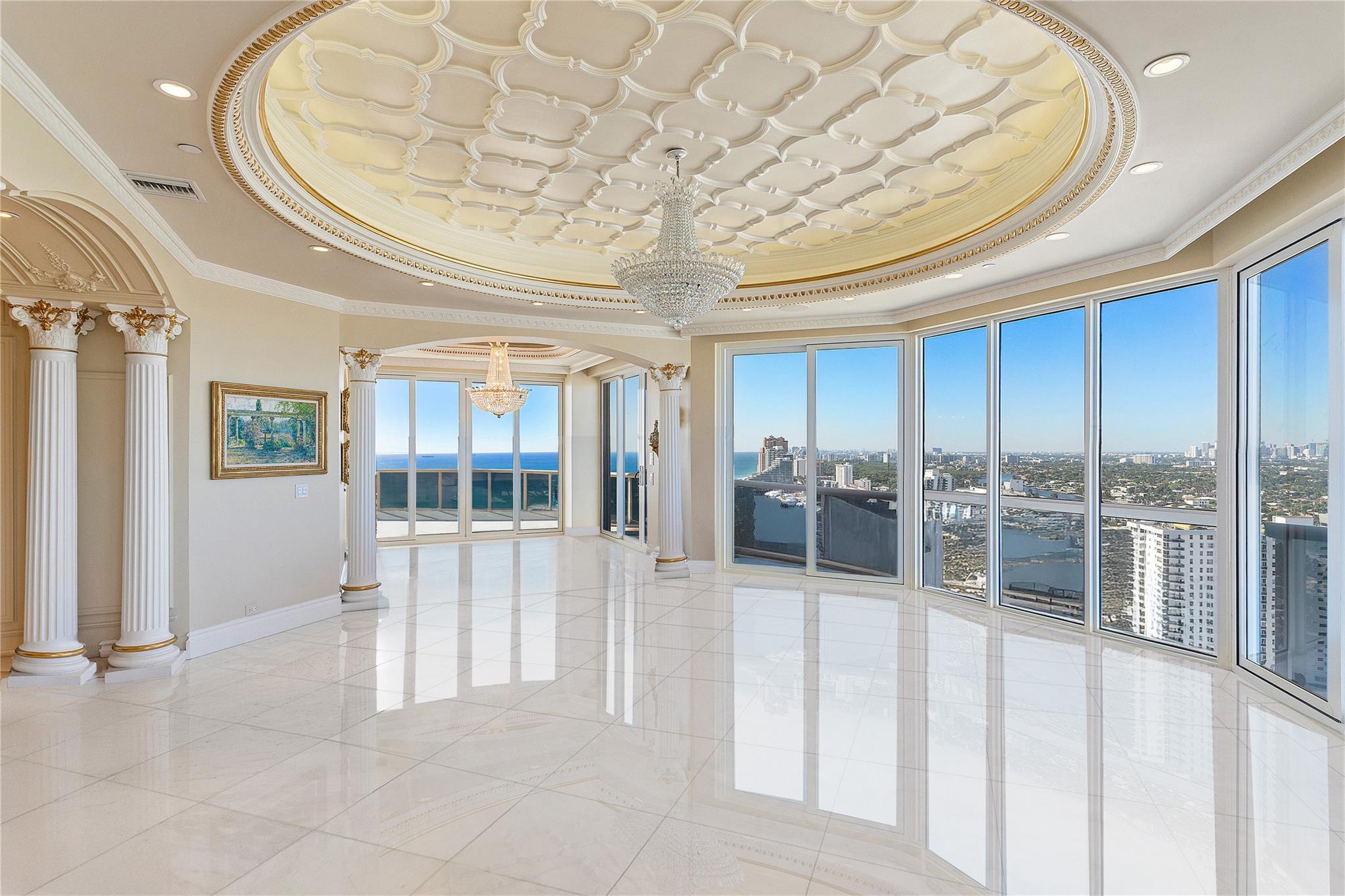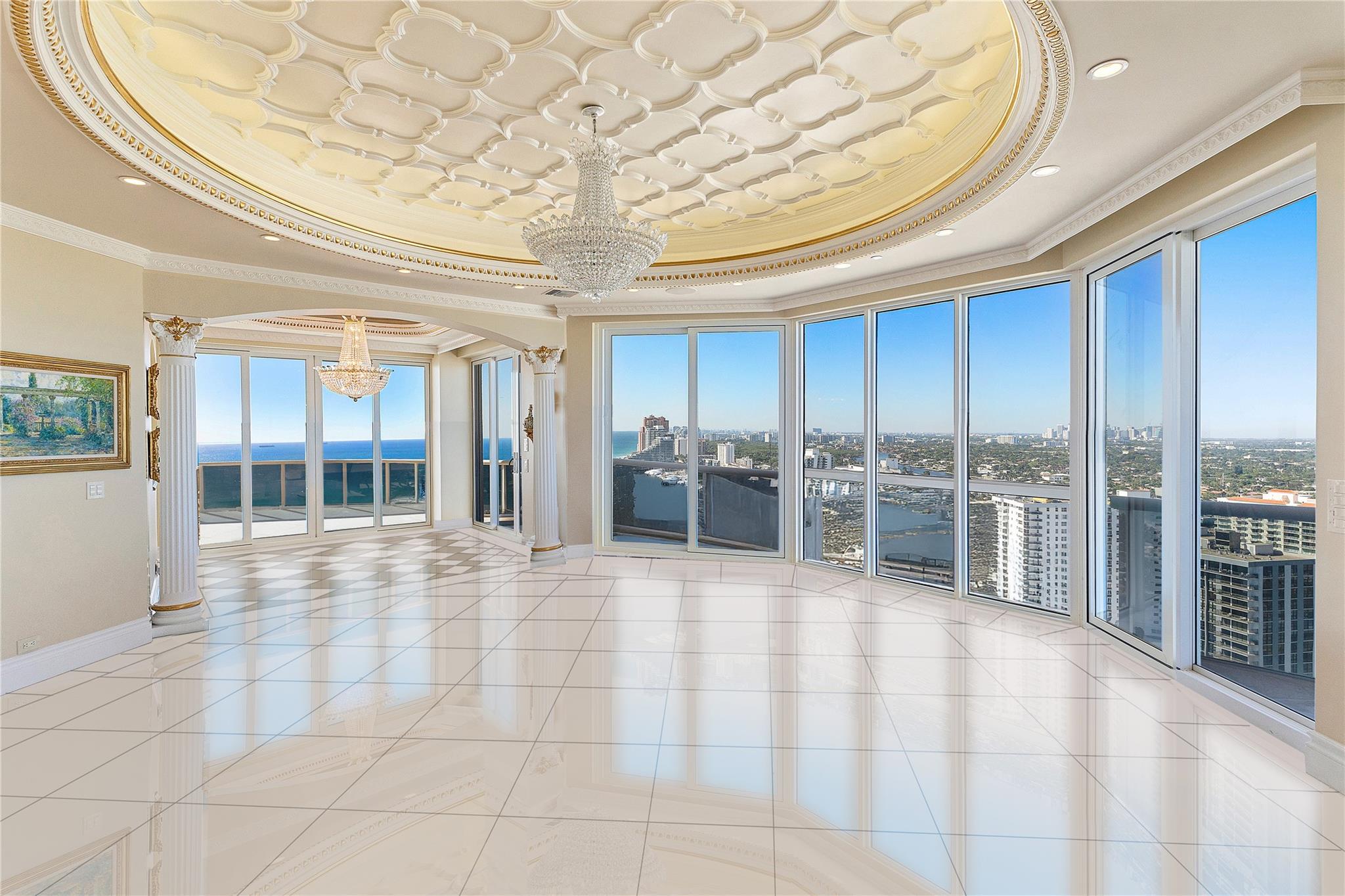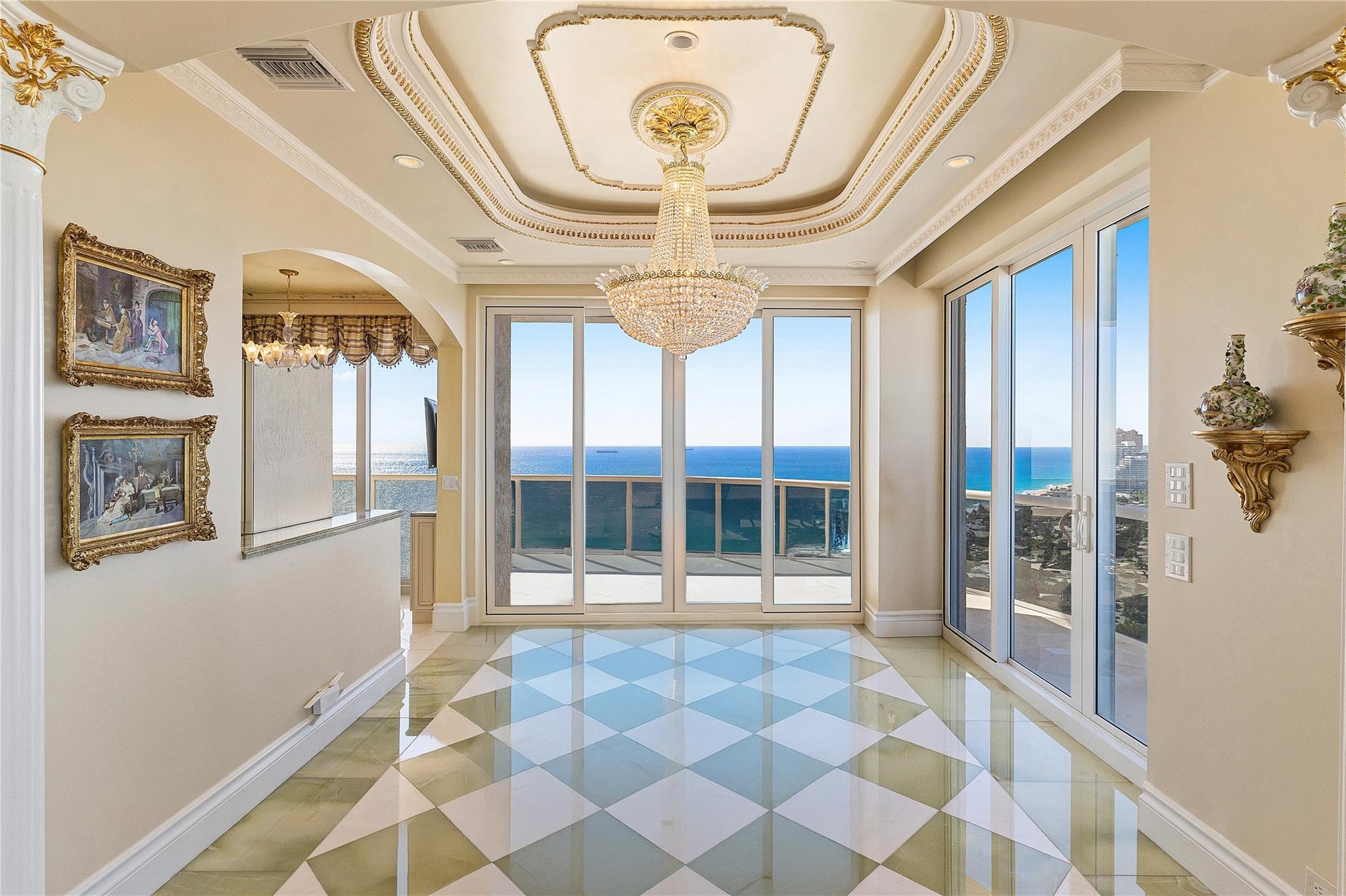 PENTHOUSE - Experience unparalleled oceanfront luxury in this sprawling Penthouse at L’ Hermitage of Ft Lauderdale Beach. Spanning 4,404 sq ft, this residence offers a private elevator to your foyer, where you will find panoramic ocean, city & intracoastal views through floor to ceiling impact windows. Wake to the coastal sunrise & entertain under stunning sunsets. This palace in the sky includes 4 large balconies, a home theatre, a massage/fitness room with sauna, a study/office, marble inlay flooring with onyx and amethyst, coffered ceilings, 3 garage spots & much more. L’Hermitage delivers resort-style living with 2 pools, jacuzzi, poolside restaurant, two clay tennis courts, a private beach with cabanas & attendants, valet, concierge and more. Coastal elegance redefined.