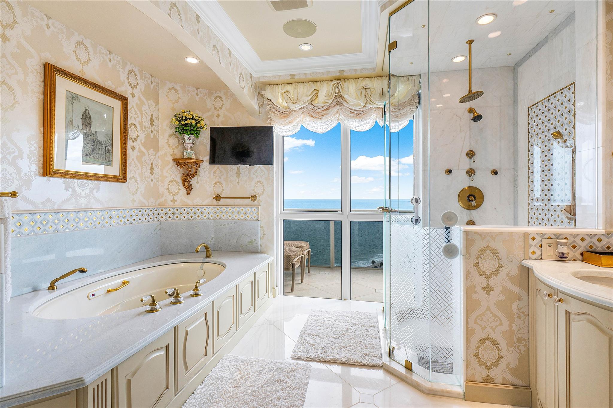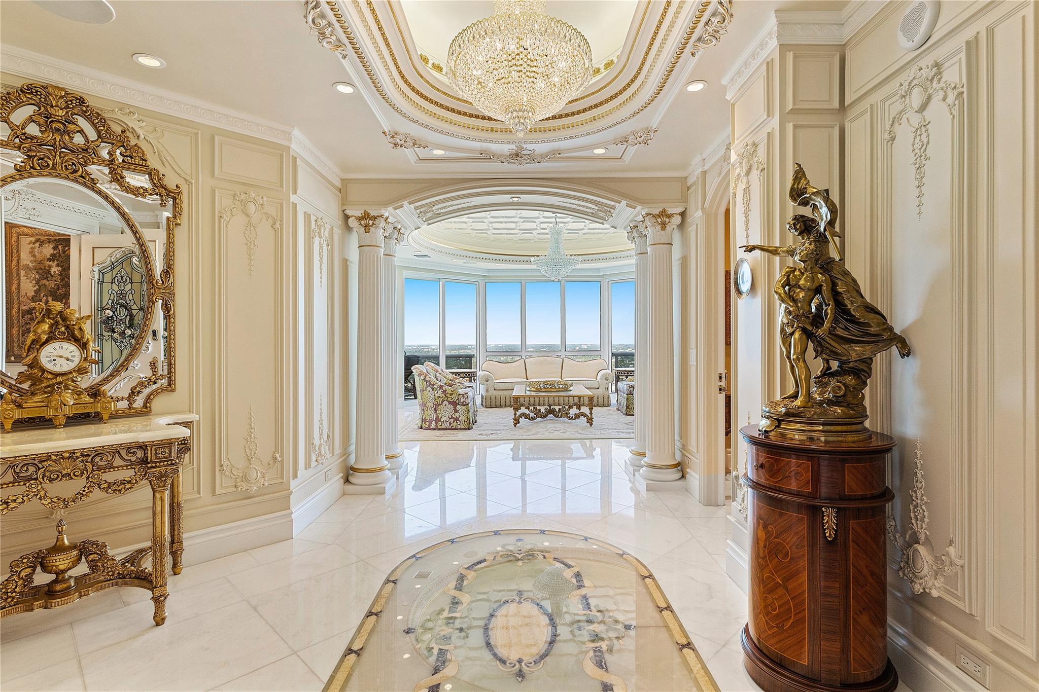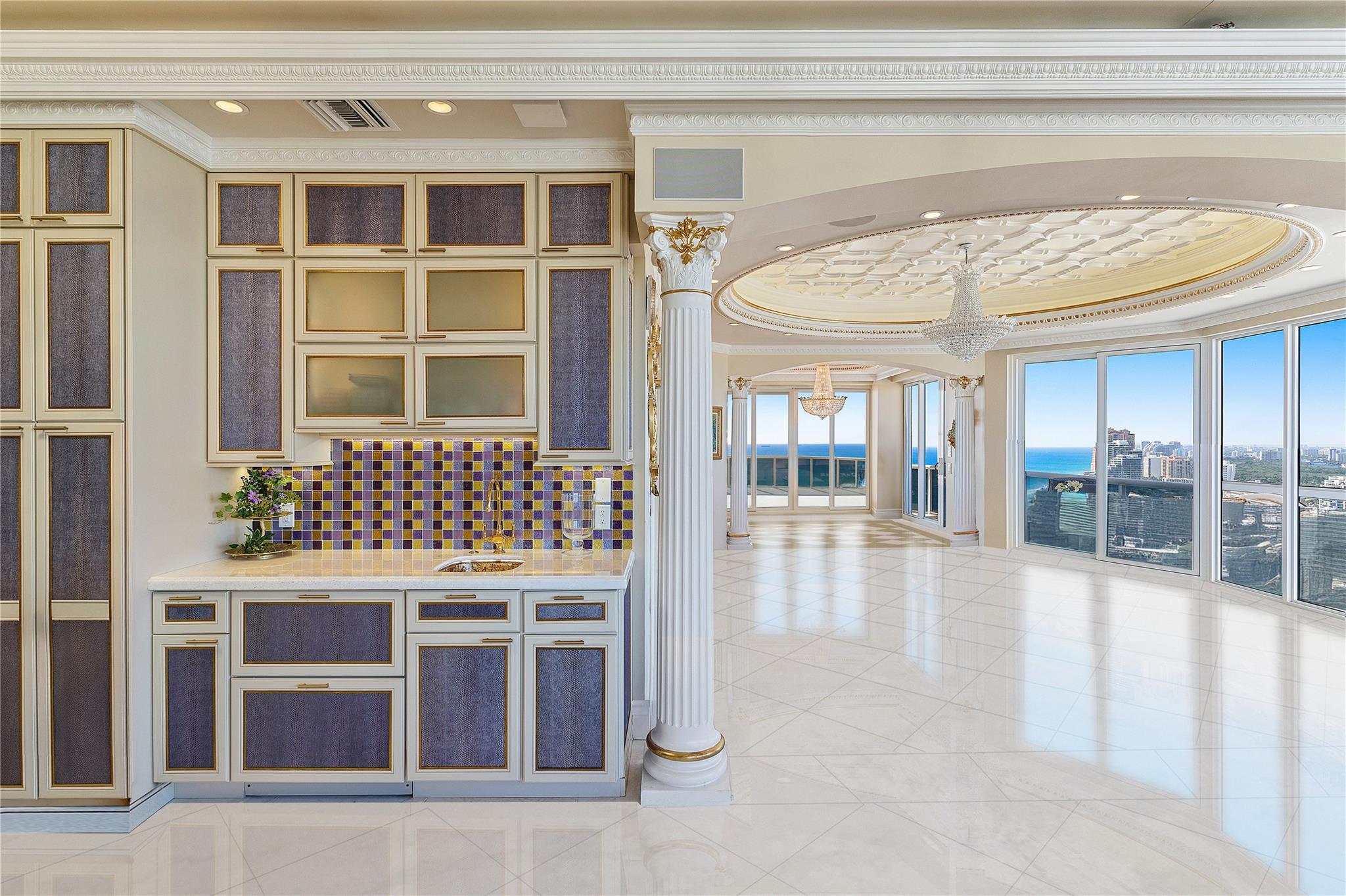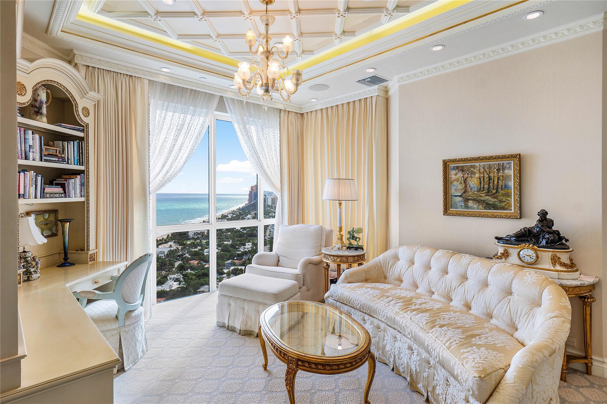 PENTHOUSE - Experience unparalleled oceanfront luxury in this sprawling Penthouse at L’ Hermitage of Ft Lauderdale Beach. Spanning 4,404 sq ft, this residence offers a private elevator to your foyer, where you will find panoramic ocean, city & intracoastal views through floor to ceiling impact windows. Wake to the coastal sunrise & entertain under stunning sunsets. This palace in the sky includes 4 large balconies, a home theatre, a massage/fitness room with sauna, a study/office, marble inlay flooring with onyx and amethyst, coffered ceilings, 3 garage spots & much more. L’Hermitage delivers resort-style living with 2 pools, jacuzzi, poolside restaurant, two clay tennis courts, a private beach with cabanas & attendants, valet, concierge and more. Coastal elegance redefined.