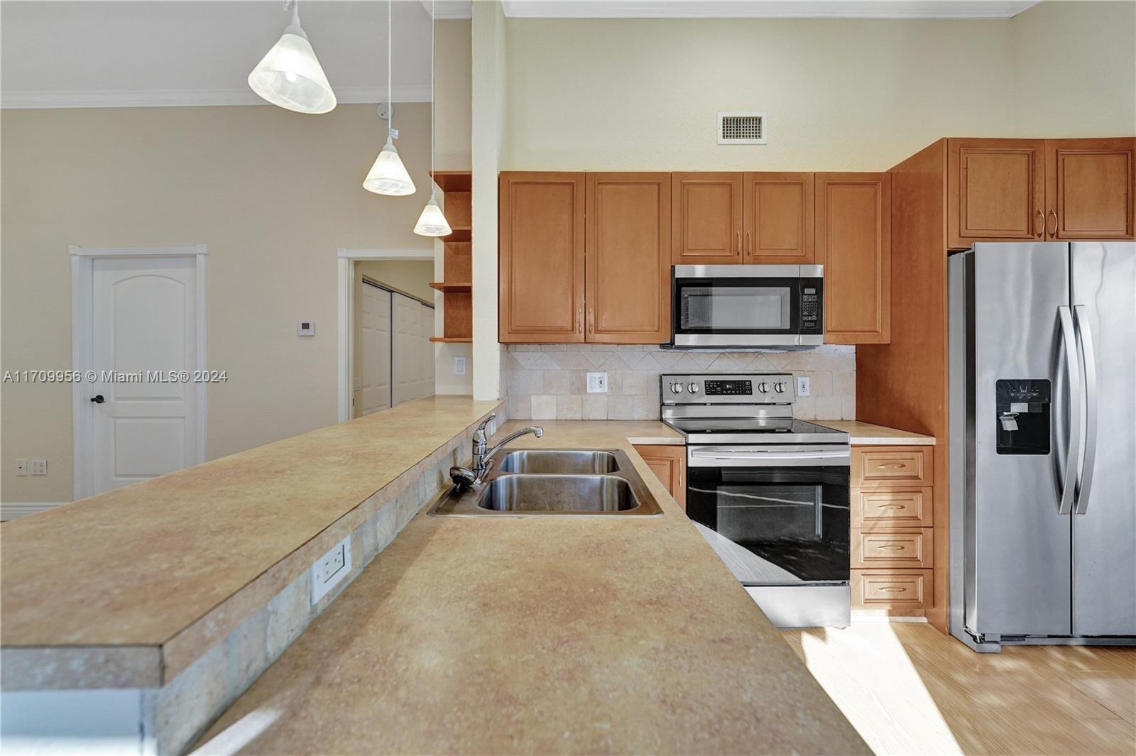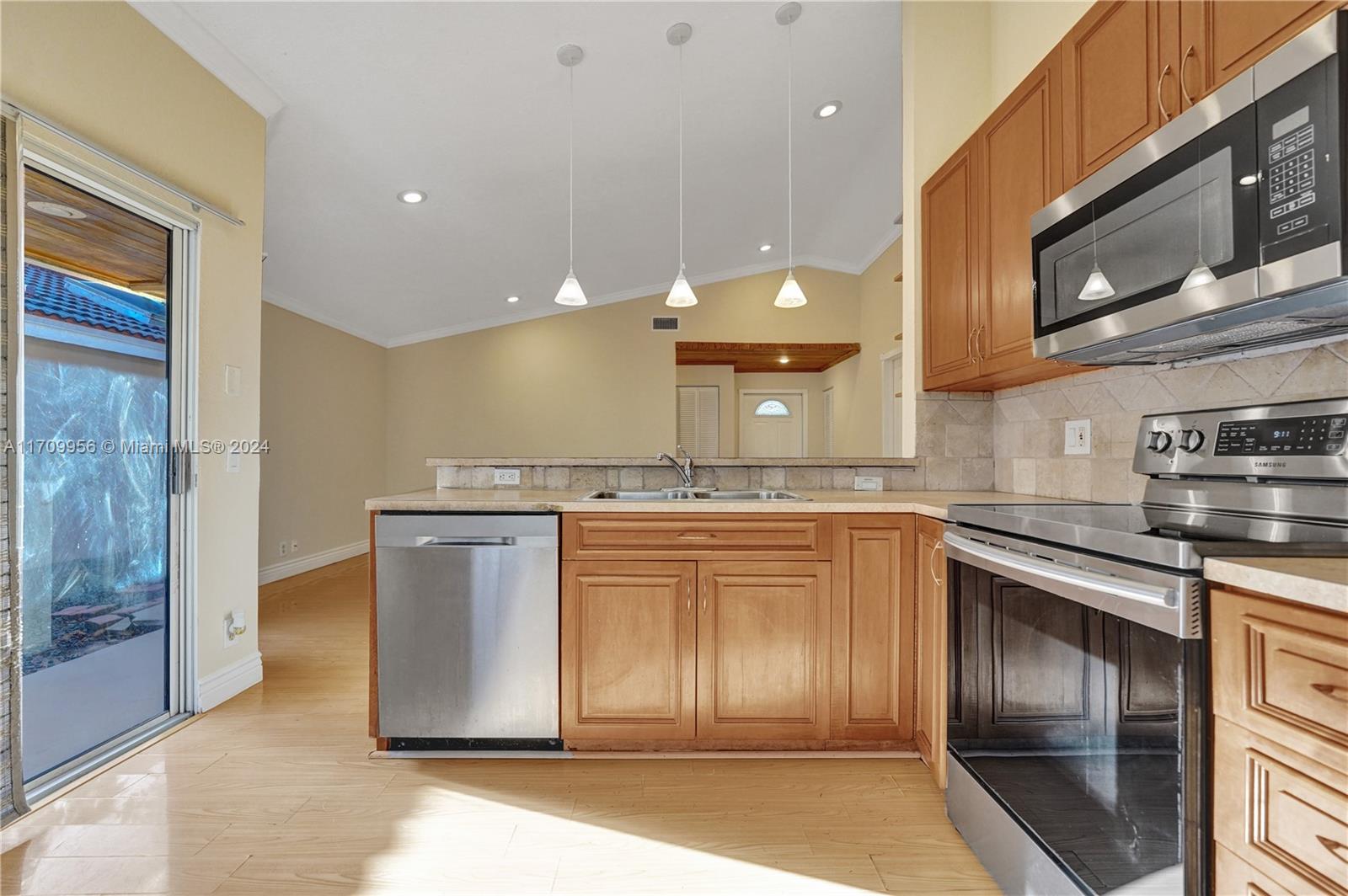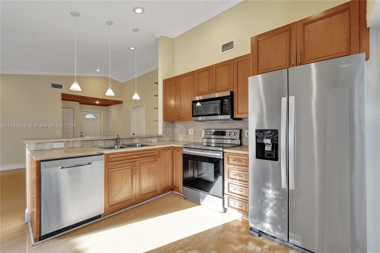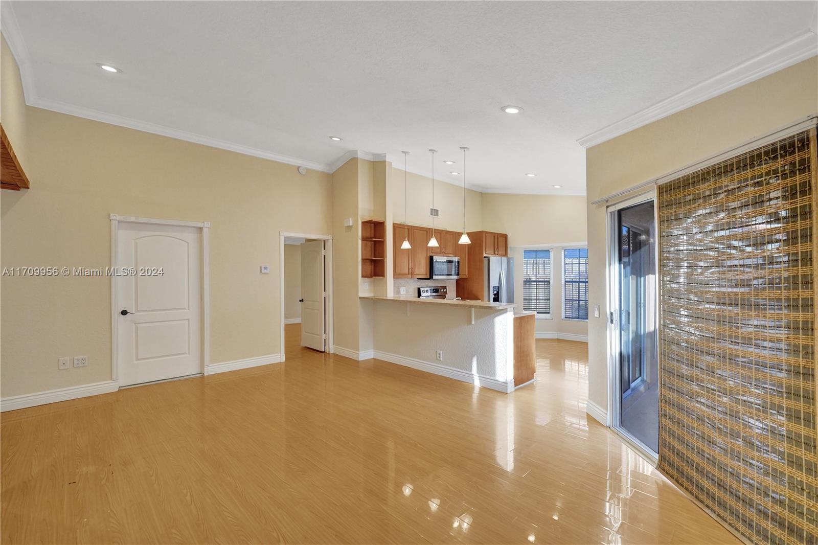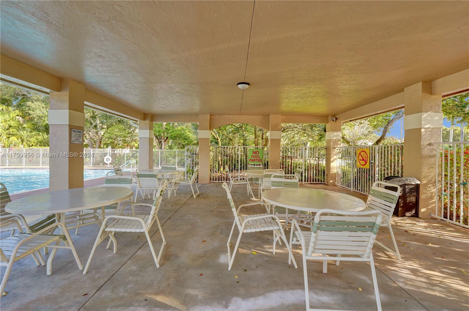 Light and bright, this 2 bed, 2 bath, 1 car garage home is waiting for you! Enjoy an open concept floor plan with laminate flooring throughout, a spacious kitchen with pendant lighting, tastefully remodeled baths, soaring vaulted ceilings and natural light in abundance. Outside, find a fully fenced backyard and a covered patio perfect for lounging. Your comfort and energy efficiency are further enhanced with a newer A/C (2022) and tile roof installed in 2011! Ideally located in the heart of Weston near top-rated schools, shopping, dining, parks, worship centers, the Weston Town Center & more!
