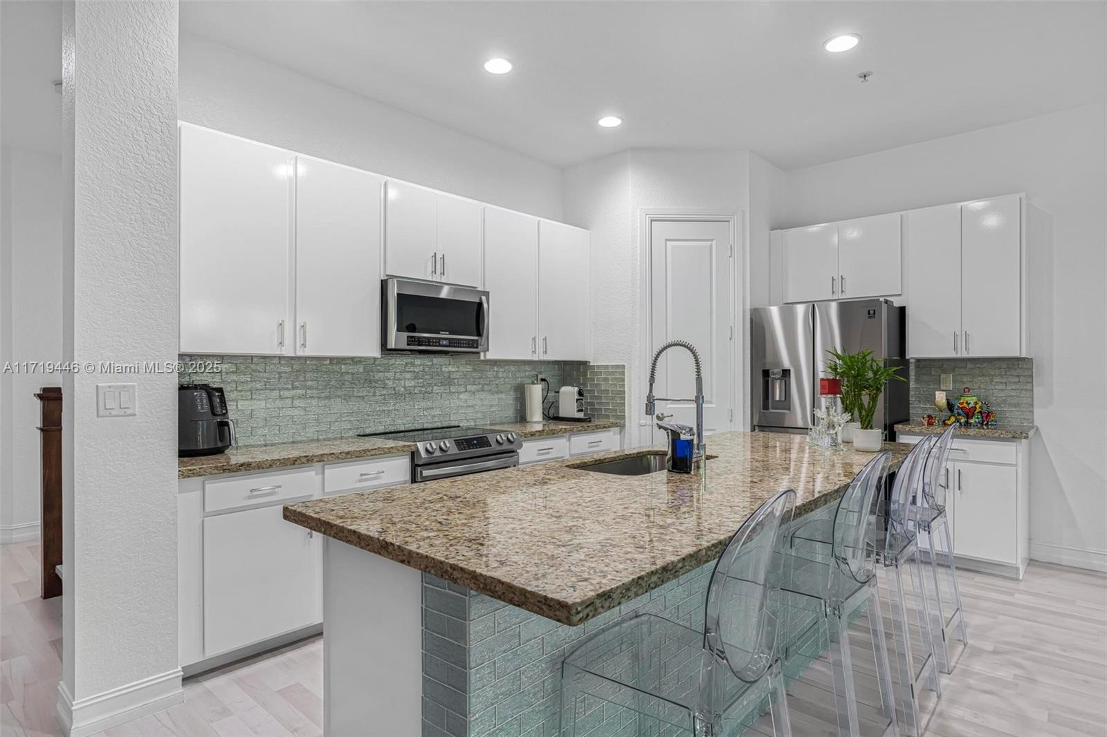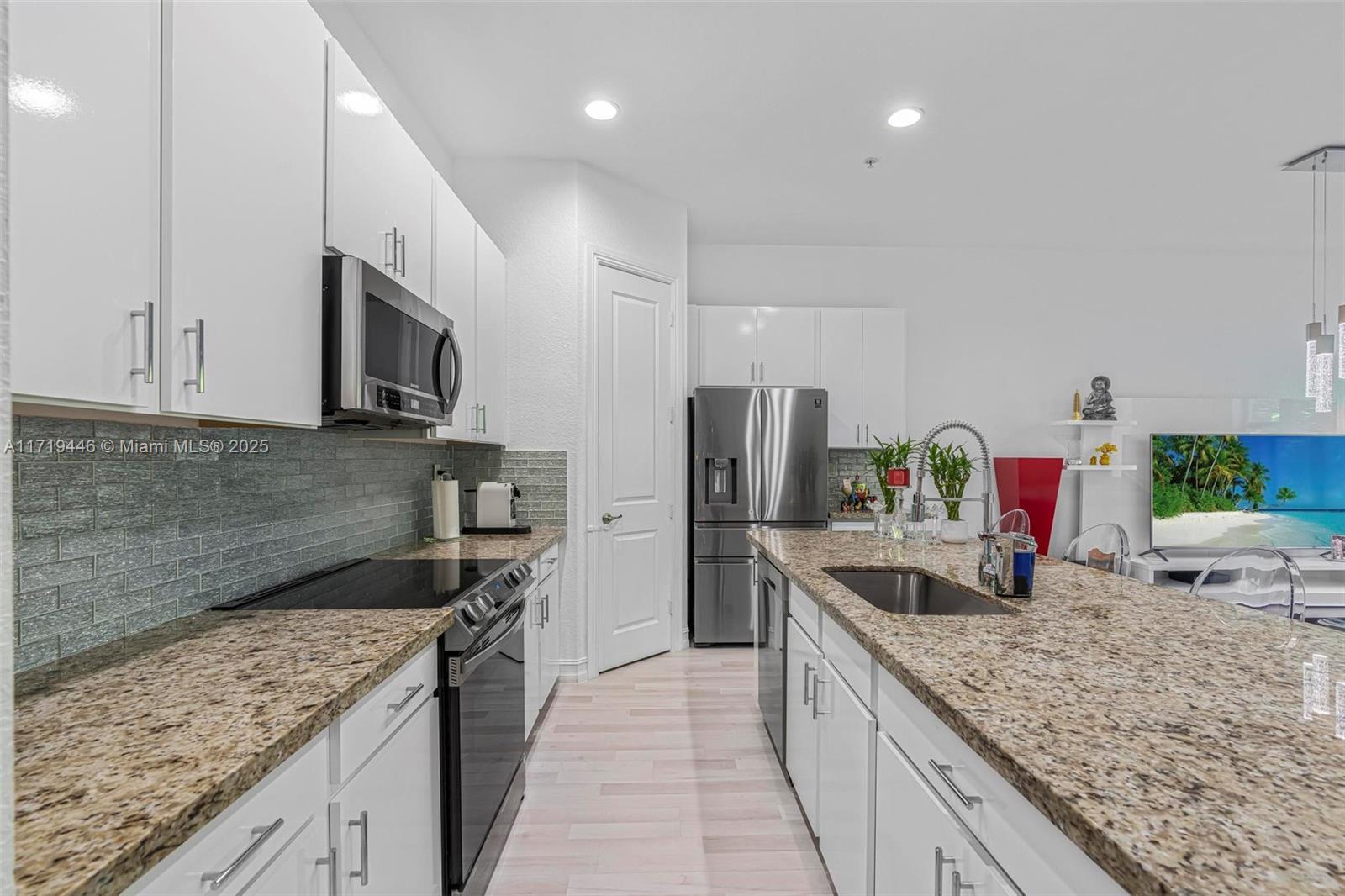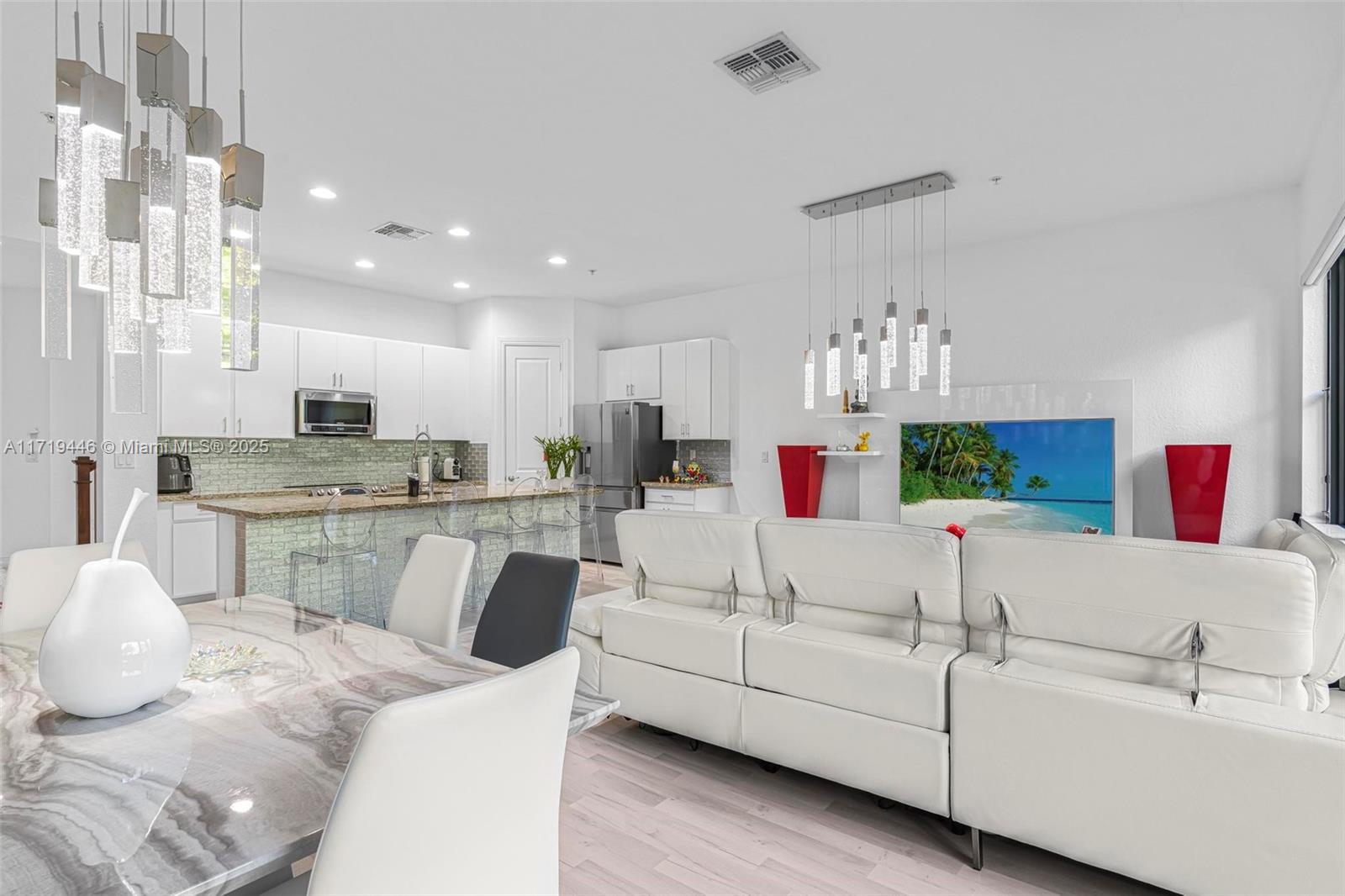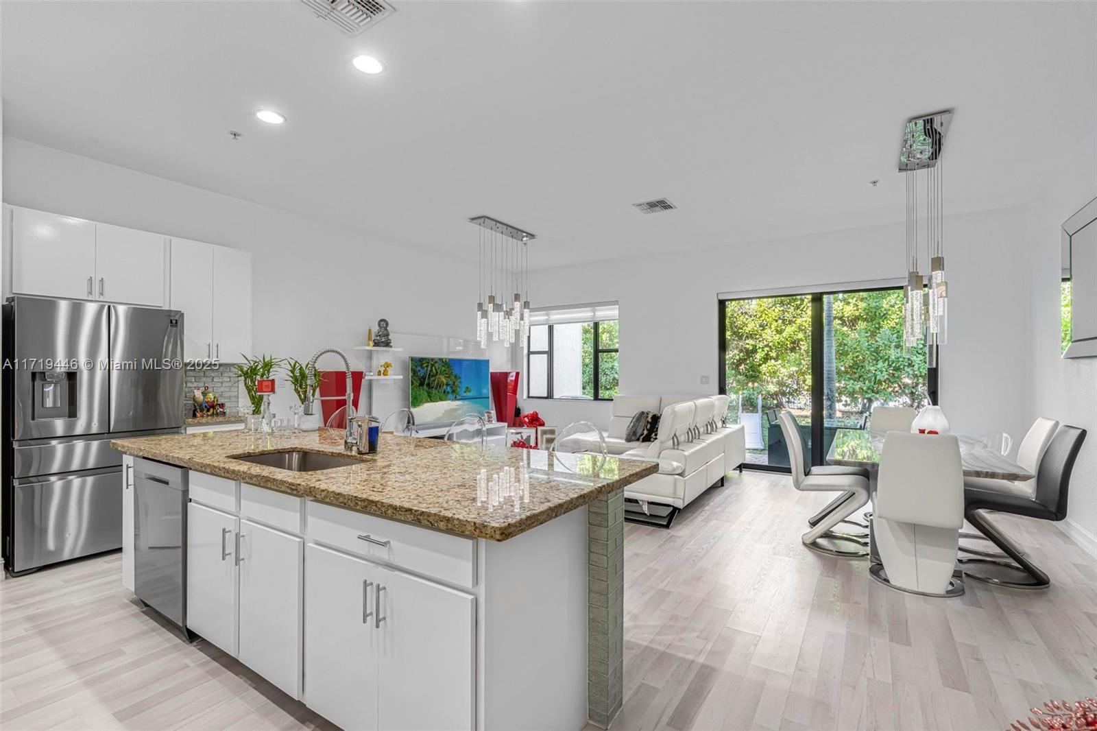 Modern 3Bed/ & 2.5/Bath townhome in the prestigious Raintree community featuring a spacious, open floor plan & renovated kitchen, granite countertops, a massive island with breakfast bar & large walk-in pantry. Equipped with NEW stainless steel appliances, including a washer/dryer. Upgrades include premium laminate wood flooring throughout, designer light fixtures, an exterior camera security system, electronic door locks & automatic shades in the living room & primary suite. The primary suite offers a private balcony, walk-in closets, & a spa-like bathroom with a soaking tub, separate shower & dual vanities. Highlights include spacious guest rooms, impact windows & doors, patio showcasing a grass wall & TV w/ serene garden views. Minutes to Pembroke Shops, Pines Mall, I-75 & MORE!