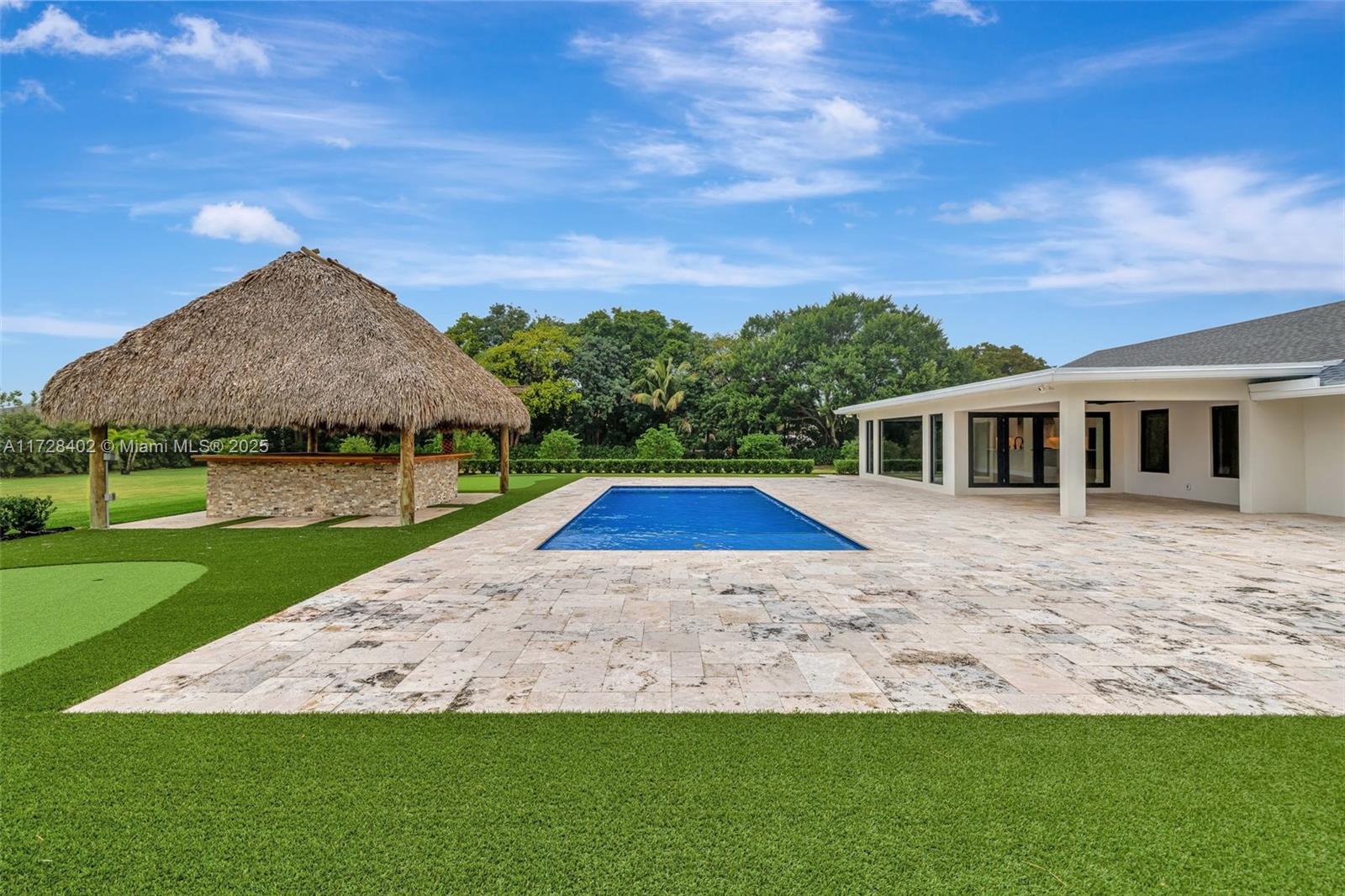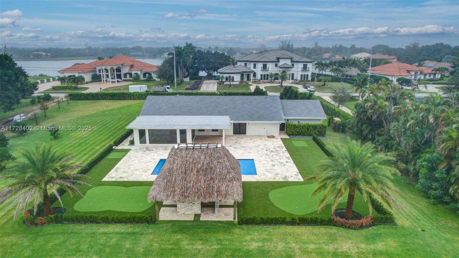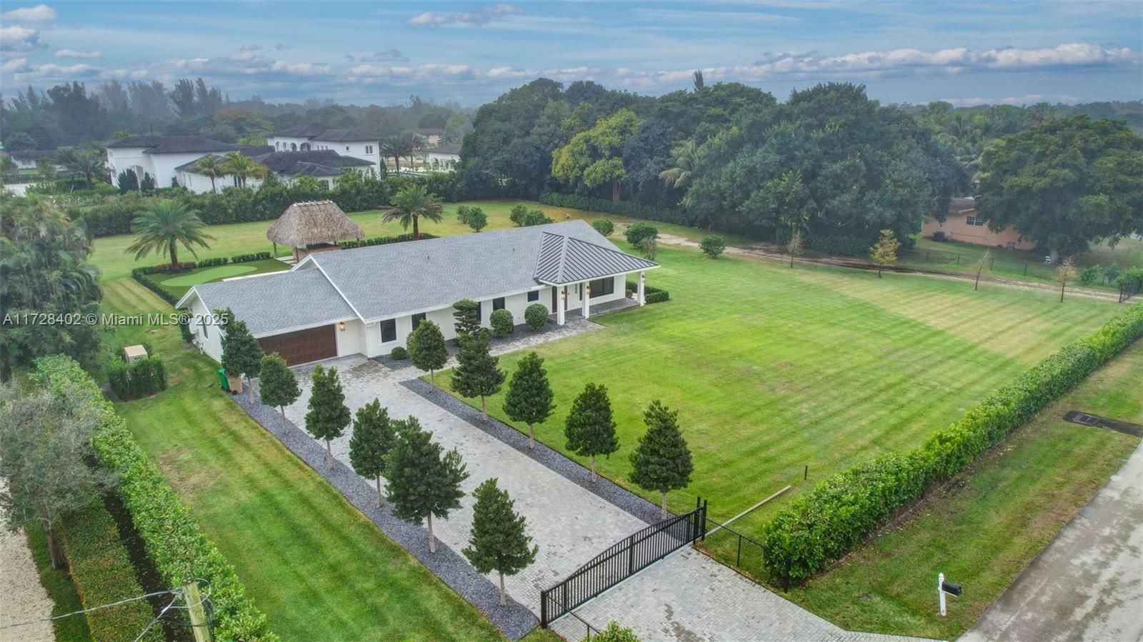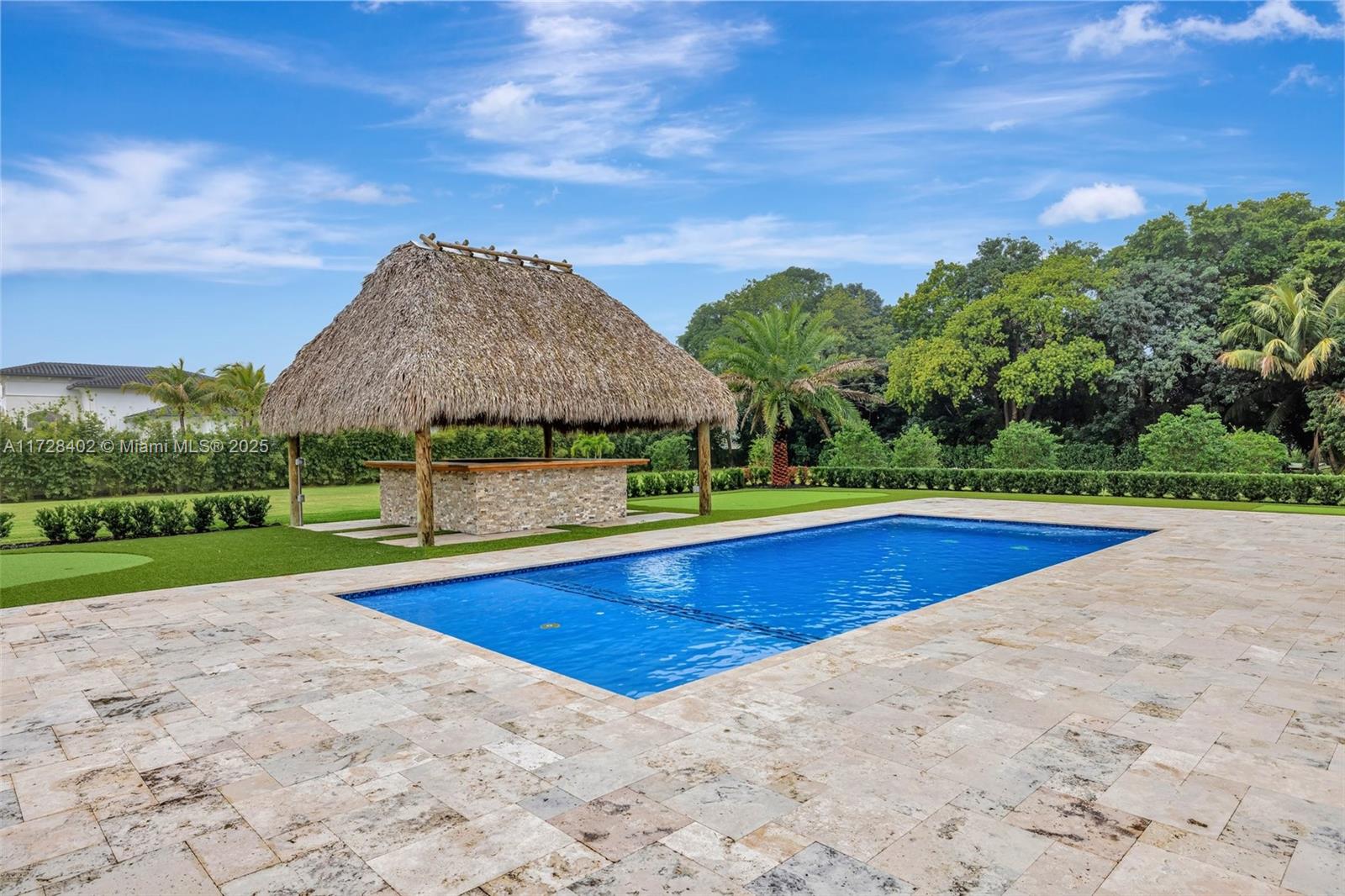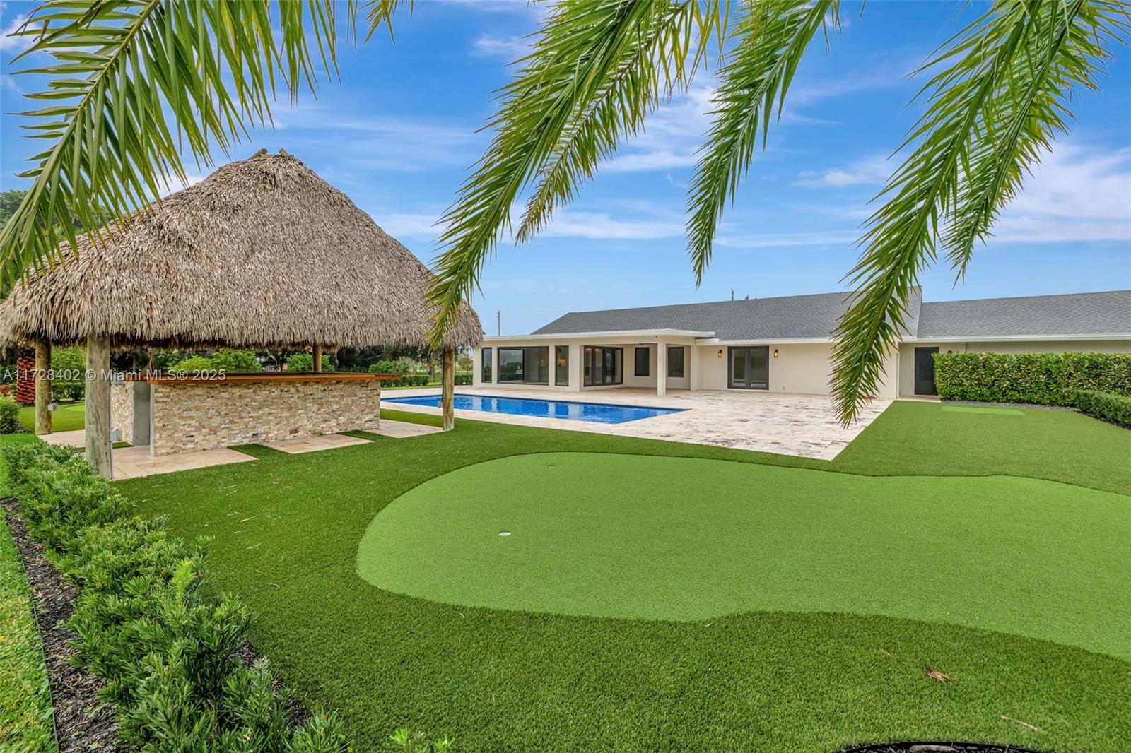 Nestled on nearly two acres, this 3,004 sq. ft. 4-bedroom, 3-bathroom home was remodeled in 2022 and features natural wood plank porcelain tile, quartz countertops, custom white oak cabinetry, Thermador appliances, a 36-inch gas rangetop, double ovens, a built-in microwave, and a bottom-freezer refrigerator. The backyard includes a Van Kirk 15 x 36 ft pool, 3,500 sq. ft pool deck, 3,000 sq. ft of turf, dual putting greens, and a 360 sq. ft Tiki hut with a bar, lighting, and TVs. Upgrades include a new HVAC system, metal and shingle roof, hurricane-impact windows, tankless water heater, 500-gallon propane tank, 30kW Kohler generator, and two-zone irrigation.