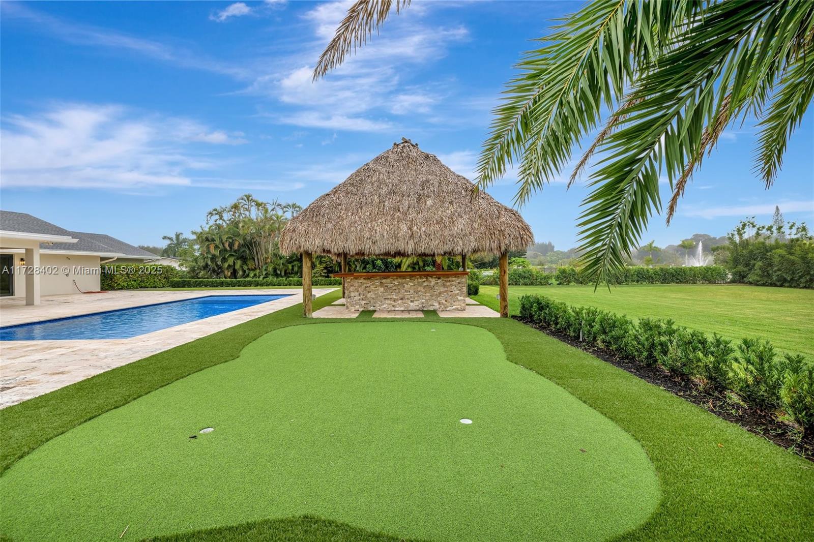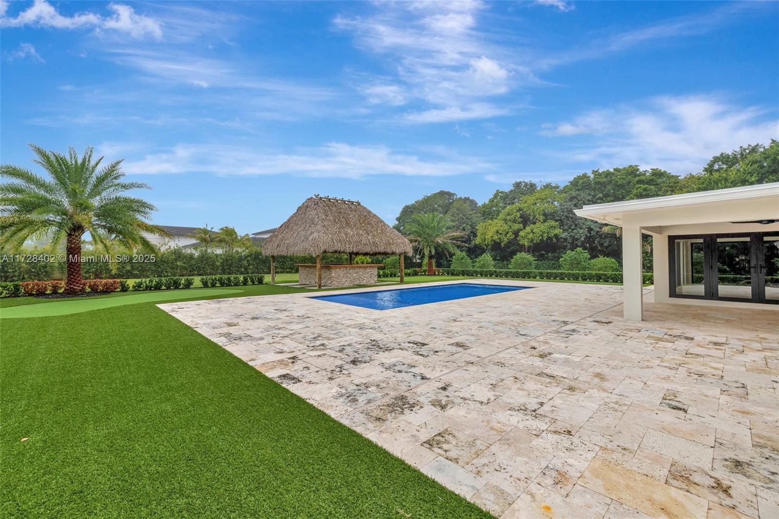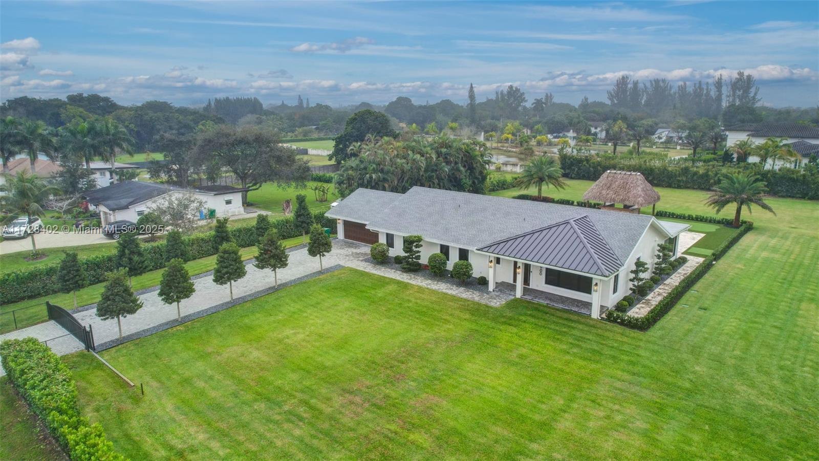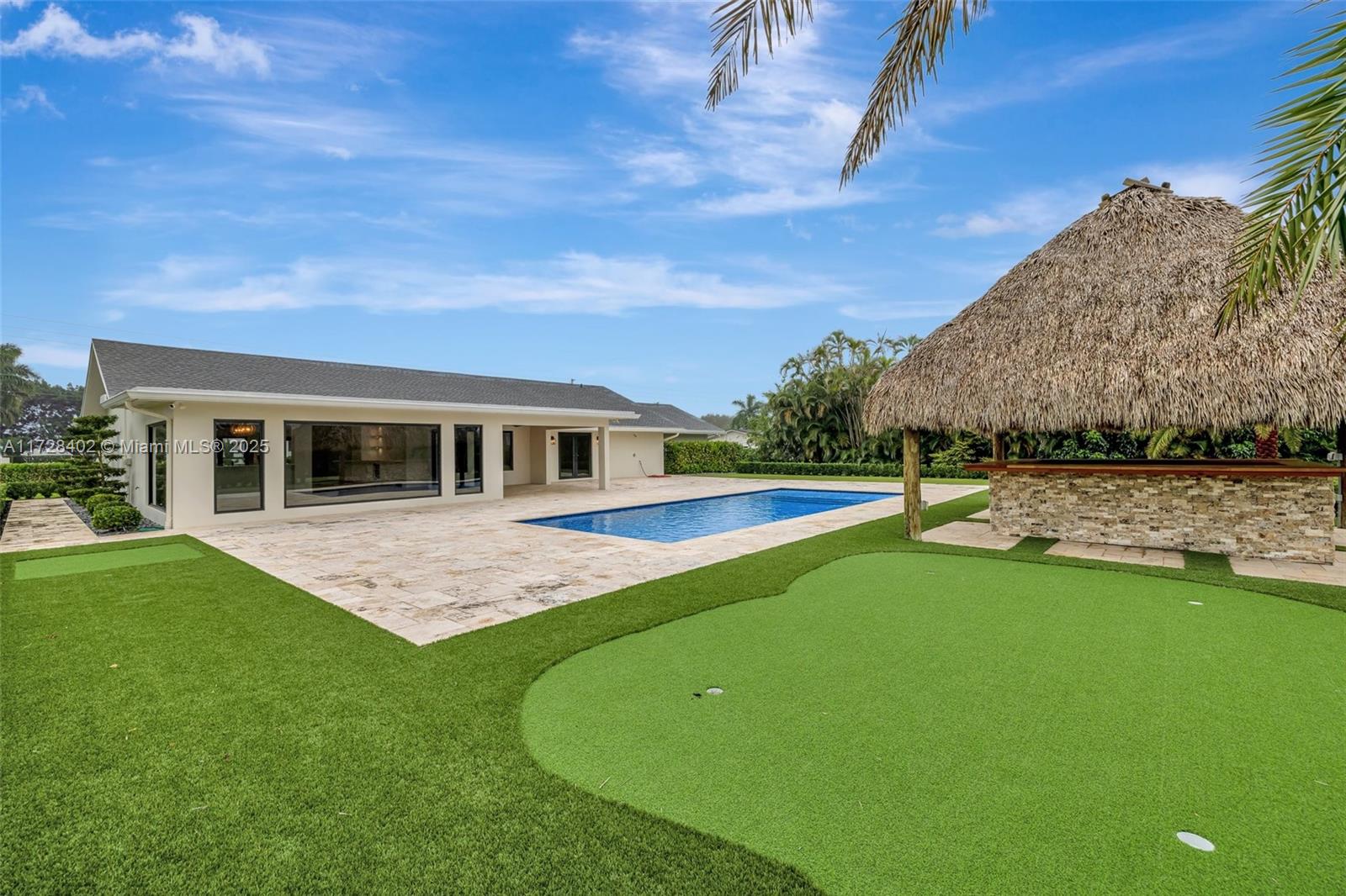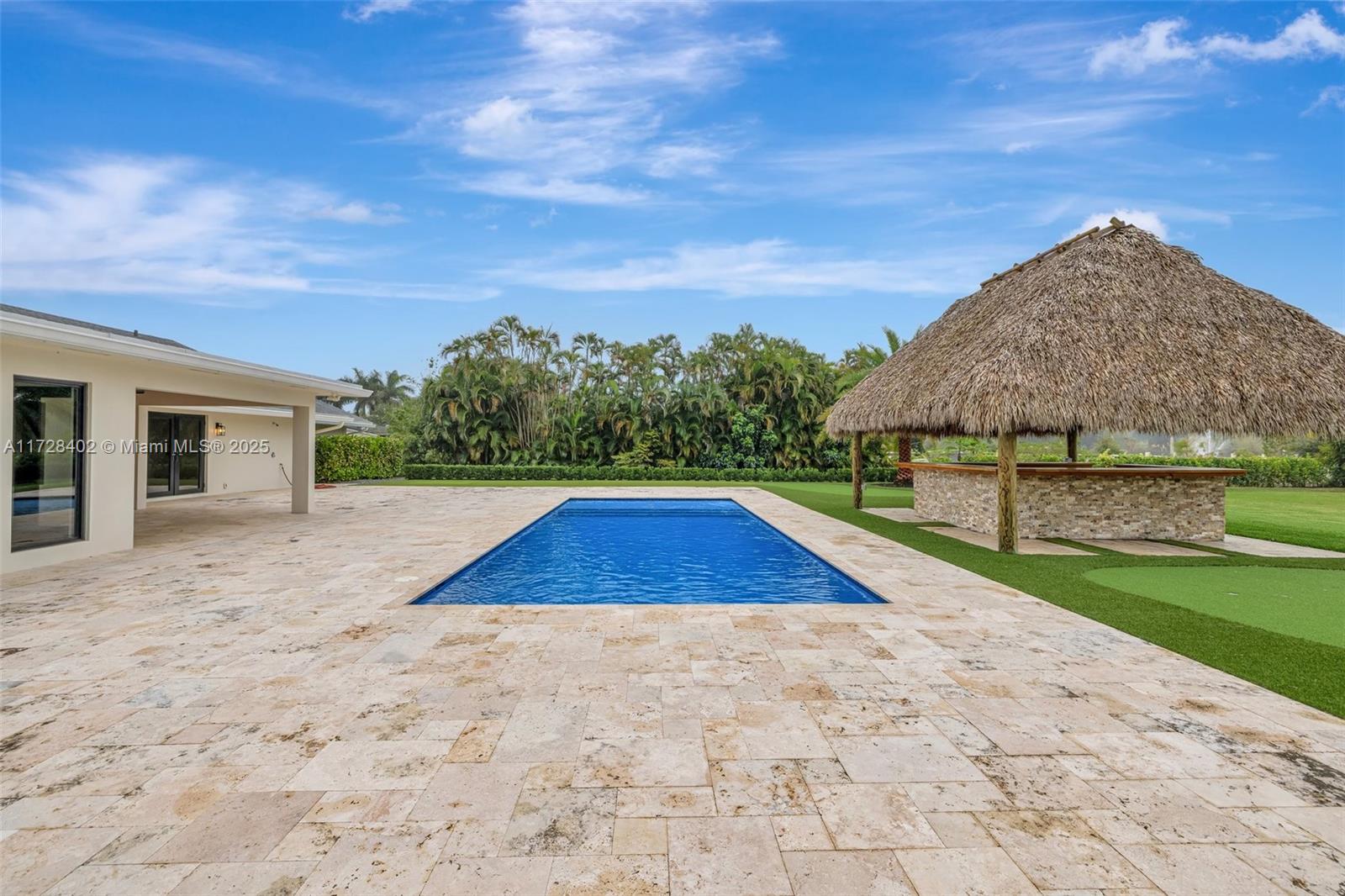 Nestled on nearly two acres, this 3,004 sq. ft. 4-bedroom, 3-bathroom home was remodeled in 2022 and features natural wood plank porcelain tile, quartz countertops, custom white oak cabinetry, Thermador appliances, a 36-inch gas rangetop, double ovens, a built-in microwave, and a bottom-freezer refrigerator. The backyard includes a Van Kirk 15 x 36 ft pool, 3,500 sq. ft pool deck, 3,000 sq. ft of turf, dual putting greens, and a 360 sq. ft Tiki hut with a bar, lighting, and TVs. Upgrades include a new HVAC system, metal and shingle roof, hurricane-impact windows, tankless water heater, 500-gallon propane tank, 30kW Kohler generator, and two-zone irrigation.