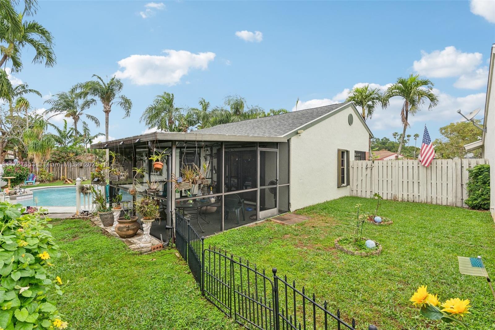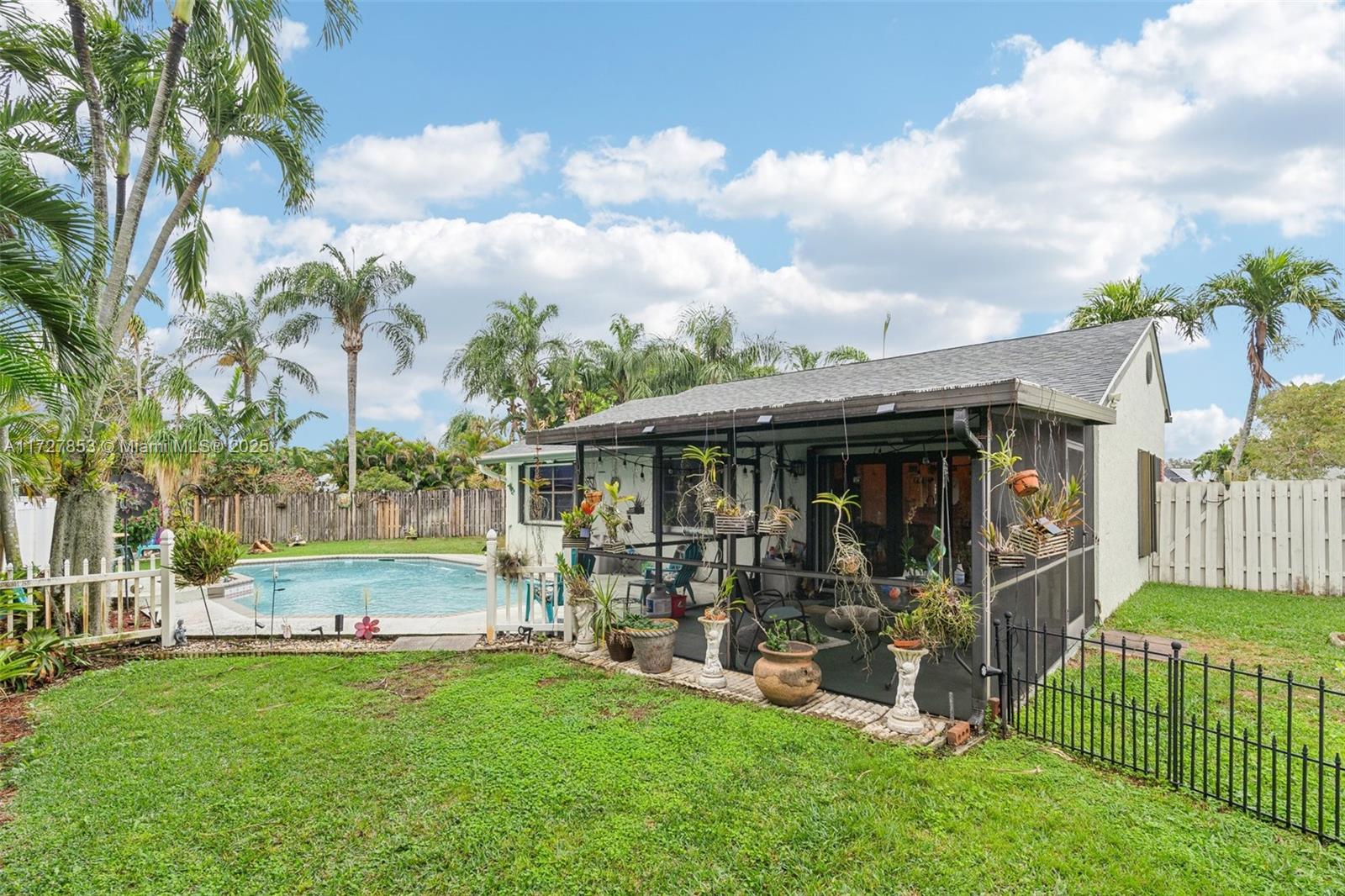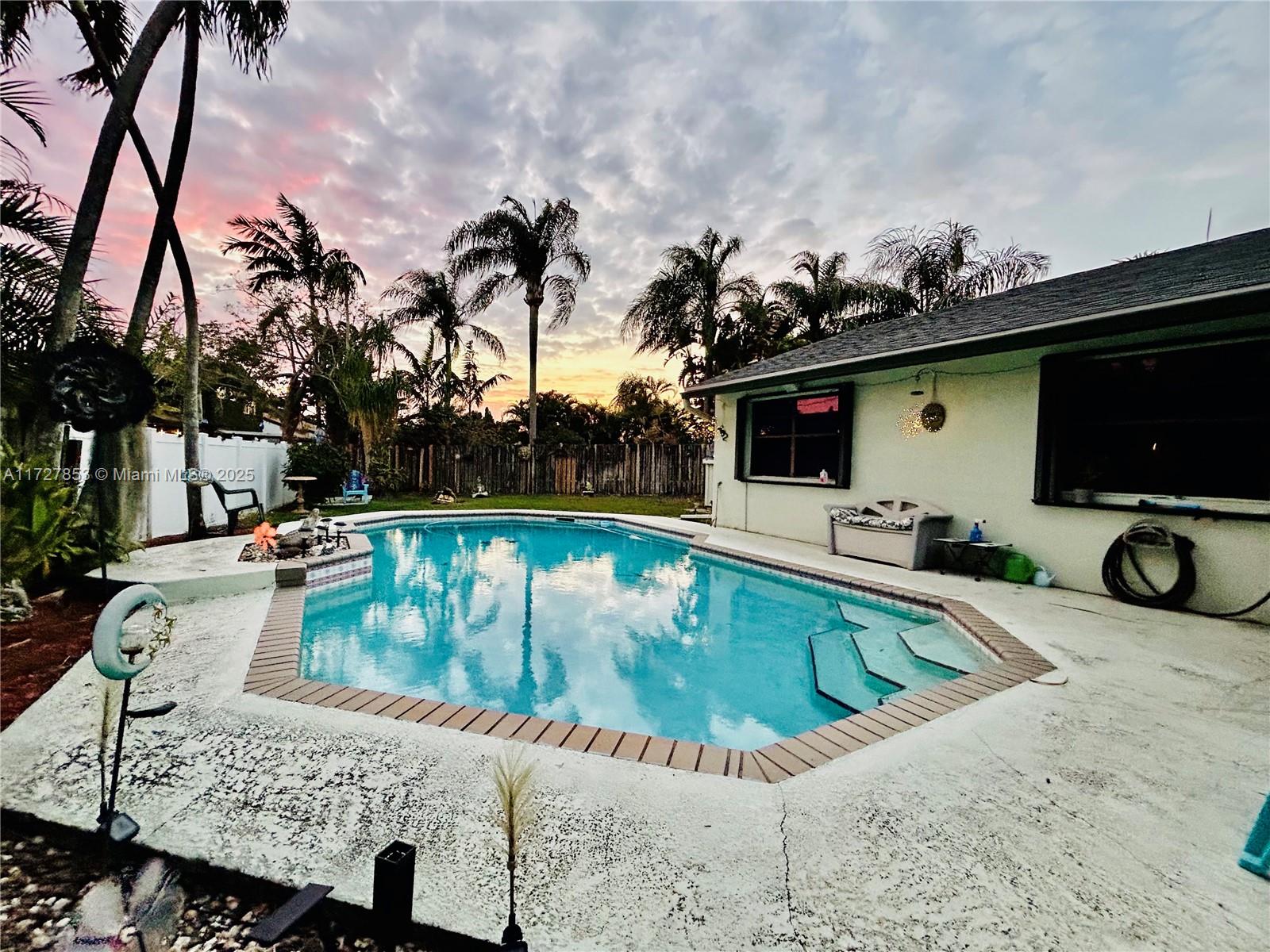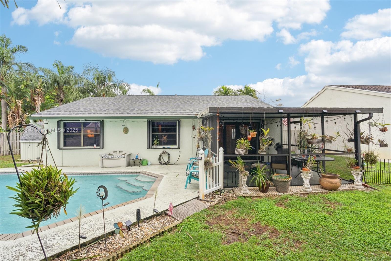This cozy full 3-bedroom, full 2-bathroom home offers a large pool - one of only two homes in the neighborhood with a Double lots. Recent updates include a NEW roof, NEW A/C (2024), NEW water heater, NEW electrical panel, NEW flooring, and full hurricane shutters, hurricane door. The modern kitchen features new cabinets, granite countertops, and appliances. Enjoy the remodeled master bath, organized 1-car garage, and spacious Florida sunroom. Plenty of parking. Solar panel readiness for the pool, additional mini-split A/C units for energy savings for garage and master bed. Conveniently located near everything. Family-FRIENDLY & PEACEFUL neighborhood with GREAT SCHOOL! Low HOA, and no screening required. Won't last?Easy to show!