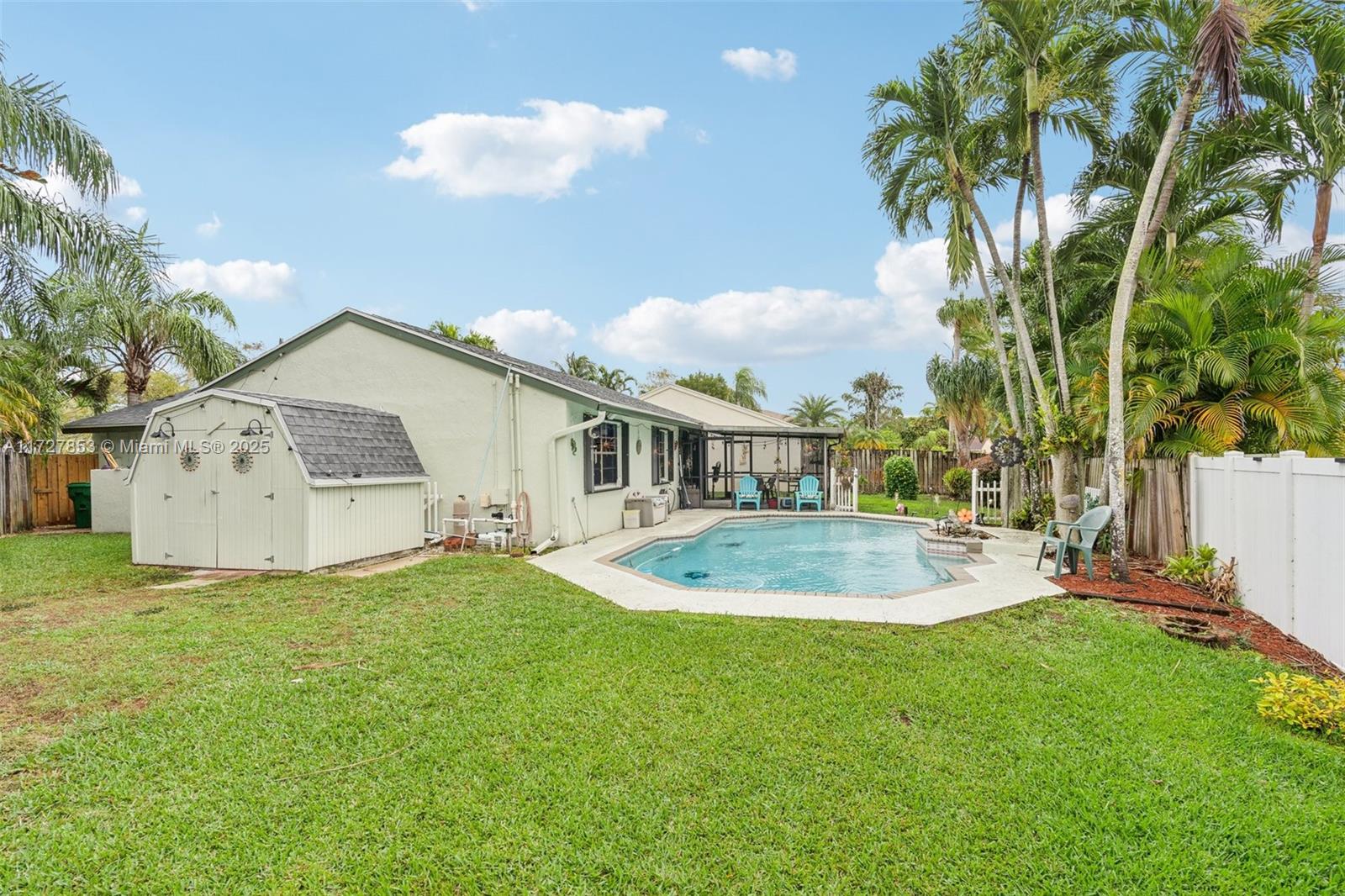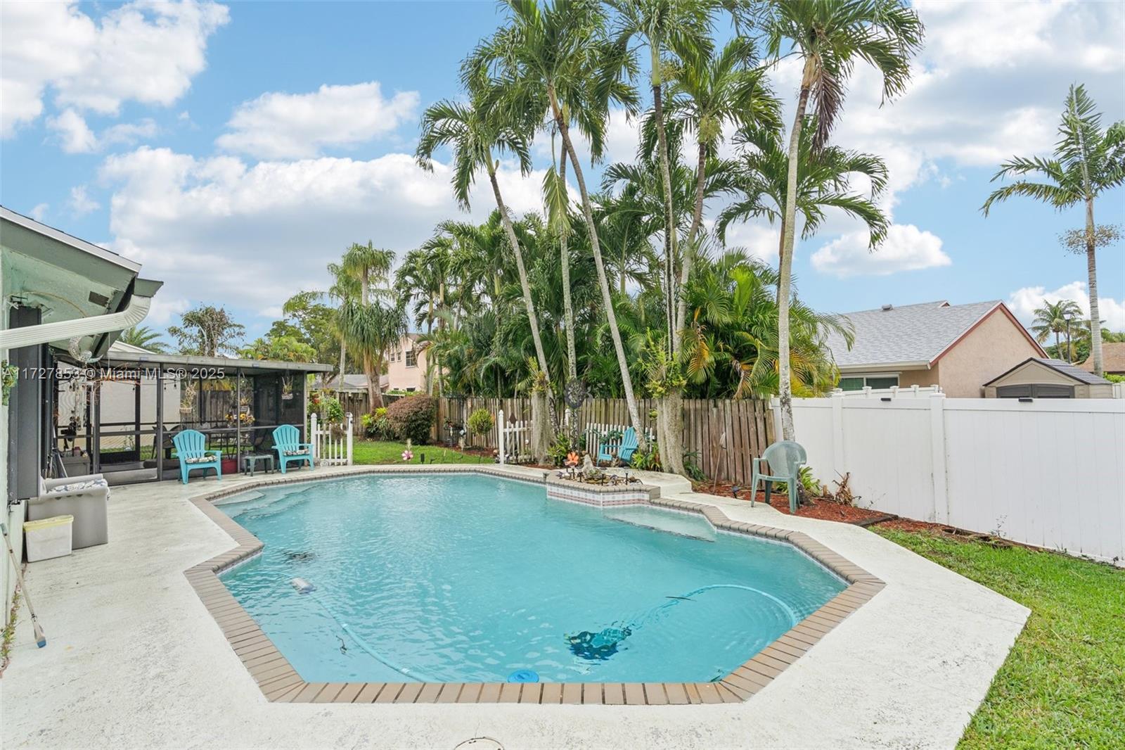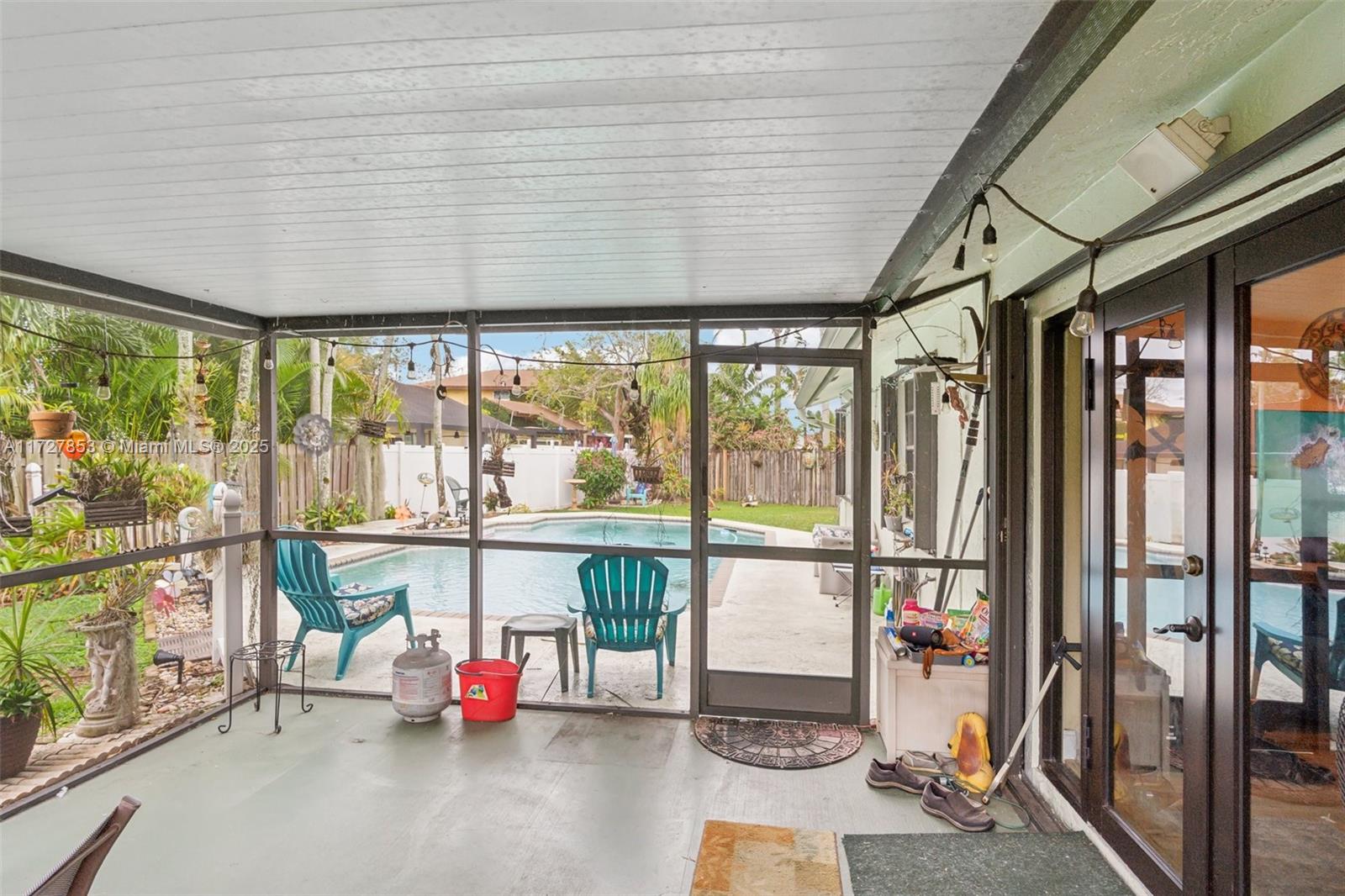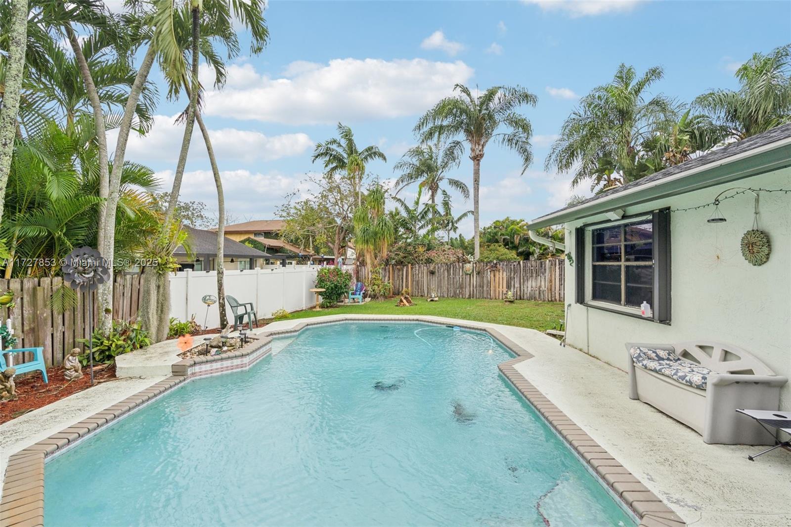 This cozy full 3-bedroom, full 2-bathroom home offers a large pool - one of only two homes in the neighborhood with a Double lots. Recent updates include a NEW roof, NEW A/C (2024), NEW water heater, NEW electrical panel, NEW flooring, and full hurricane shutters, hurricane door. The modern kitchen features new cabinets, granite countertops, and appliances. Enjoy the remodeled master bath, organized 1-car garage, and spacious Florida sunroom. Plenty of parking. Solar panel readiness for the pool, additional mini-split A/C units for energy savings for garage and master bed. Conveniently located near everything. Family-FRIENDLY & PEACEFUL neighborhood with GREAT SCHOOL! Low HOA, and no screening required. Won't last?Easy to show!