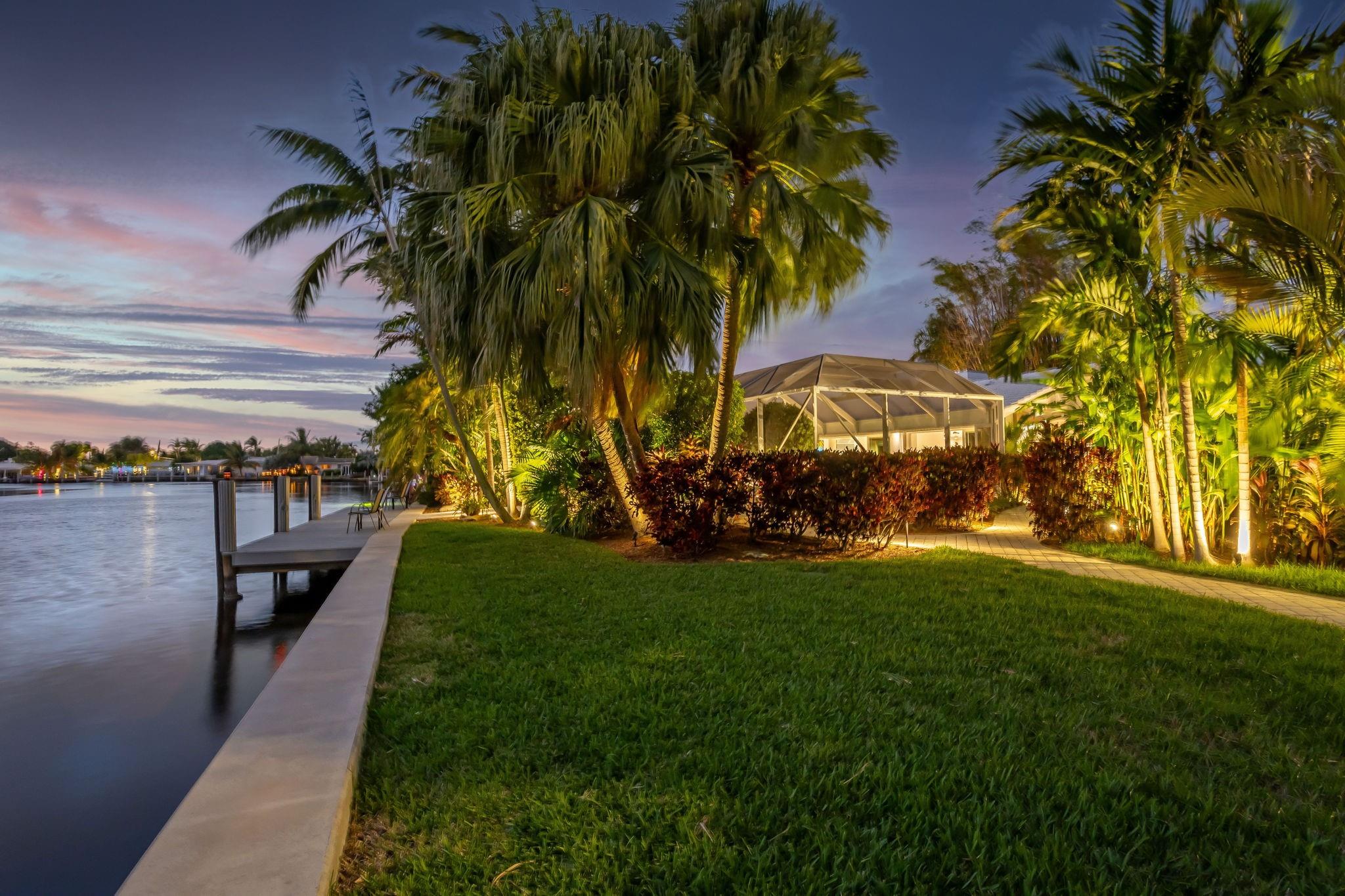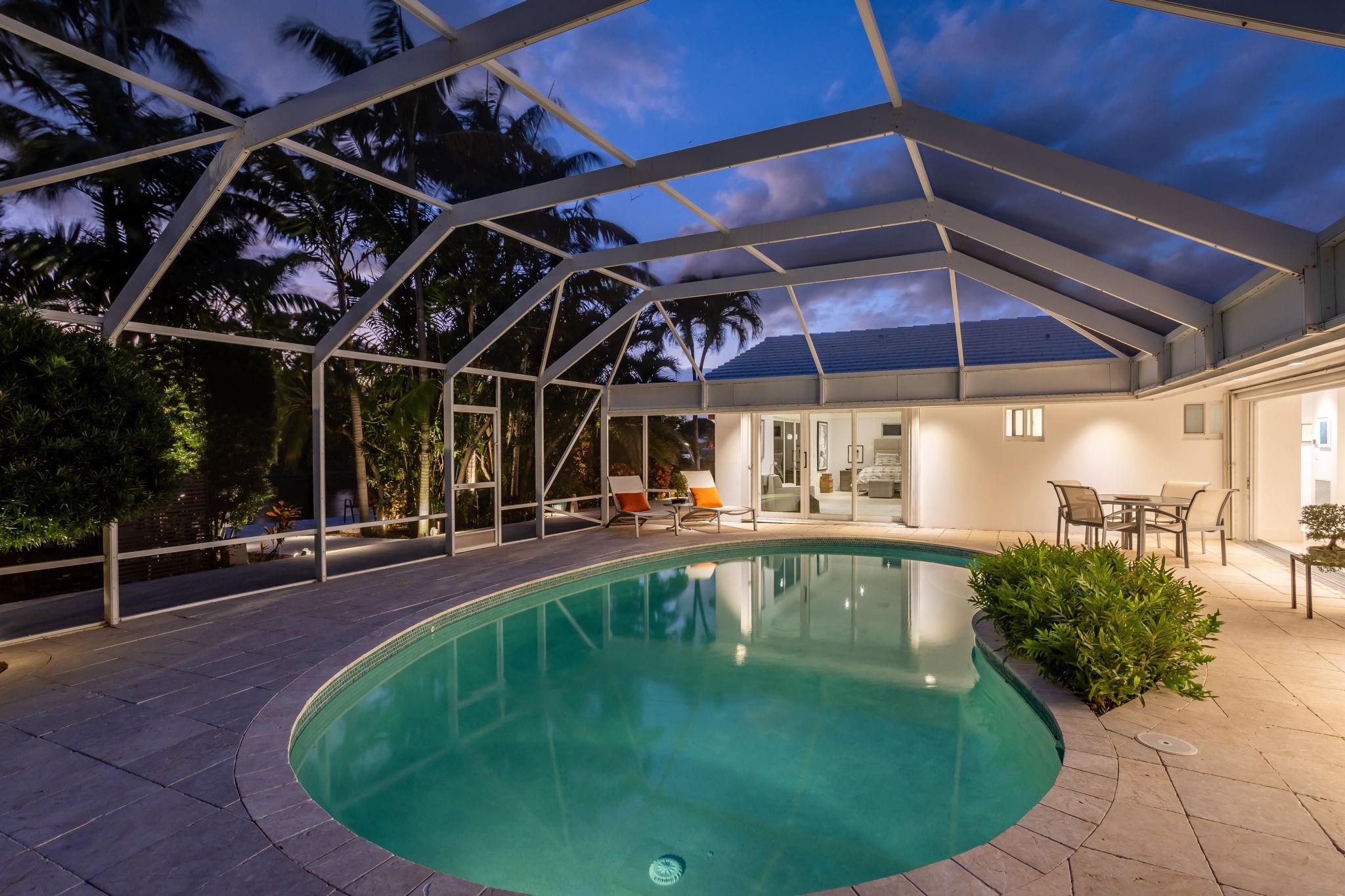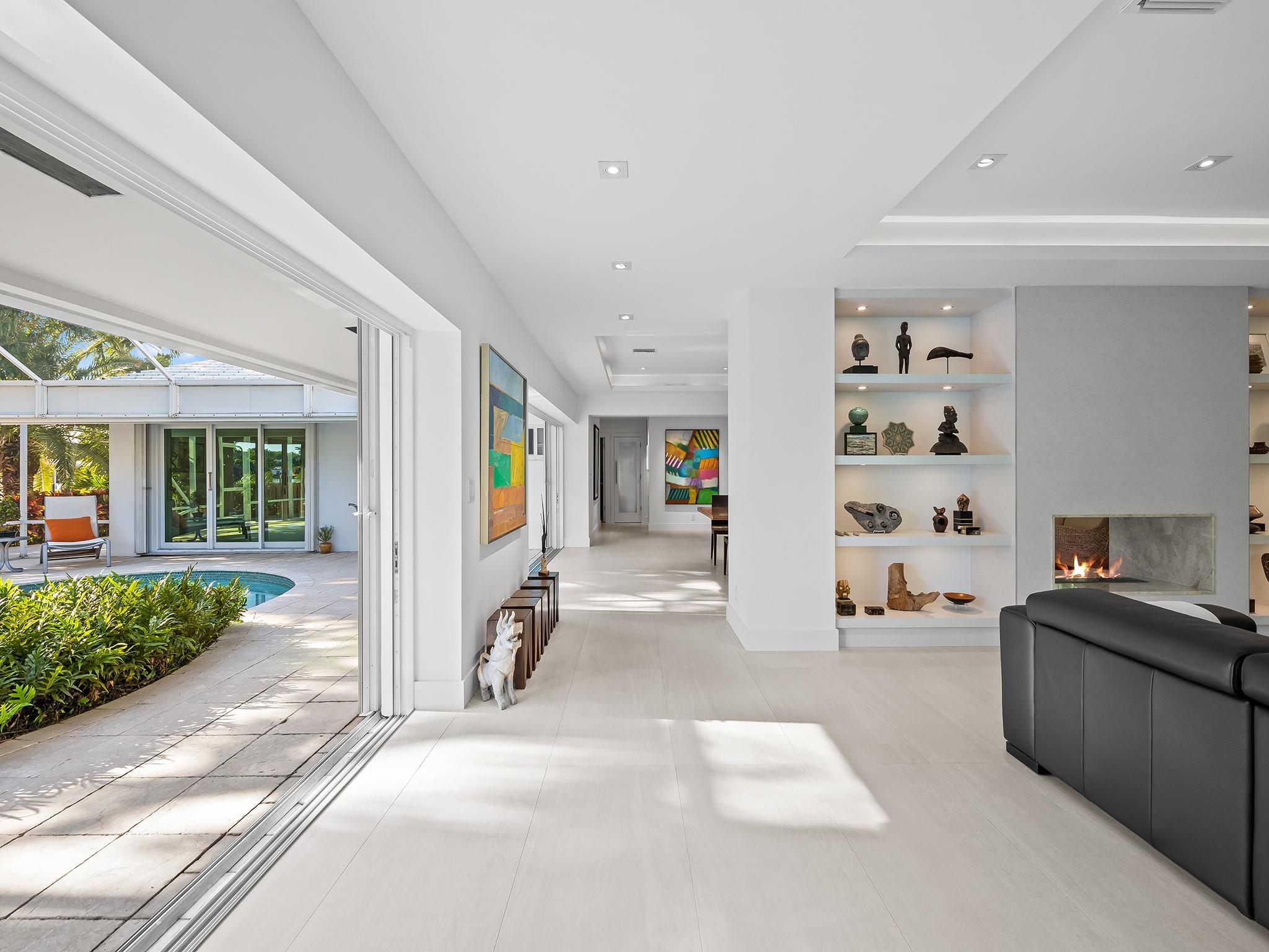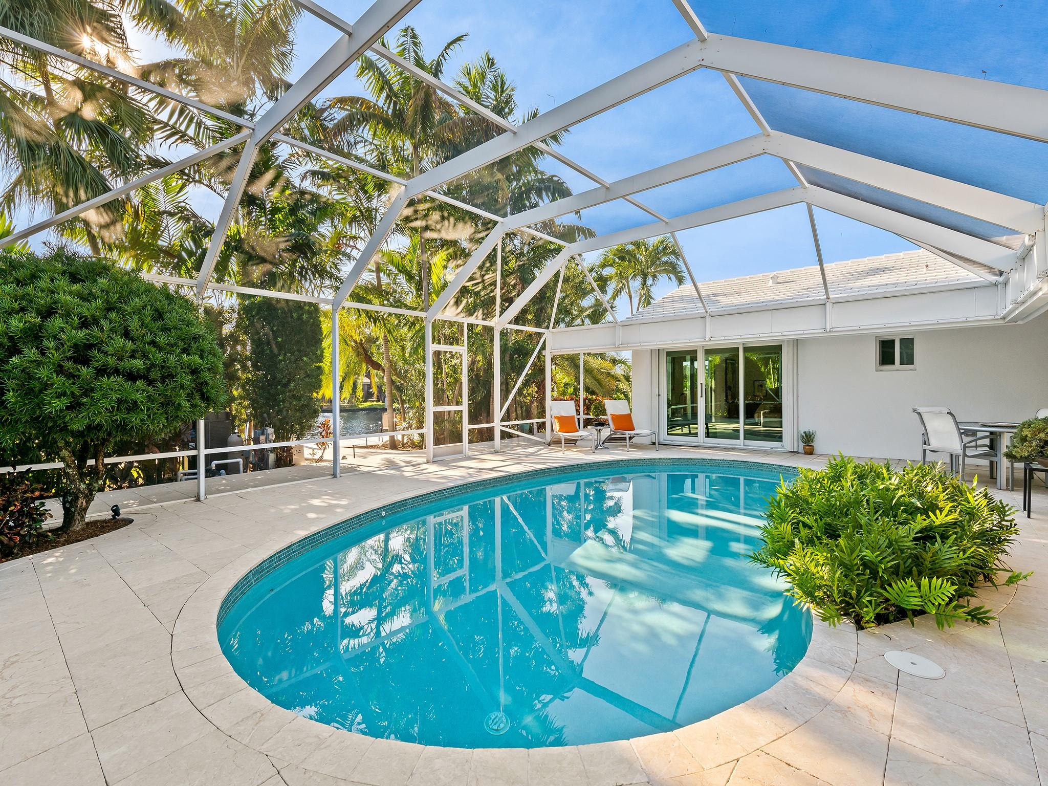 Meticulous waterfront oasis on over a 1/4+ acre oversize lot. Designer home, 3 bedrooms, 3 baths, remodeled down to studs with amazing details and craftsmanship. Minutes to the beach this like new home offers 177 ft. of waterfront with wide canal views & intercoastal access. Highlights include large living room & dining/family room with 9 ft. tray ceilings and a double-sided fireplace. Italian kitchen with quartz countertops, 36” five burner gas range, built in refrigerator/freezer & two dishwashers. Renovation also included new roof, two stage A/C, insulation, new electrical, plumbing (above and below ground), Italian porcelain floors, impact doors & windows. Designed for comfort and entertaining, it includes pocket sliding doors that open to the screened pool area 32' x 43'.