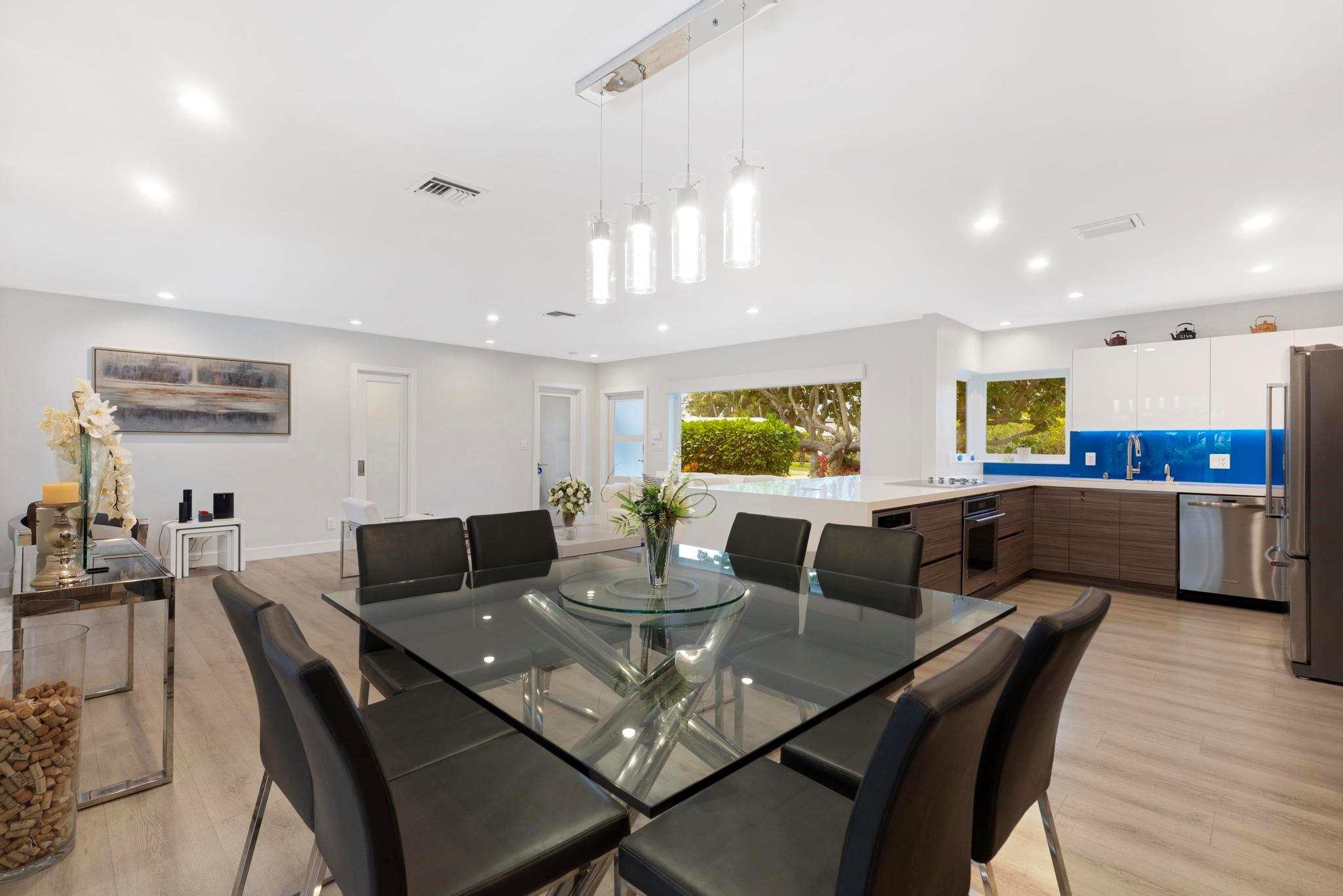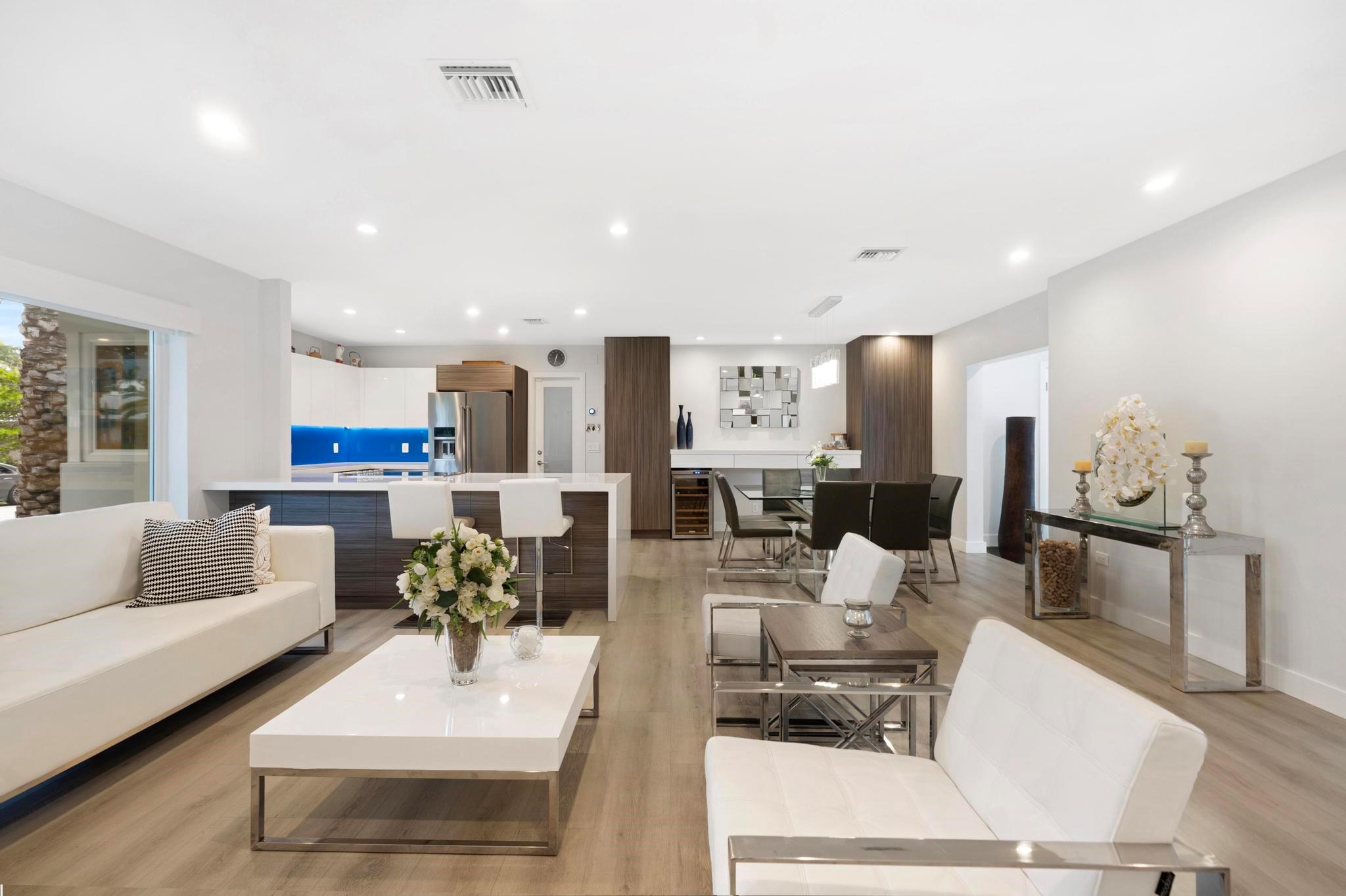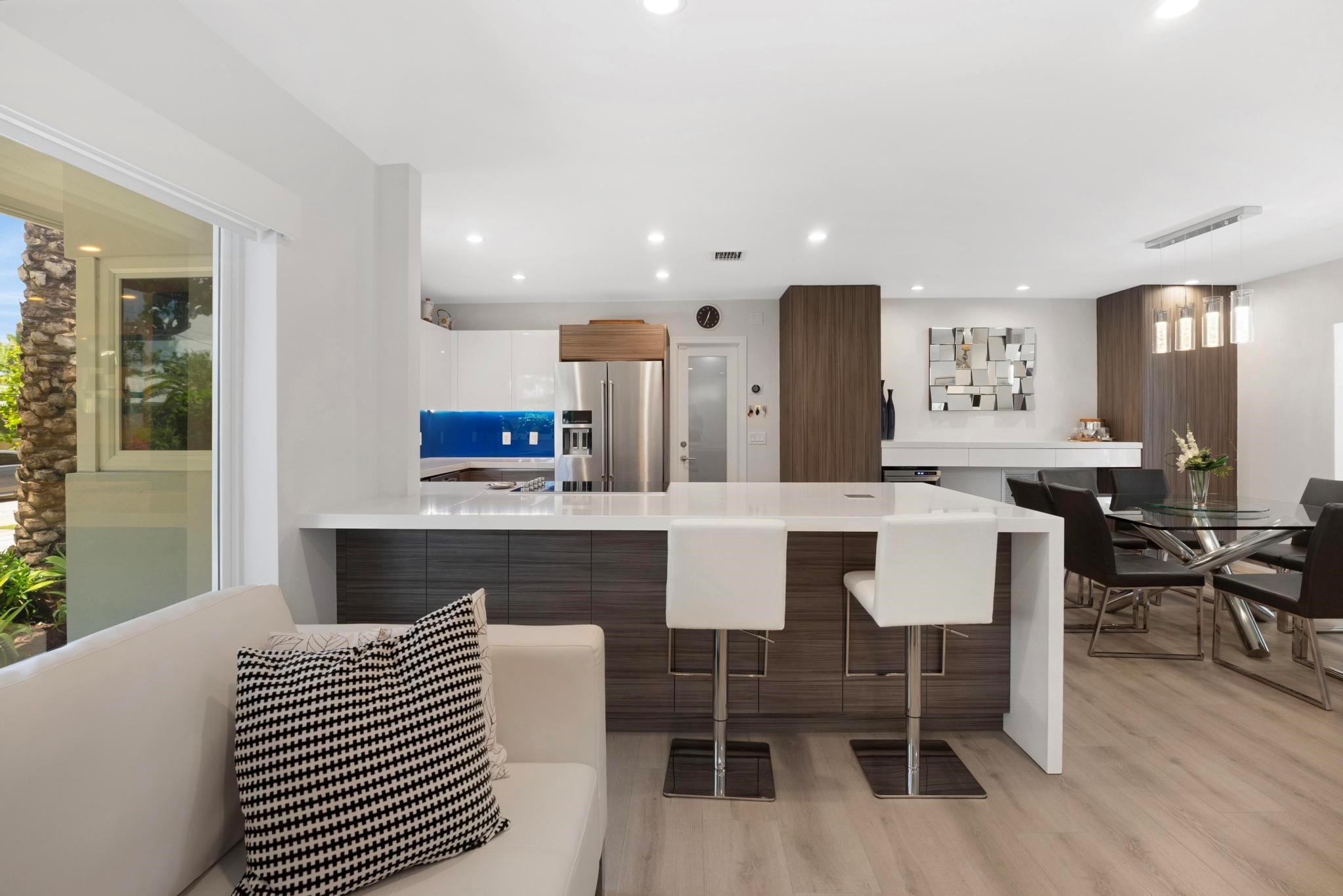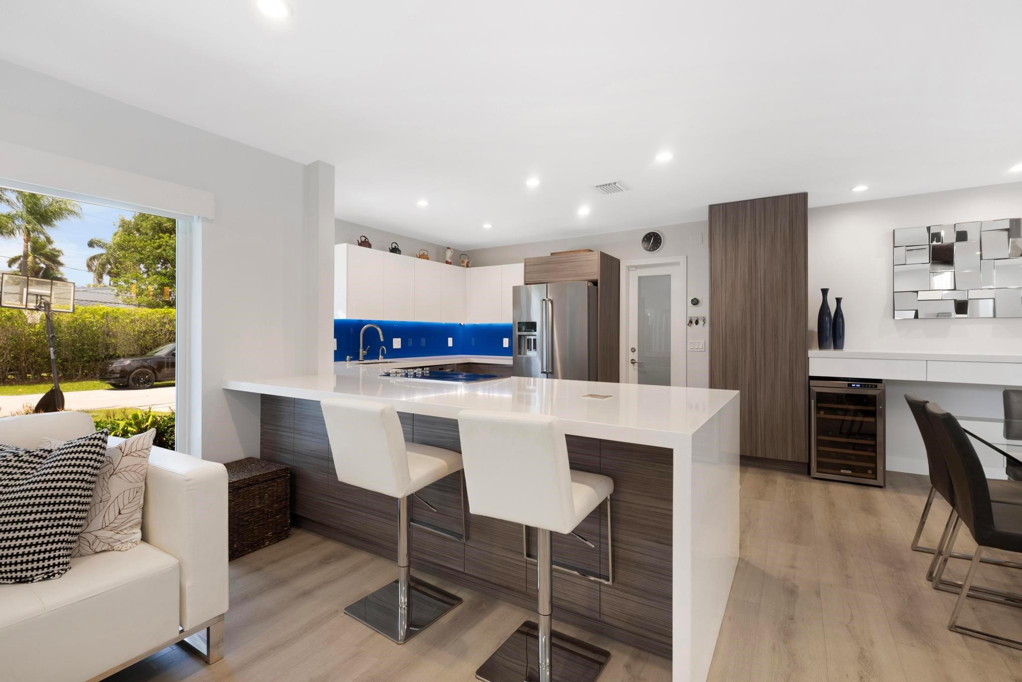 Nestled within the desirable neighborhood of Dolphin Isles, positioned between the serene Atlantic Ocean and the bustling Intracoastal waterway, lies this meticulously refurbished residence. Seamlessly integrating classic Floridian architecture with contemporary flair, this home features a sleek minimalist kitchen boasting concealed appliances, quartz countertops, and a convenient breakfast bar. Polished Terrazzo flooring spans the interior, complementing both formal and casual entertainment spaces. Outside, an inviting azure lap pool and spa beckon in the secluded backyard, mere moments away from the beach.