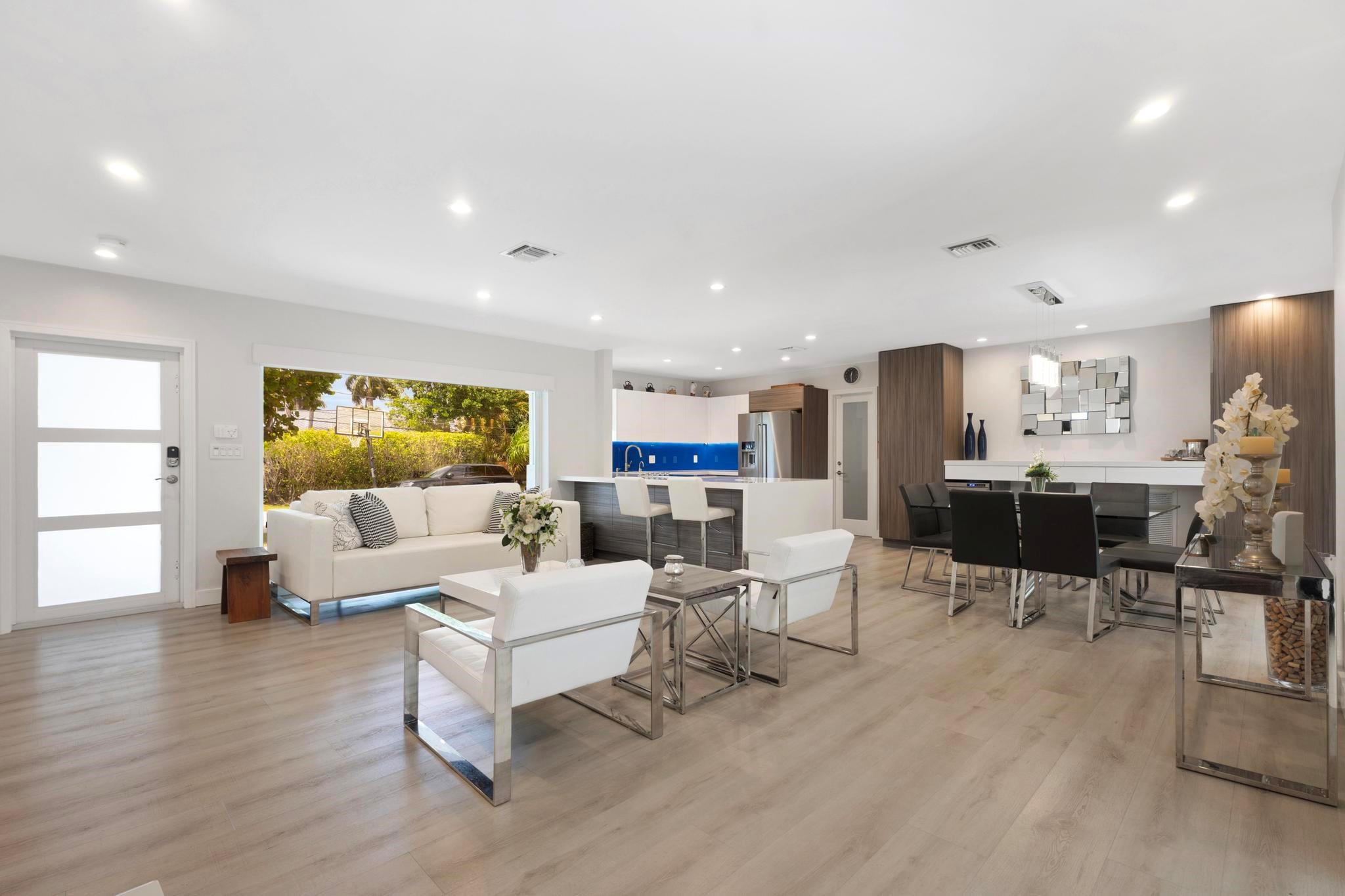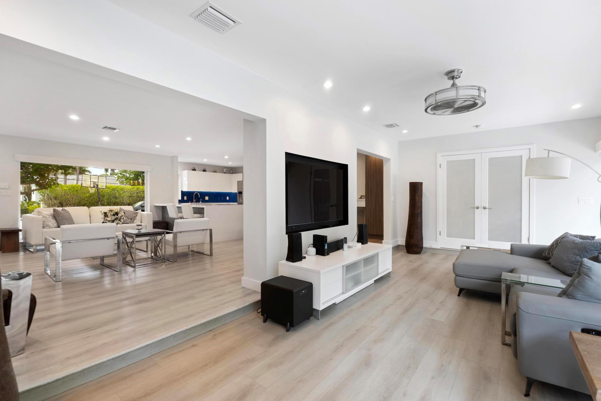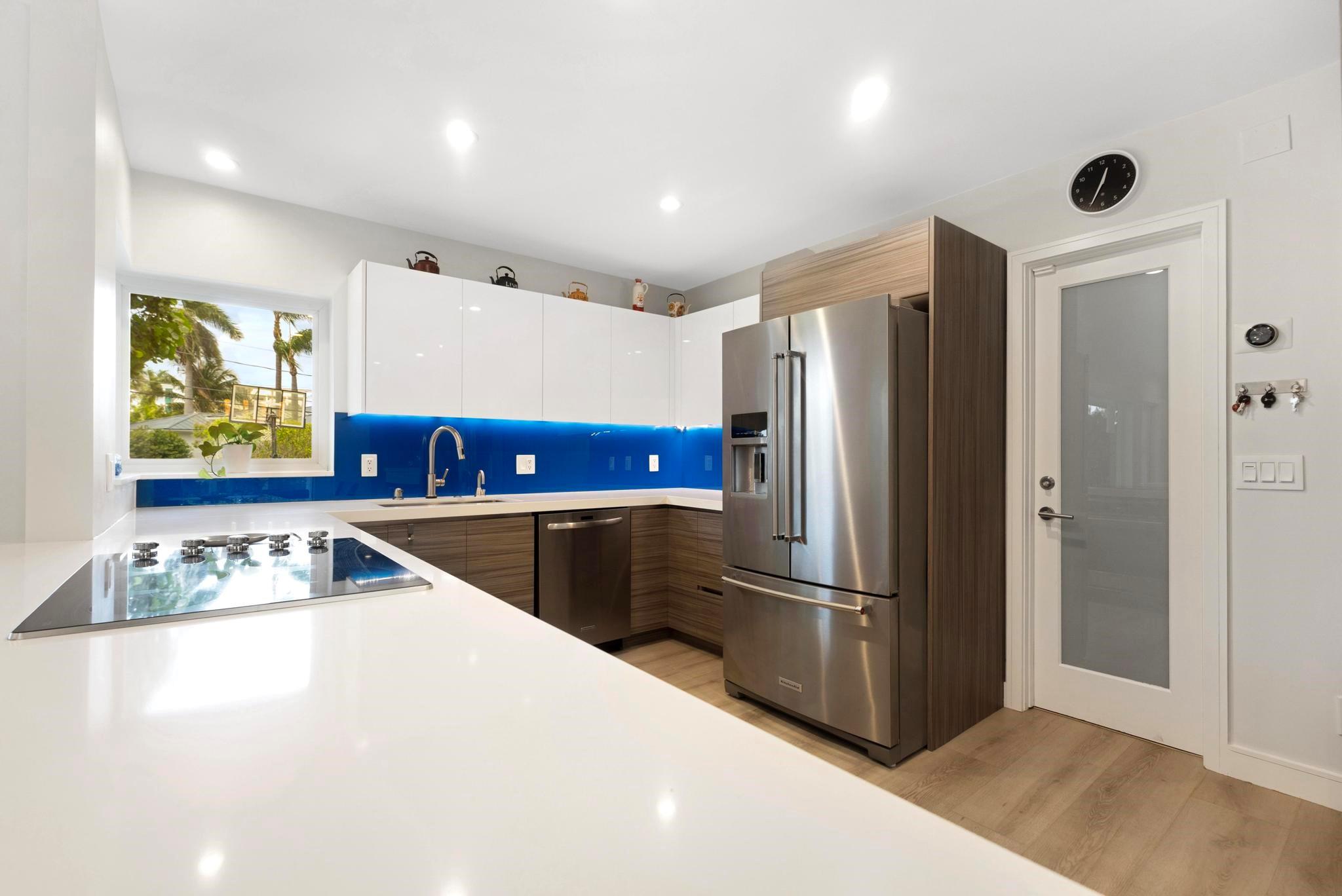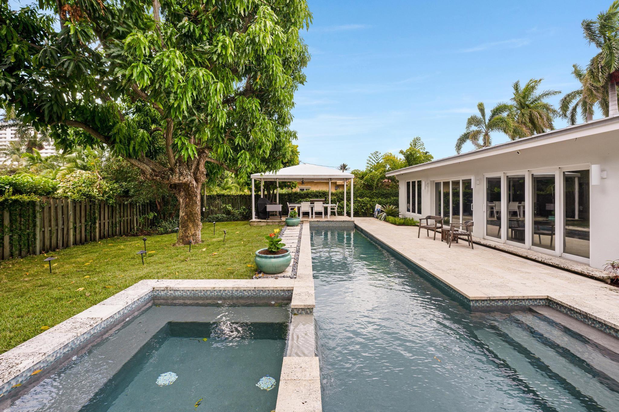Nestled within the desirable neighborhood of Dolphin Isles, positioned between the serene Atlantic Ocean and the bustling Intracoastal waterway, lies this meticulously refurbished residence. Seamlessly integrating classic Floridian architecture with contemporary flair, this home features a sleek minimalist kitchen boasting concealed appliances, quartz countertops, and a convenient breakfast bar. Polished Terrazzo flooring spans the interior, complementing both formal and casual entertainment spaces. Outside, an inviting azure lap pool and spa beckon in the secluded backyard, mere moments away from the beach.