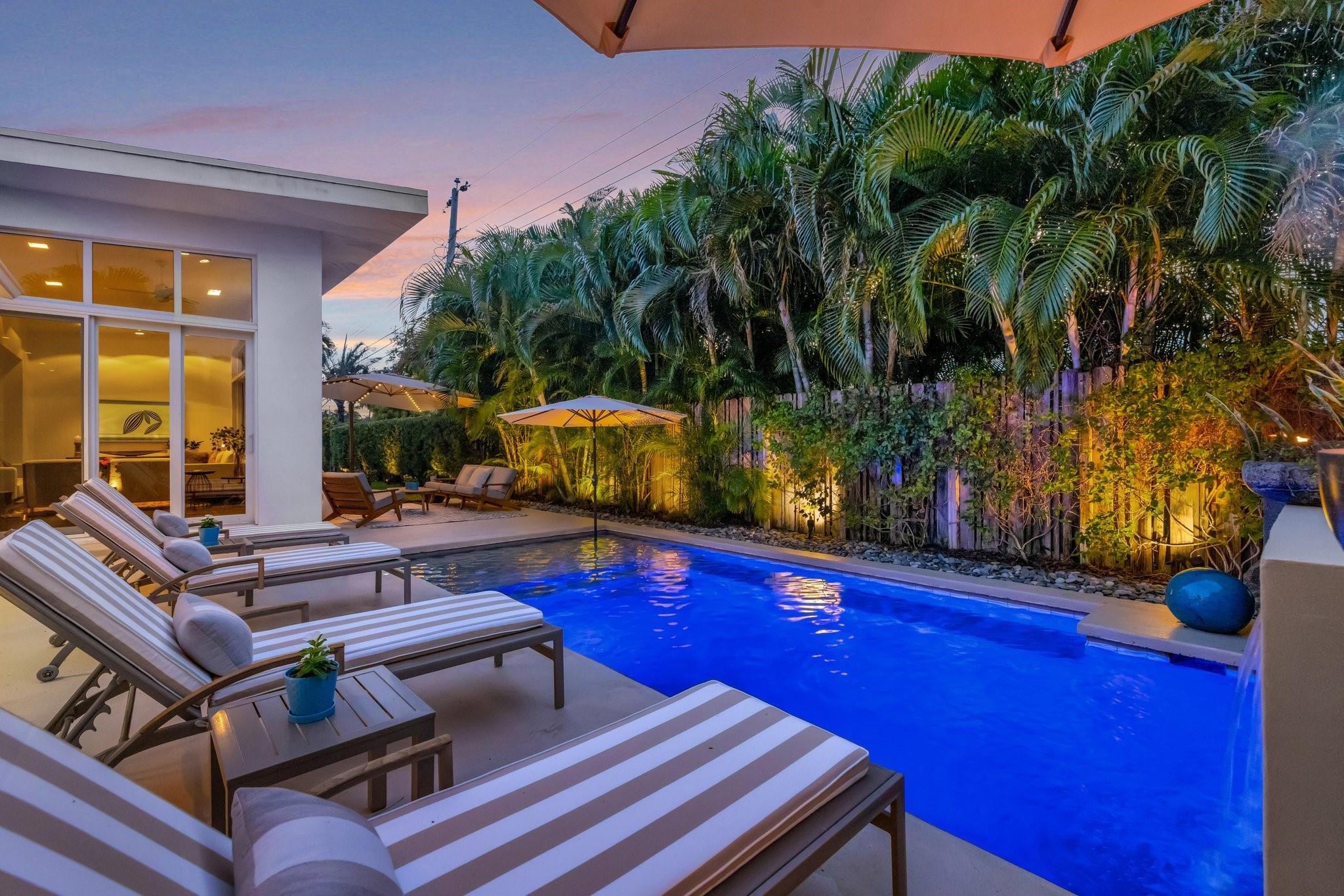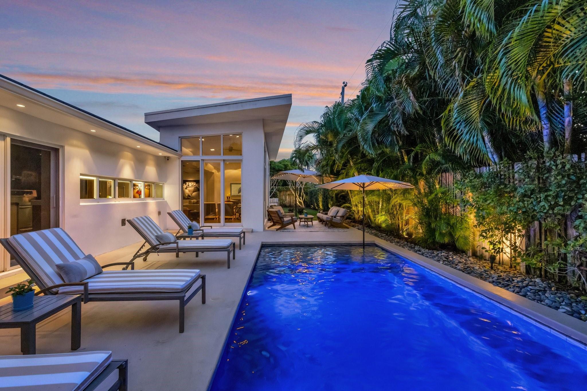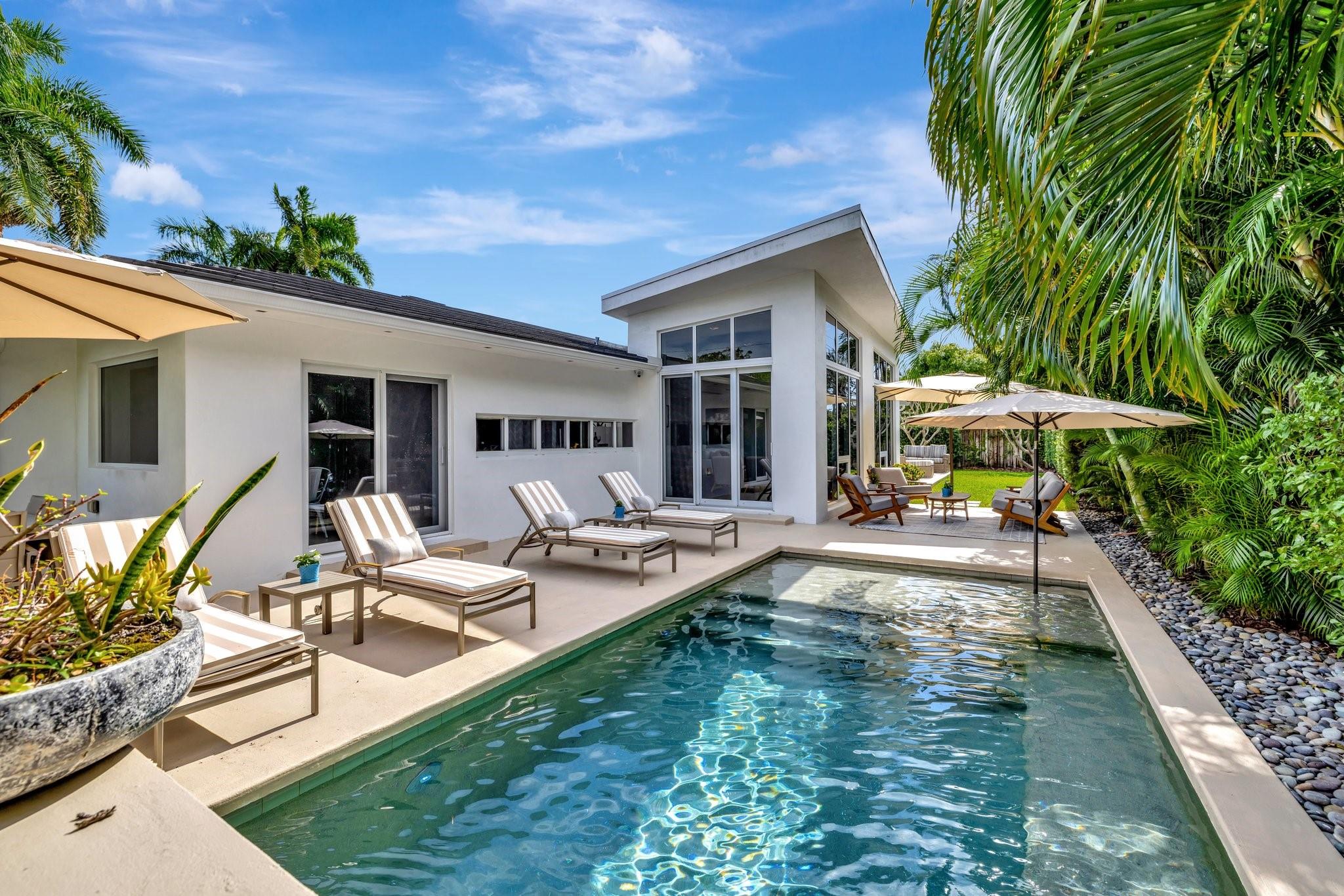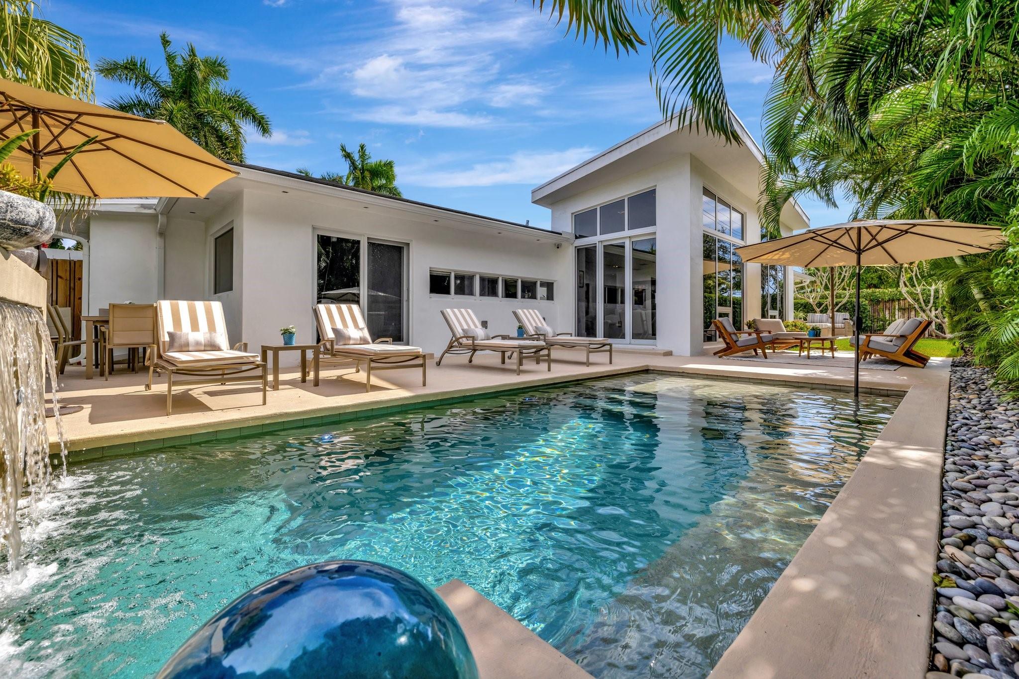 Seeking extraordinary & unique? Enjoy Californian inspired architecture & great curb appeal, award winning design throughout. Move-in ready residence, carefully curated custom finishes & materials usually found in $3m plus homes! Set-back from street with circular driveway. New roof, totally private courtyard pool area, Sonos & professional landscape lighting. Large format custom windows in living areas. Innovative floorplan, porcelain floors, modern eat-in kitchen, custom Italian cabinetry, Google smart home. Inviting living & dining areas for great entertaining flow. Expansive Primary Suite, spa quality custom bath Laufen fixtures & walk-in closet. Totally separate guest & additional bedroom, both upgraded baths (includes cabana) & Italian mosaic walls. Large 2 car garage & roof terrace