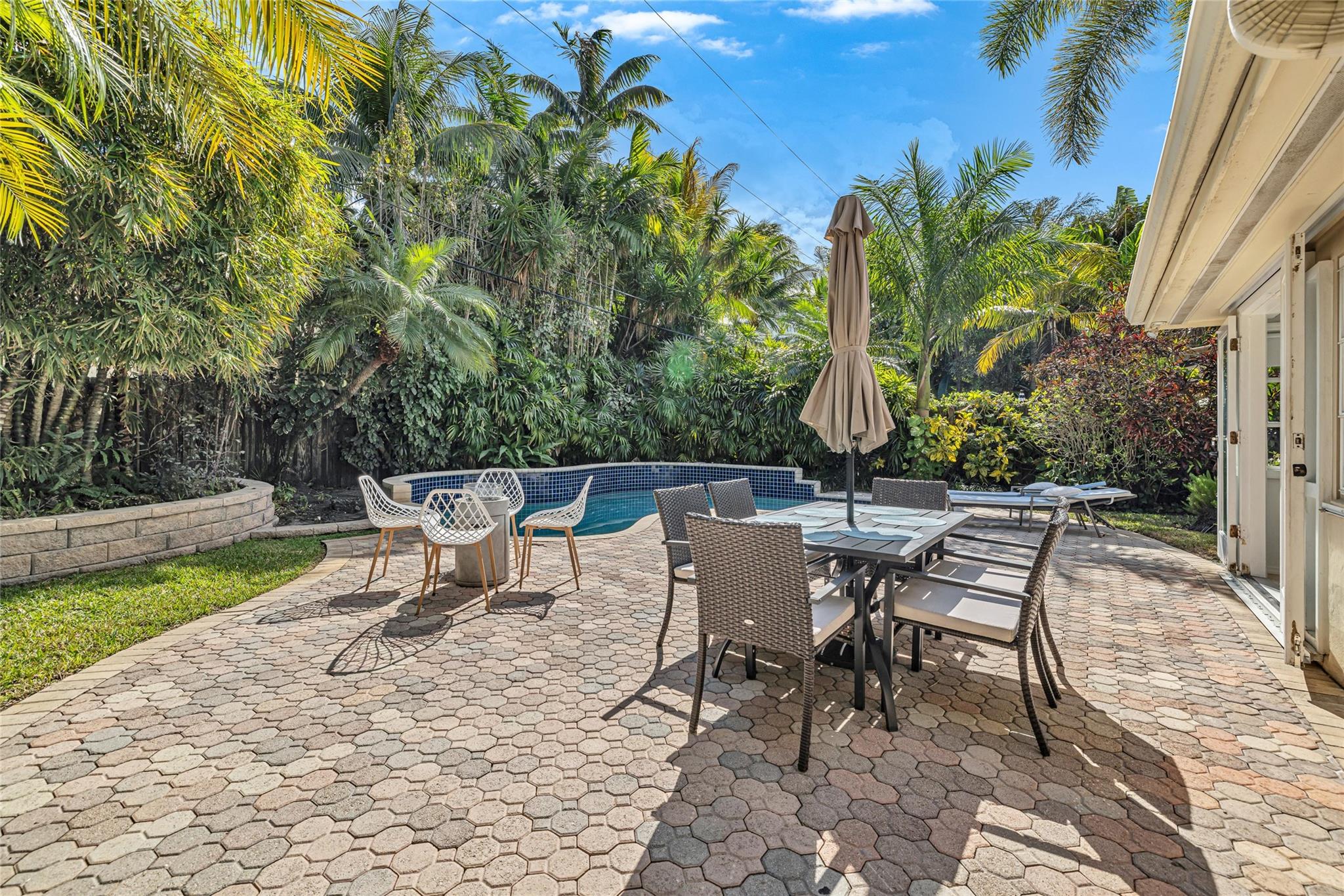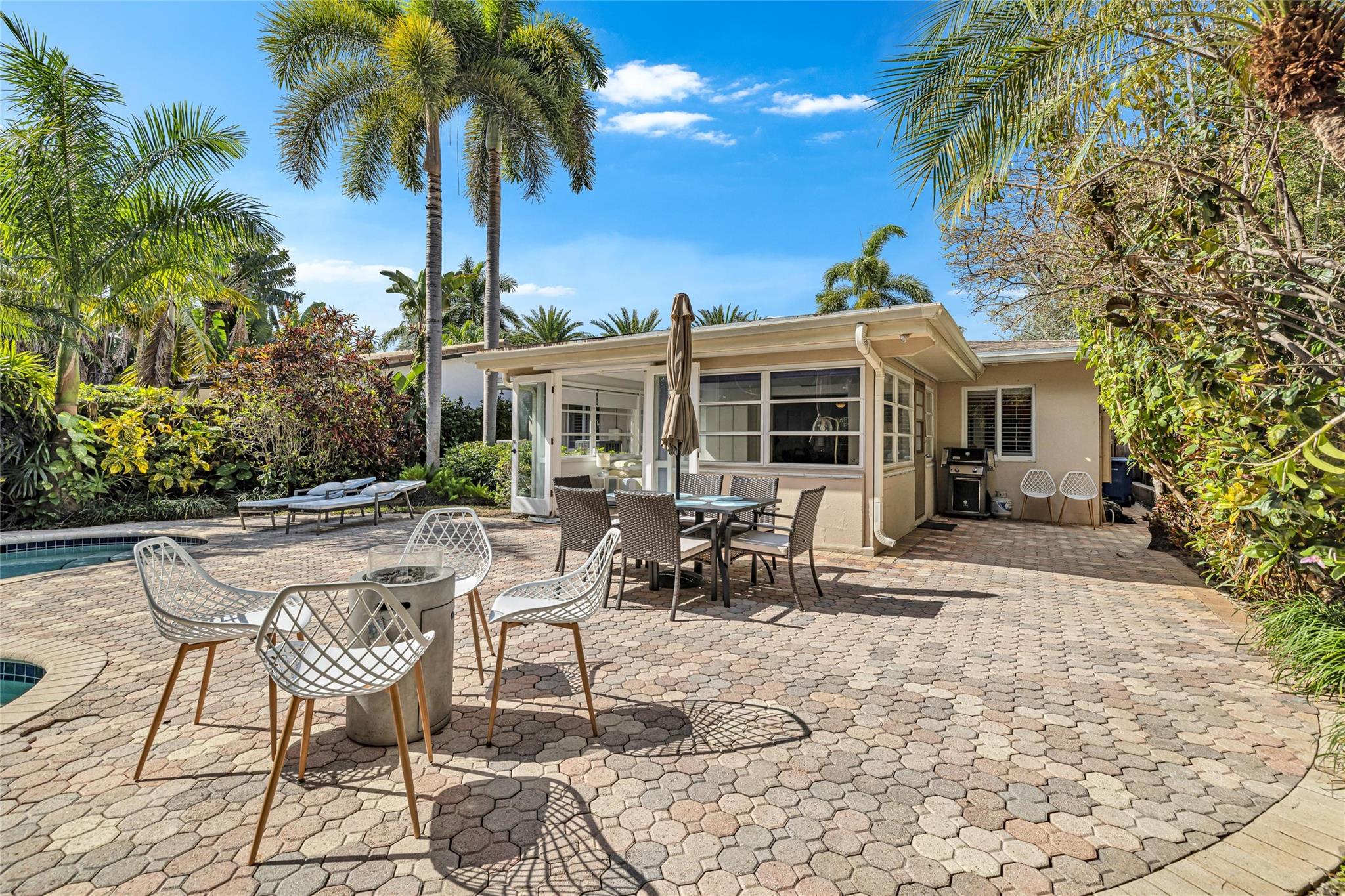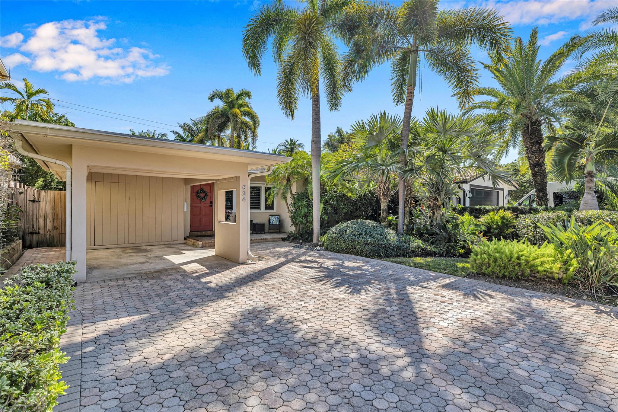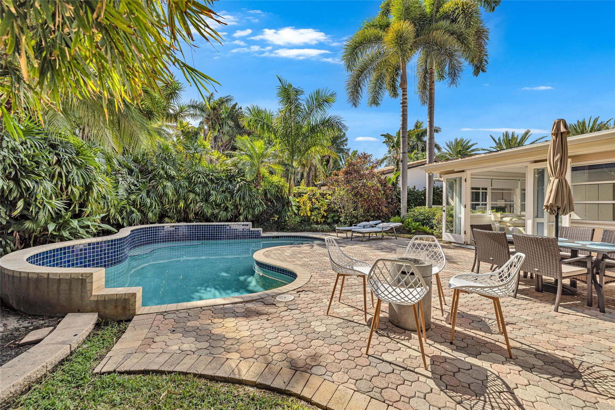 Located atop the ridge on one of Victoria Park's most sought-after streets, this meticulously maintained home sits on a deep, tropically landscaped lot and can be enjoyed as a 3/2 or a 2/2 with a family room. Filled with natural light, the open plan offers seamless flow. The well-equipped kitchen features a breakfast bar, tall cabinets, and an adjacent pantry and laundry room. Walls of windows overlook the heated saltwater pool, surrounded by lush hedges, flowering shrubs, and tall palms. Each corner bedroom has a large custom closet and nearby bath. Impact glass covers most openings, with some hurricane panels. The wide driveway accommodates up to four cars, including a carport. Victoria Park is renowned for its walkability and easy access to parks, tennis, beaches, airport and shopping.