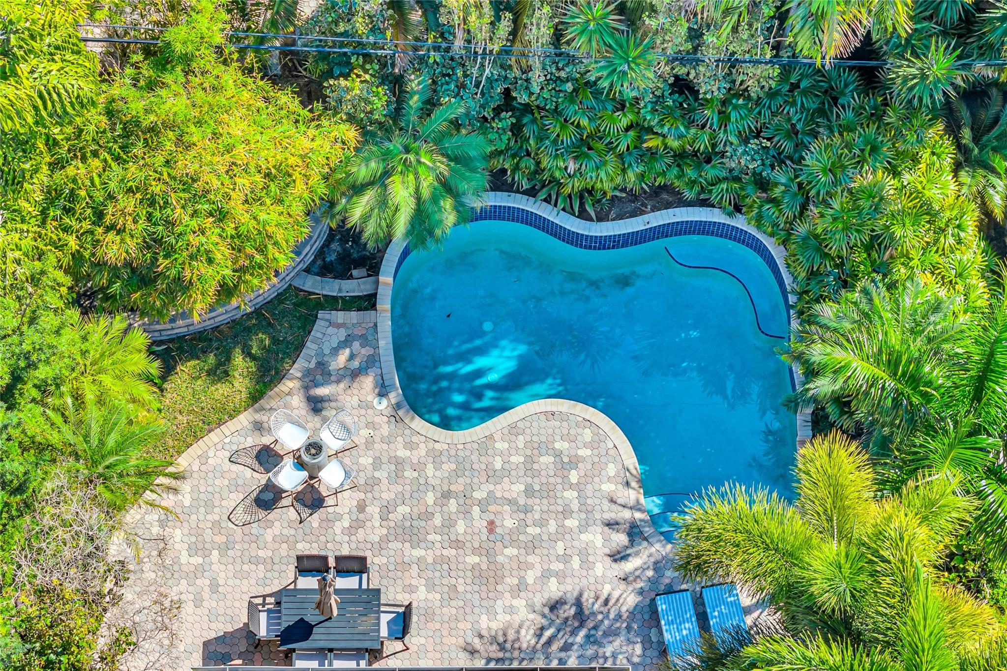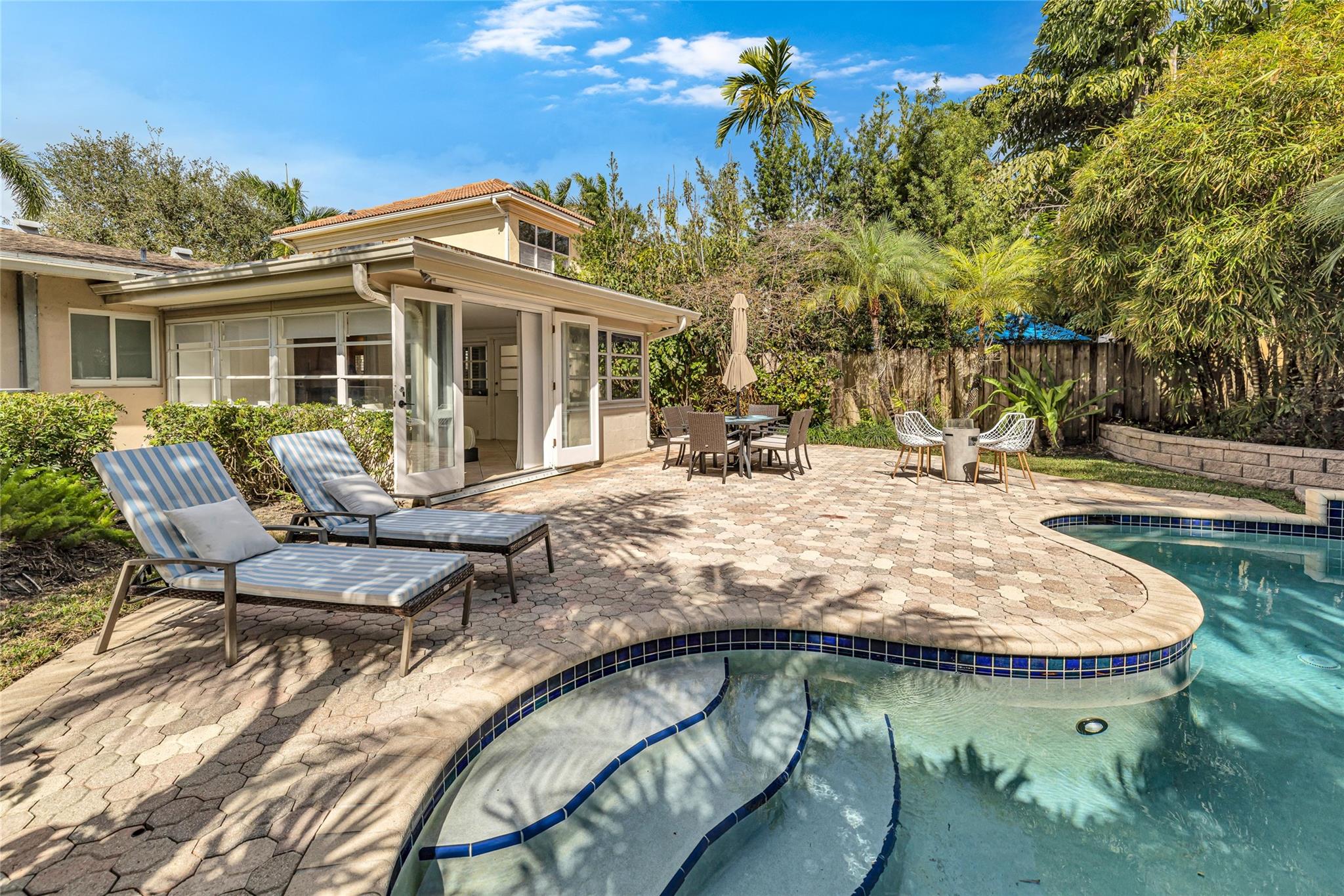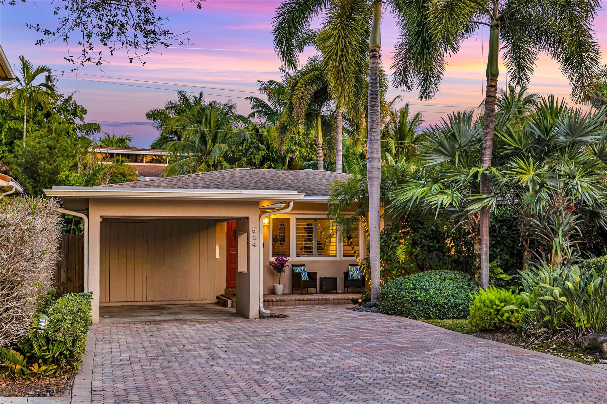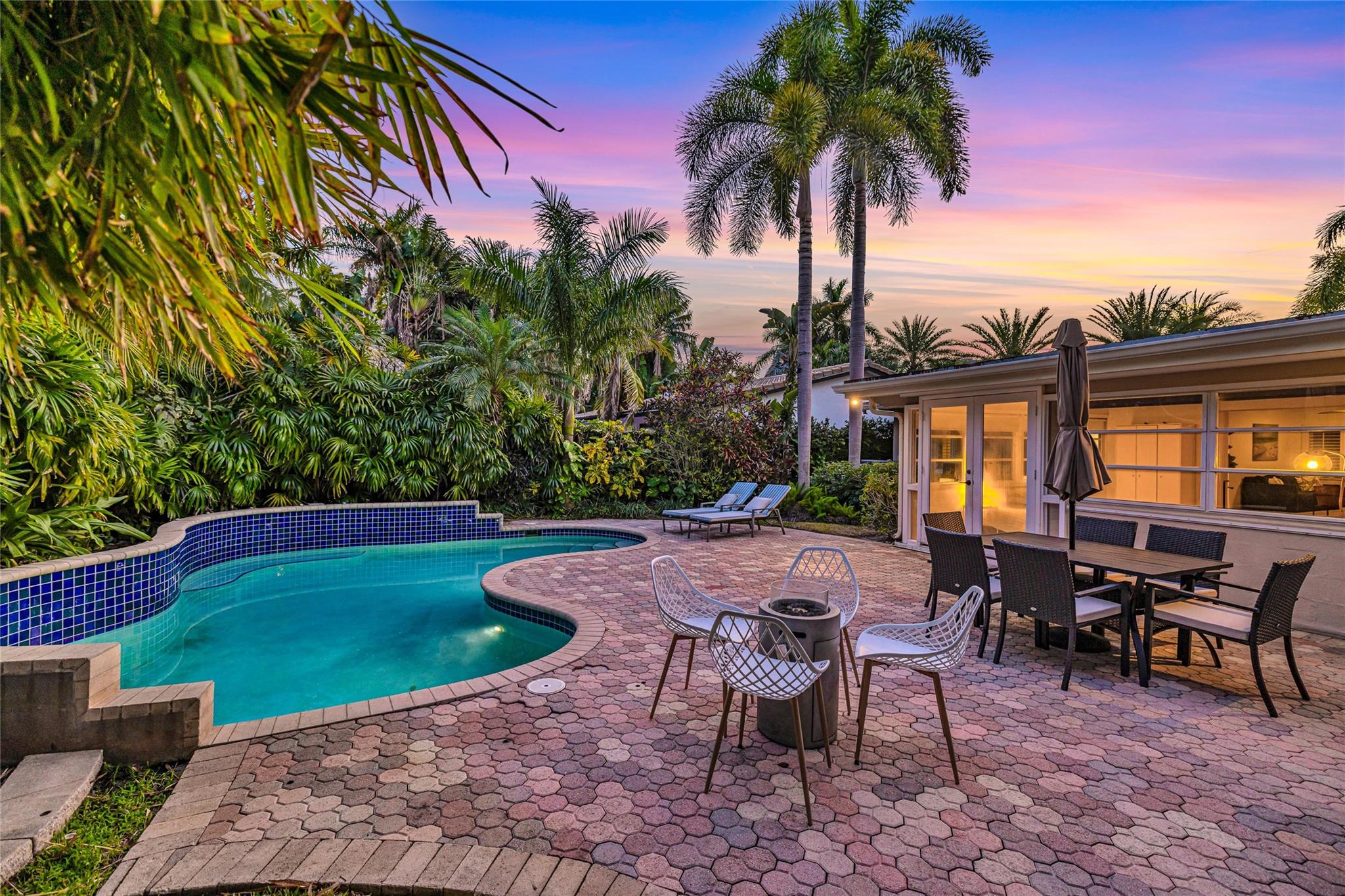 Located atop the ridge on one of Victoria Park's most sought-after streets, this meticulously maintained home sits on a deep, tropically landscaped lot and can be enjoyed as a 3/2 or a 2/2 with a family room. Filled with natural light, the open plan offers seamless flow. The well-equipped kitchen features a breakfast bar, tall cabinets, and an adjacent pantry and laundry room. Walls of windows overlook the heated saltwater pool, surrounded by lush hedges, flowering shrubs, and tall palms. Each corner bedroom has a large custom closet and nearby bath. Impact glass covers most openings, with some hurricane panels. The wide driveway accommodates up to four cars, including a carport. Victoria Park is renowned for its walkability and easy access to parks, tennis, beaches, airport and shopping.