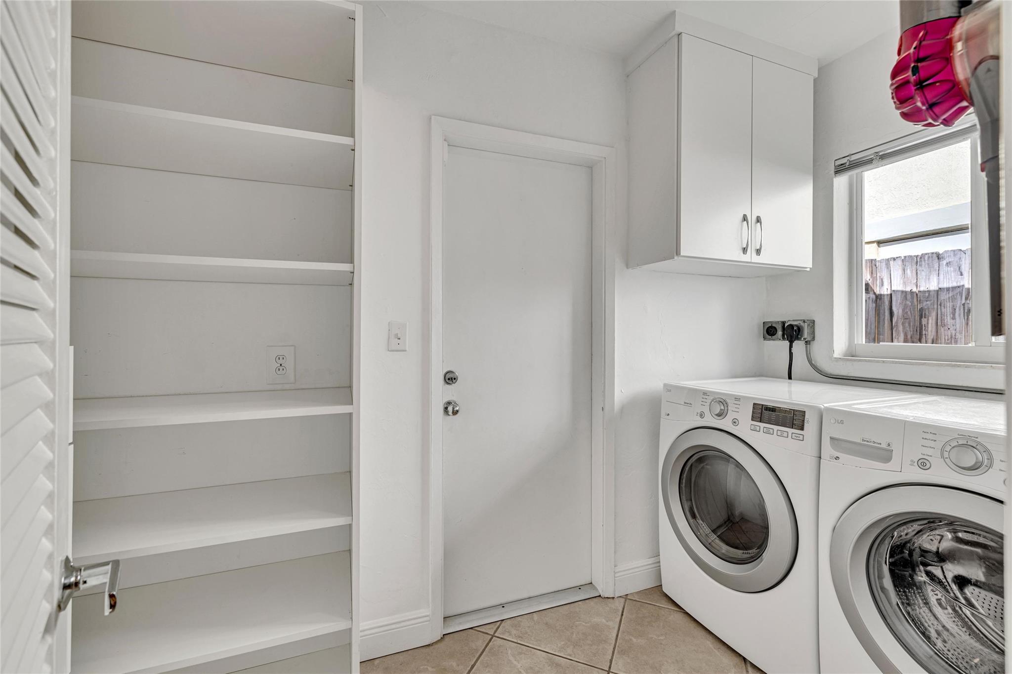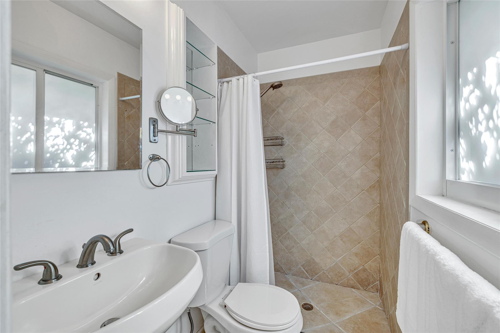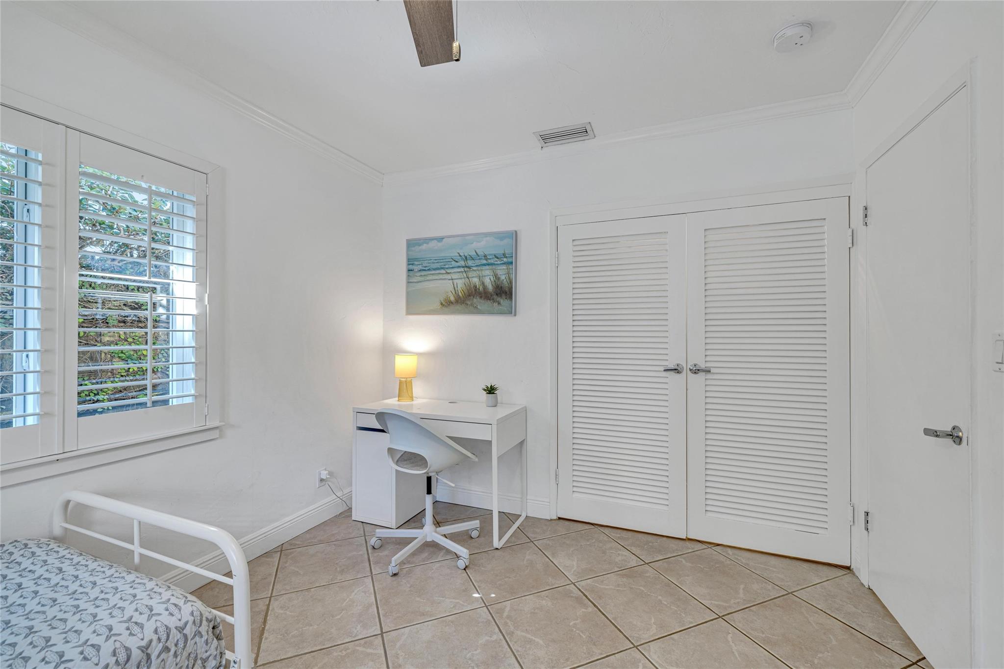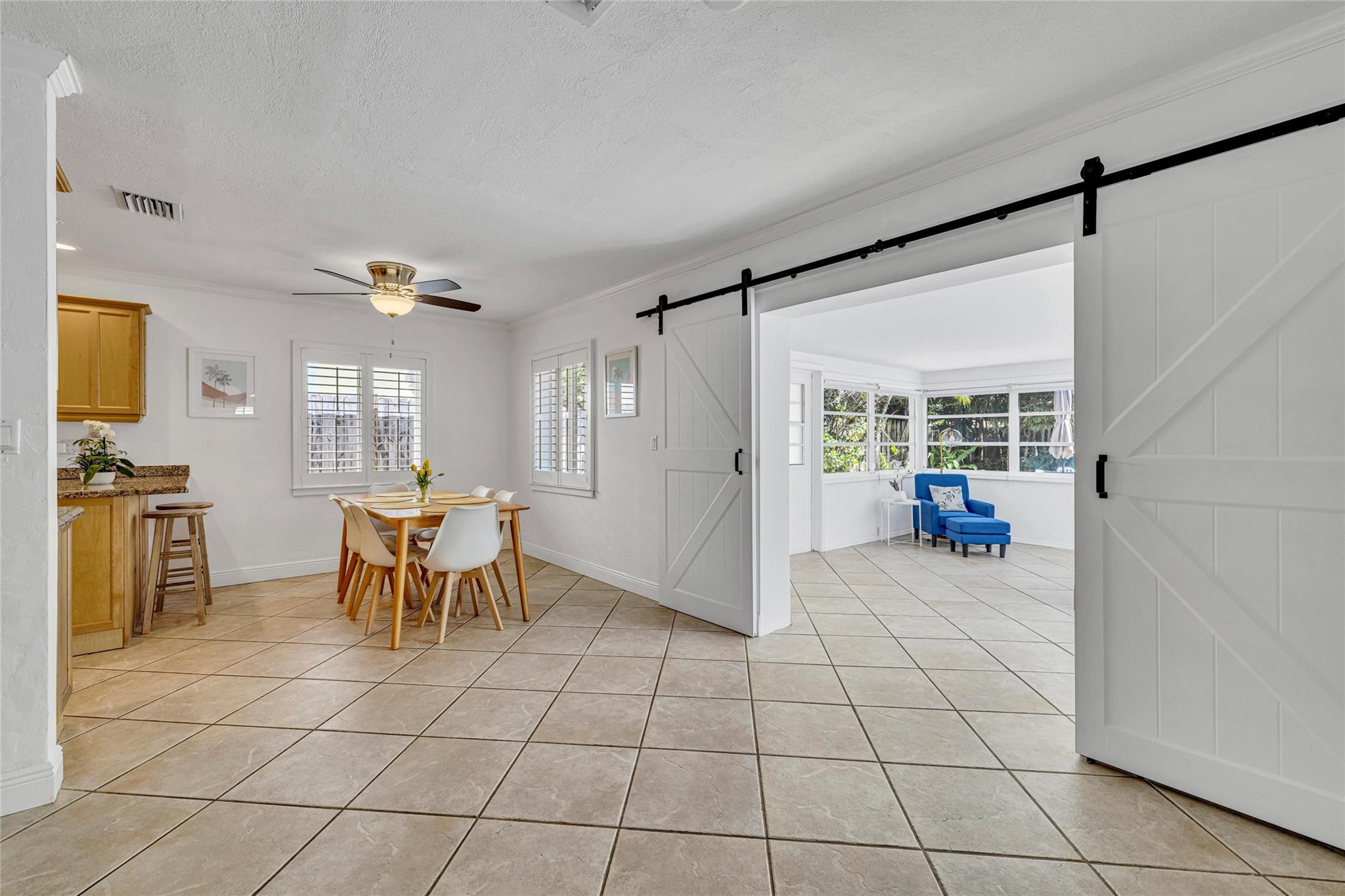 Located atop the ridge on one of Victoria Park's most sought-after streets, this meticulously maintained home sits on a deep, tropically landscaped lot and can be enjoyed as a 3/2 or a 2/2 with a family room. Filled with natural light, the open plan offers seamless flow. The well-equipped kitchen features a breakfast bar, tall cabinets, and an adjacent pantry and laundry room. Walls of windows overlook the heated saltwater pool, surrounded by lush hedges, flowering shrubs, and tall palms. Each corner bedroom has a large custom closet and nearby bath. Impact glass covers most openings, with some hurricane panels. The wide driveway accommodates up to four cars, including a carport. Victoria Park is renowned for its walkability and easy access to parks, tennis, beaches, airport and shopping.