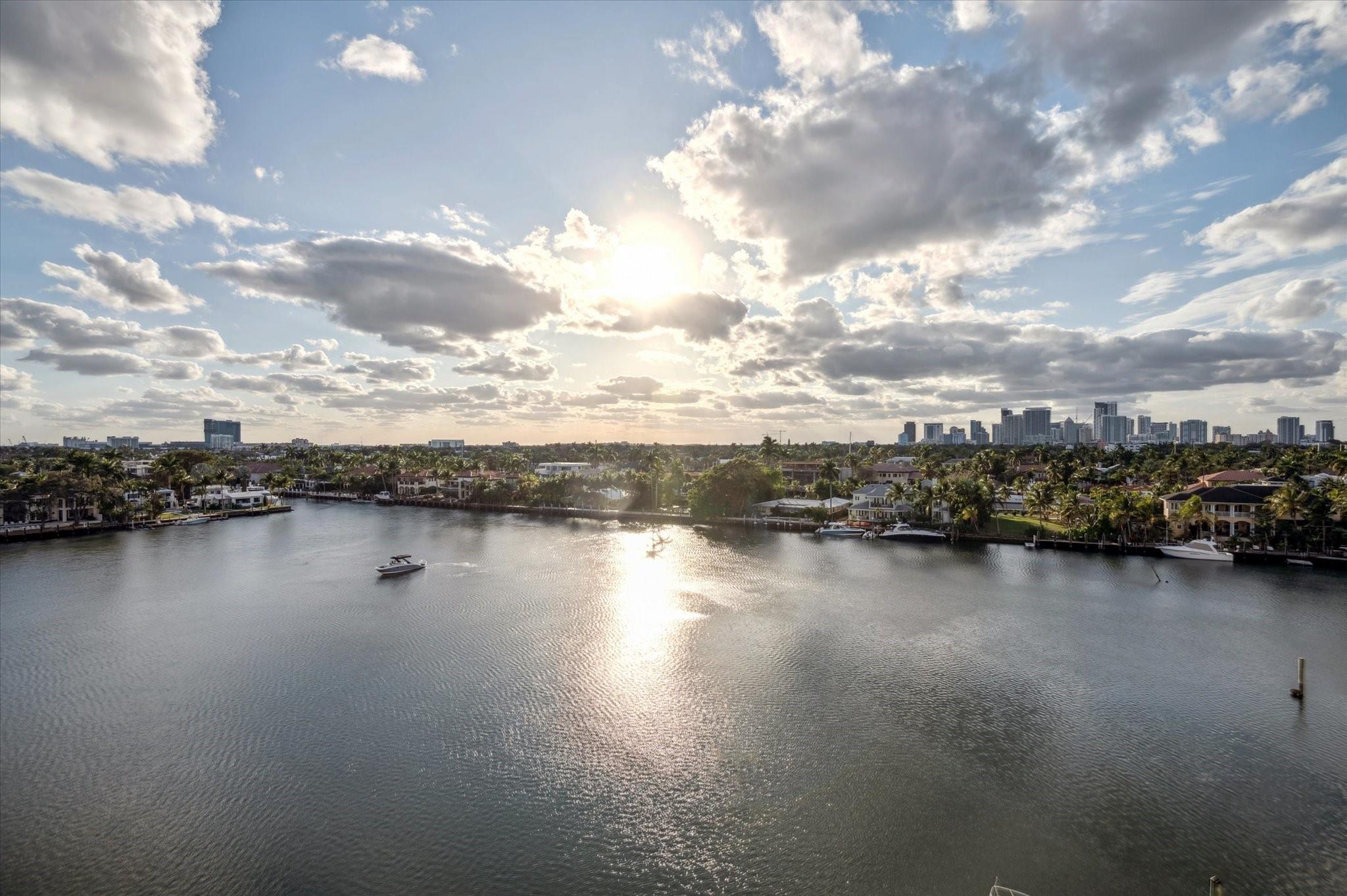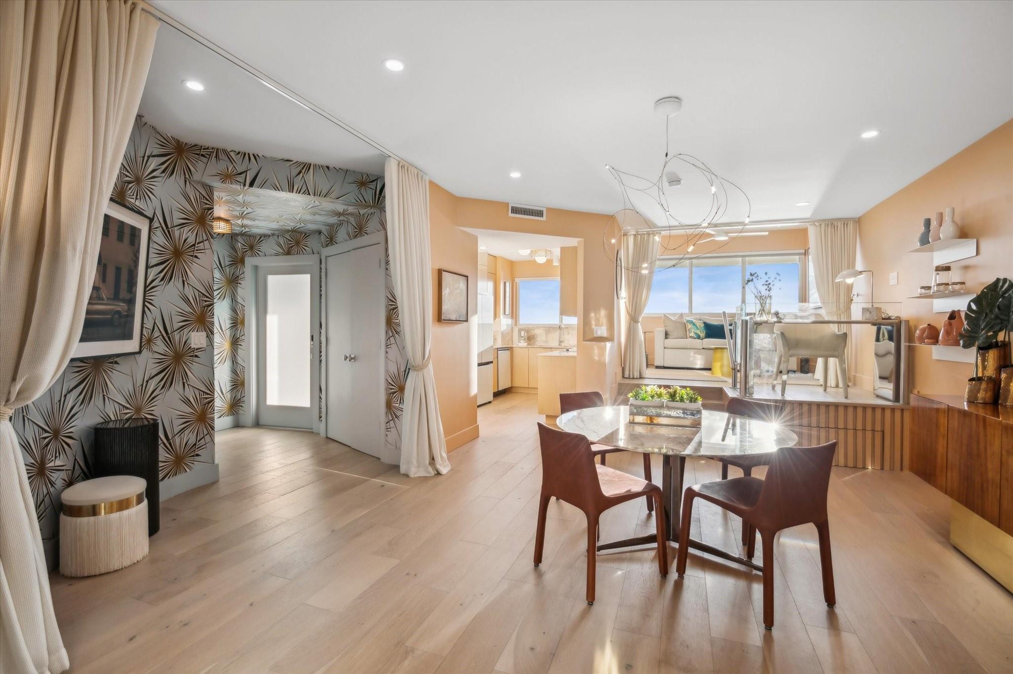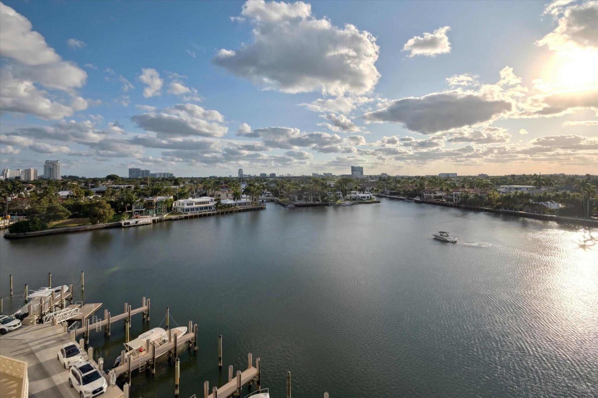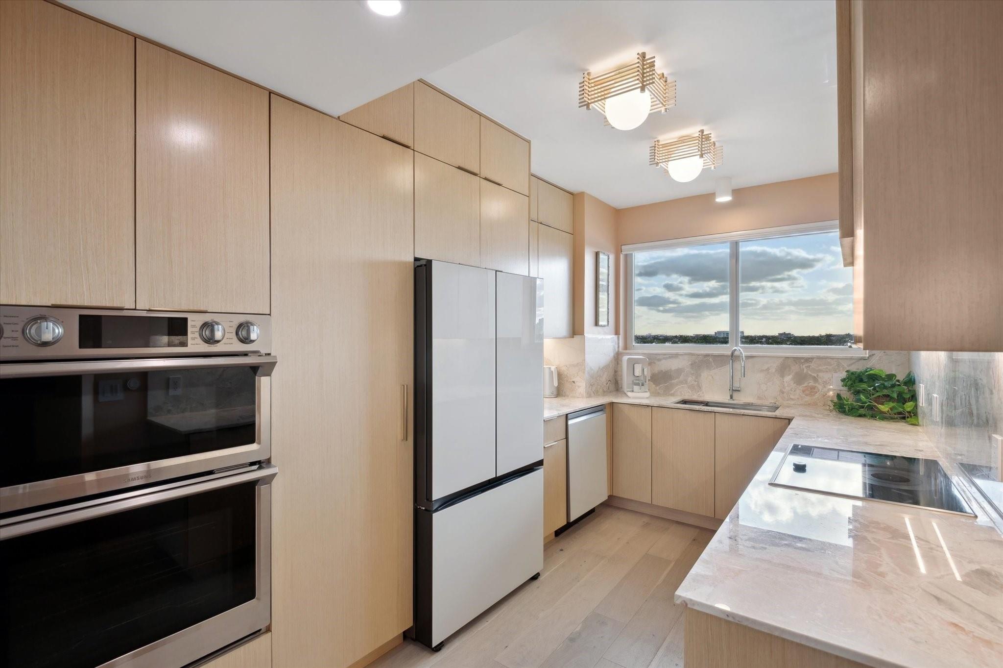 Fabulous! Over $250K spent in renovations with Dockage available and No Fixed Bridges. Reconfigured to include 2 office areas, a private primary with a large walk-in closet, a stunning, spacious bath with custom cabinets, oversized shower & water closet. Views galore from a raised lounge area that includes workspace & allowing for a private 2nd bedroom area. Beautiful light oak floors throughout, custom high-end wallpaper, LED lighting & Grohe Faucets. Both baths have new terrazzo flooring, automatic bidet toilets & handmade finishes including a subtle Japanese tile in the 2nd to go with a show stopper pink marble. The kitchen has custom oak cabinets, French Marble and views of Sunset Lake. An XL-patio offers ocean & Intracoastal views. Large dog-friendly, 24-hr concierge, best location!