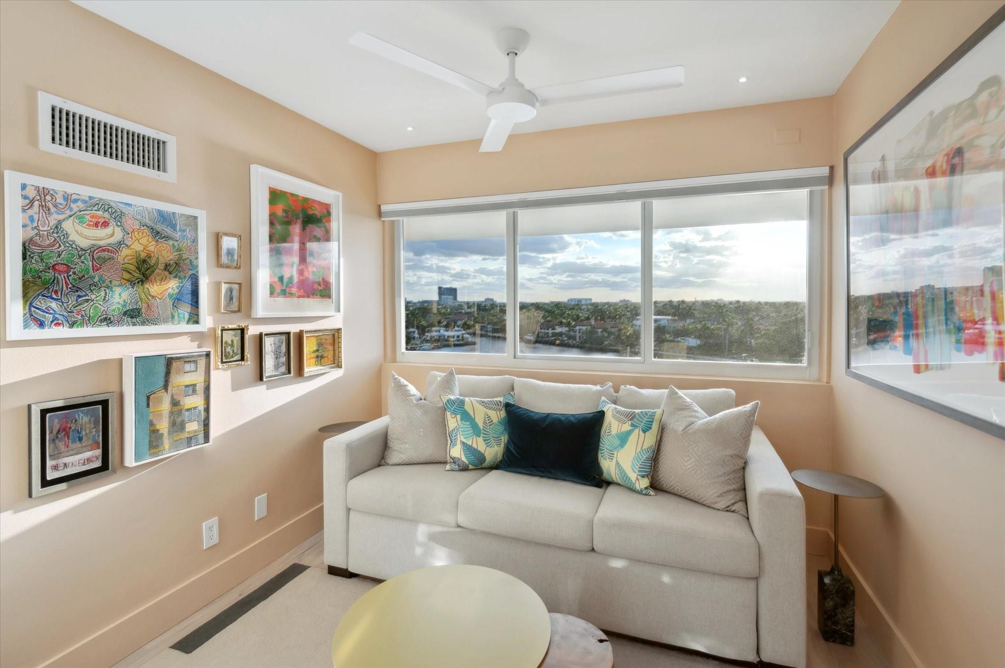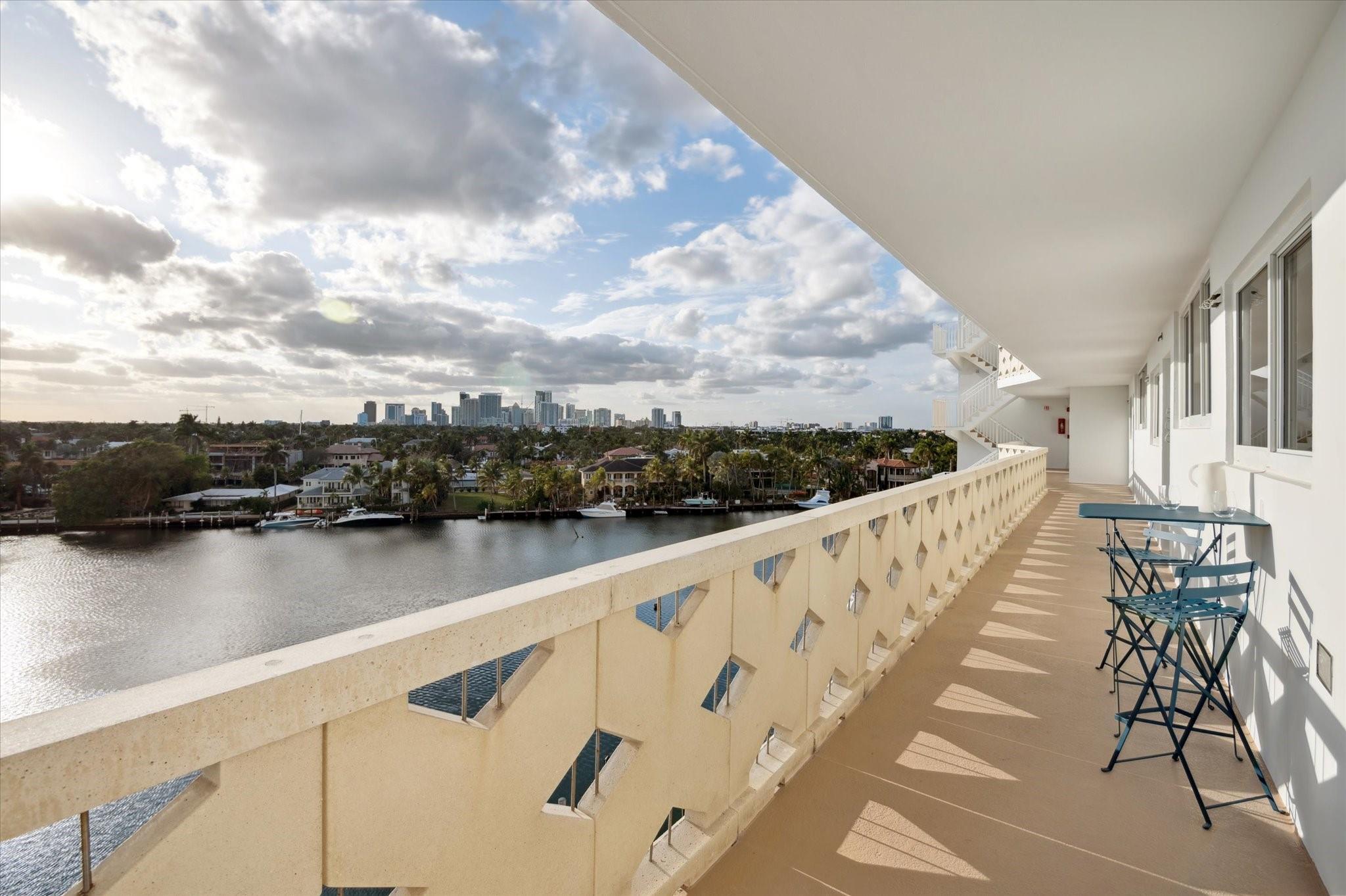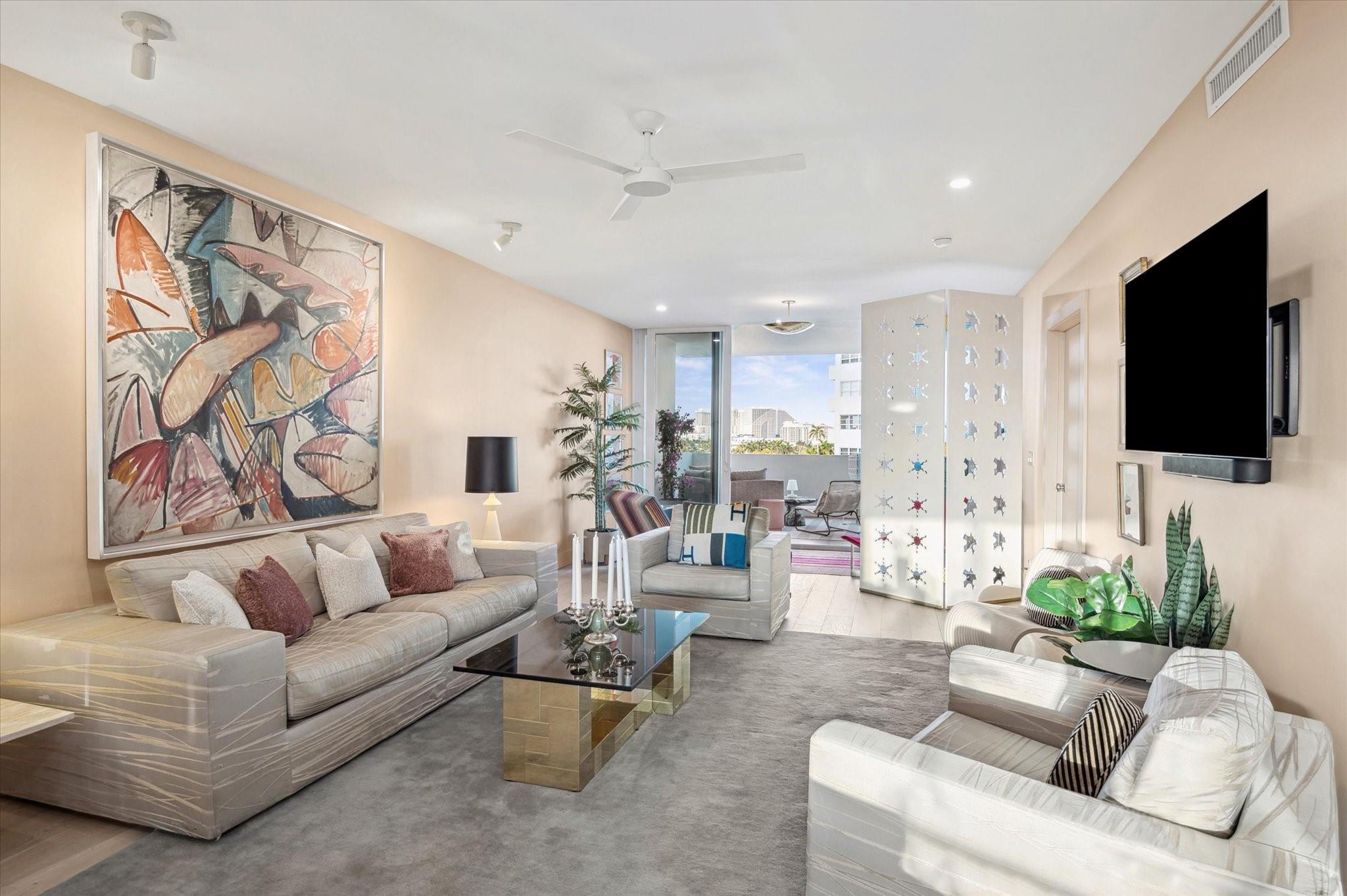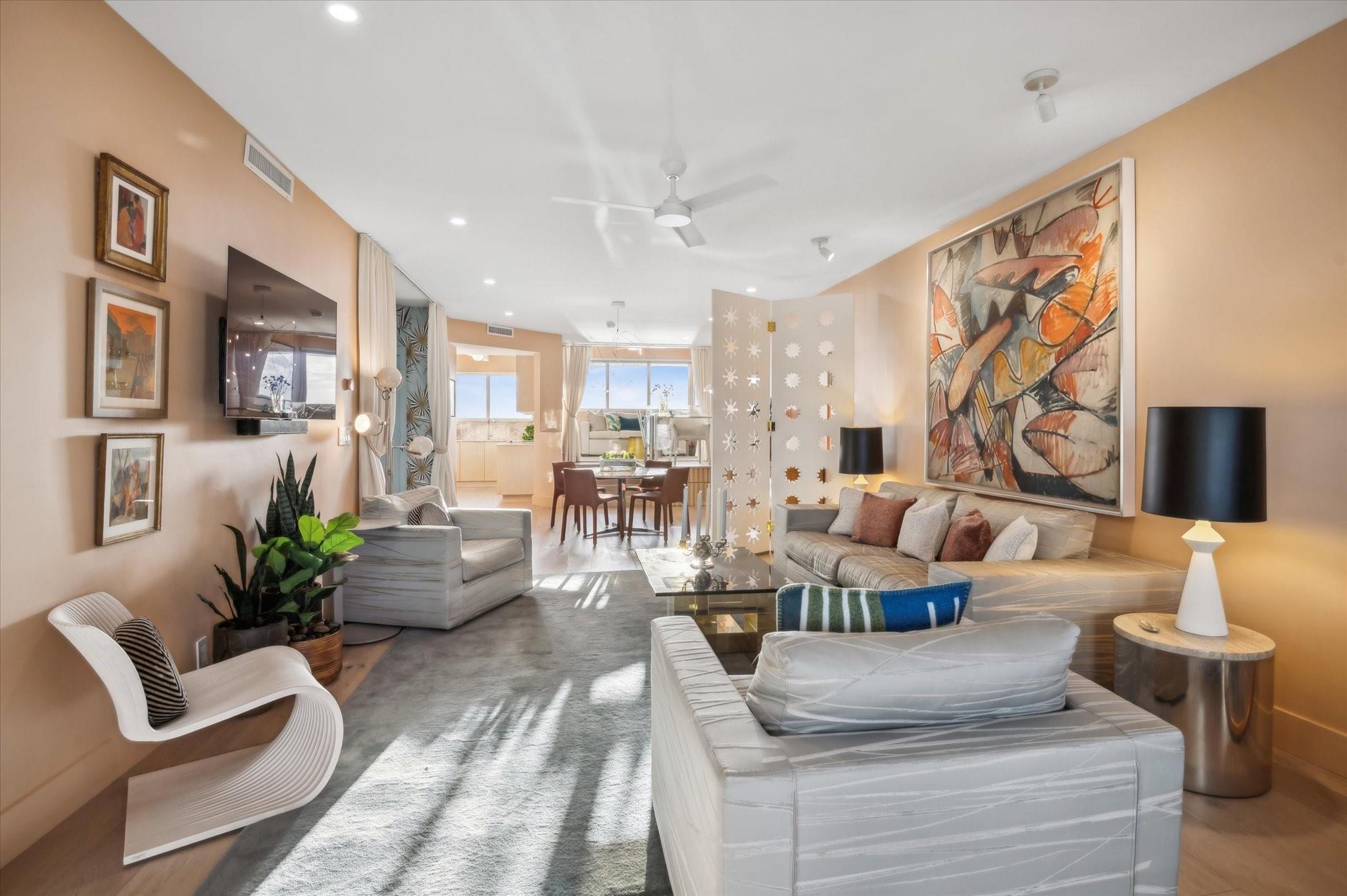 Fabulous! Over $250K spent in renovations with Dockage available and No Fixed Bridges. Reconfigured to include 2 office areas, a private primary with a large walk-in closet, a stunning, spacious bath with custom cabinets, oversized shower & water closet. Views galore from a raised lounge area that includes workspace & allowing for a private 2nd bedroom area. Beautiful light oak floors throughout, custom high-end wallpaper, LED lighting & Grohe Faucets. Both baths have new terrazzo flooring, automatic bidet toilets & handmade finishes including a subtle Japanese tile in the 2nd to go with a show stopper pink marble. The kitchen has custom oak cabinets, French Marble and views of Sunset Lake. An XL-patio offers ocean & Intracoastal views. Large dog-friendly, 24-hr concierge, best location!