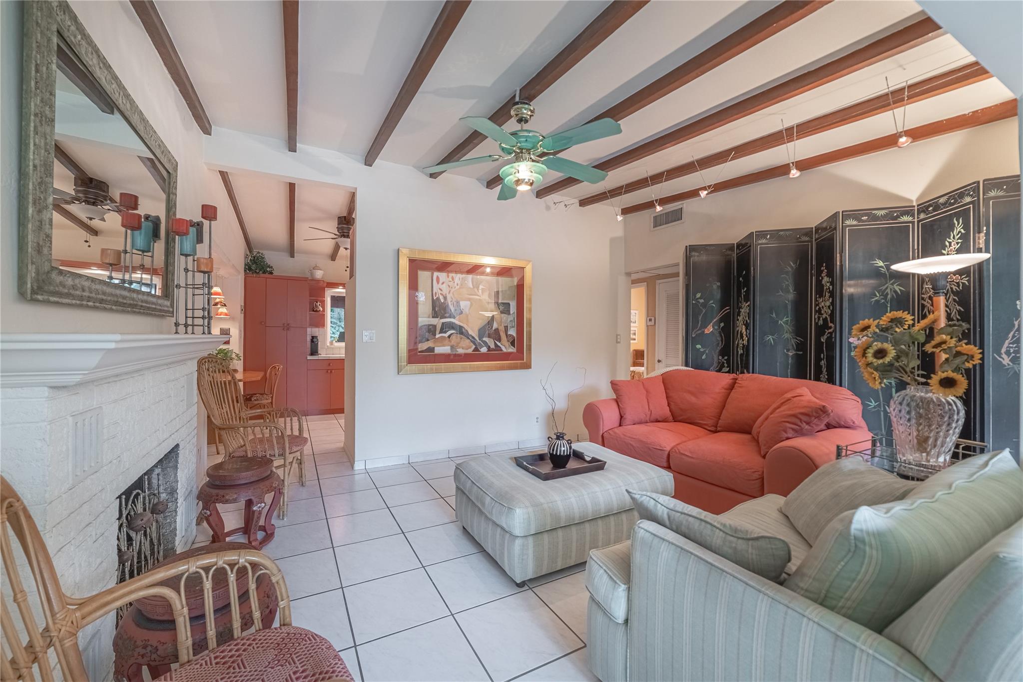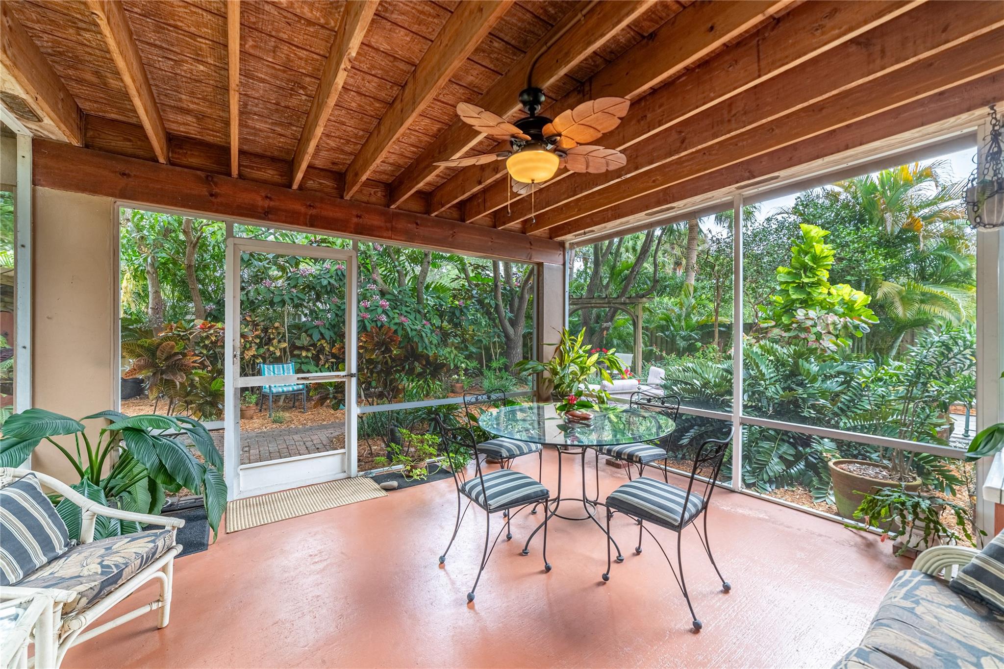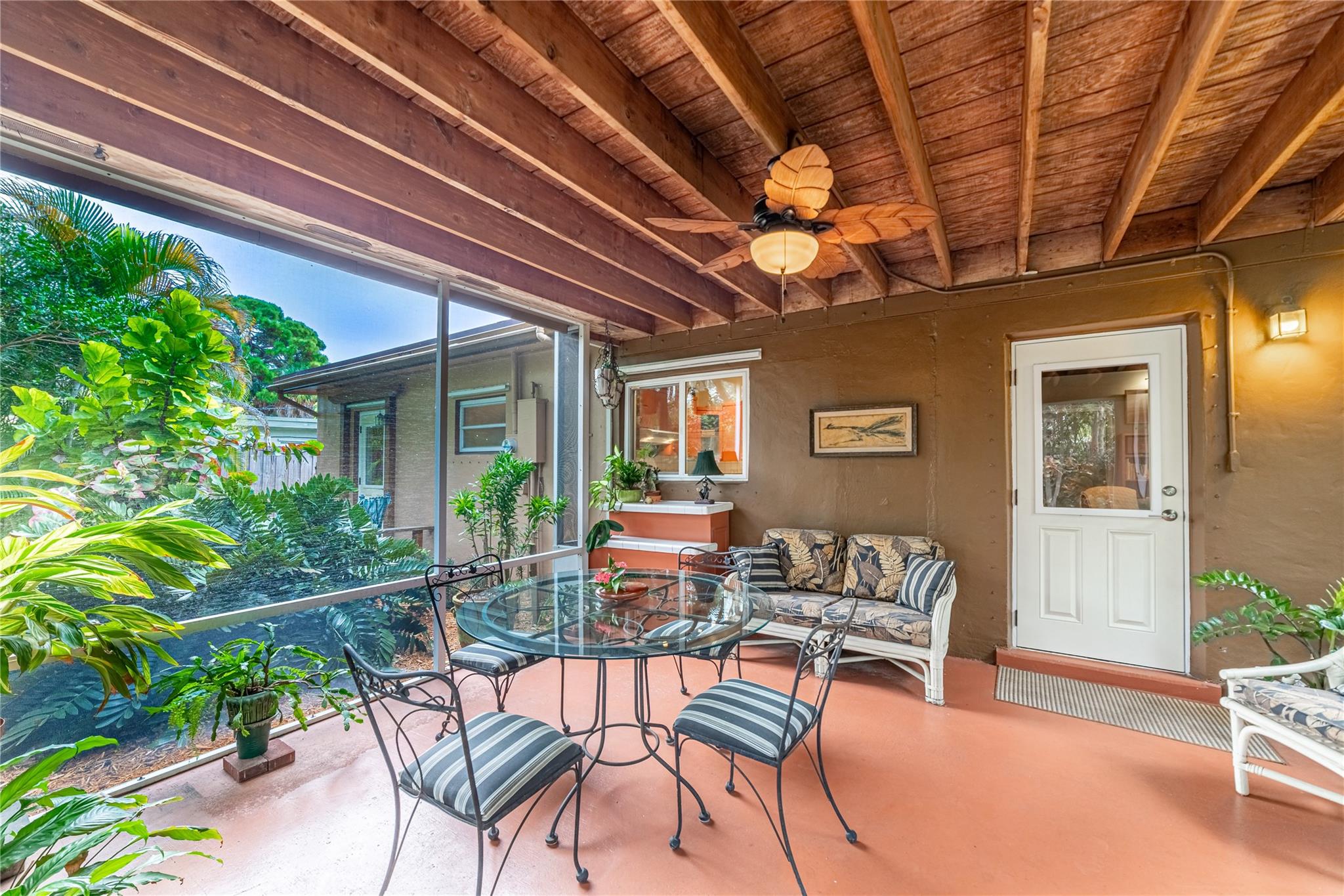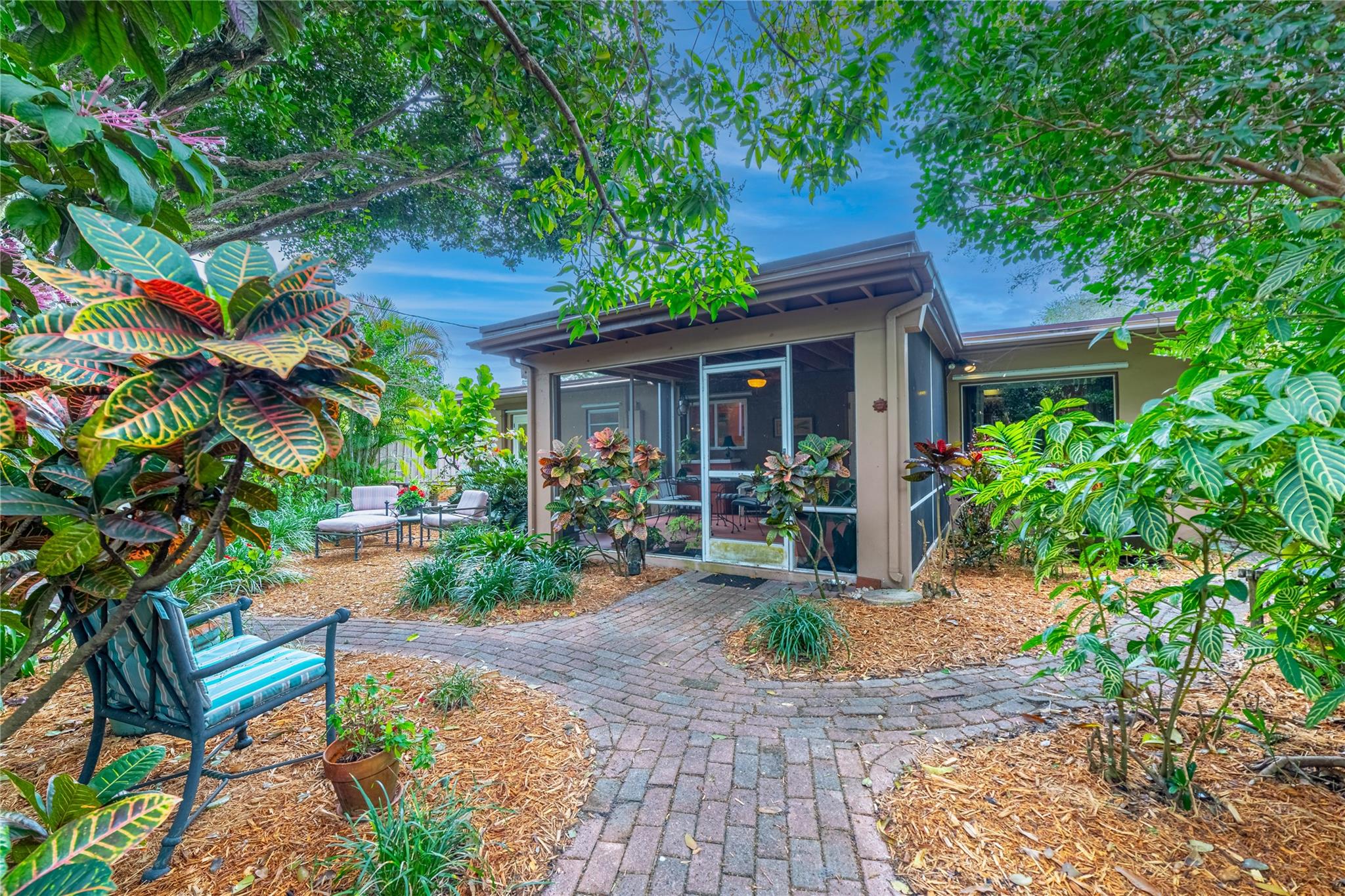 Enjoy Tranquil Gardens & Mid Century Character in this well maintained 2-bedroom 2 bath home in Sought after Shady Banks. Vaulted, Exposed Bean Ceilings, Fireplace, Separate Living, Dining & Family Room. Large Eat in Kitchen with Breakfast Bar. Built in workstation outside of the primary bedroom. Family room off the kitchen with large windows flooded with natural light. Enjoy morning coffee & afternoon cocktails on the screened porch overlooking the lush, mature landscaping. Partial Impact Windows /Doors.2022 roof, 357 sf garage -great workshop or vehicle storage. One way in/out, surrounded by the New River & no through traffic. Enjoy 2 parks with Tennis, Volleyball, Exercise Equipment & a nature preserve along the river with boardwalks, natural crest shoreline next to Safe Harbor Marine.