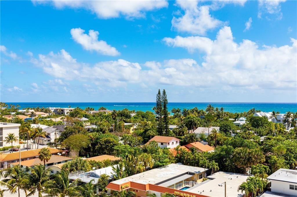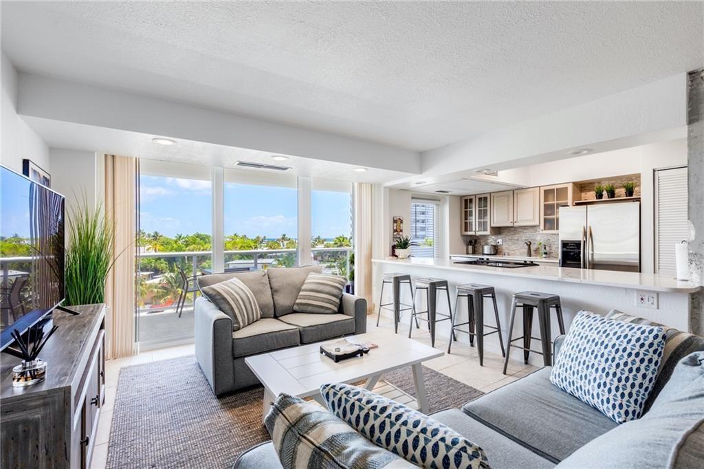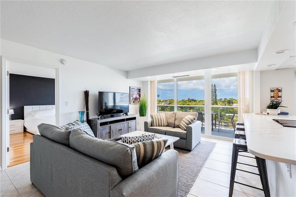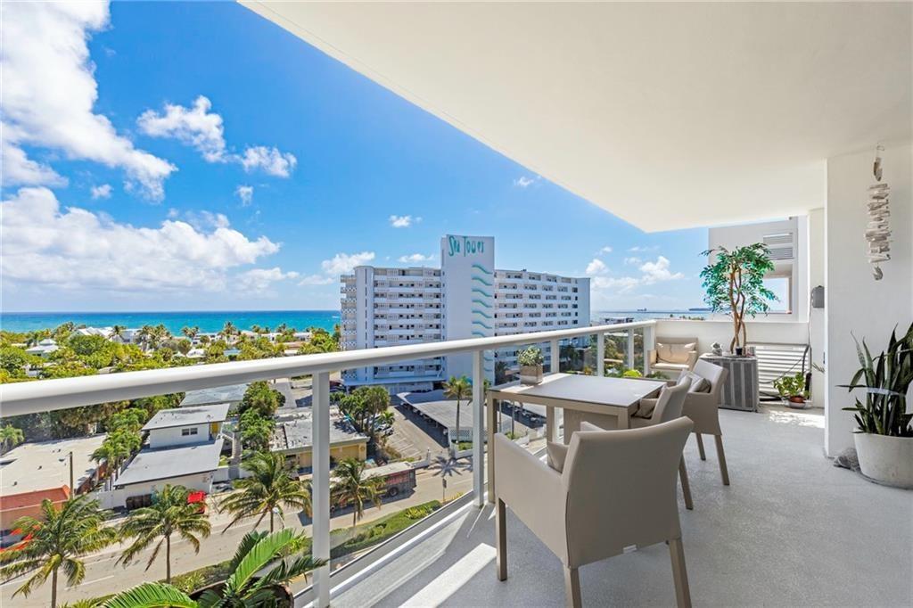 Updated 2 bedroom/2 bathroom split floor plan with beautiful views. Enjoy your morning coffee on the 31' balcony. Condo features a new open kitchen with quartz countertops & gray cabinets. Unit also has newer bathrooms, built in closets, impact windows & doors plus a washer/dryer. Storage unit, two parking Spaces (#57 & one outside) & plenty of guests spaces. Building has an amazing rooftop pool with panoramic views of ocean & ICW, a new gym, 24 hour guard in the lobby & is a super secure building. Short distance to restaurants, bars, shops and the beach. Condo fee includes basic cable, internet, water and exterior insurance.