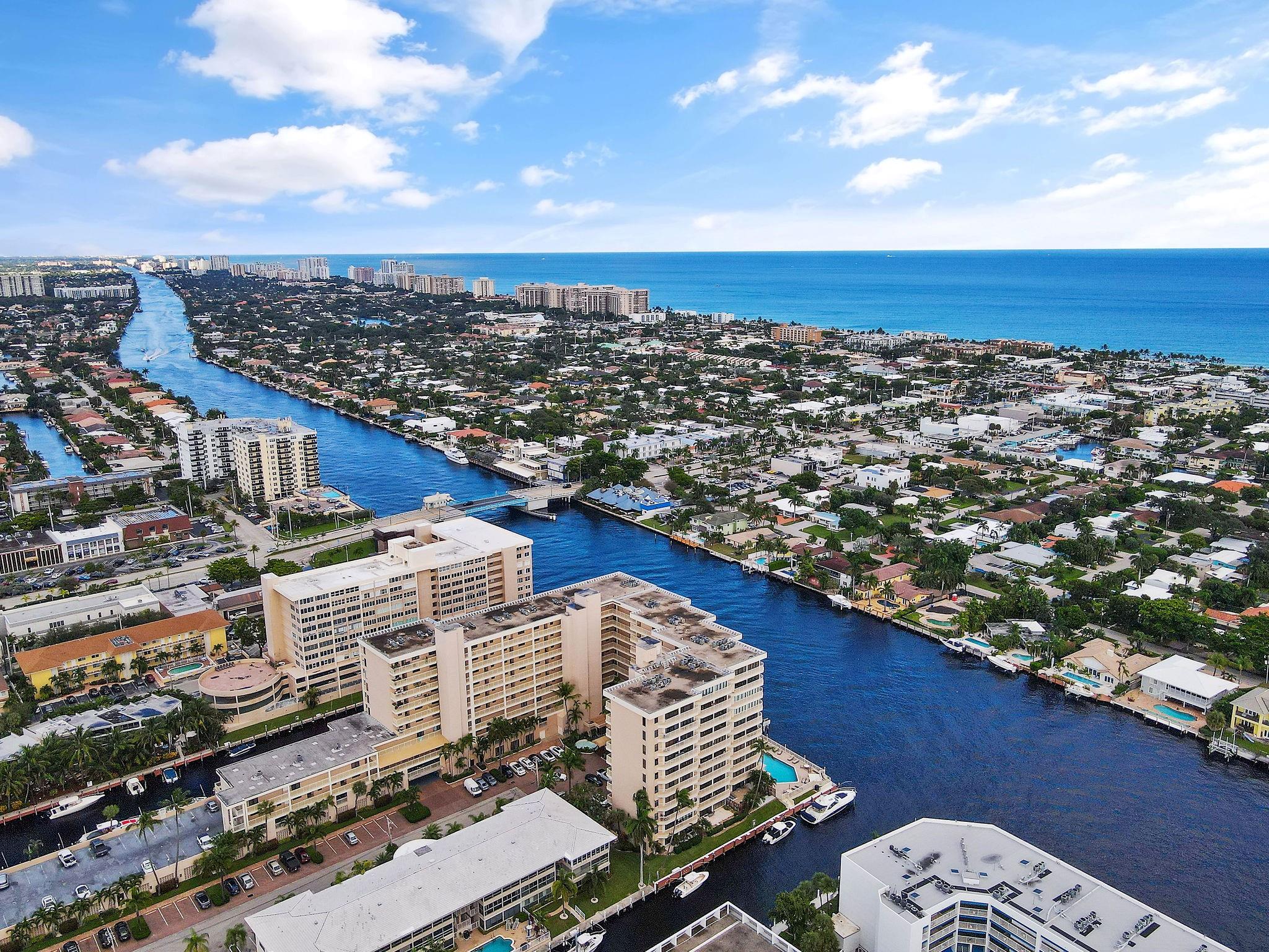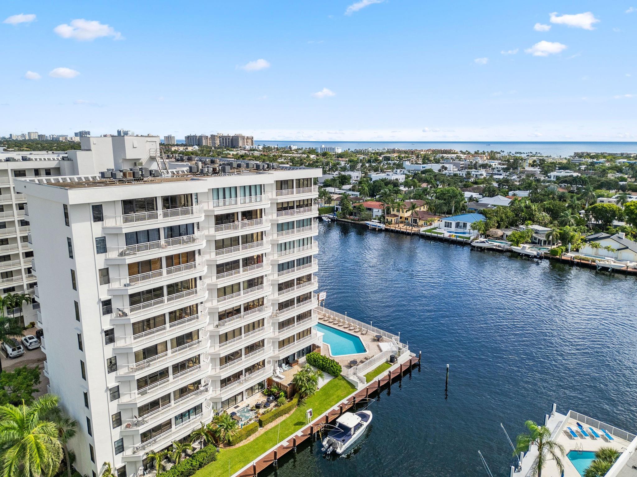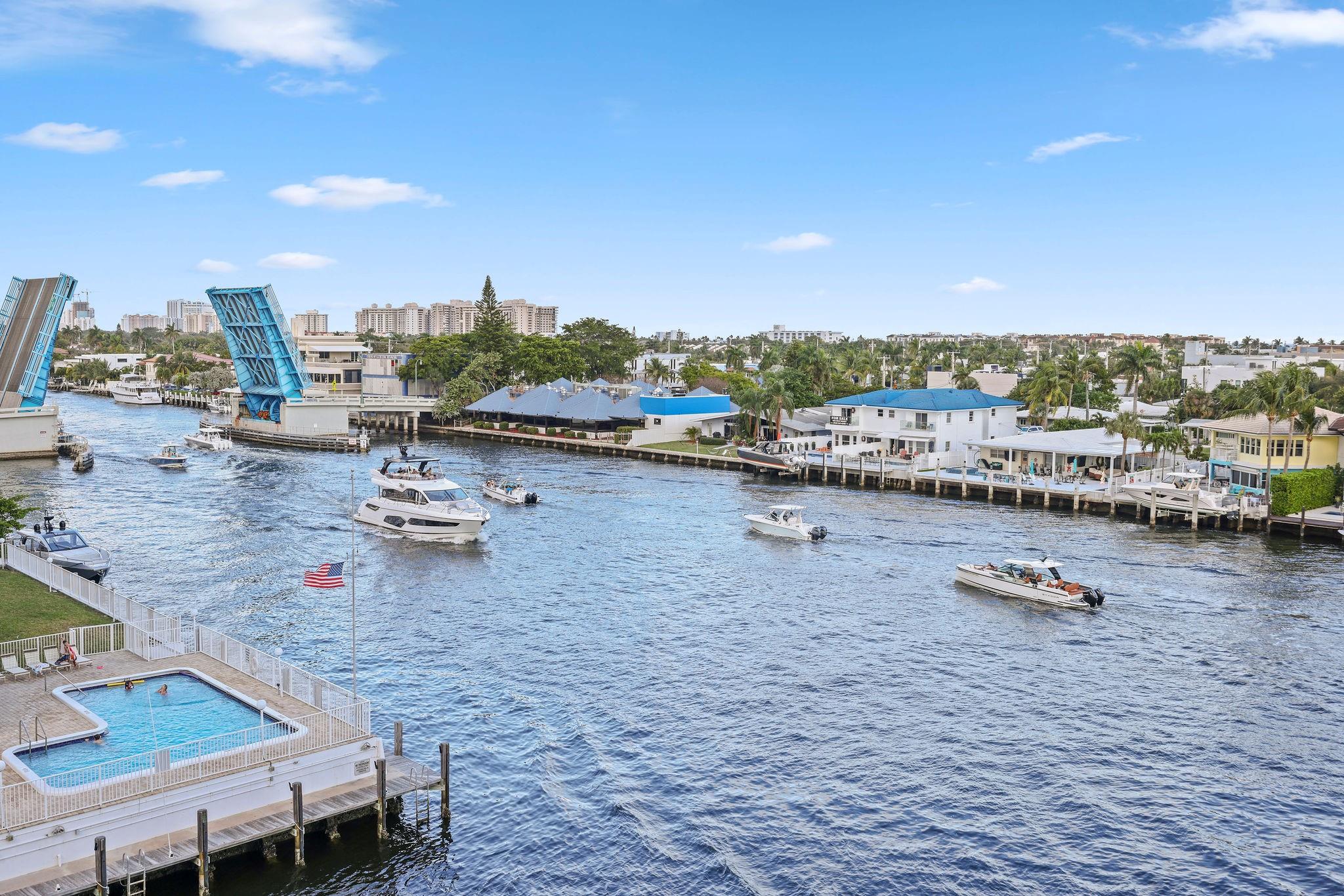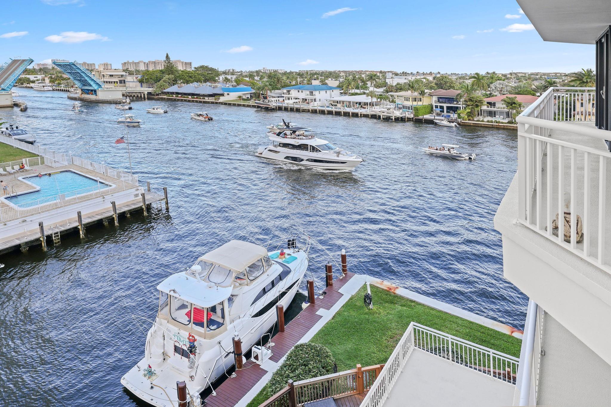 One condo off of the corner with amazing views of the intracoastal waterway at the Pilot House condo. The building has the best curb appeal of all of the condo buildings on the water off of Bayview Drive with wood decking over water features. The unit has all mpact windows and sliding doors that open to a private balcony with water views. Laundry in the unit. Small pets are welcome. The unit comes with garage parking. Common area boat dockage. This is a great value that won't last.