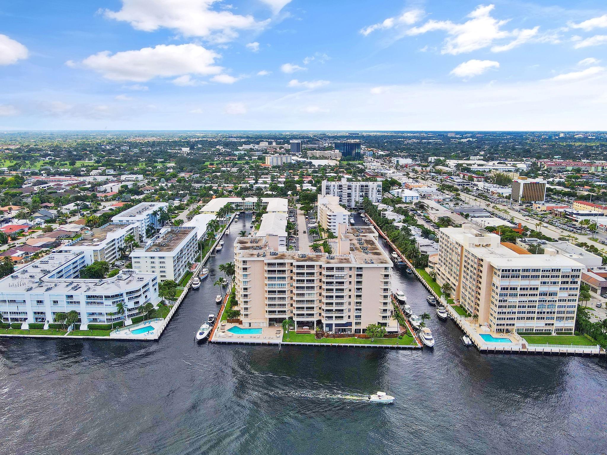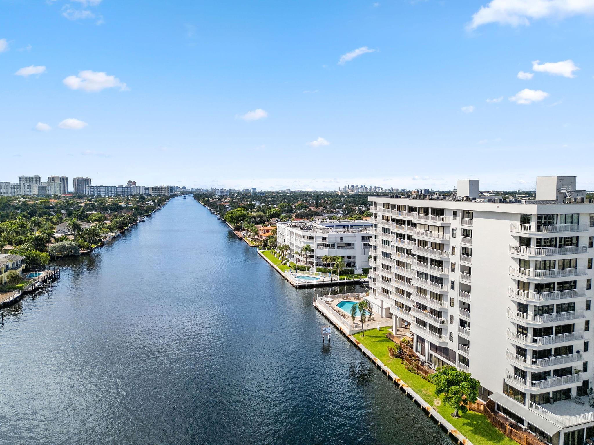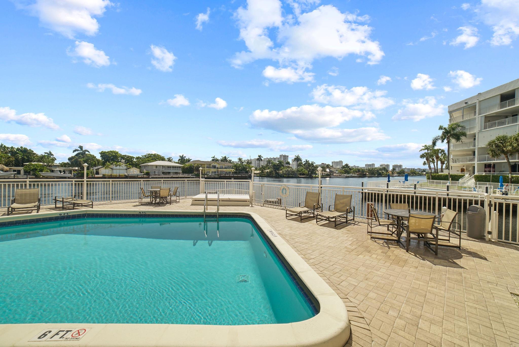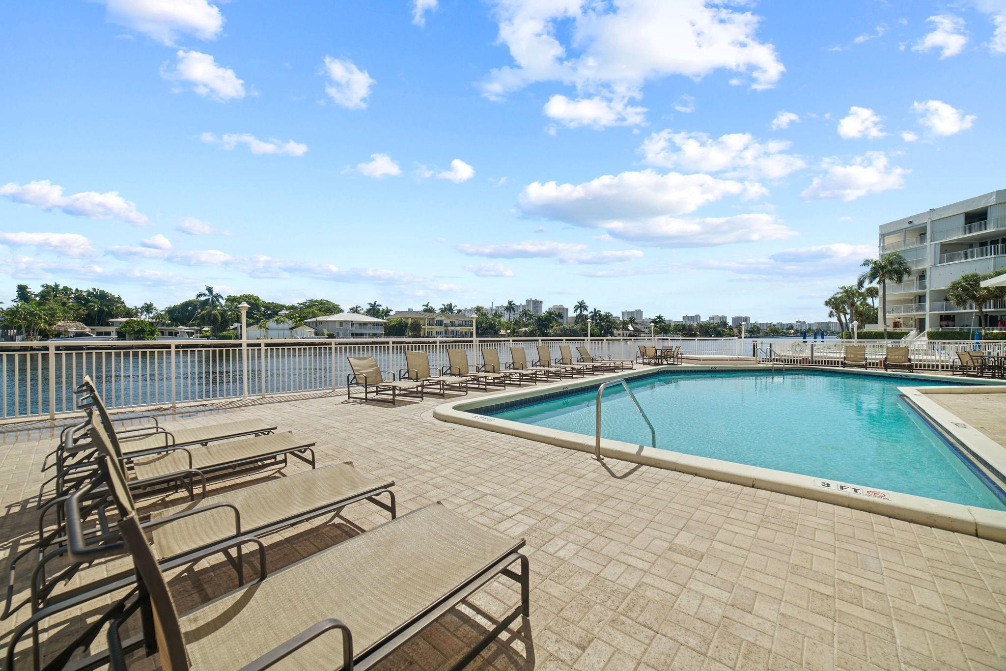 One condo off of the corner with amazing views of the intracoastal waterway at the Pilot House condo. The building has the best curb appeal of all of the condo buildings on the water off of Bayview Drive with wood decking over water features. The unit has all mpact windows and sliding doors that open to a private balcony with water views. Laundry in the unit. Small pets are welcome. The unit comes with garage parking. Common area boat dockage. This is a great value that won't last.