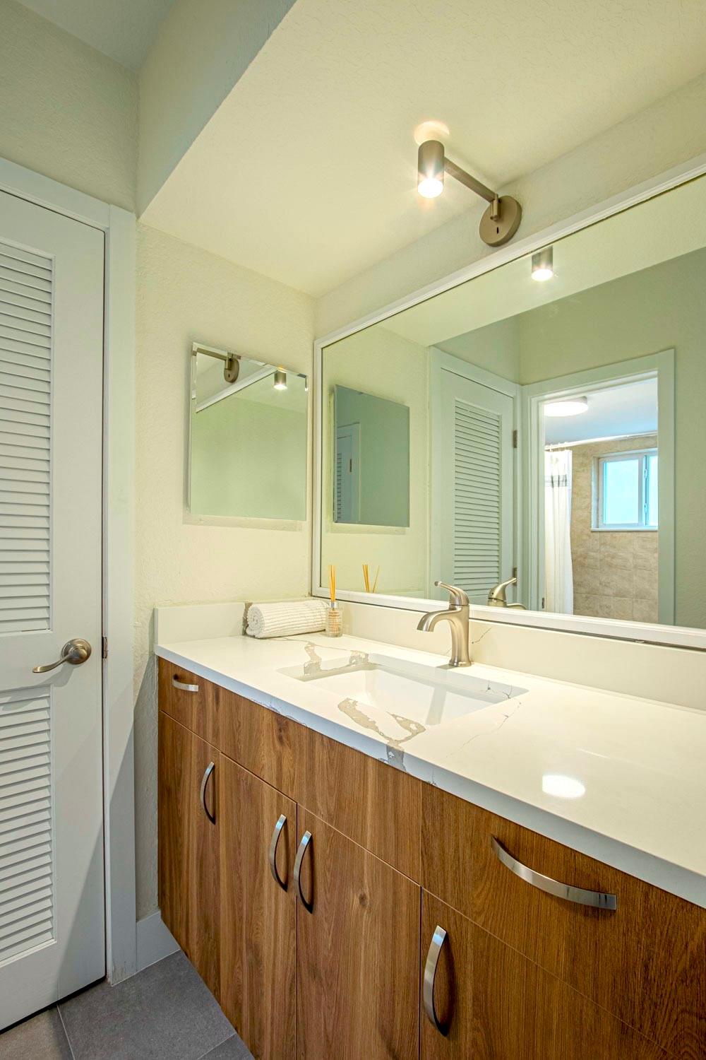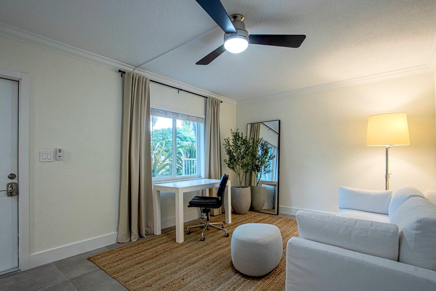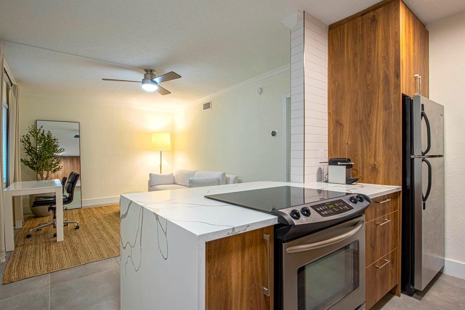 Remodeled 1-bed, 1-bath condo in the tony Poinsettia Heights neighborhood of Fort Lauderdale. This home features a 2023 luxe kitchen perfect for entertaining with stainless appliances, quartz counters and waterfall design; impact windows with blinds and curtains; large-platform porcelain tile floors; 2021 A/C; on-demand hot water; walk-in closet with custom cabinets; and deeded parking just outside. Poinsettia Landings features a heated pool, lush landscaping, ample guest parking, multiple BBQ grills, pet-waste stations, a healthy reserve fund, and top-tier property management,... all just a mile from The Drive and a stone's throw from the services and conveniences along US-1. Come home from work, shopping, or the beach to relax by the tropical pool. Don't miss this gorgeous property!