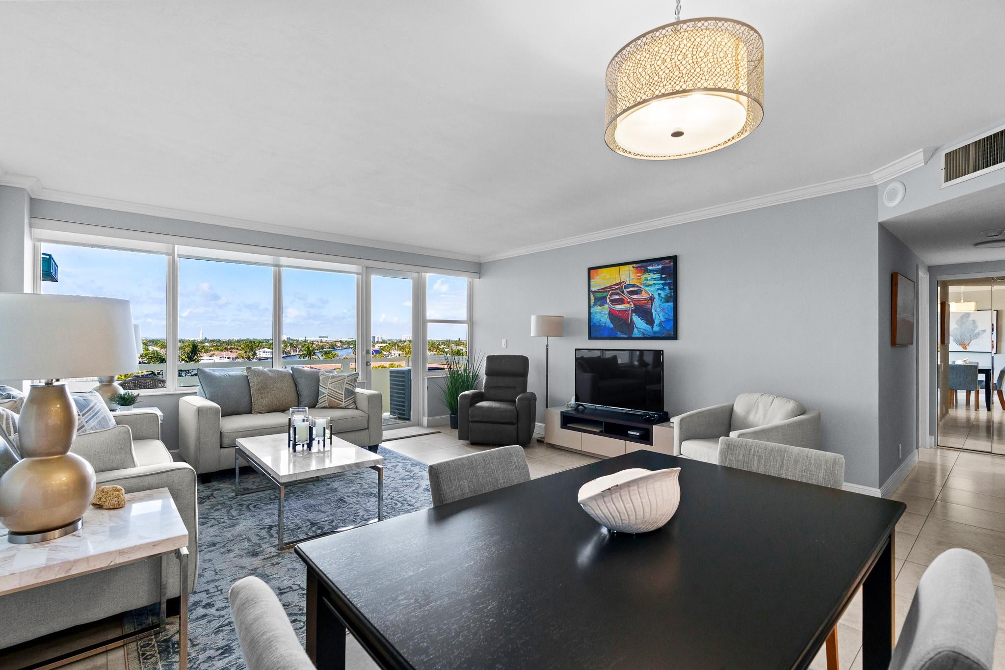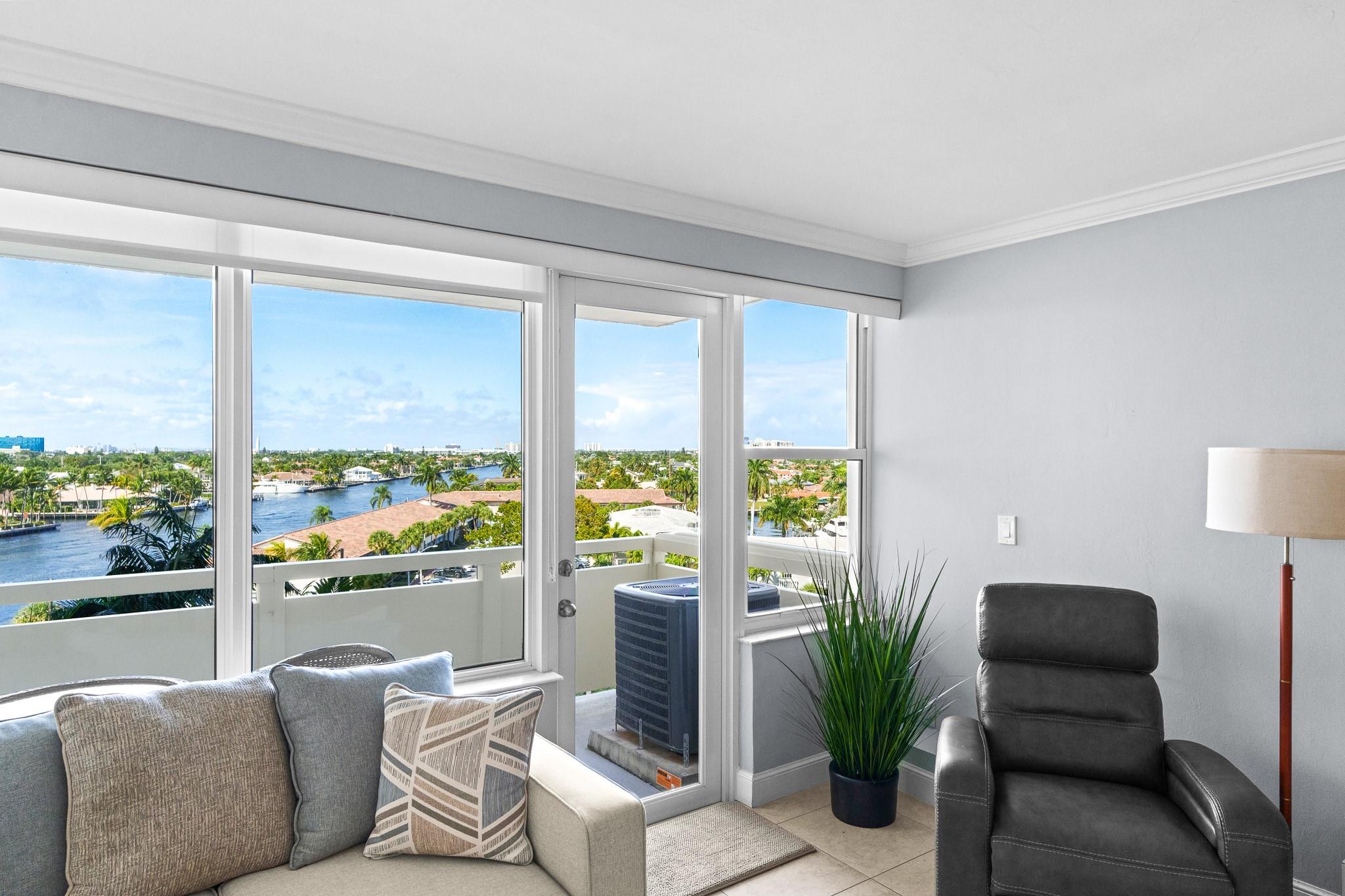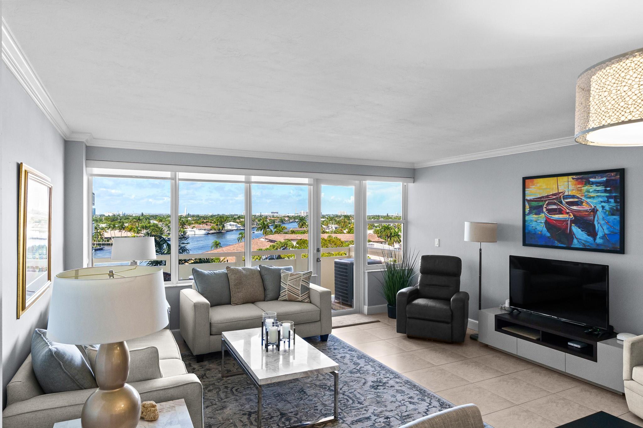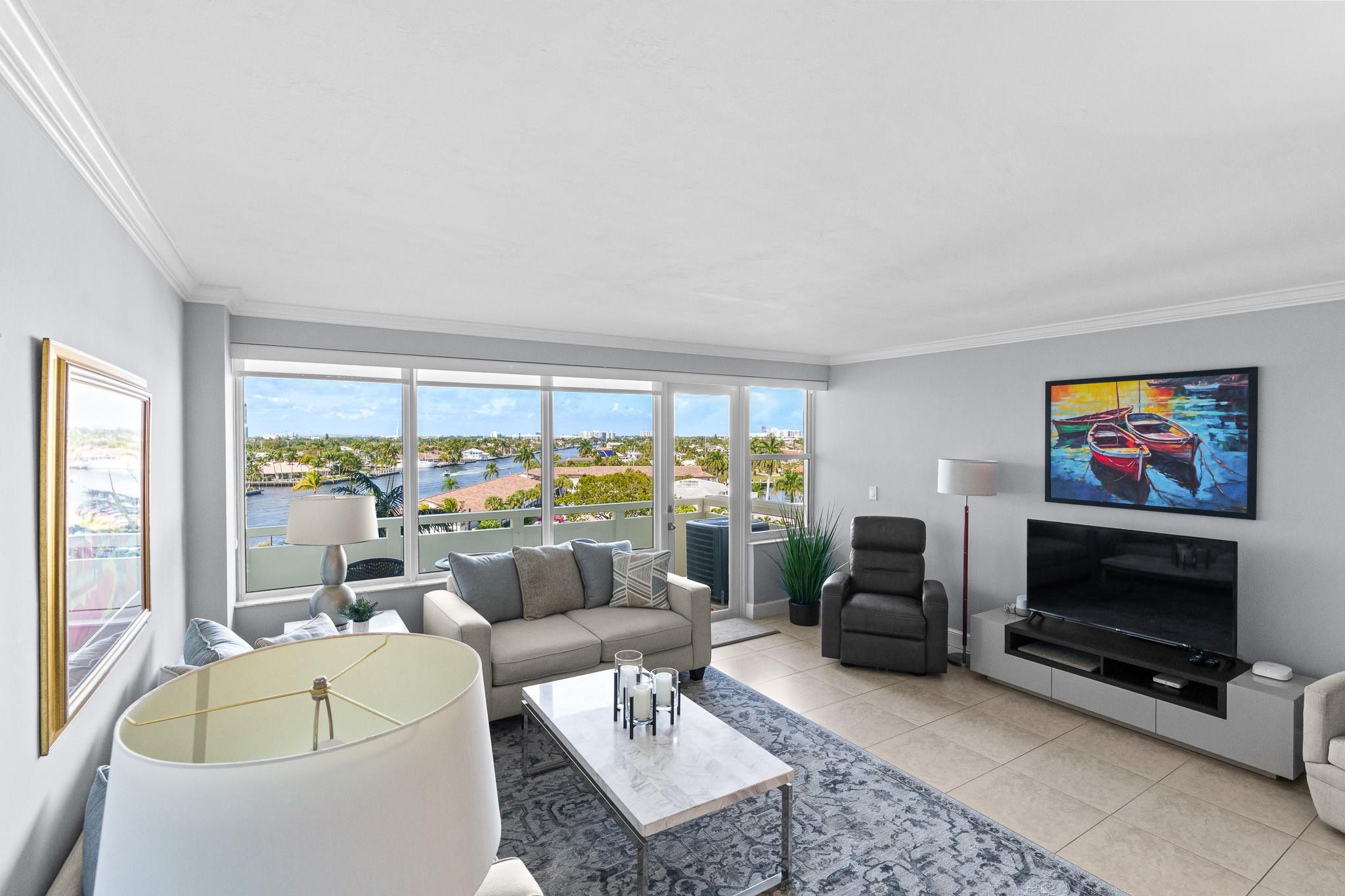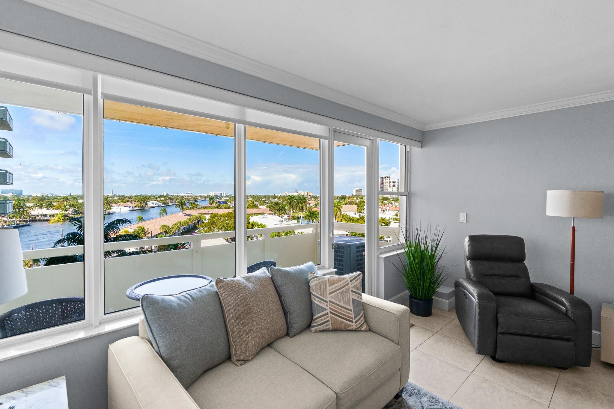 Turnkey and Beautifully Furnished With Intracoastal Views! This is the best value for a one bedroom apartment in Coral Ridge Towers North, a Co-op with fully funded reserves and no assessments. Enjoy breathtaking views of the Intracoastal from the living room, kitchen, bedroom & private balcony. This apartment is completely renovated from top to bottom with gorgeous porcelain tile floors throughout the living spaces. Open kitchen with new cabinetry, quartz countertops and stainless-steel appliances. Hurricane impact windows and central air conditioning. Relax & watch the boats pass by at the resort style pool & garden area located directly on the Intracoastal. Association states one Buyer must be 55, no rentals/pets. Coral Ridge Towers North is a fantastic value, you will love living here!