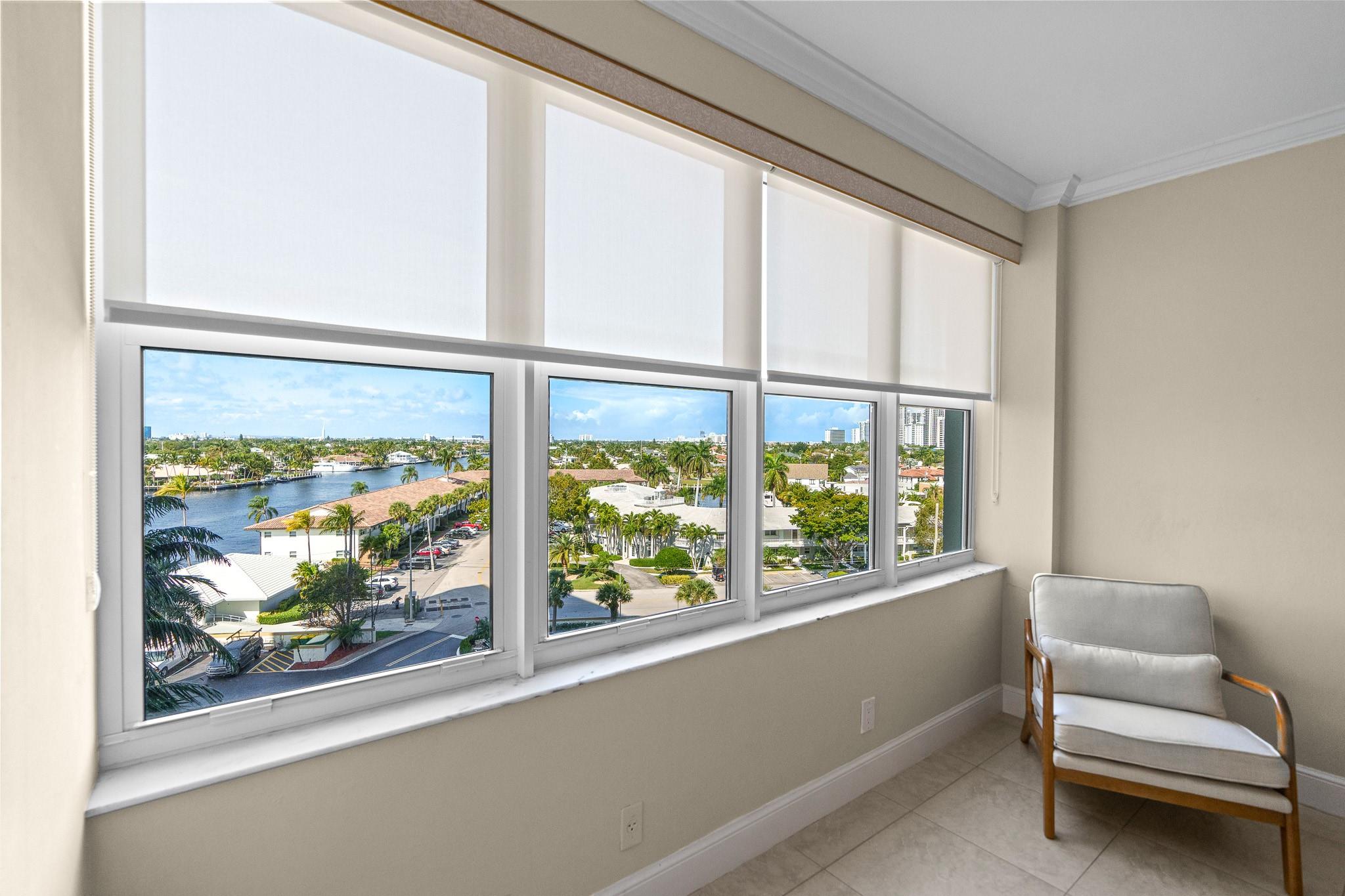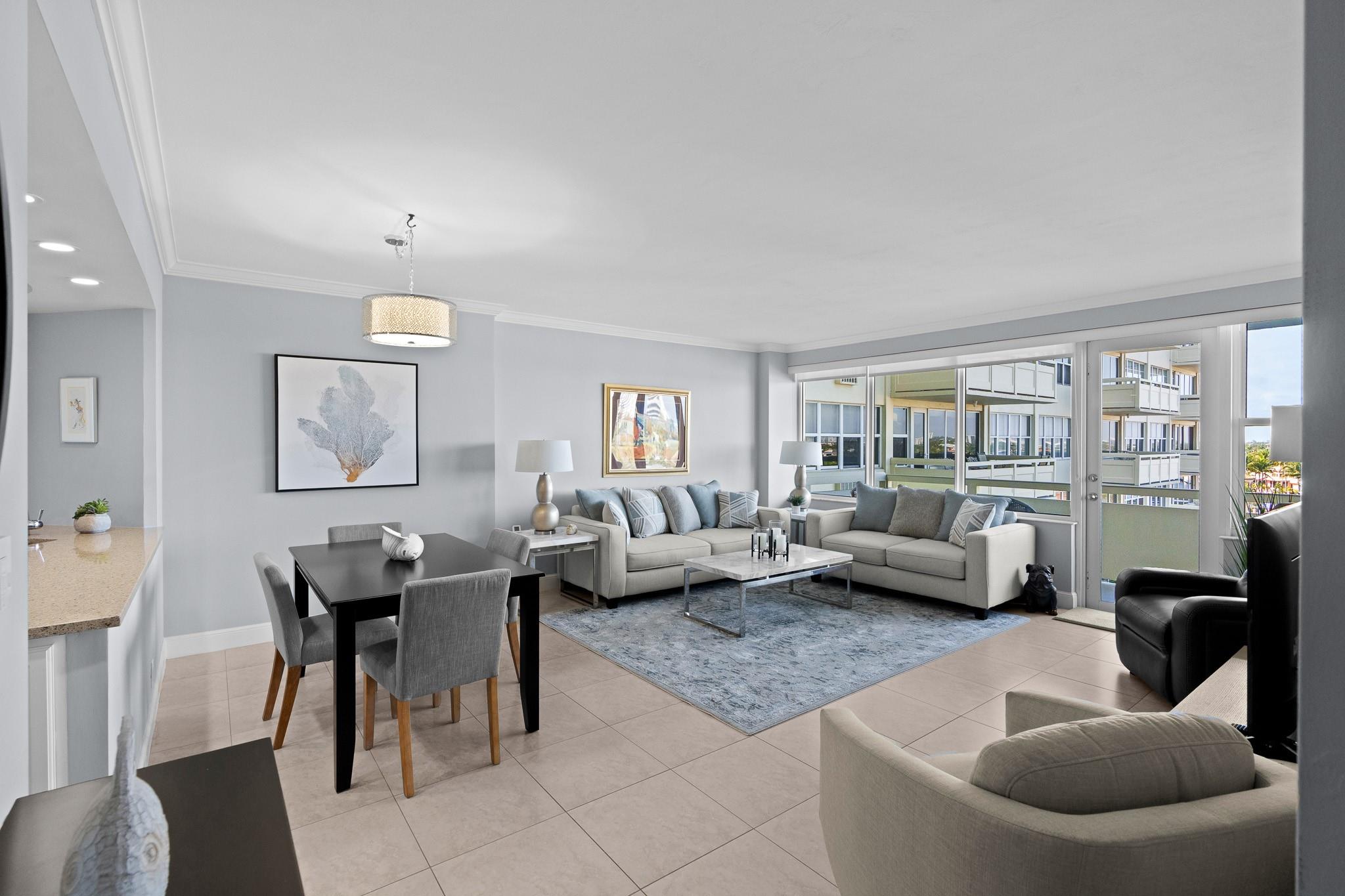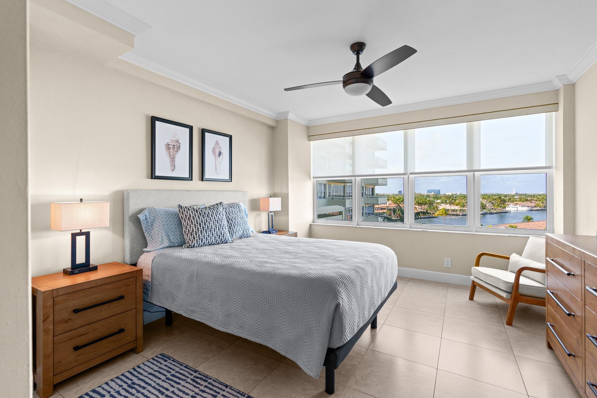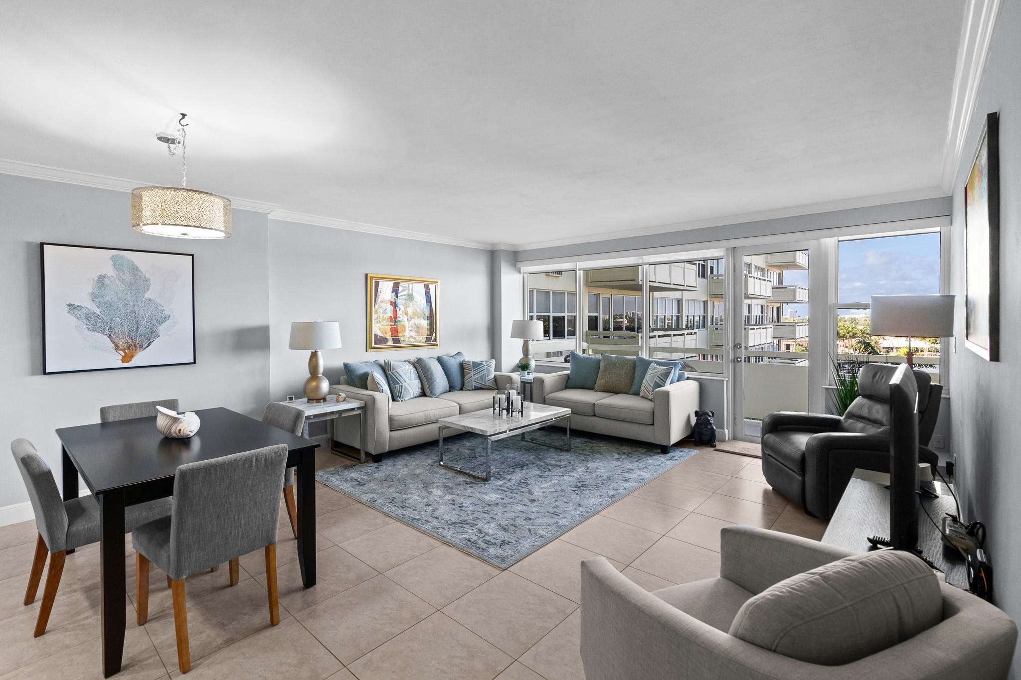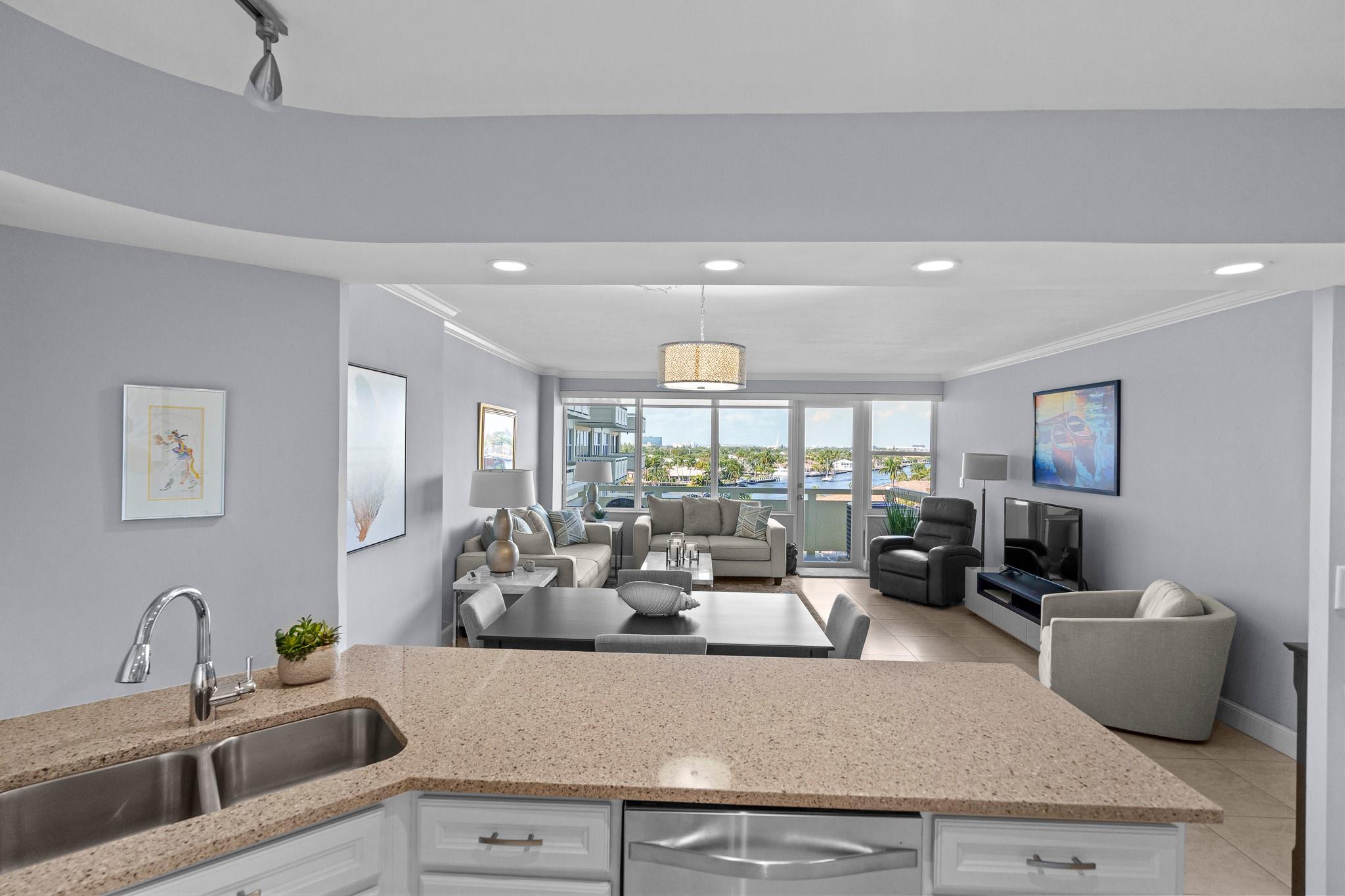 Turnkey and Beautifully Furnished With Intracoastal Views! This is the best value for a one bedroom apartment in Coral Ridge Towers North, a Co-op with fully funded reserves and no assessments. Enjoy breathtaking views of the Intracoastal from the living room, kitchen, bedroom & private balcony. This apartment is completely renovated from top to bottom with gorgeous porcelain tile floors throughout the living spaces. Open kitchen with new cabinetry, quartz countertops and stainless-steel appliances. Hurricane impact windows and central air conditioning. Relax & watch the boats pass by at the resort style pool & garden area located directly on the Intracoastal. Association states one Buyer must be 55, no rentals/pets. Coral Ridge Towers North is a fantastic value, you will love living here!