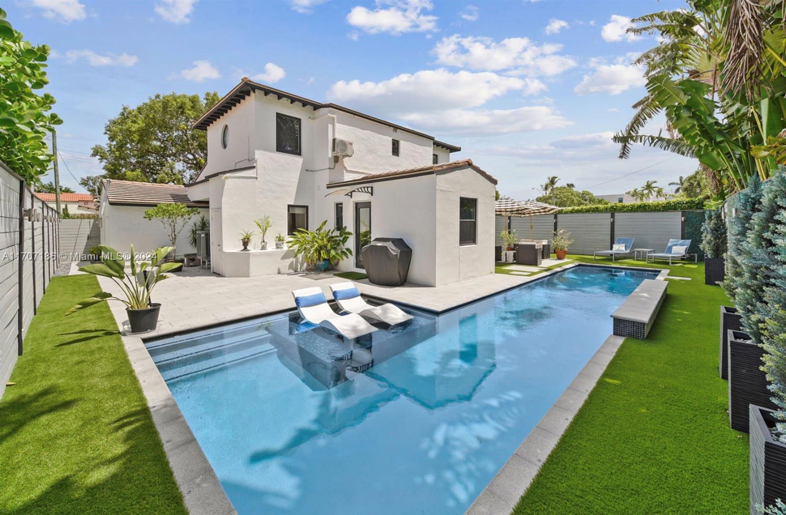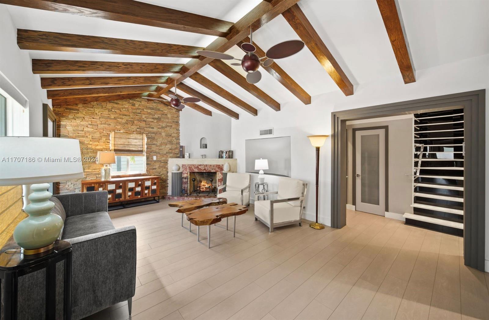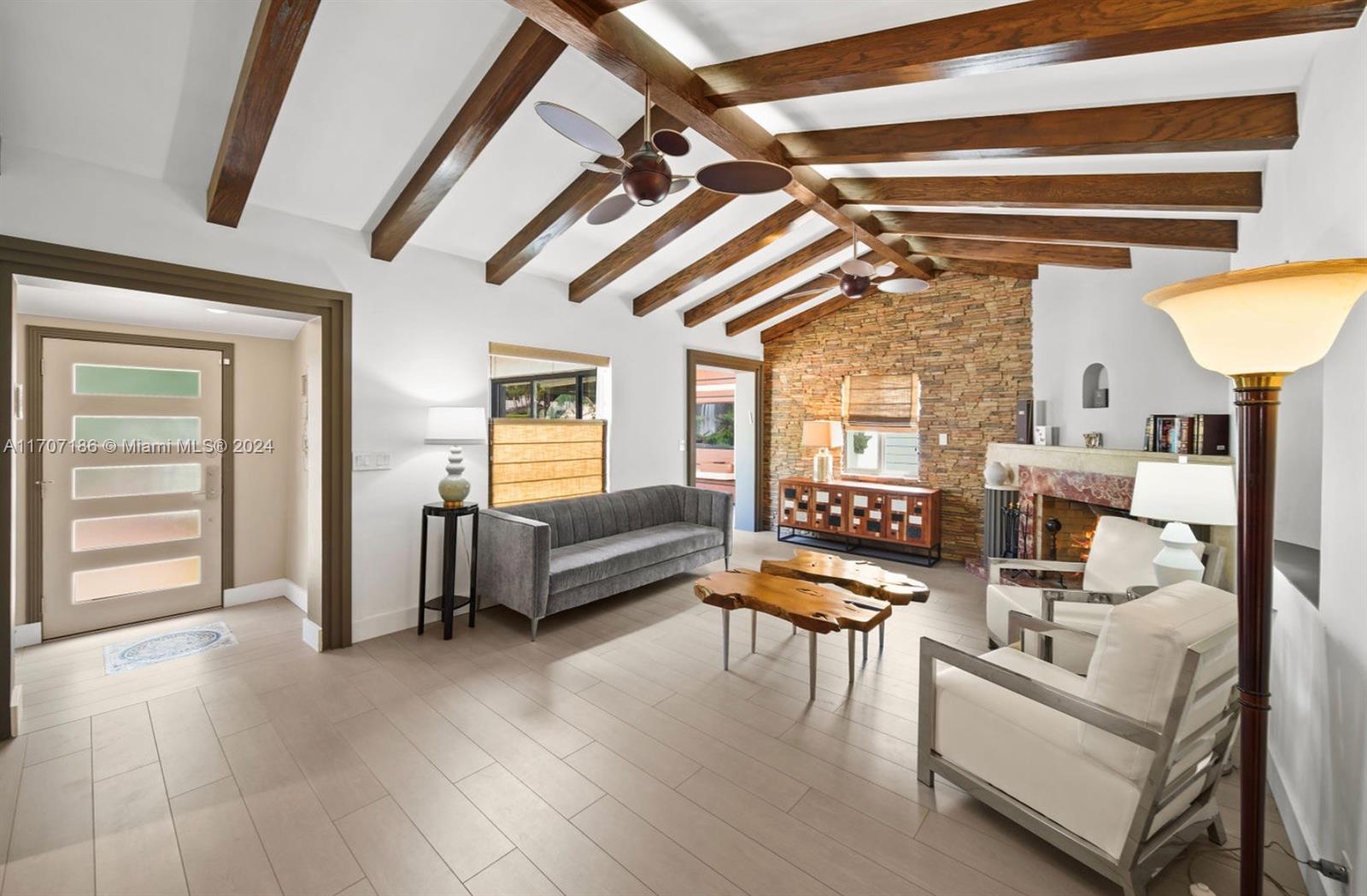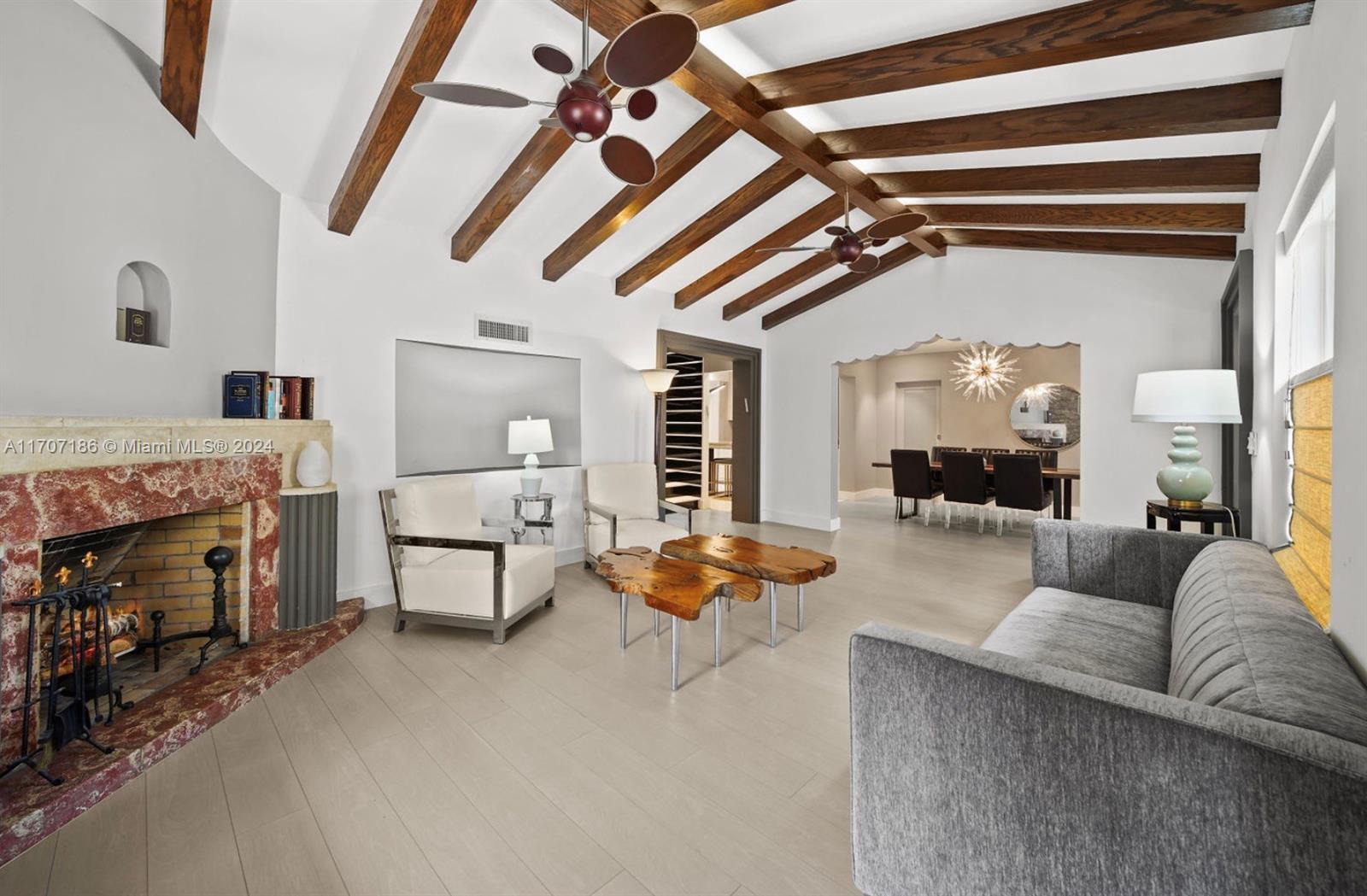 This stunning residence exudes timeless charm with modern enhancements. Thoughtfully designed interiors feature 11-foot wood-beam ceilings, a working original fireplace, impact windows and doors, and exquisite architectural details. The flexible floor plan includes 3 bedrooms + office, 3.5 bathrooms, a cozy sitting room with a bar, and a chef’s eat-in gas kitchen equipped with a wine cooler, quartz island, and ample cabinetry. Step outside to your private, newly landscaped backyard oasis with turf, a spacious patio, and a spectacular 42-foot heated saltwater lap pool with a waterfall, sun shelf, and built-in chaise lounge chairs—perfect for entertaining or relaxing in style. The property boasts a circular driveway and 1-car garage. Live the Miami Beach lifestyle in this rare gem!