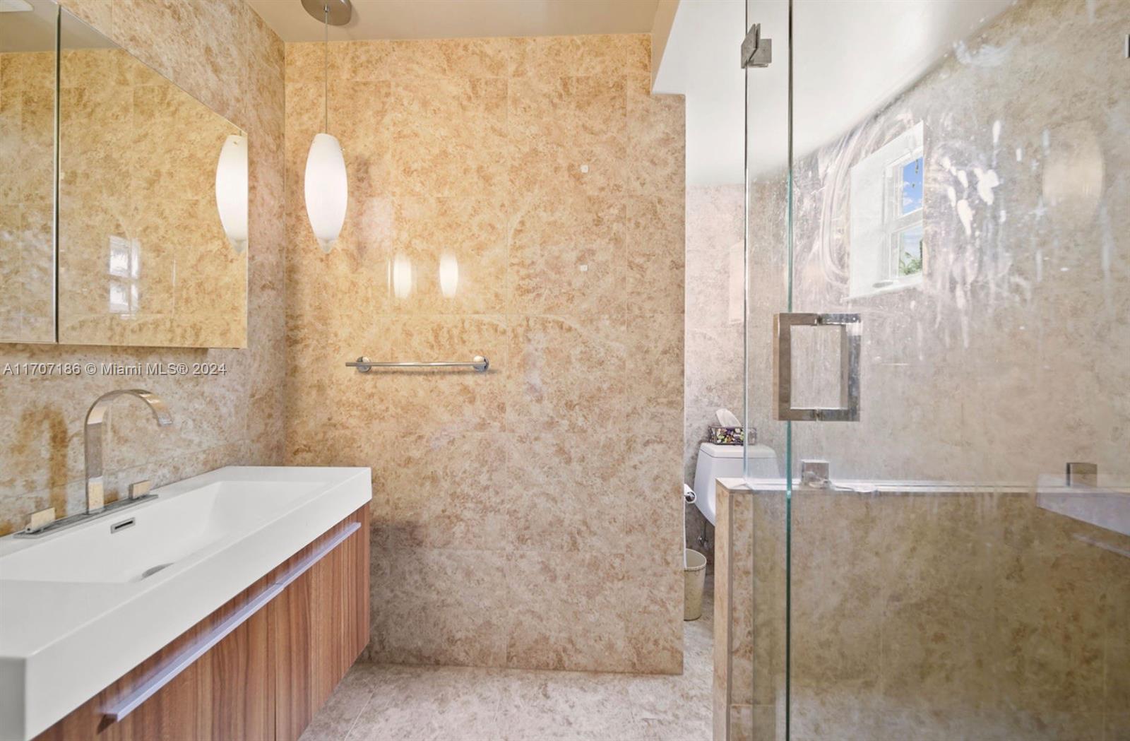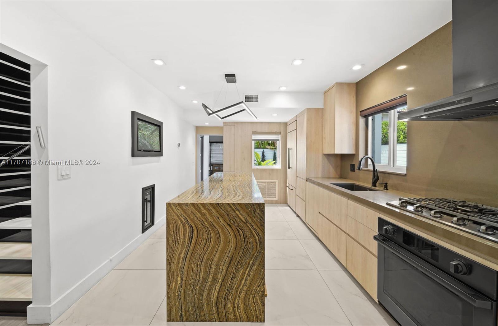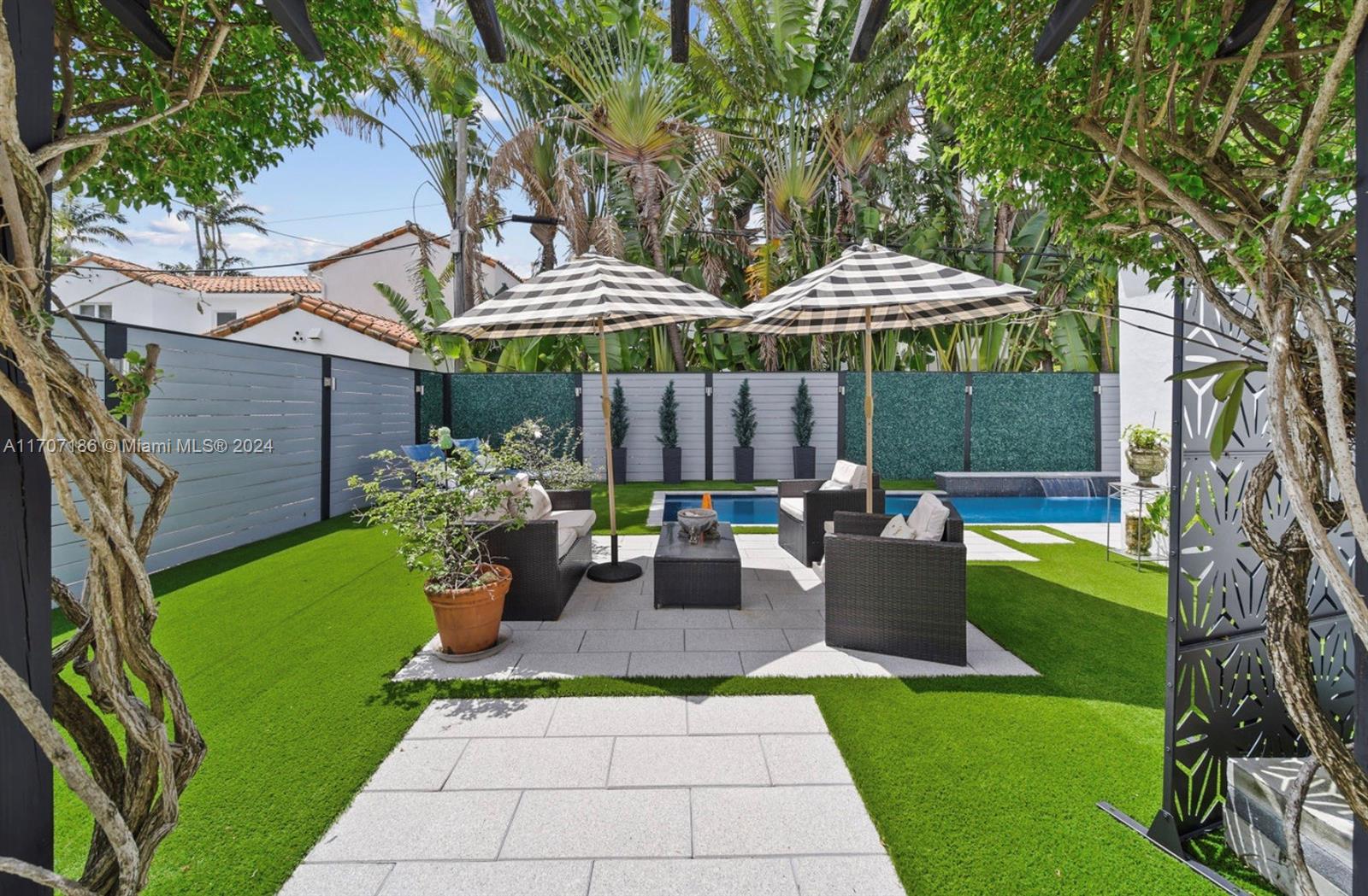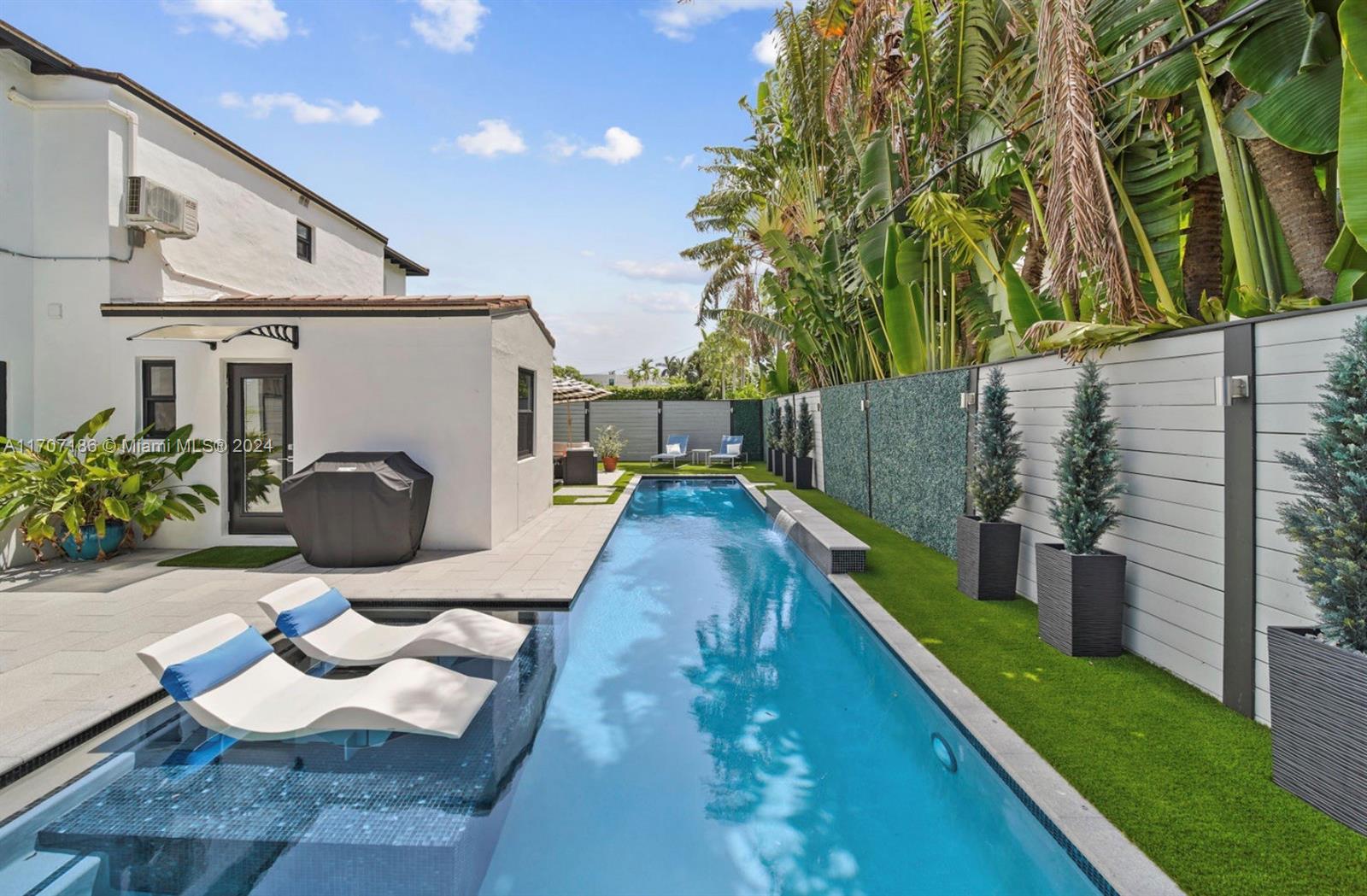 This stunning residence exudes timeless charm with modern enhancements. Thoughtfully designed interiors feature 11-foot wood-beam ceilings, a working original fireplace, impact windows and doors, and exquisite architectural details. The flexible floor plan includes 3 bedrooms + office, 3.5 bathrooms, a cozy sitting room with a bar, and a chef’s eat-in gas kitchen equipped with a wine cooler, quartz island, and ample cabinetry. Step outside to your private, newly landscaped backyard oasis with turf, a spacious patio, and a spectacular 42-foot heated saltwater lap pool with a waterfall, sun shelf, and built-in chaise lounge chairs—perfect for entertaining or relaxing in style. The property boasts a circular driveway and 1-car garage. Live the Miami Beach lifestyle in this rare gem!