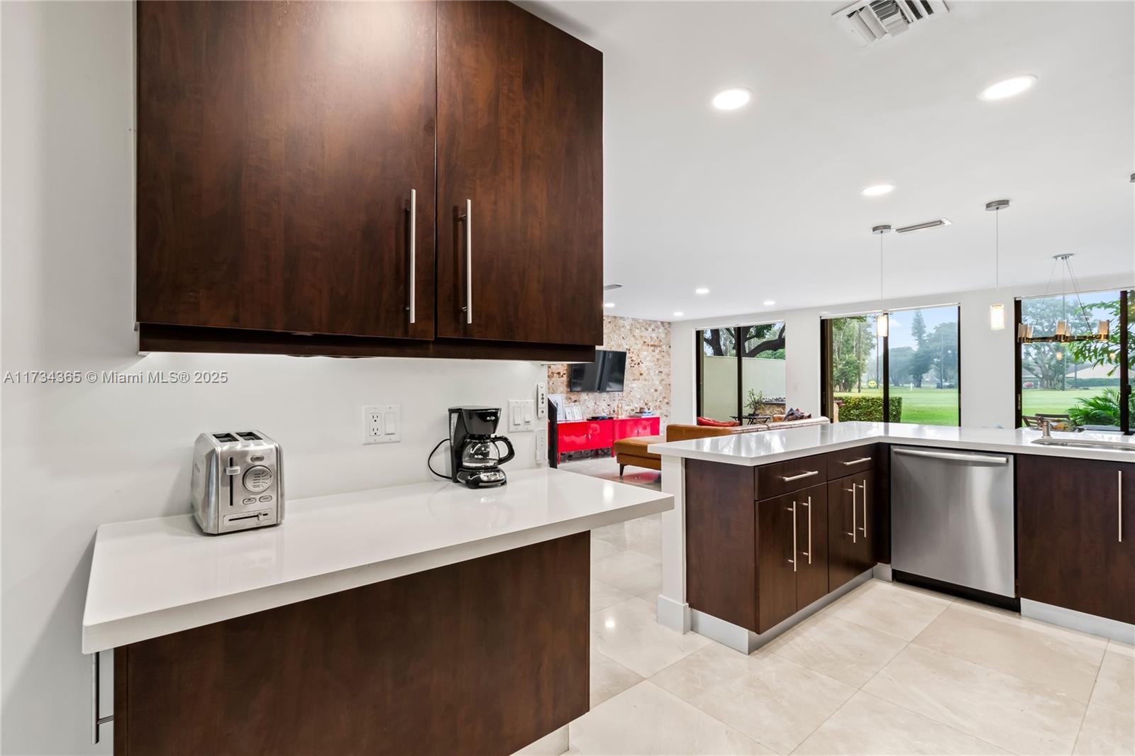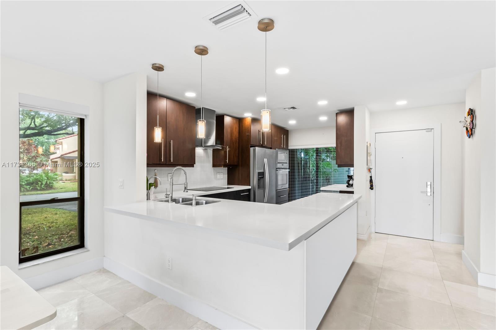 Beautiful, renovated, corner townhouse with 3 beds and 2 1/2 baths located in the desired Costa del Sol Doral. Large kitchen with quartz counter and stainless appliances. Open and spacious living and dining room with electric blinds and view to patio and golf course. Marble on first floor and laminate on second. Wood stairs. Modern bathrooms. Blackout in all bedrooms. Custom closets. Paved patio with custom-built barbecue area. Designer landscaping. Tons of light in all rooms and views to golf course/garden. Accordion Shutters. Tankless water heater and new water purifier. Plenty of parking (garage, front, and side for guests). Electric car charger. Gated community, security, golf course, clubhouse. Closed to MIA airport, A schools, Publix, Whole Foods, 826,Turnpike, City Place, and more.