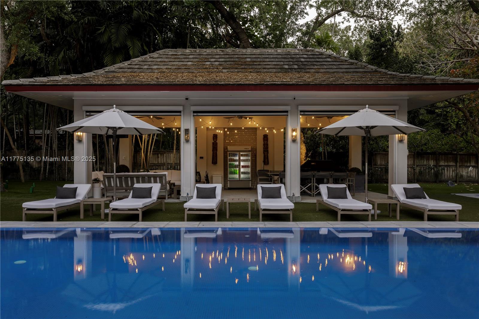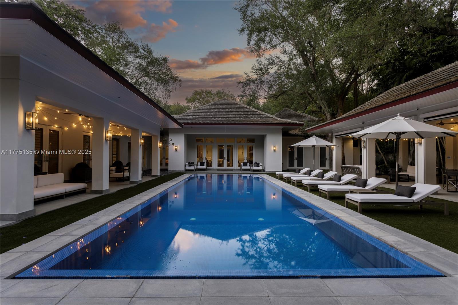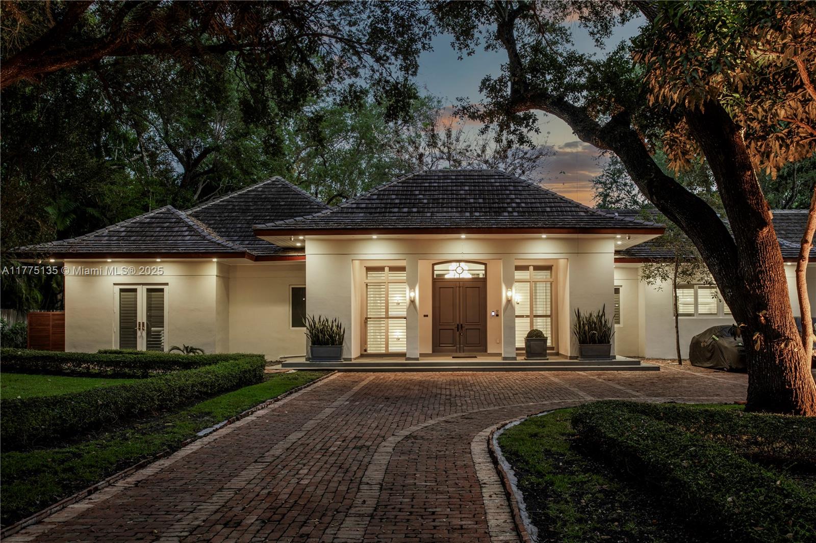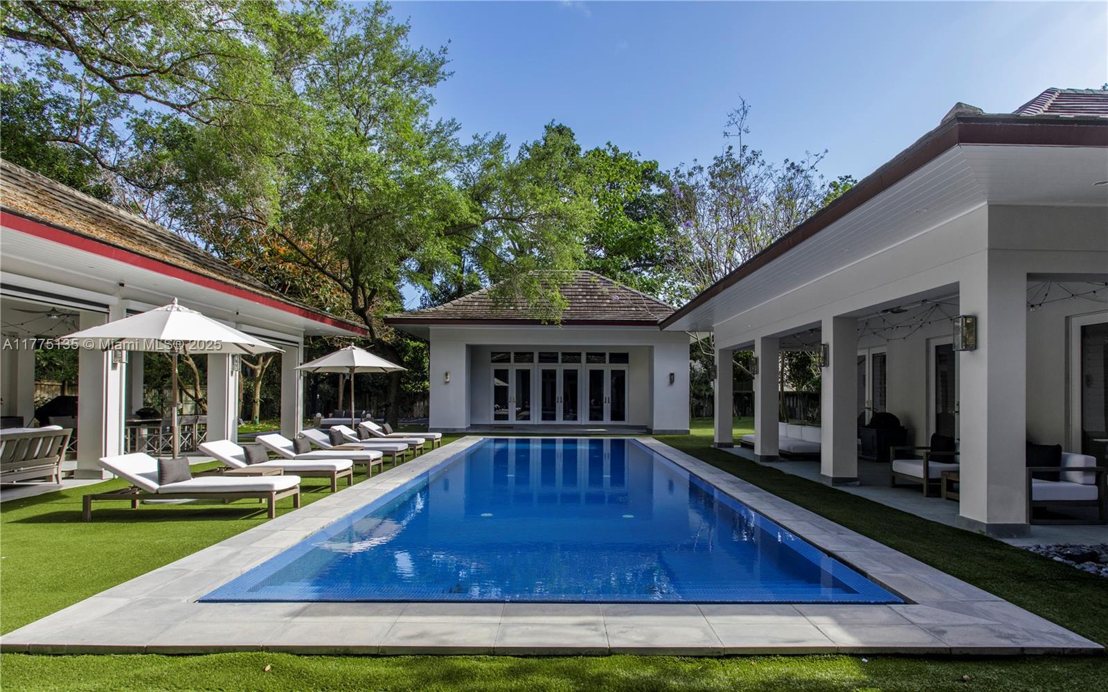 Thoughtfully designed one-story estate spanning 9,323 SF of refined interior living space, gracefully set on 1.1 acres in the prestigious enclave of South Coconut Grove. Residence blends elegance with cutting-edge technology, including a Smart Home Automation System, whole-home generator, custom lighting, wood flooring, and a comprehensive security system. Boasting soaring 12' ceilings, dual primary suites complete with a private living room and office. Living and entertaining areas include a formal dining room, great room, and stunning Poliform chef’s kitchen with gas cooking, Miele, Wolf & Sub-Zero appliances. The outdoor oasis offers an infinity-edge pool, Jacuzzi, volleyball court, covered dining terrace, a separate guest house currently used as a gym, and a 4-car garage.