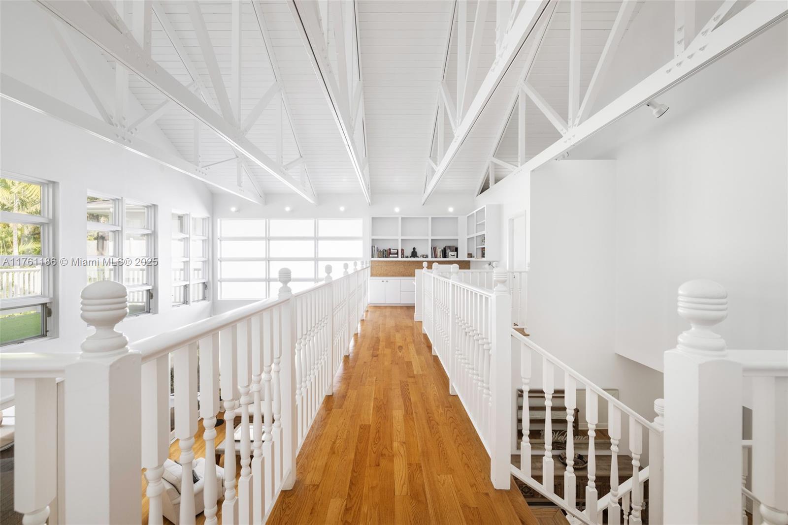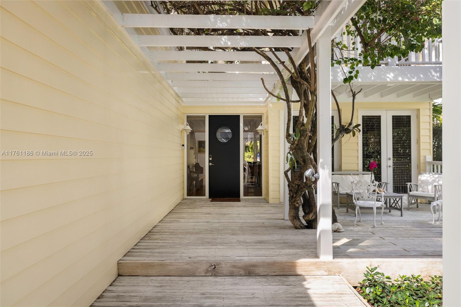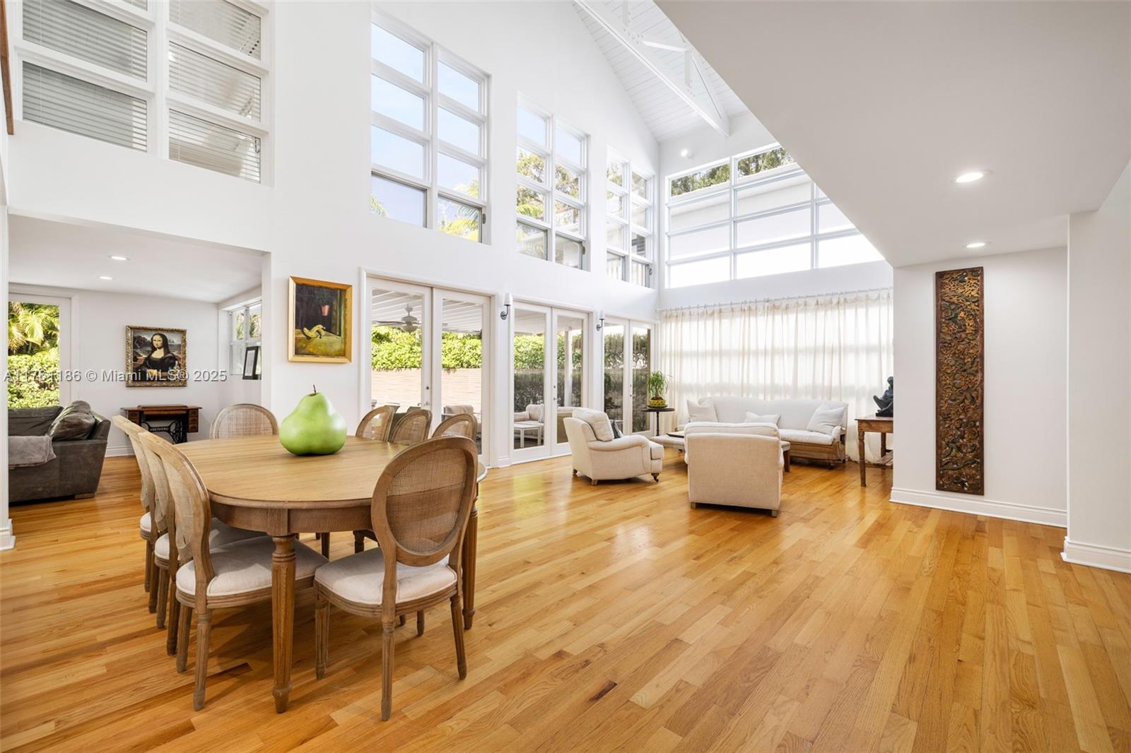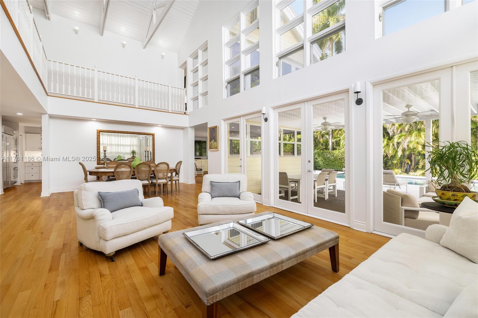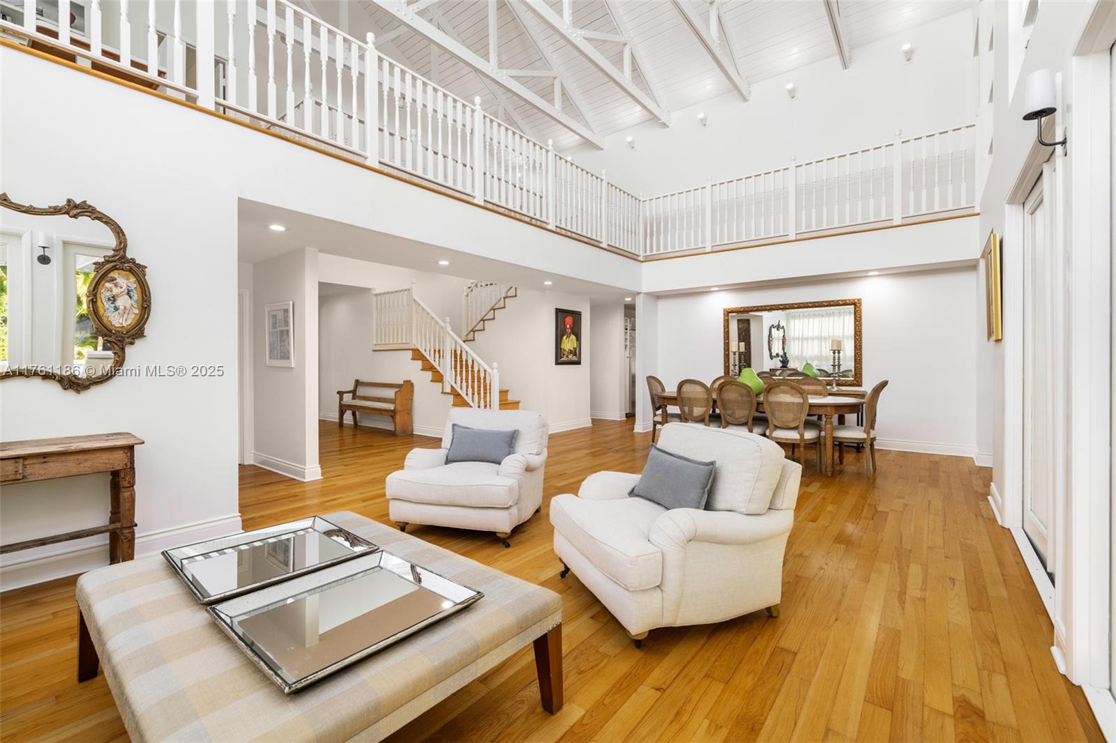 Captivating Key West style home on a coveted tree-canopied street in prestigious North Coconut Grove. Custom built w/ attention to detail and luxury fixtures & finishes throughout. Breathtaking, light-filled living spaces feature soaring, 29-foot+ vaulted, wood-beamed ceilings. Expansive eat-in kitchen & adjacent family room w/ banks of French doors opening to a deep covered terrace. Oversized primary suite is the ultimate retreat & offers private balcony with tree-top views. Experience year-round outdoor living & entertaining around the heated Saltwater pool & sundeck surrounded by lush tropical landscaping. Situated high on a coastal coral rock ridge, one of the highest sea-level elevations in South Florida.