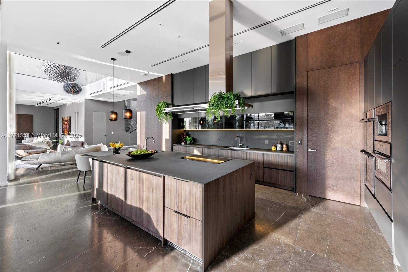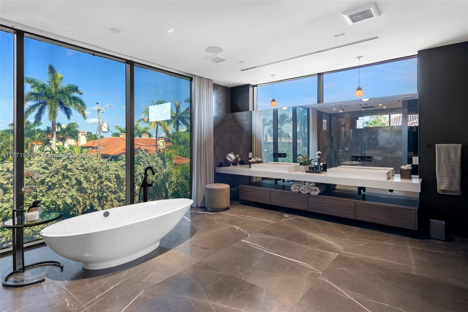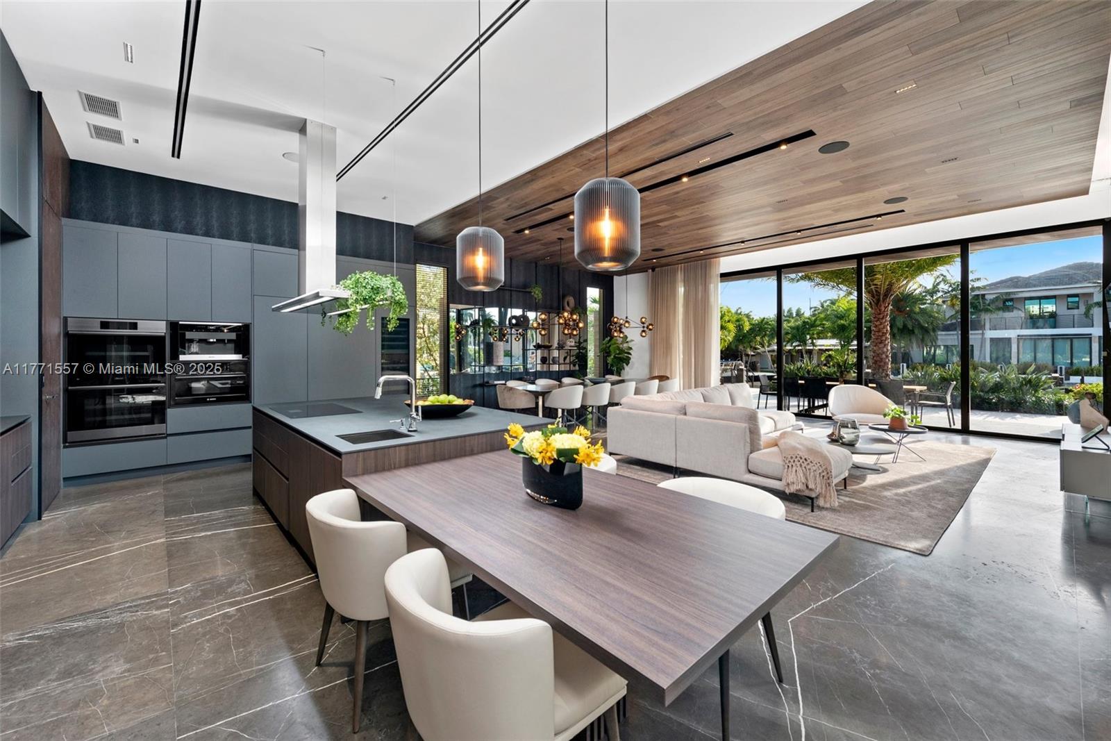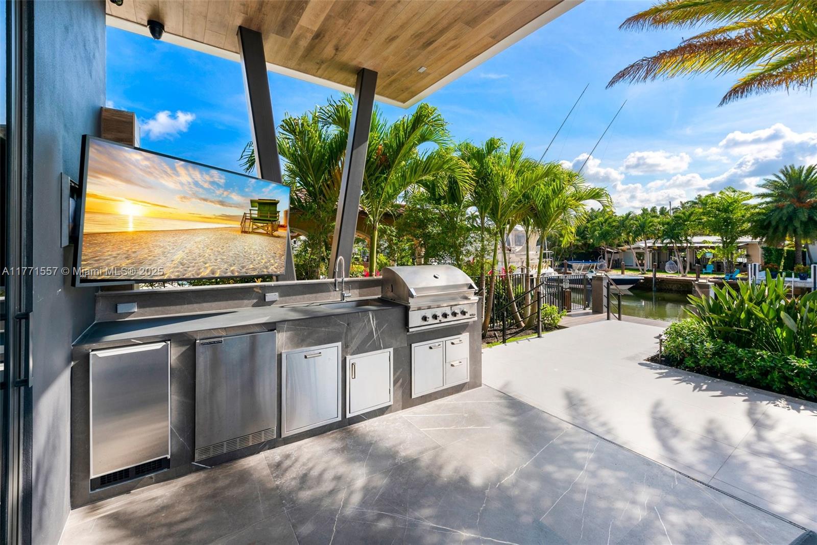 Masterfully crafted, this modern waterfront estate in Las Olas Isles showcases elegant architectural design. Offering 5 beds & 6.5 baths, this private oasis with dramatic soaring ceilings spans 6,619 SF of luxurious living space w/ 100' on the water. Natural light pours through floor-to-ceiling windows & sliding glass doors creating a bright & airy living area, wet bar, & chef's kitchen with pro-grade appliances and large pantry. This contemporary estate is made for entertaining w/ an expansive covered outdoor dining & living area, summer kitchen, heated saltwater pool, sauna, and private dock. The oversized primary suite features a spa bath, custom closets, & panoramic water views. Highlights include full home generators, elevator, Savant smart home, 3 car garage w/ 2 lifts & EV chargers.