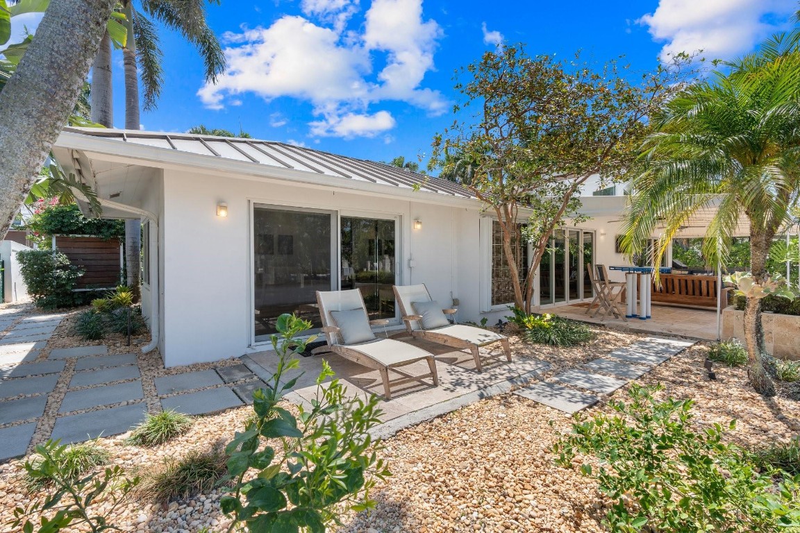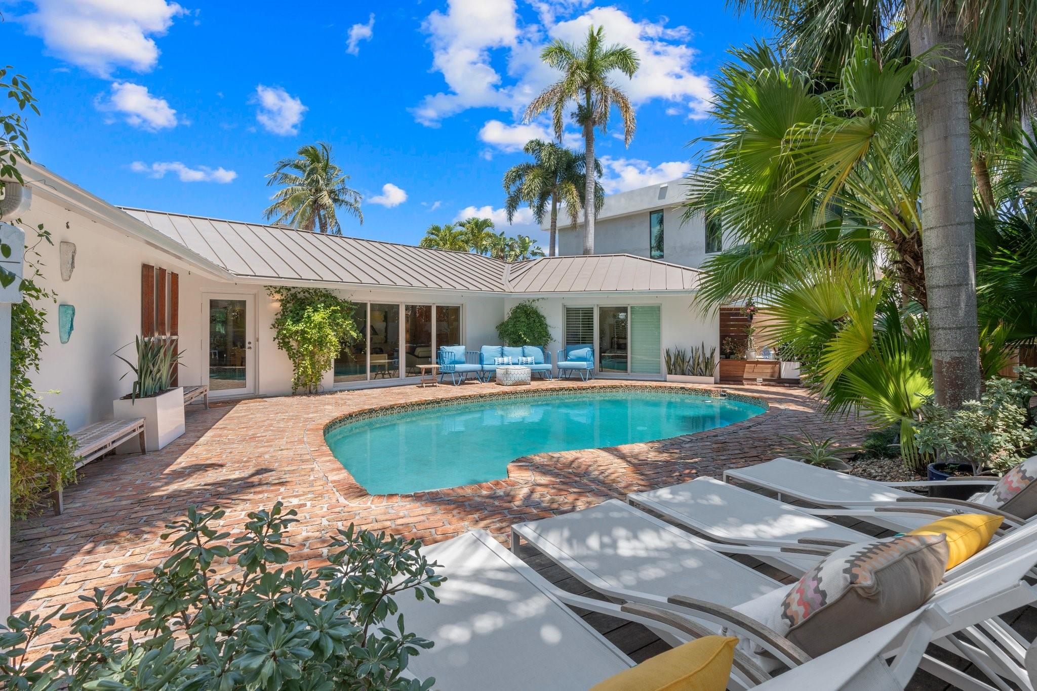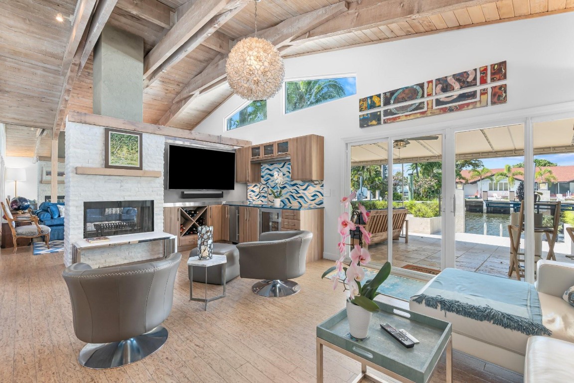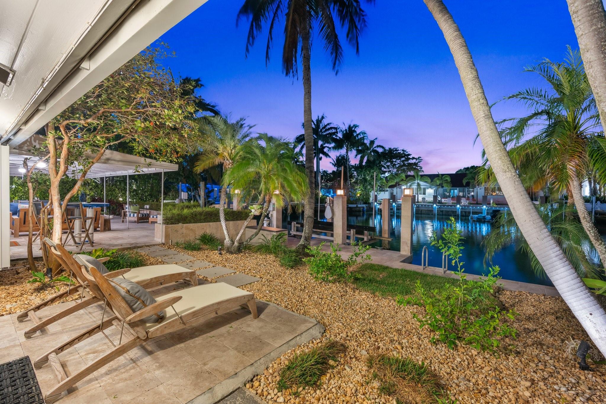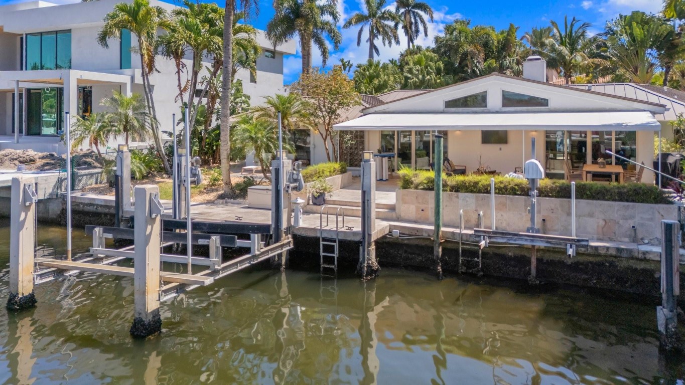 This Hidden Gem Combines A Very Private Pool w/no Fixed Bridges To The Ocean In A Lush Tropical Setting. A 3 Bed, 2 1/2 Bath, 2-Car Garage Home w/ Gorgeous Restored Terrazzo Floors, Hi-End Appliances, Beautiful Countertops & Backsplashes Adorn The Very Cool Mid-Century Kitchen, w/ Coffee Station, Pantry & Lunch Bar. The Floor Plan Has The Flow Of A Modern, Open Plan w/ Defined Spaces For Dining, Entertaining, Home Office/Den, Wet Bar/Media Room w/ 2-Sided Fireplace, AND VAULTED CEILINGS! Plus 600sf Covered Outdoor Space. Dock w/ Power, Water, 12,000 lb Boat Lift. Separate Irrigation Meter, Separate Garage Mini-Split A/C, New Roof 2020, New A/C 2022, New Ducts In 2024. Tropical, Beautiful, Complete. This Home Is Move In Condition For Your Most Particular & Interesting Clients.