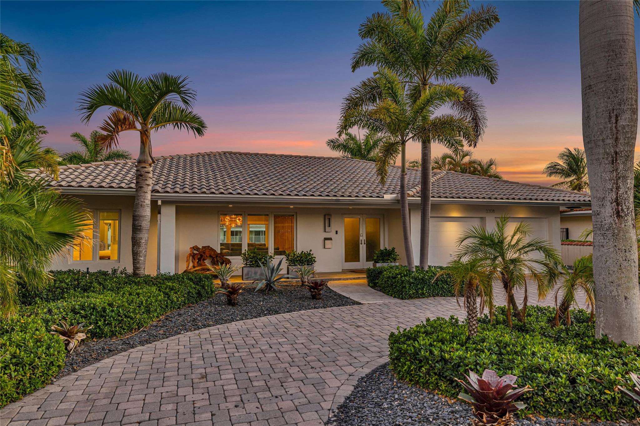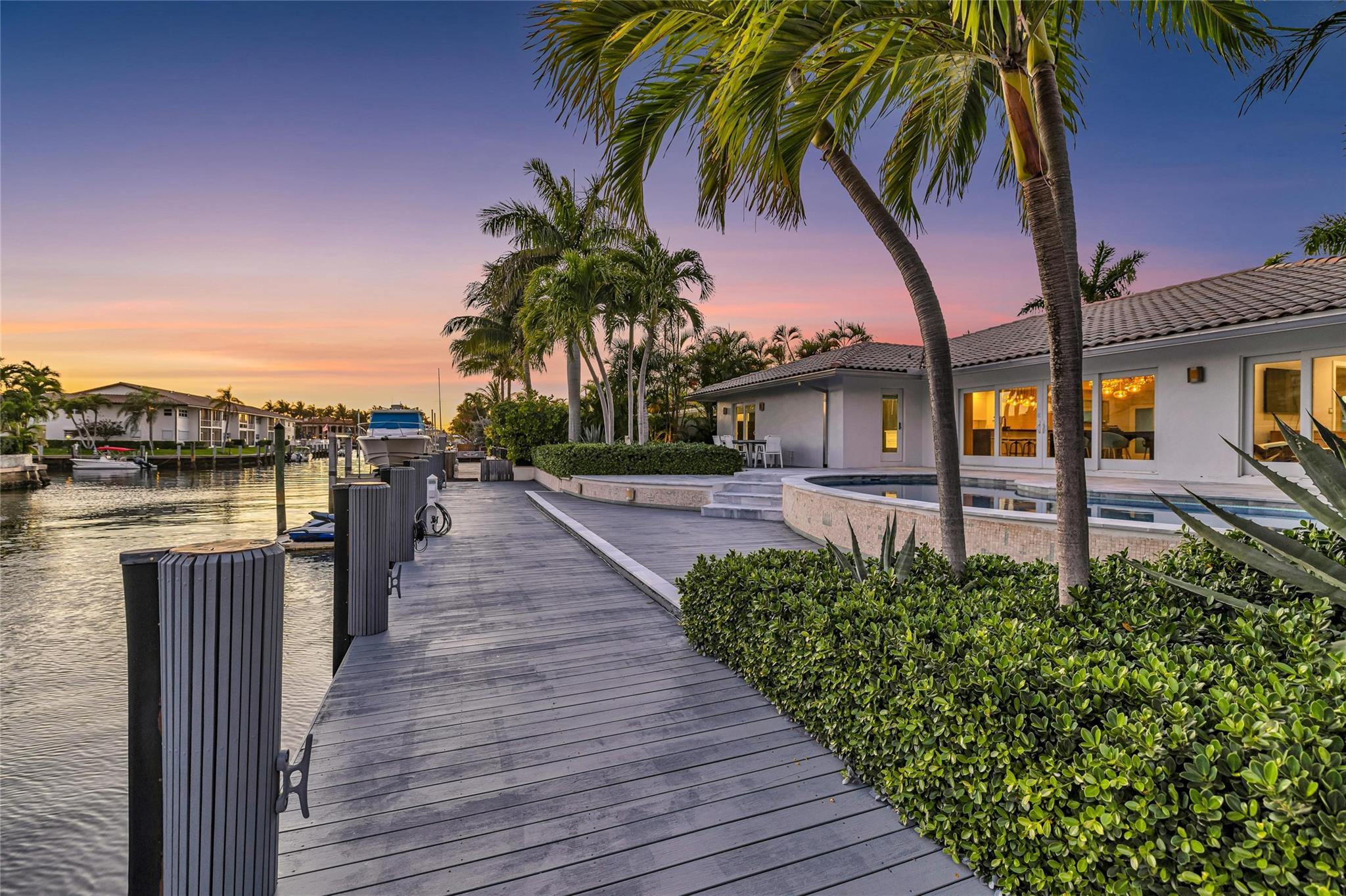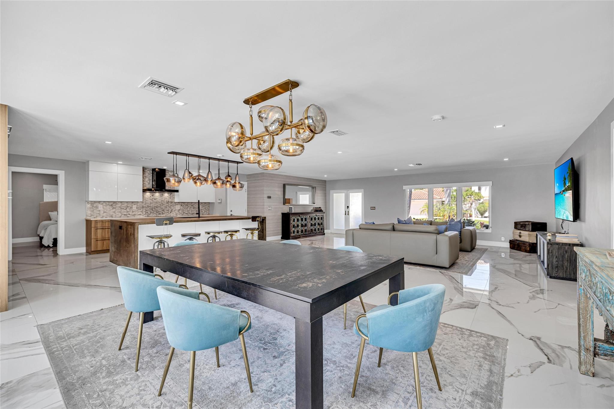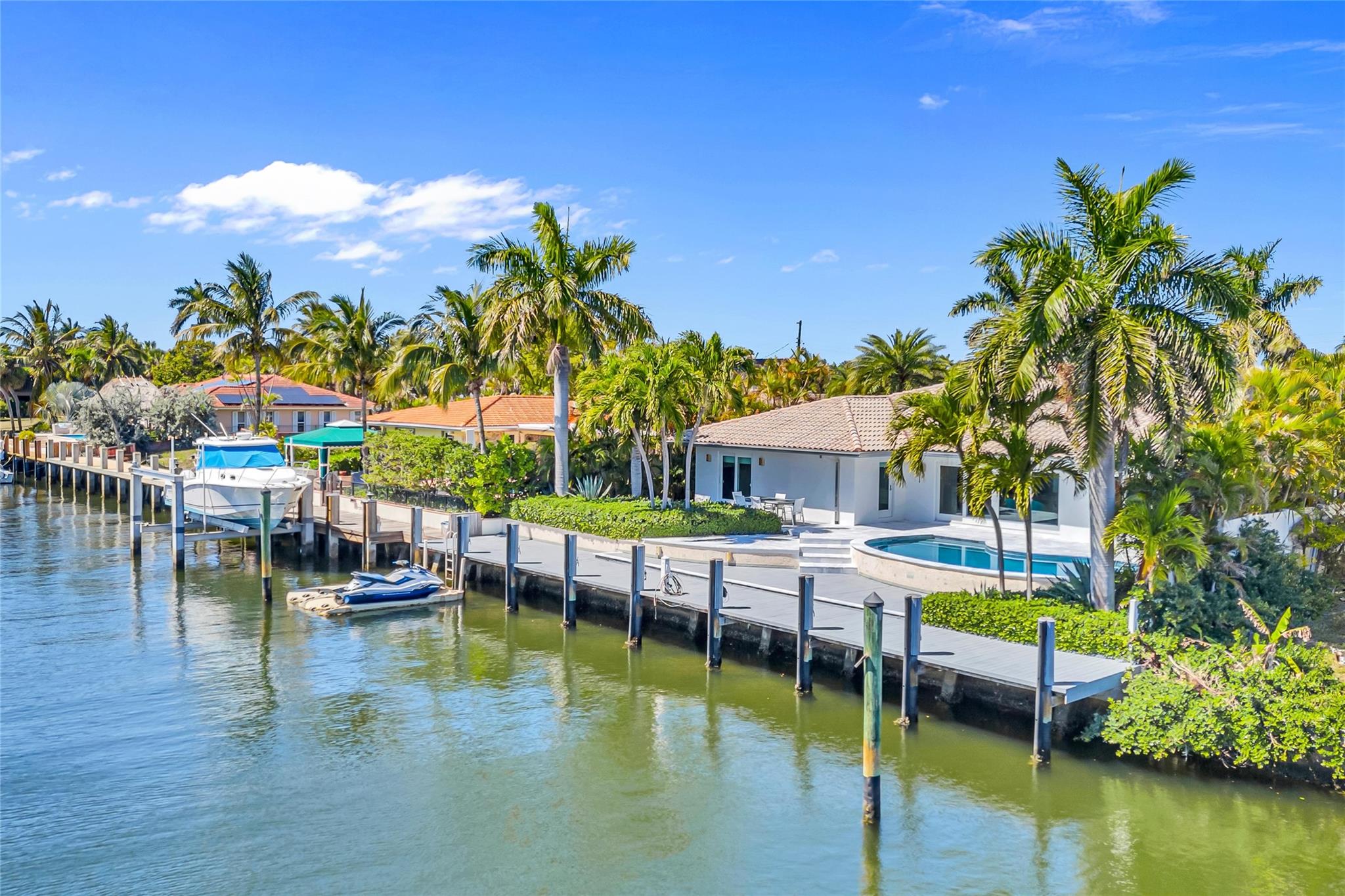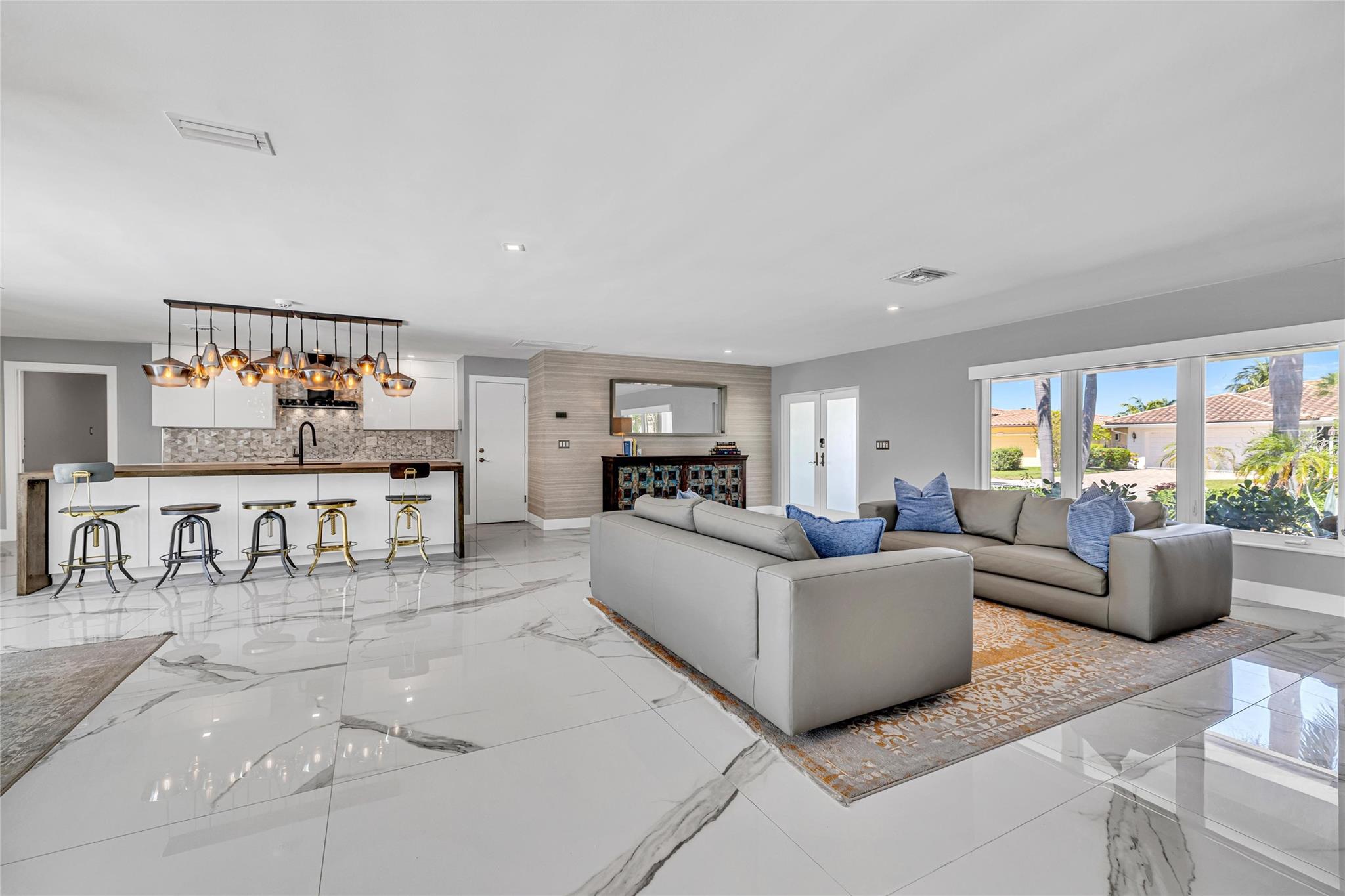 Outstanding waterfront home blocks to the beach in gated Bermuda Riviera. Modern interiors blend seamlessly with the outdoors through wide, sliding glass to a tiered patio and dock surrounding the pool. Designed for entertaining, the kitchen features a long center island, modern appliances and ample storage. The split plan allows each bedroom to enjoy privacy. The primary suite is a quiet retreat with sliders out to the pool, a massive walk-in closet and a 13 x 18 foot bathroom featuring a multi-spray shower. All three baths are updated in modern finishes. 16 foot squares of porcelain flooring is consistent throughout the house. The oversized garage has twin bays with extra wide doors. Multiple dining and shopping options are located within minutes of the property. Home Warranty Included