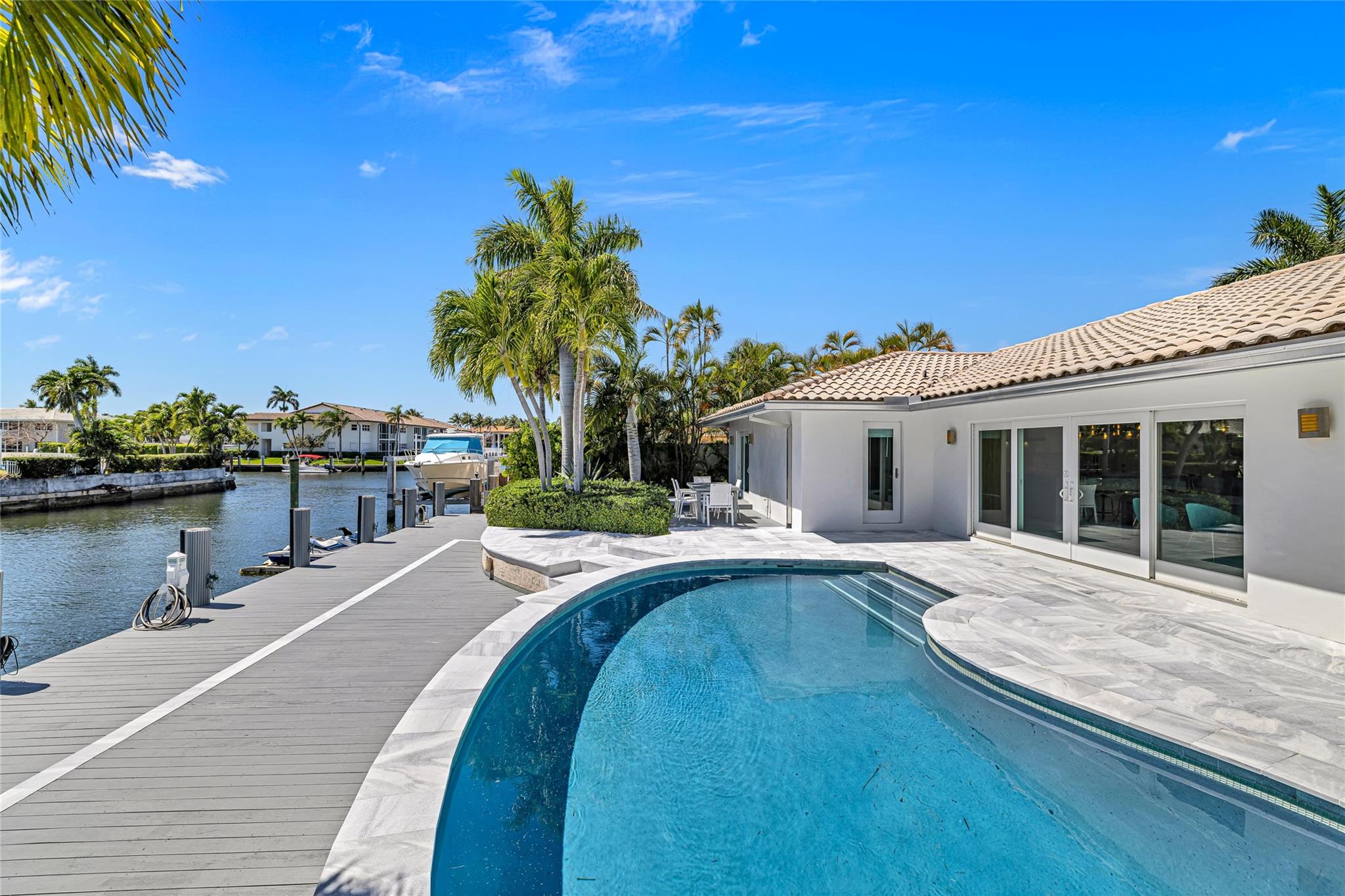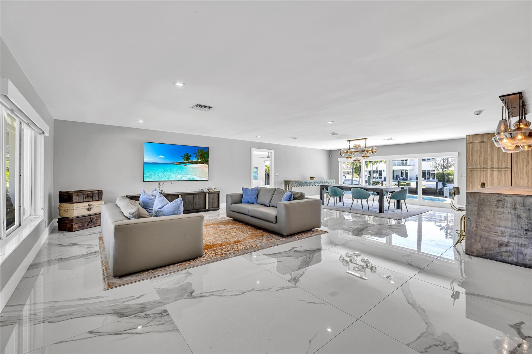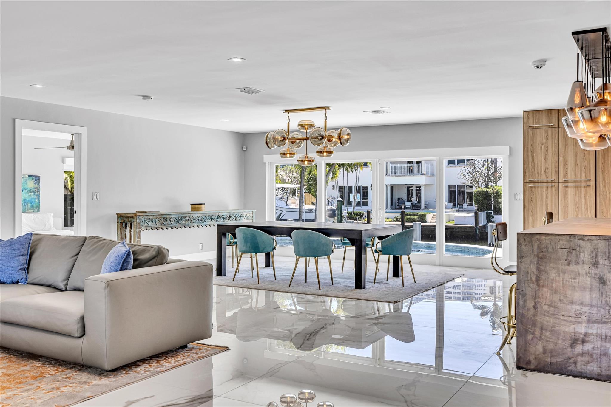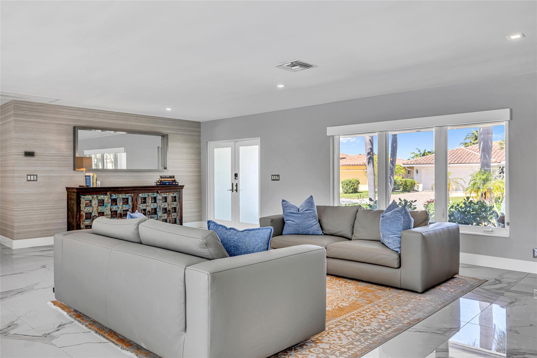 Outstanding waterfront home blocks to the beach in gated Bermuda Riviera. Modern interiors blend seamlessly with the outdoors through wide, sliding glass to a tiered patio and dock surrounding the pool. Designed for entertaining, the kitchen features a long center island, modern appliances and ample storage. The split plan allows each bedroom to enjoy privacy. The primary suite is a quiet retreat with sliders out to the pool, a massive walk-in closet and a 13 x 18 foot bathroom featuring a multi-spray shower. All three baths are updated in modern finishes. 16 foot squares of porcelain flooring is consistent throughout the house. The oversized garage has twin bays with extra wide doors. Multiple dining and shopping options are located within minutes of the property. Home Warranty Included