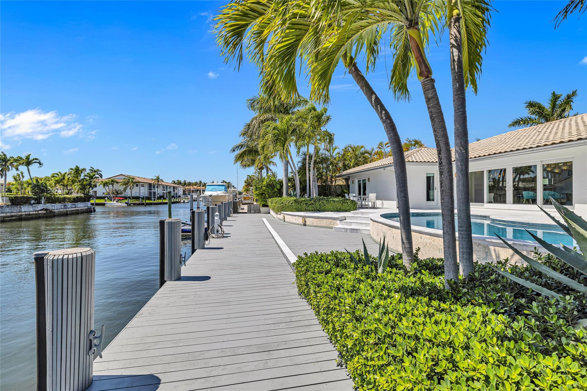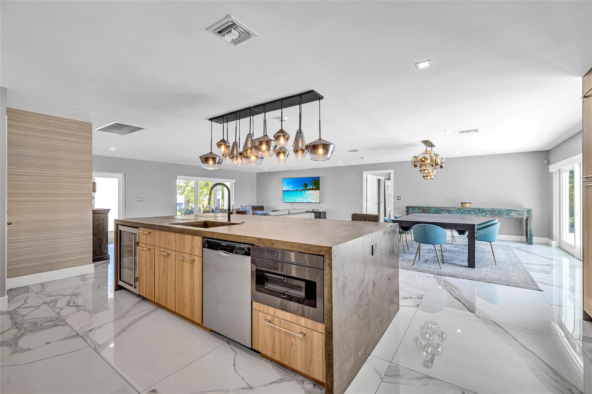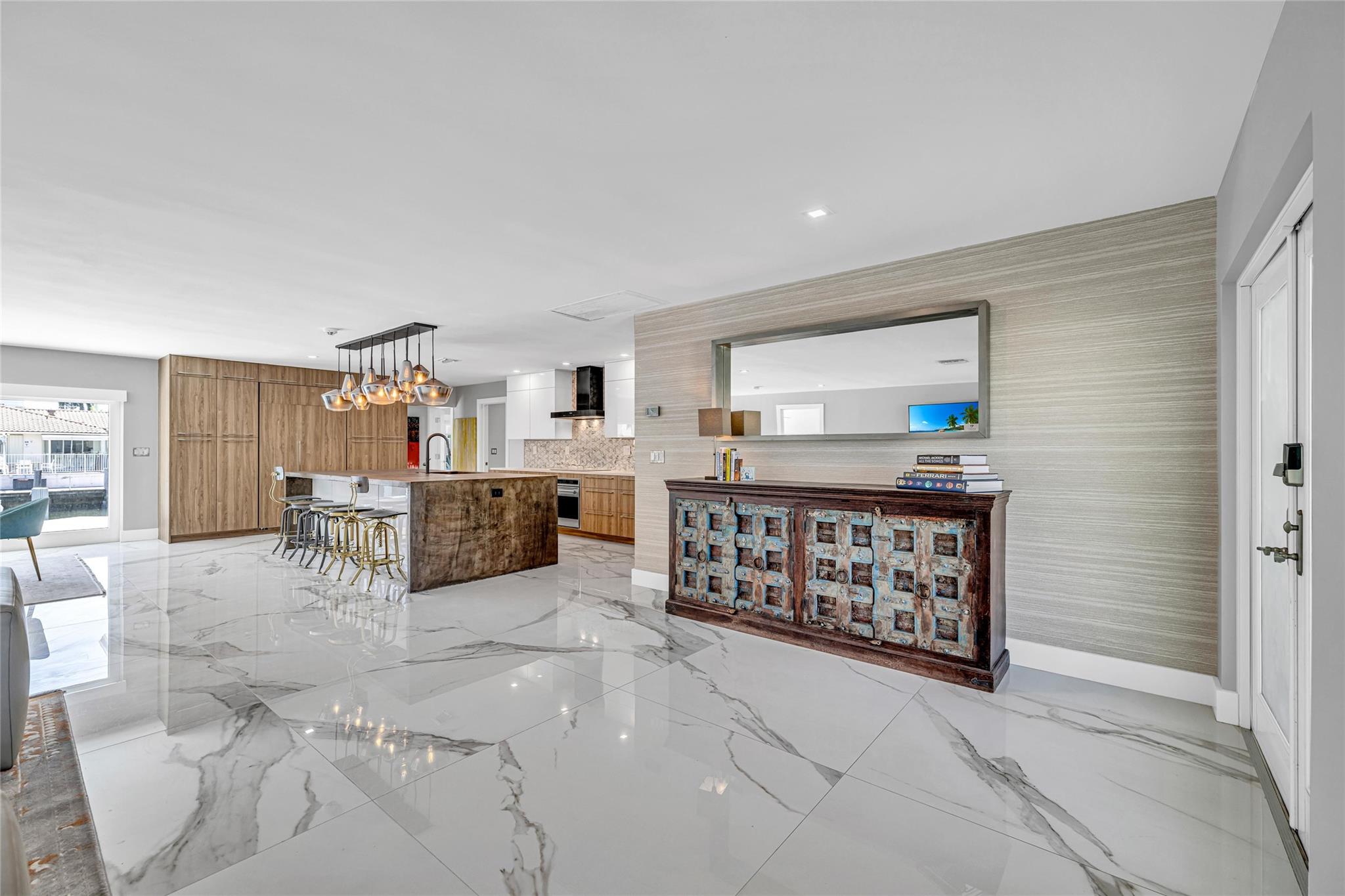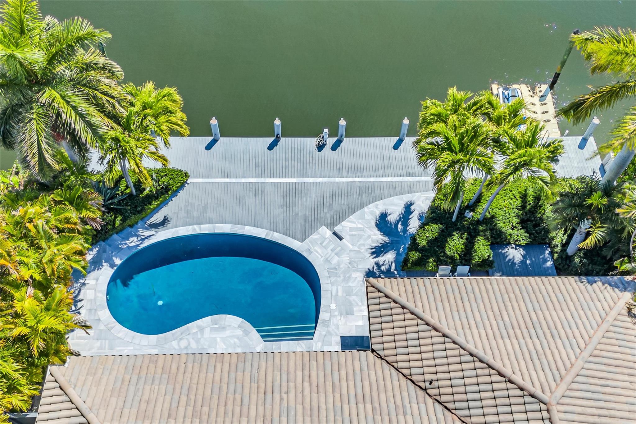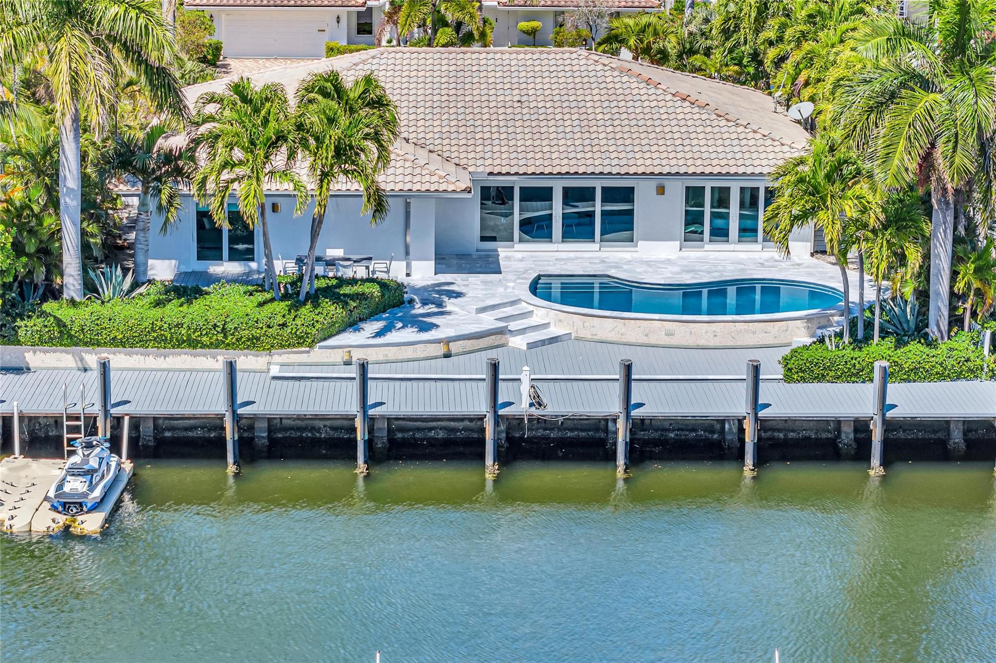 Outstanding waterfront home blocks to the beach in gated Bermuda Riviera. Modern interiors blend seamlessly with the outdoors through wide, sliding glass to a tiered patio and dock surrounding the pool. Designed for entertaining, the kitchen features a long center island, modern appliances and ample storage. The split plan allows each bedroom to enjoy privacy. The primary suite is a quiet retreat with sliders out to the pool, a massive walk-in closet and a 13 x 18 foot bathroom featuring a multi-spray shower. All three baths are updated in modern finishes. 16 foot squares of porcelain flooring is consistent throughout the house. The oversized garage has twin bays with extra wide doors. Multiple dining and shopping options are located within minutes of the property. Home Warranty Included