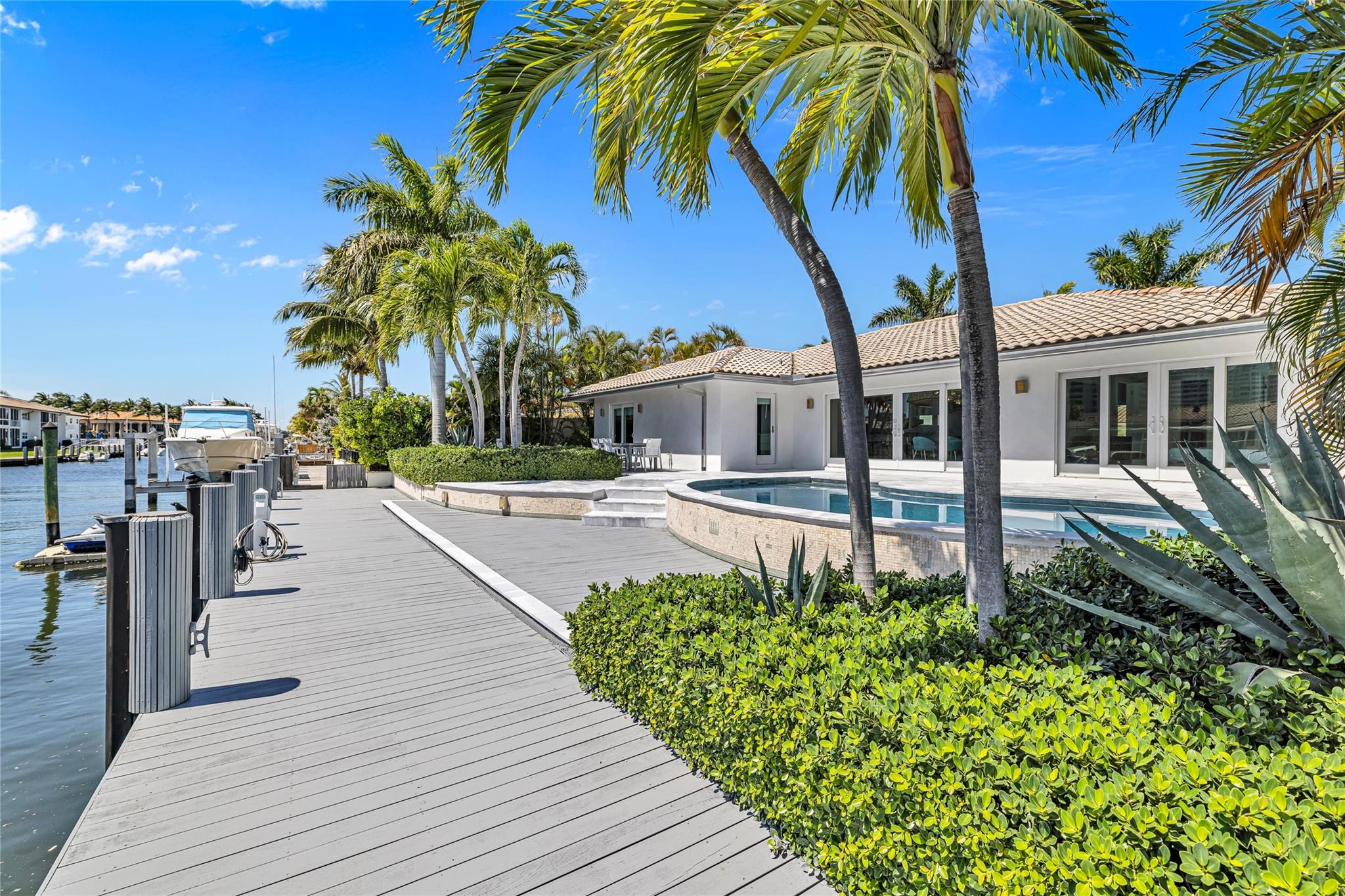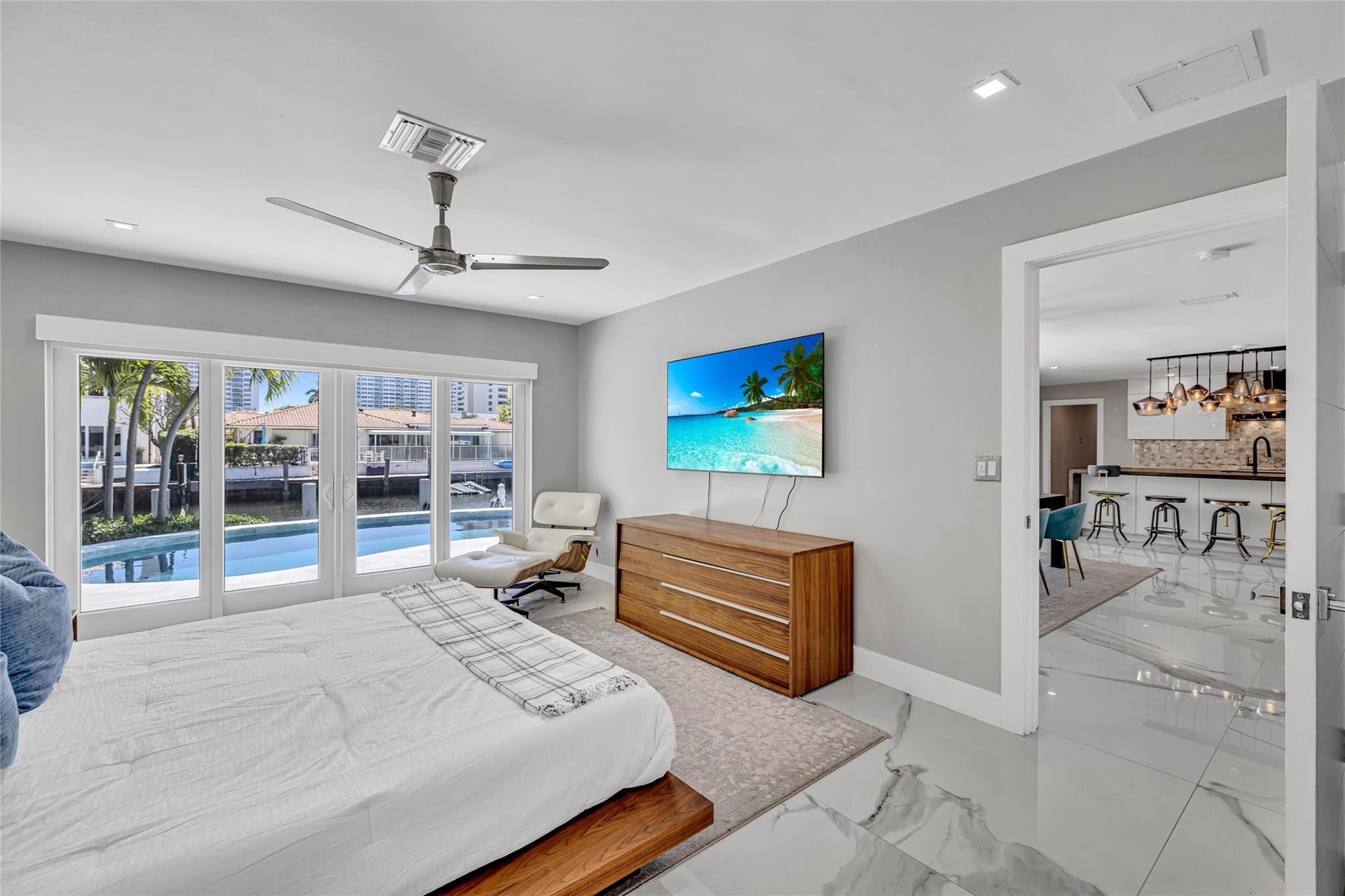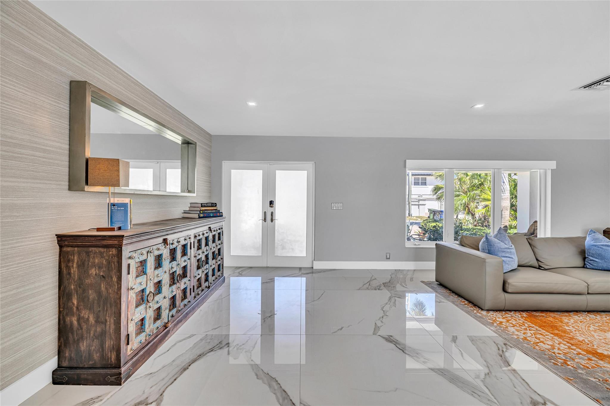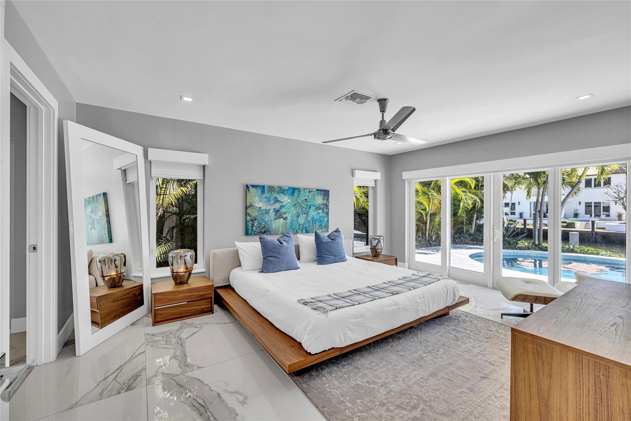 Outstanding waterfront home blocks to the beach in gated Bermuda Riviera. Modern interiors blend seamlessly with the outdoors through wide, sliding glass to a tiered patio and dock surrounding the pool. Designed for entertaining, the kitchen features a long center island, modern appliances and ample storage. The split plan allows each bedroom to enjoy privacy. The primary suite is a quiet retreat with sliders out to the pool, a massive walk-in closet and a 13 x 18 foot bathroom featuring a multi-spray shower. All three baths are updated in modern finishes. 16 foot squares of porcelain flooring is consistent throughout the house. The oversized garage has twin bays with extra wide doors. Multiple dining and shopping options are located within minutes of the property. Home Warranty Included