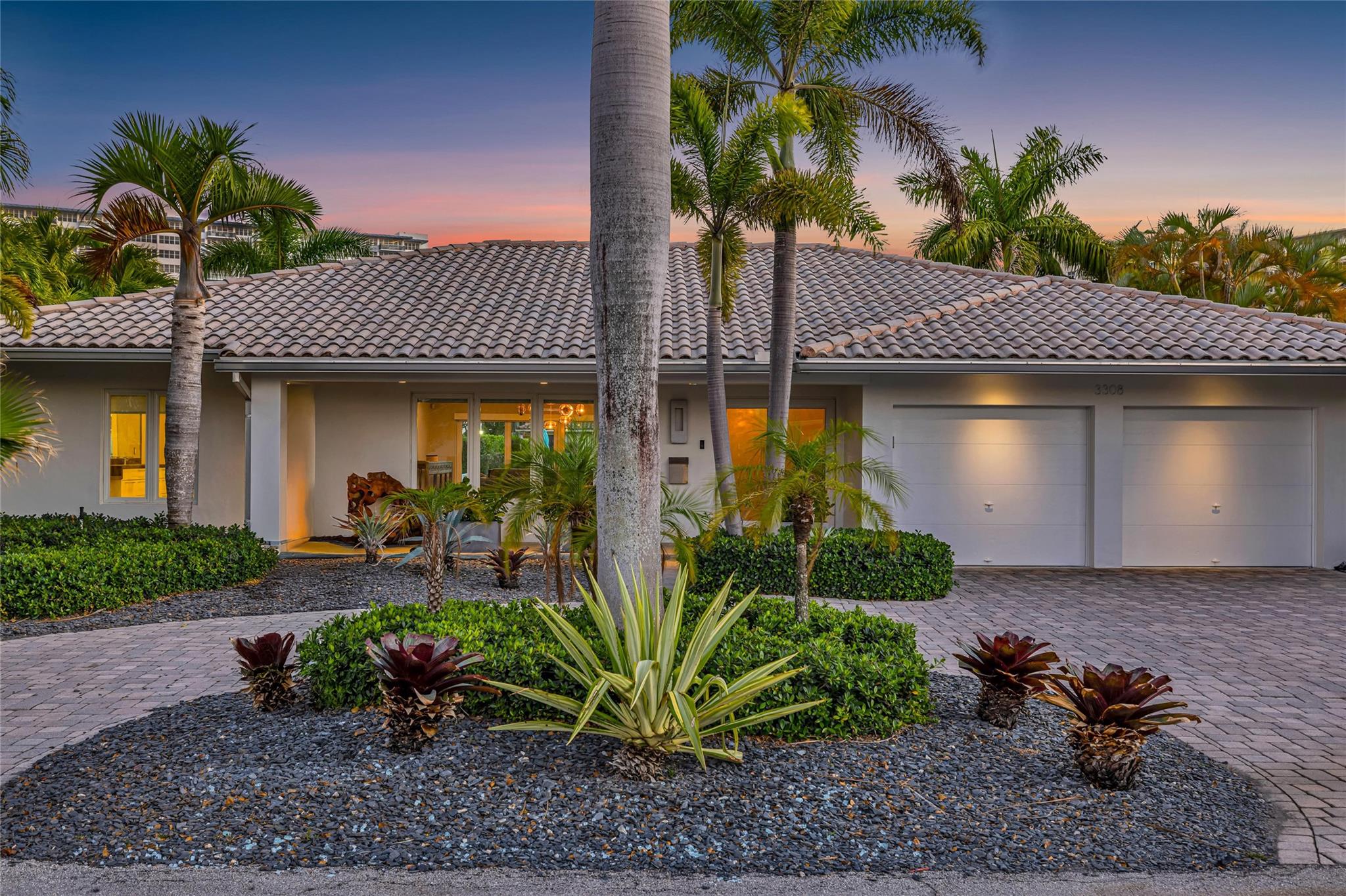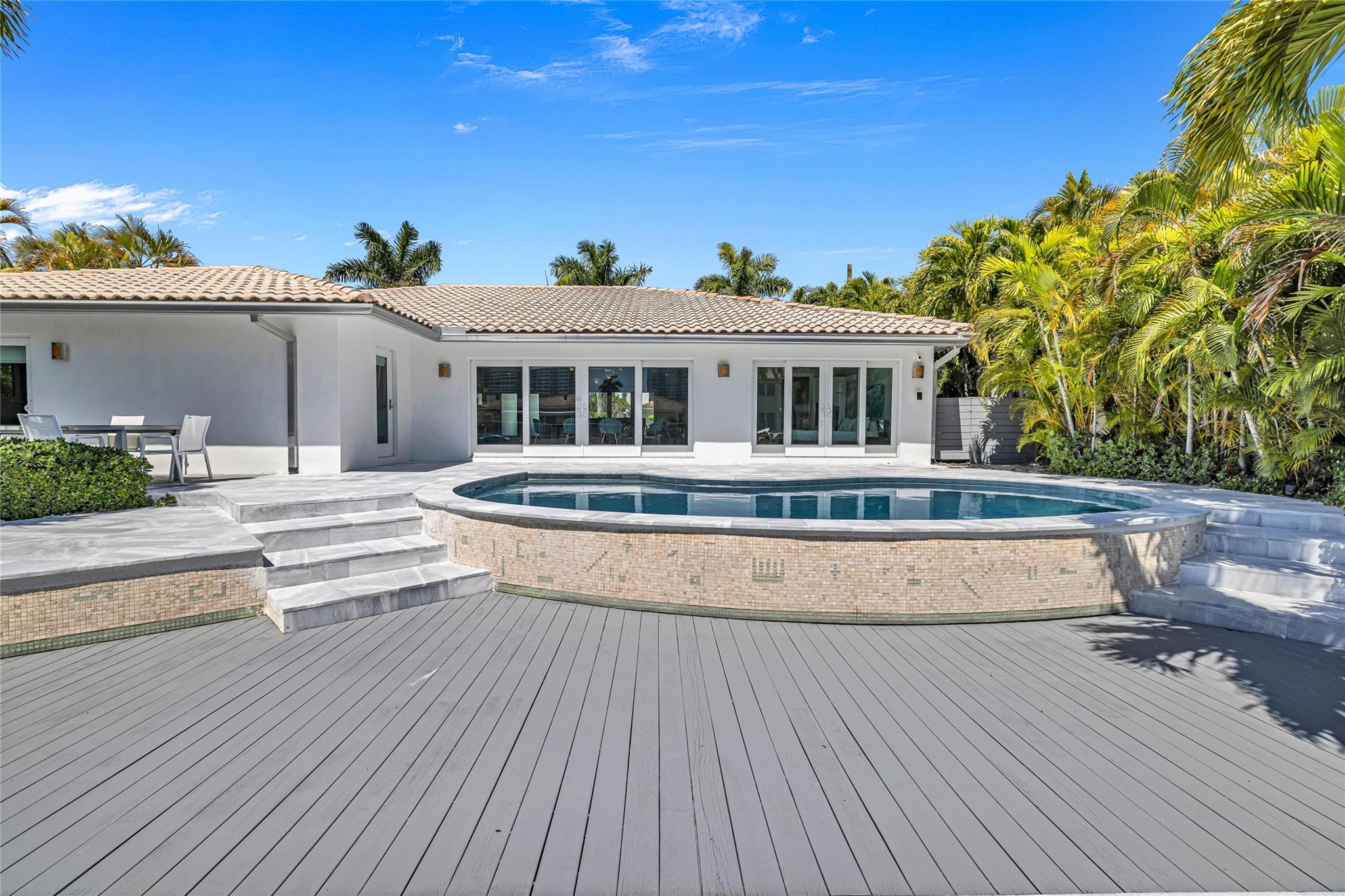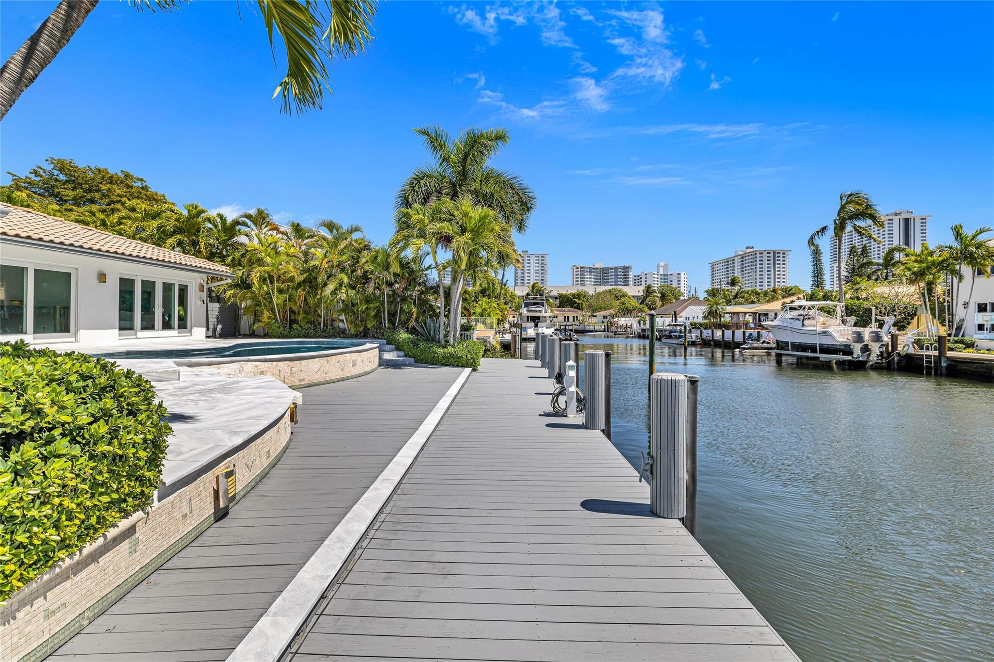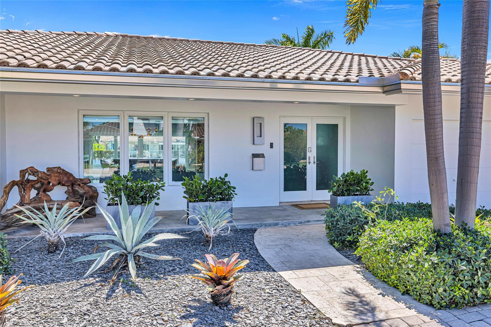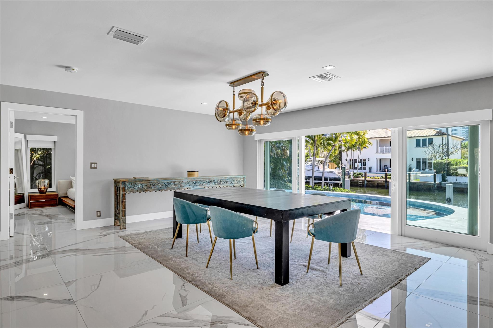 Outstanding waterfront home blocks to the beach in gated Bermuda Riviera. Modern interiors blend seamlessly with the outdoors through wide, sliding glass to a tiered patio and dock surrounding the pool. Designed for entertaining, the kitchen features a long center island, modern appliances and ample storage. The split plan allows each bedroom to enjoy privacy. The primary suite is a quiet retreat with sliders out to the pool, a massive walk-in closet and a 13 x 18 foot bathroom featuring a multi-spray shower. All three baths are updated in modern finishes. 16 foot squares of porcelain flooring is consistent throughout the house. The oversized garage has twin bays with extra wide doors. Multiple dining and shopping options are located within minutes of the property. Home Warranty Included