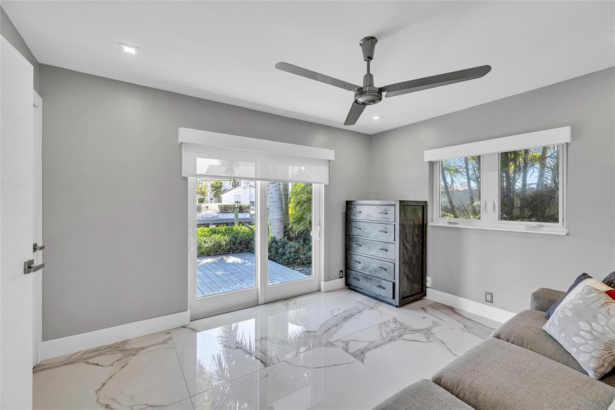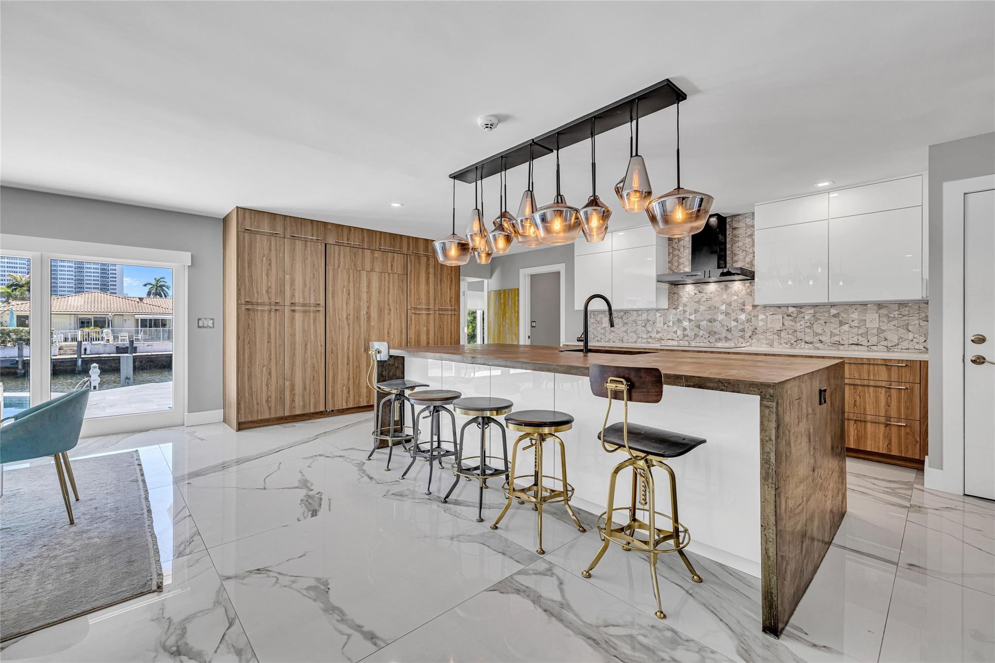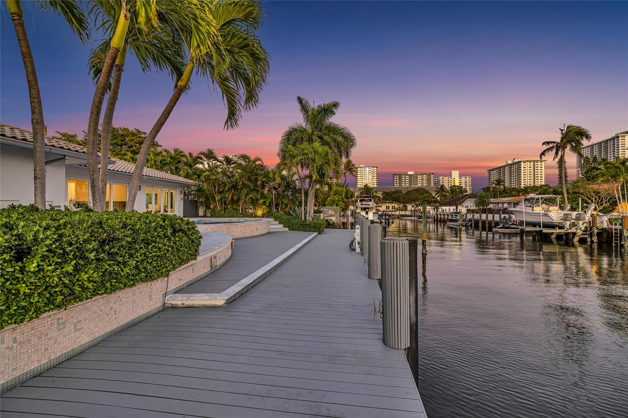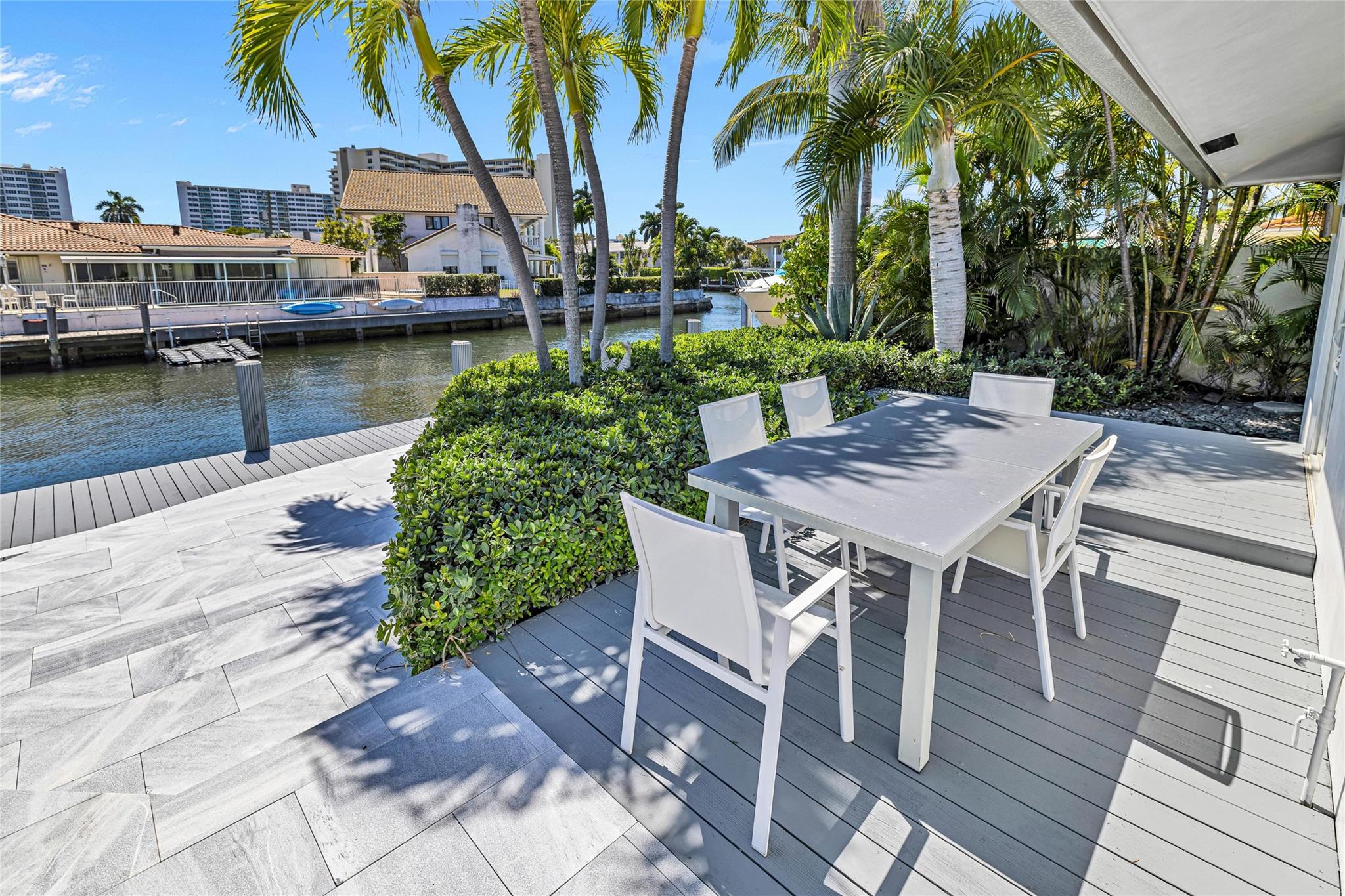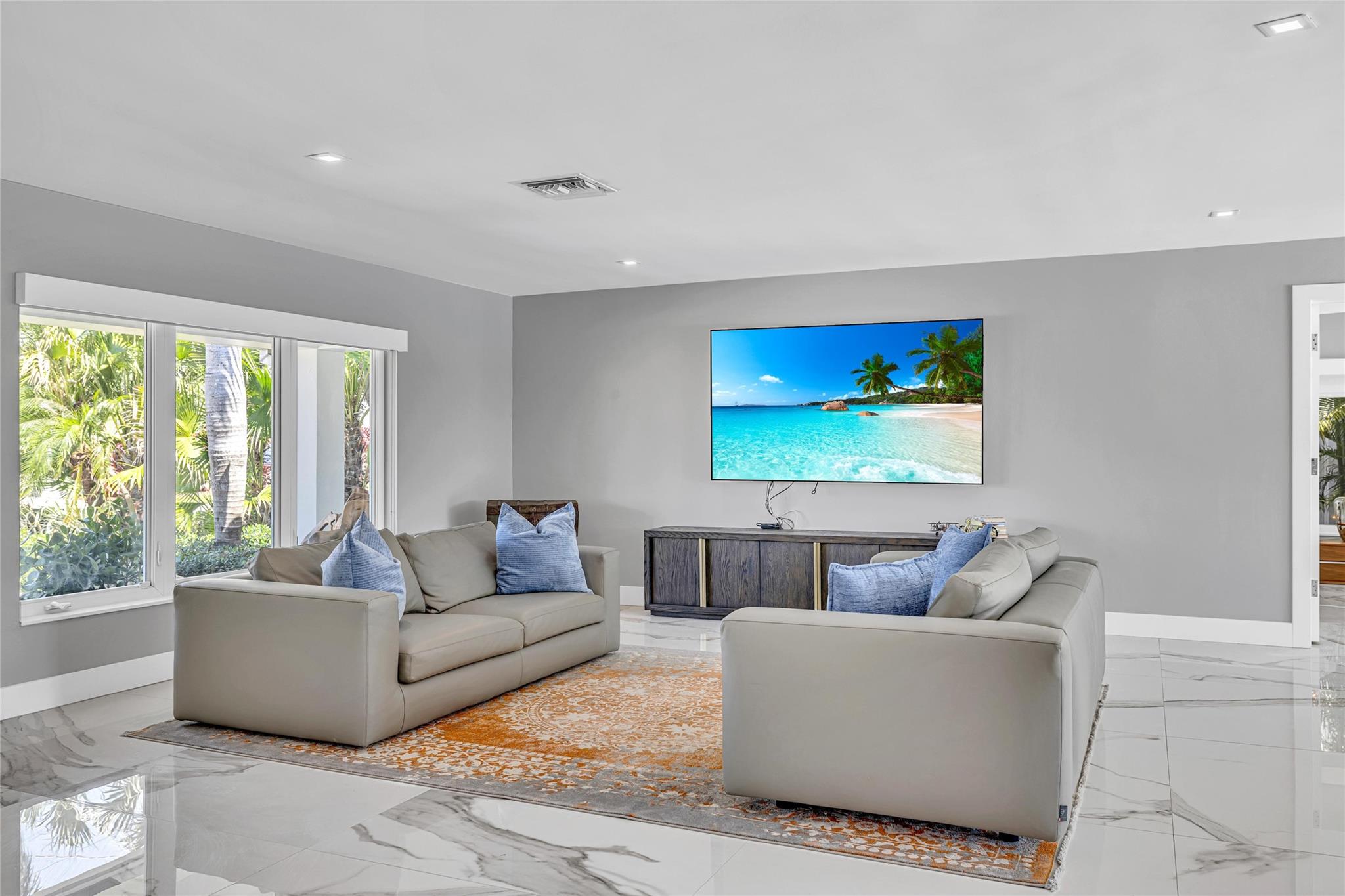 Outstanding waterfront home blocks to the beach in gated Bermuda Riviera. Modern interiors blend seamlessly with the outdoors through wide, sliding glass to a tiered patio and dock surrounding the pool. Designed for entertaining, the kitchen features a long center island, modern appliances and ample storage. The split plan allows each bedroom to enjoy privacy. The primary suite is a quiet retreat with sliders out to the pool, a massive walk-in closet and a 13 x 18 foot bathroom featuring a multi-spray shower. All three baths are updated in modern finishes. 16 foot squares of porcelain flooring is consistent throughout the house. The oversized garage has twin bays with extra wide doors. Multiple dining and shopping options are located within minutes of the property. Home Warranty Included