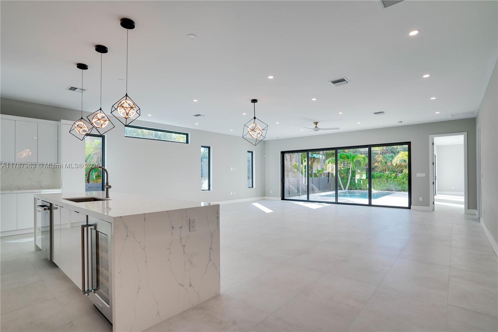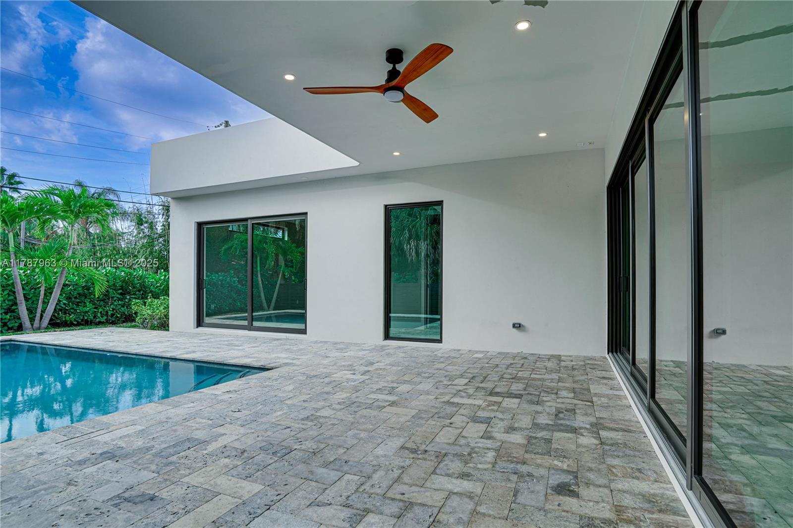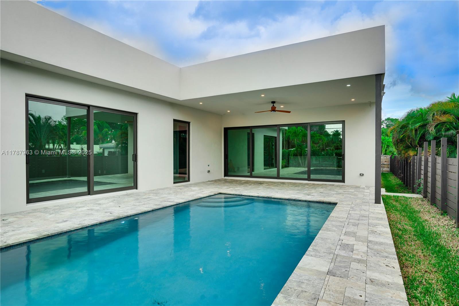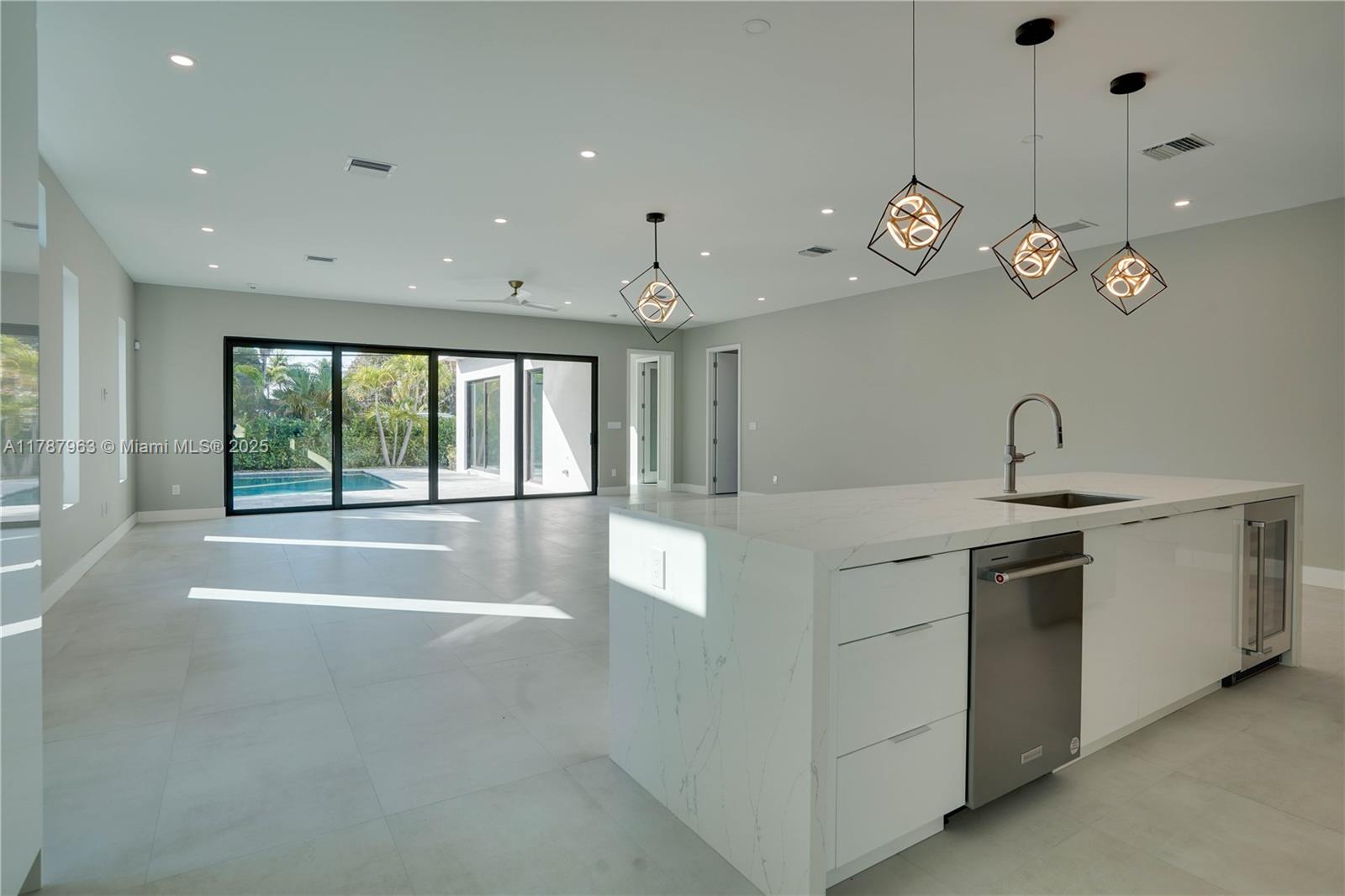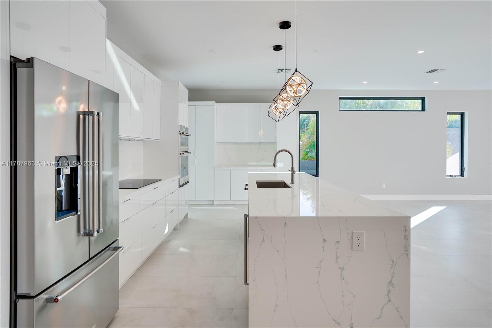 NEW CONSTRUCTION MODERN POOL HOME, immediate occupancy, one story single family residence with high end finishes, offers pure luxury and unparalleled comfort. Designed for those who appreciate both style and function, the house features 4 bdr, all within an open and airy layout, soaring 10 to 17 foot ceilings. The primary suite boasts a walk-in closet, luxurious marble 3 baths, 2 car garage with dedicated circuit for EV charger, security system. Italian kitchen cabinetry and large island. Lapitec countertops and porcelain floors, impact windows and sliding doors. Extra raised, seven foot flood elevation floor. Covered patio overlooking a saltwater pool and a beautifully landscaped garden with palms. Your opportunity to own a brand new custom built home, in a desirable neighborhood, no HOA.