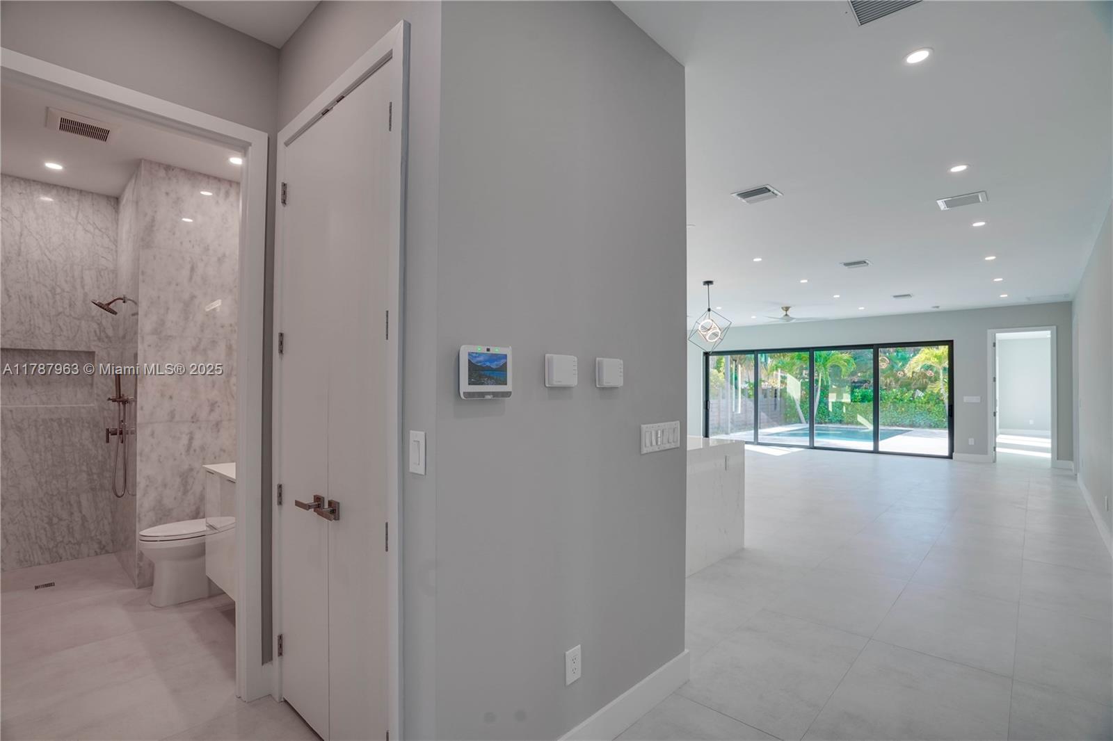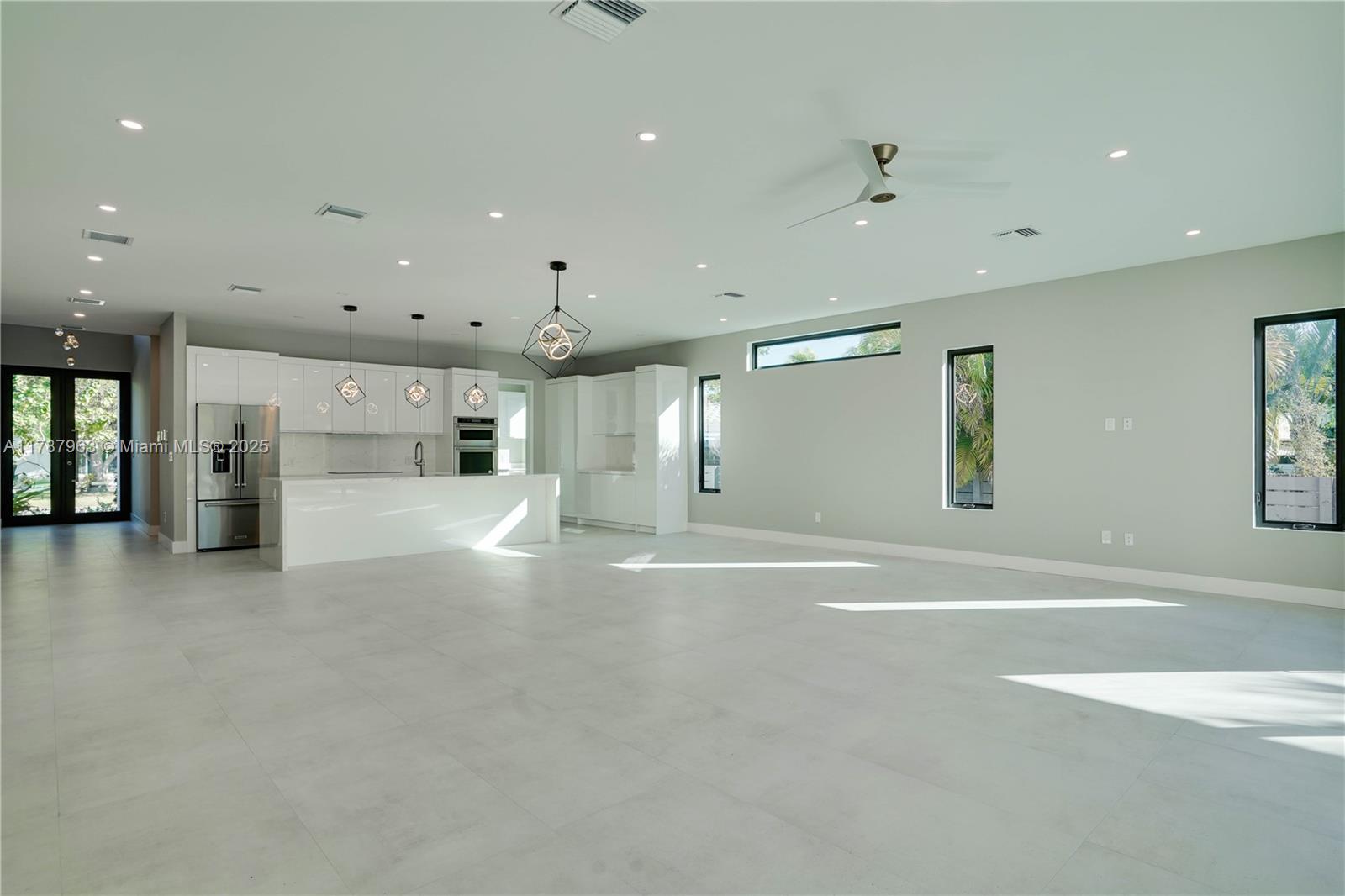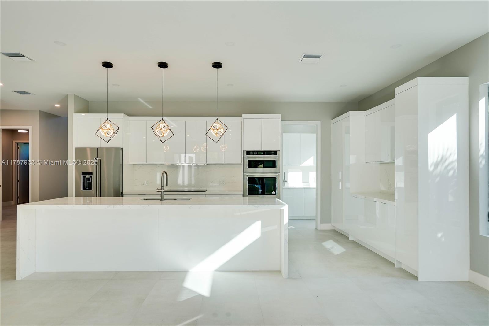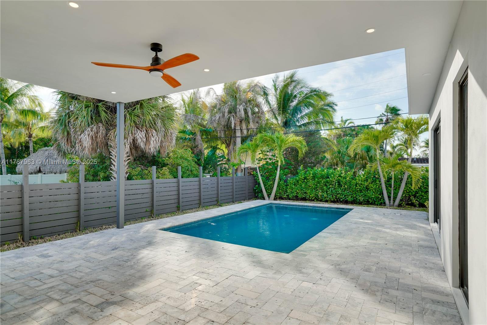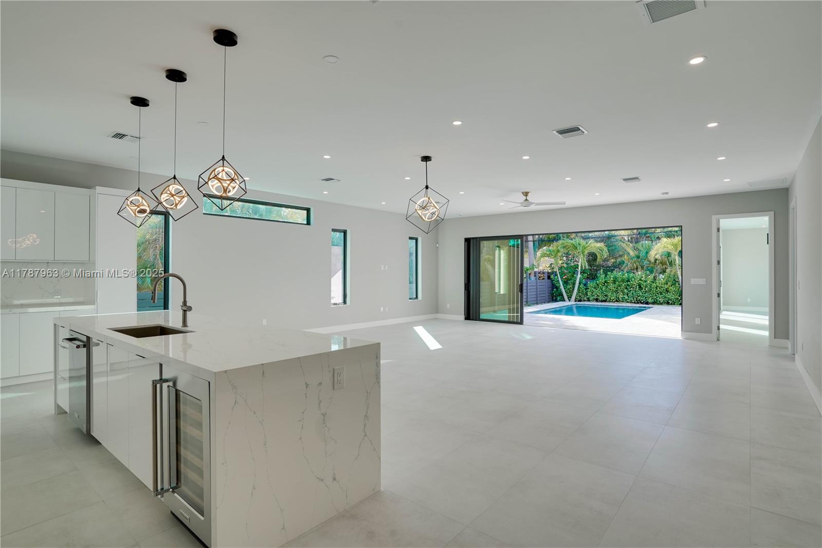 NEW CONSTRUCTION MODERN POOL HOME, immediate occupancy, one story single family residence with high end finishes, offers pure luxury and unparalleled comfort. Designed for those who appreciate both style and function, the house features 4 bdr, all within an open and airy layout, soaring 10 to 17 foot ceilings. The primary suite boasts a walk-in closet, luxurious marble 3 baths, 2 car garage with dedicated circuit for EV charger, security system. Italian kitchen cabinetry and large island. Lapitec countertops and porcelain floors, impact windows and sliding doors. Extra raised, seven foot flood elevation floor. Covered patio overlooking a saltwater pool and a beautifully landscaped garden with palms. Your opportunity to own a brand new custom built home, in a desirable neighborhood, no HOA.
